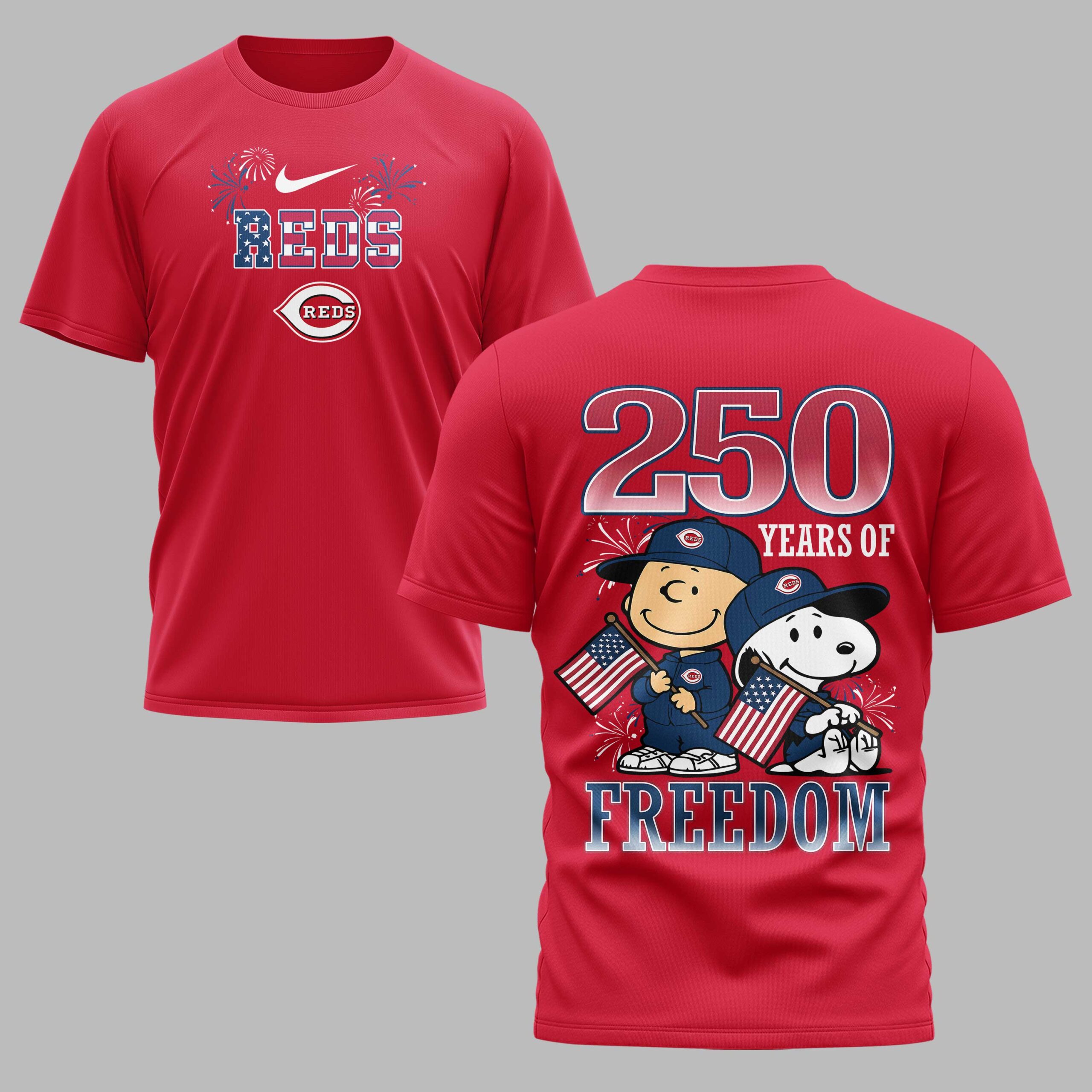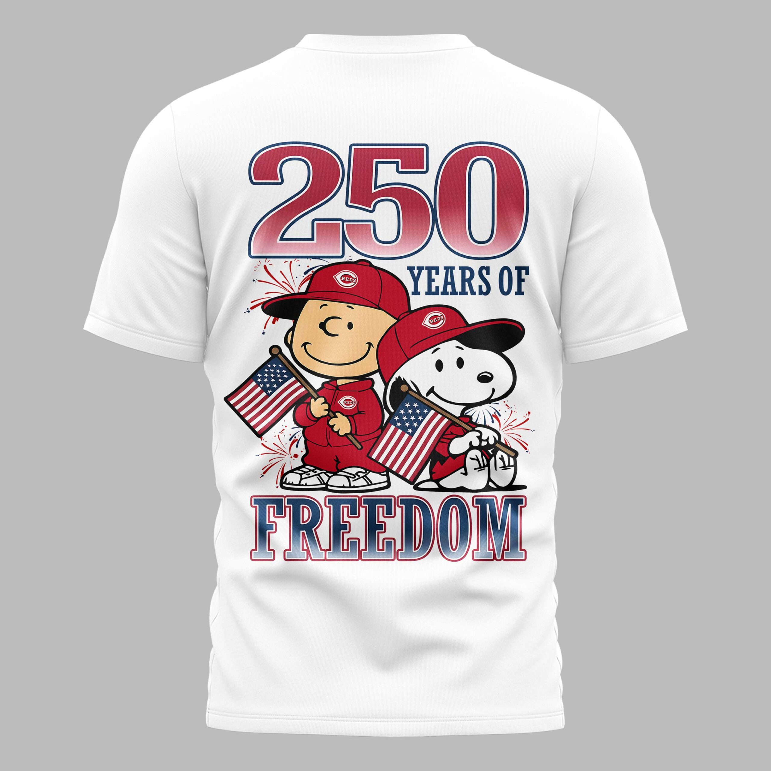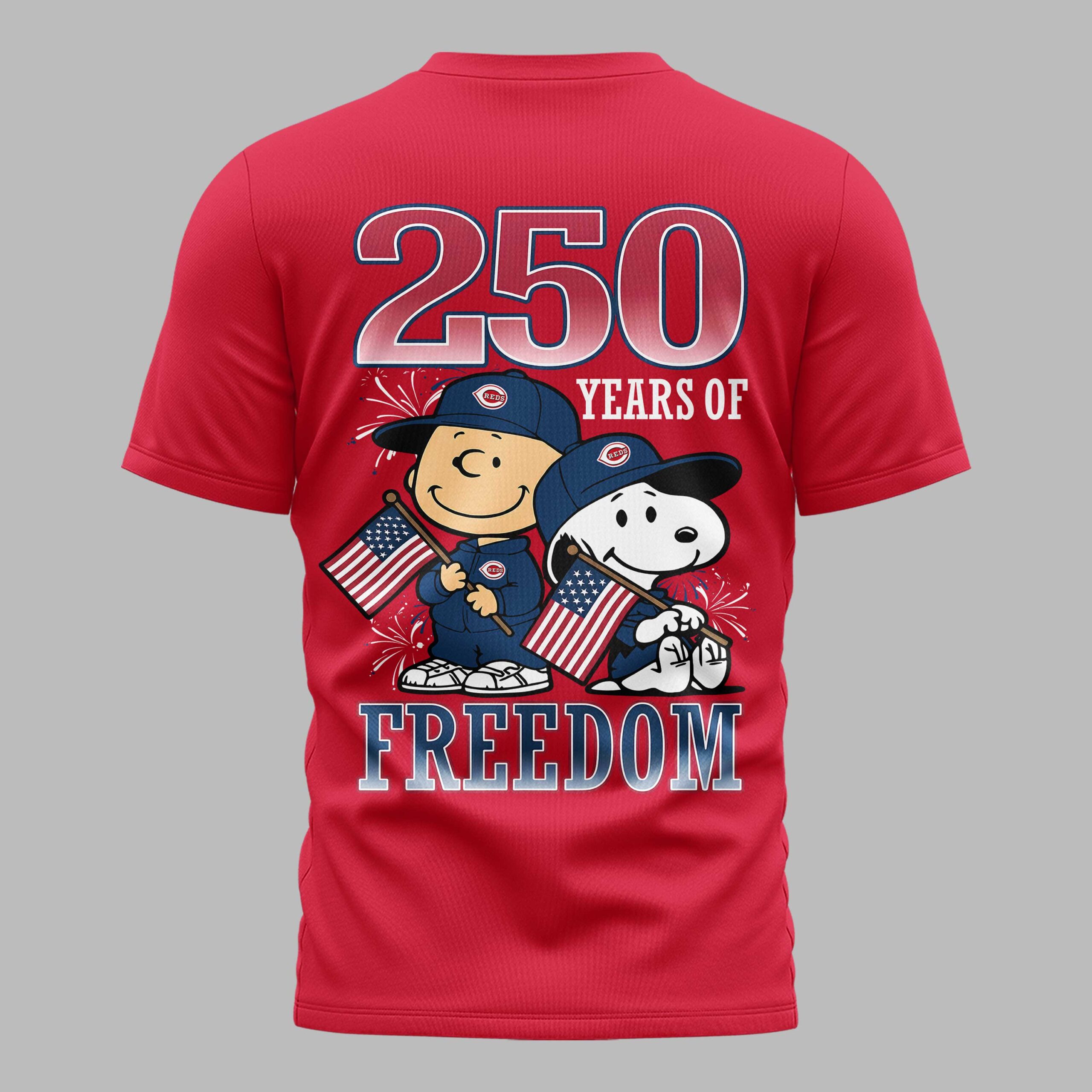 Show your Reds pride and American spirit with this commemorative fan tee! Celebrating 250 Years of Freedom, this vibrant design blends baseball fandom with a powerful patriotic theme. It’s ideal for proud American and Reds supporters to honor their team and country. The front features REDS in a dynamic red, white, and blue, stars-and-stripes design, bursting with fireworks. The iconic Cincinnati Reds logo sits below. The back highlights 250 YEARS OF FREEDOM, with Charlie Brown and Snoopy, wearing Reds caps and waving American flags amidst dazzling fireworks. This festive shirt is perfect for game days, Fourth of July, Memorial Day, or any event to express patriotism and Reds devotion. Wear it to parades, barbecues, or as a stylish everyday statement of national pride and baseball passion.