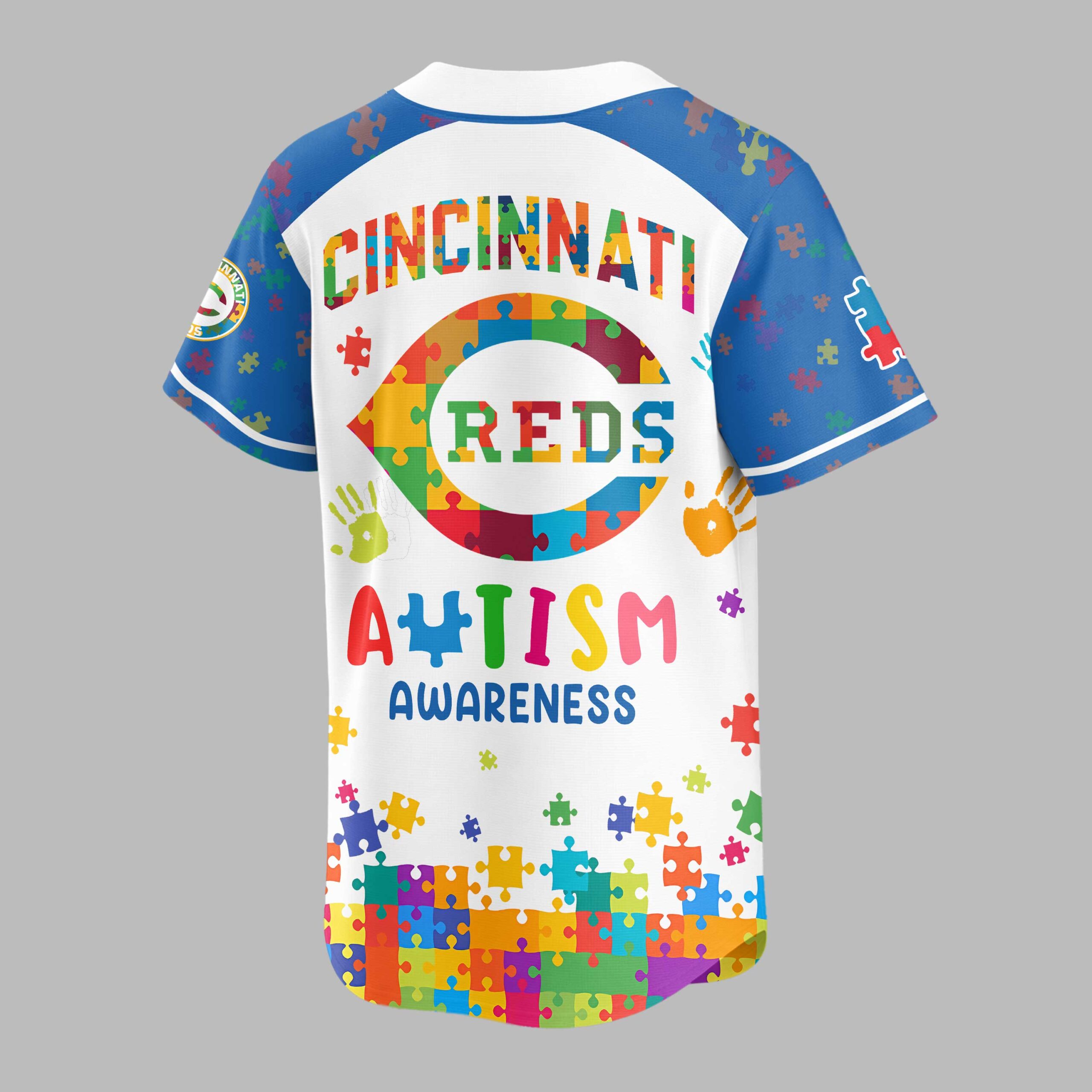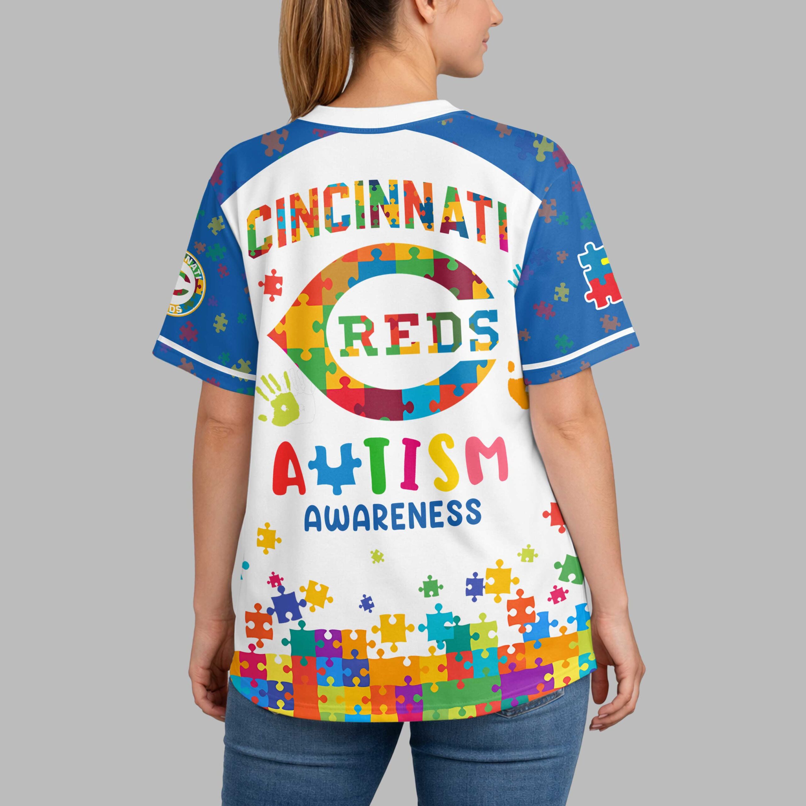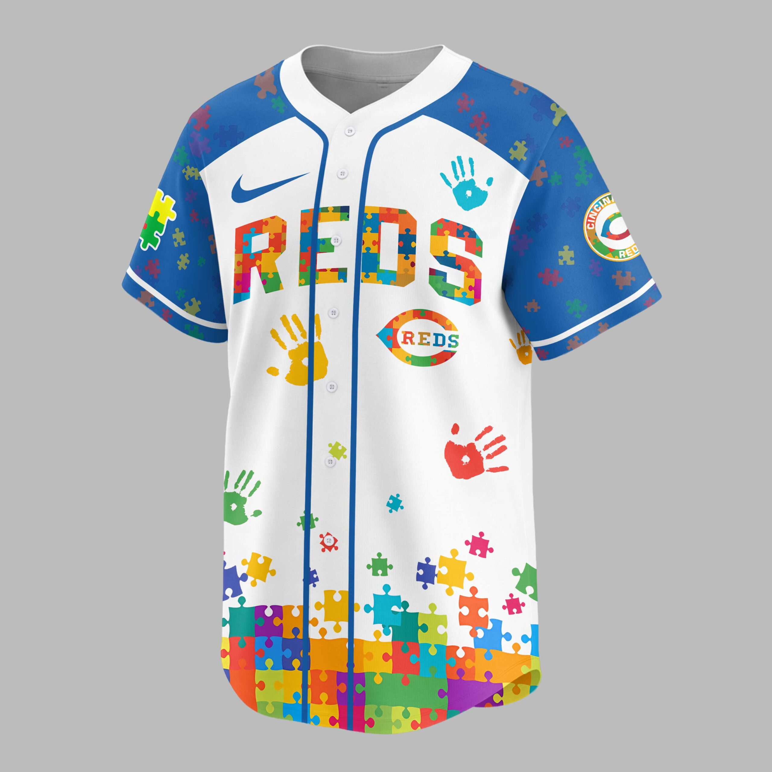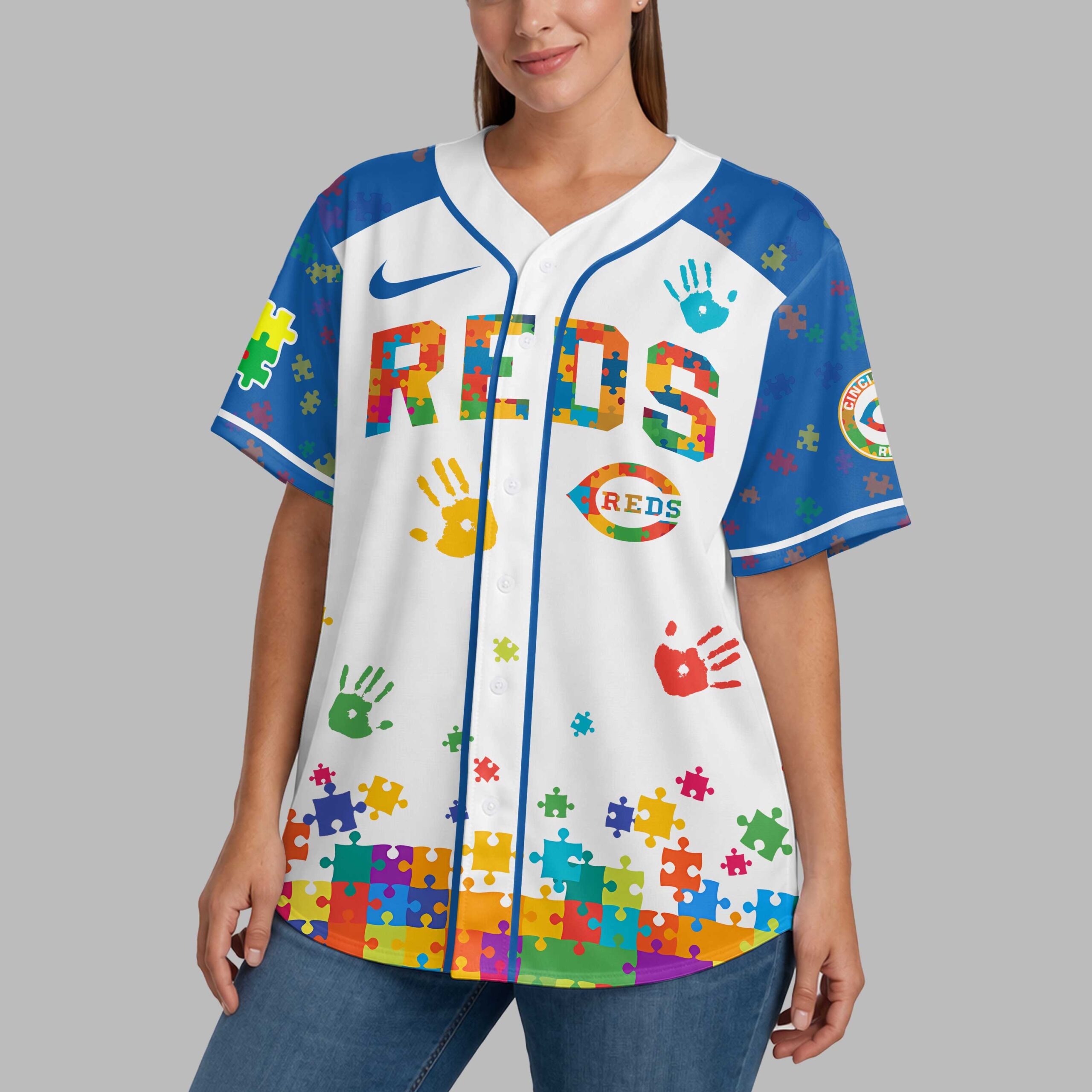 Show your unwavering support for the Cincinnati Reds and raise vital Autism Awareness with this unique baseball jersey! This spirited design beautifully blends your love for the game with a powerful message, making it a truly special addition to any fan’s wardrobe. Stand tall for your team and for a cause close to many hearts. The jersey features the iconic REDS text on the front, creatively filled with vibrant, colorful puzzle pieces, alongside the team’s circular logo. The back boldly displays CINCINNATI REDS and AUTISM AWARENESS in the same striking puzzle piece motif, with scattered handprints and puzzle elements adding a dynamic touch throughout. The blue sleeves and shoulders are also adorned with subtle puzzle pieces, completing this meaningful look. Perfect for game days at the ballpark, community awareness events, or simply everyday wear to spread an important message. This jersey is an impactful way to cheer on the Reds while advocating for understanding and inclusion. Wear it with pride and let your passion shine bright for both baseball and autism support!