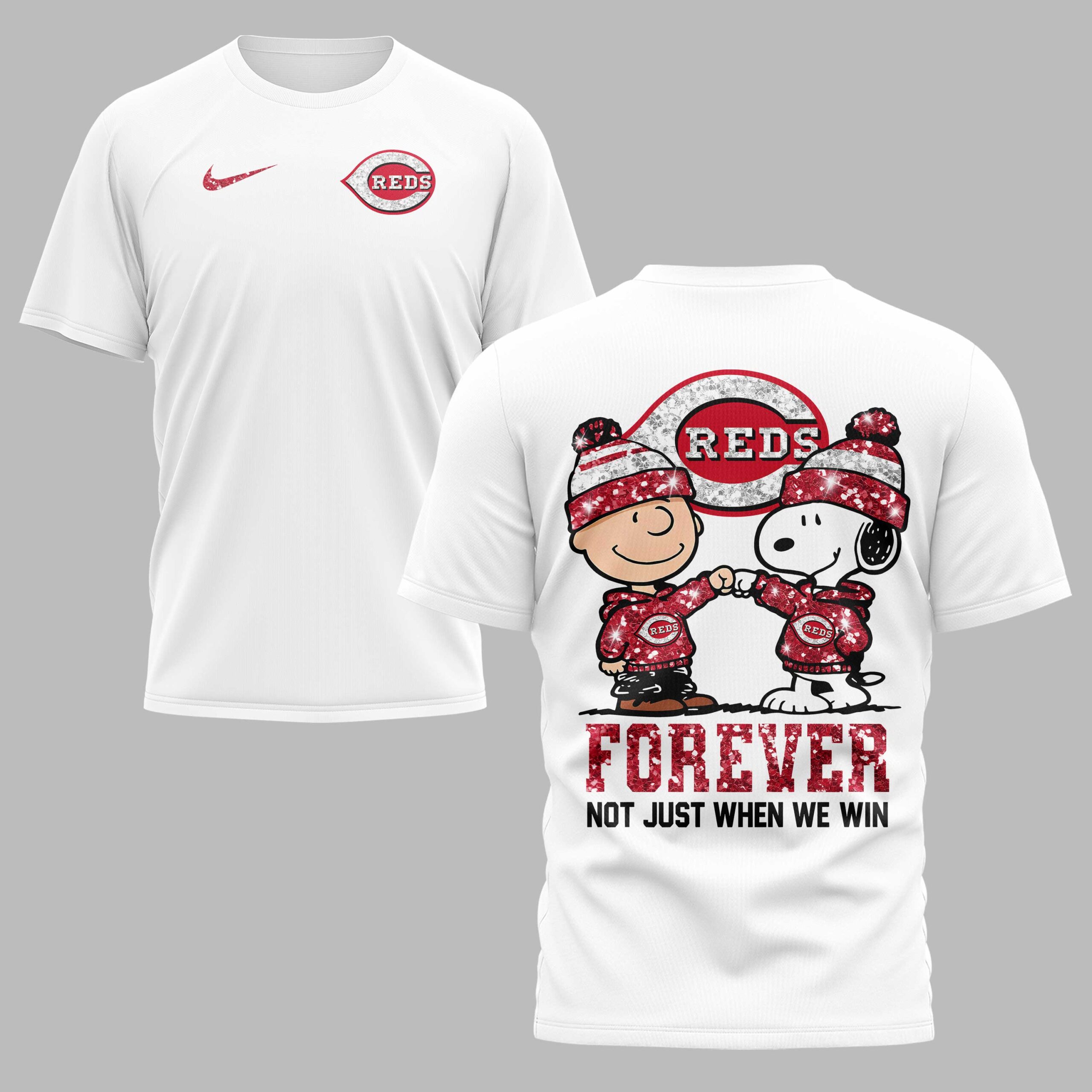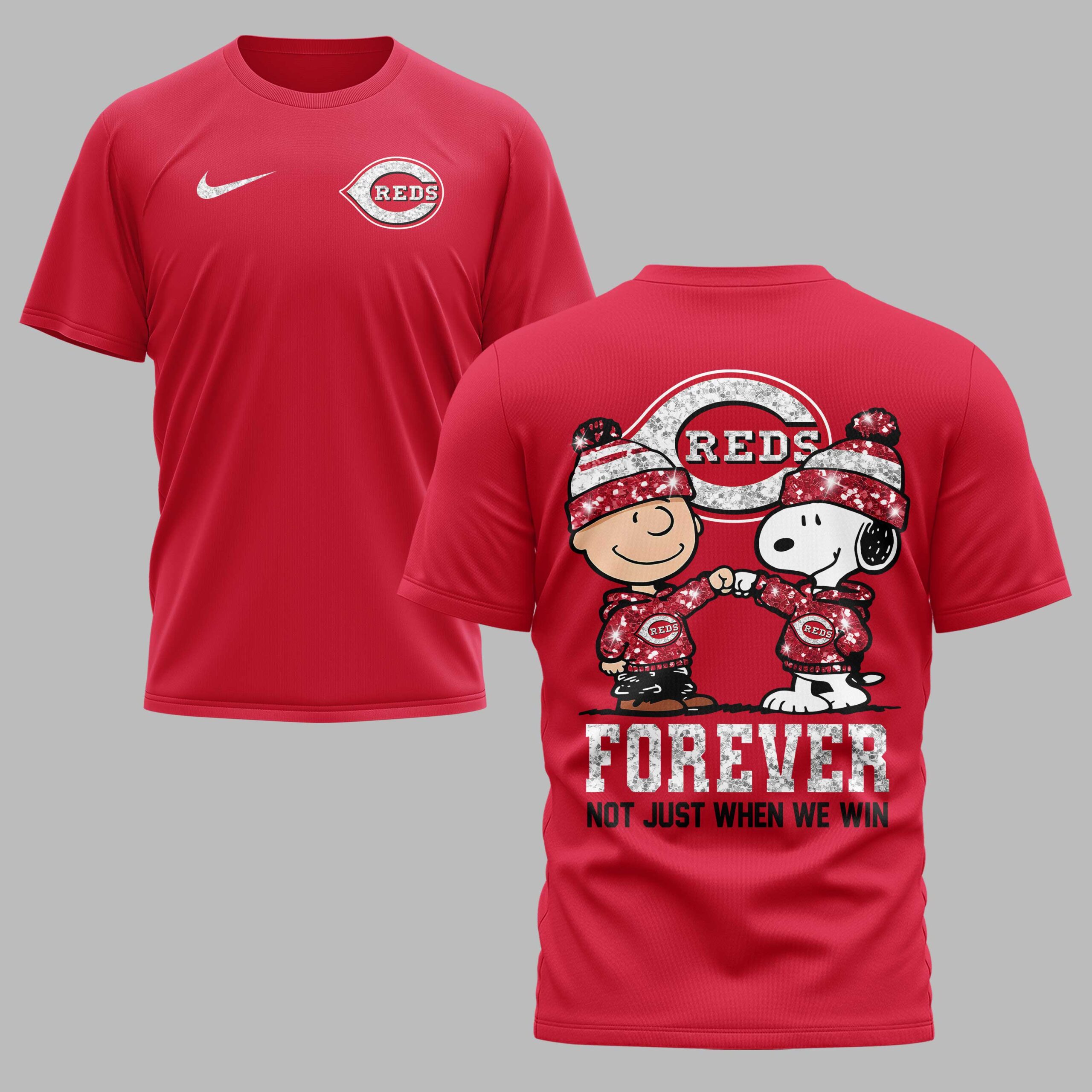 Show your unwavering Cincinnati Reds spirit with this charming Peanuts-themed tee! Perfect for dedicated fans, this shirt captures the heart of true loyalty, featuring beloved characters Charlie Brown and Snoopy celebrating the Reds. It’s more than just game day attire; it’s a statement of enduring support for your favorite team. The front proudly displays a red Nike swoosh alongside the iconic Cincinnati Reds logo, both featuring a sparkling, distressed texture for a touch of vintage flair. The back makes a bold declaration with a large Reds logo, beneath which Charlie Brown and Snoopy, sporting matching sparkly Reds hoodies and beanies, share a fist bump. The powerful message, FOREVER NOT JUST WHEN WE WIN, is prominently featured below, emphasizing true fandom. Whether you’re at Great American Ball Park, watching from home, or simply out and about, this shirt is ideal for expressing your Reds pride. It’s a fantastic way to celebrate every victory and stand by your team through every inning, making it a must-have for any loyal Cincinnati Reds enthusiast.