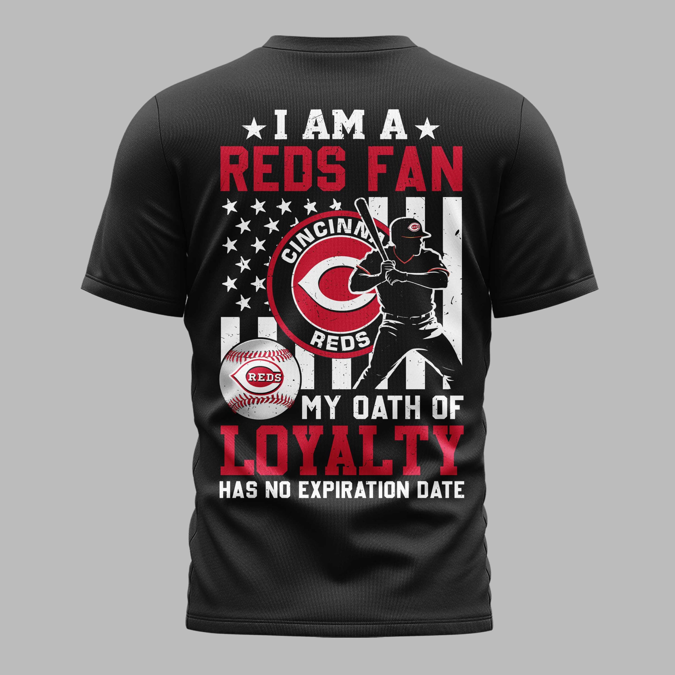 Show off your unwavering team spirit and American pride with this Cincinnati Reds fan t-shirt. Designed for those who bleed red, white, and blue, this shirt perfectly combines a love for the game with a deep sense of patriotism. It’s a powerful way to celebrate your favorite team while honoring the spirit of independence and national pride. The front of the shirt features the classic Cincinnati Reds wordmark and iconic logo displayed prominently. The back is a bold statement piece, showcasing a striking American flag backdrop paired with a dynamic batter silhouette and a team-branded baseball. Complemented by the powerful message, My oath of loyalty has no expiration date, this design ensures everyone knows your dedication is lifelong. Whether you’re heading to the ballpark for a summer game, attending an Independence Day barbecue, or just enjoying a casual day out, this shirt is the ultimate choice for any dedicated fan.