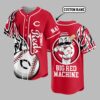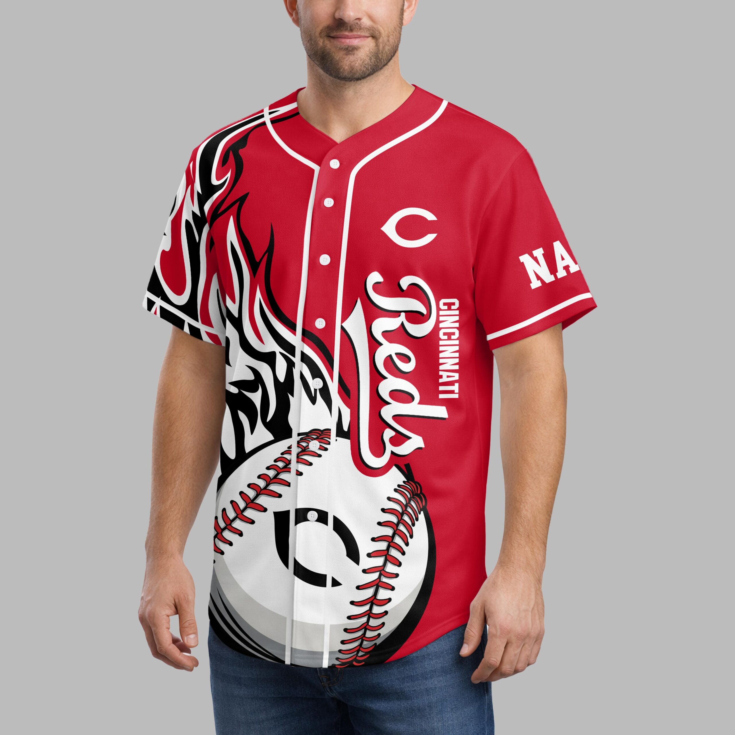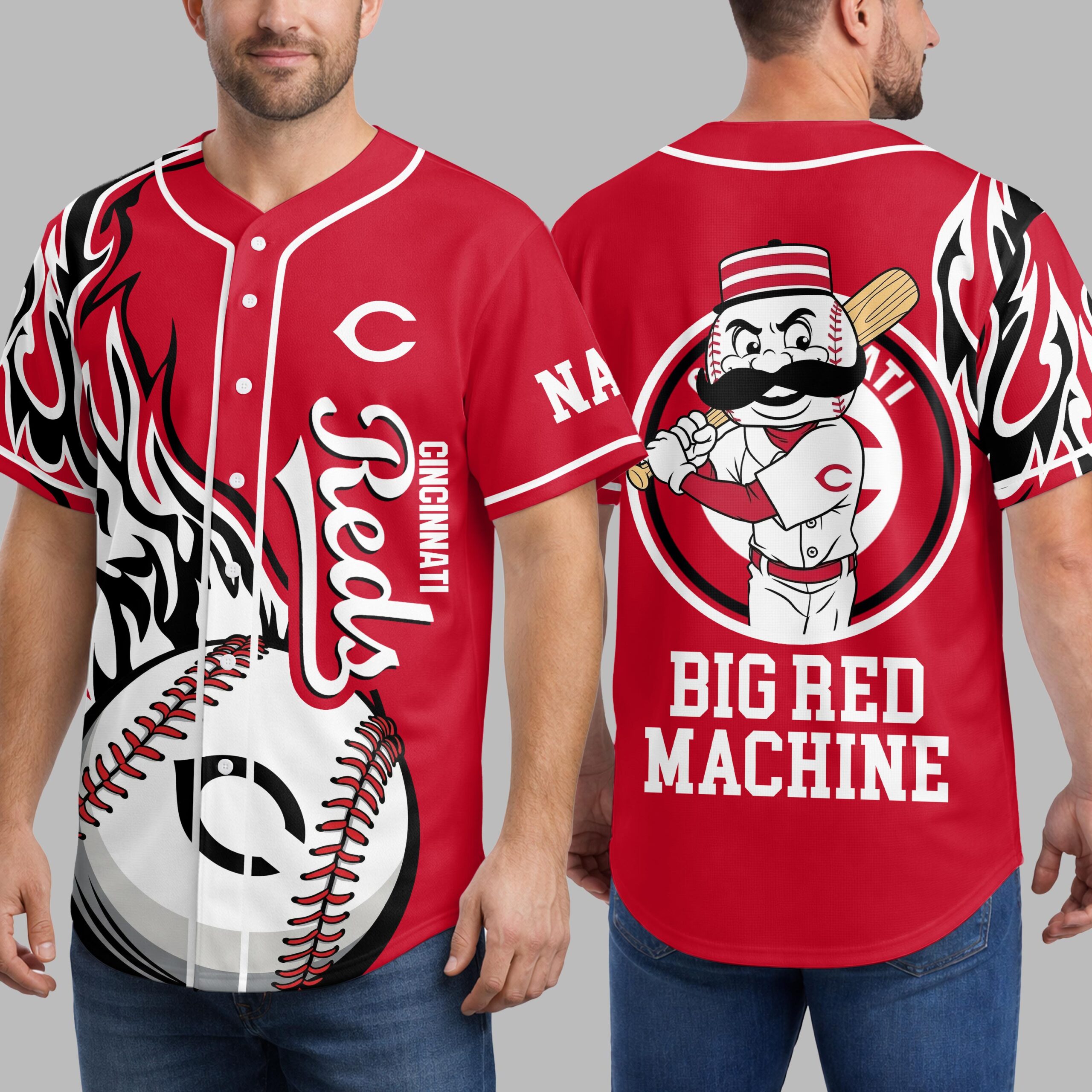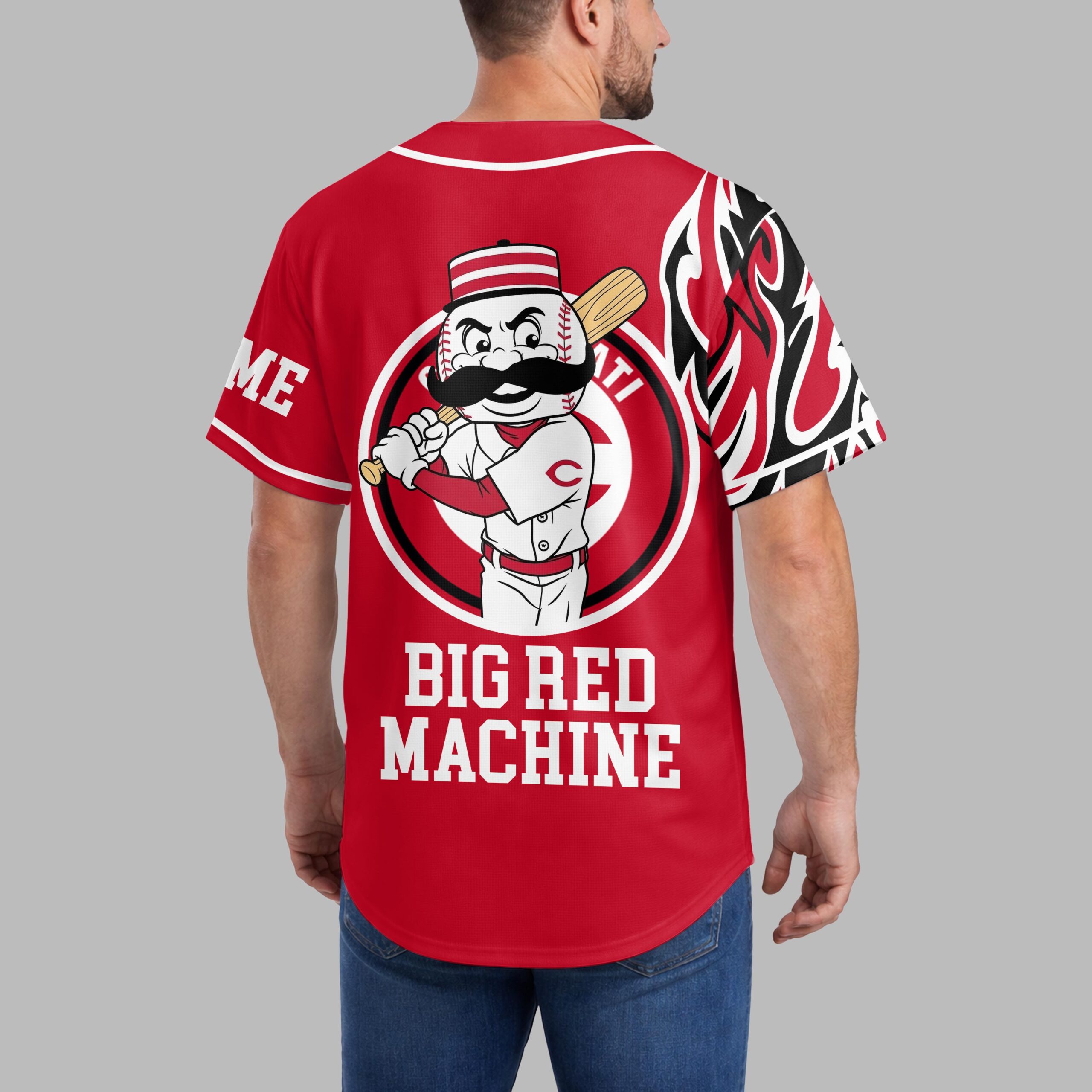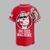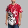 Ignite your game day spirit with this dynamic Cincinnati Reds baseball jersey! Perfect for every devoted fan, this shirt proudly showcases your loyalty to the Big Red Machine, blending classic team pride with a fierce, modern design. The front features the iconic Reds script, CINCINNATI, and the classic C logo, complemented by a striking half-baseball graphic with detailed red stitching. On the back, the legendary Mr. Redlegs mascot takes center stage within a circular Cincinnati graphic, boldly proclaiming BIG RED MACHINE below. Sleeves and sides are energized with a bold black and white flame-like pattern. This jersey is your ultimate gear for cheering from the stands, hosting a watch party, or showing your team pride around town. Perfect for game days, sporting events, or any occasion to represent your favorite MLB team with undeniable style.