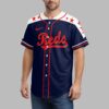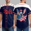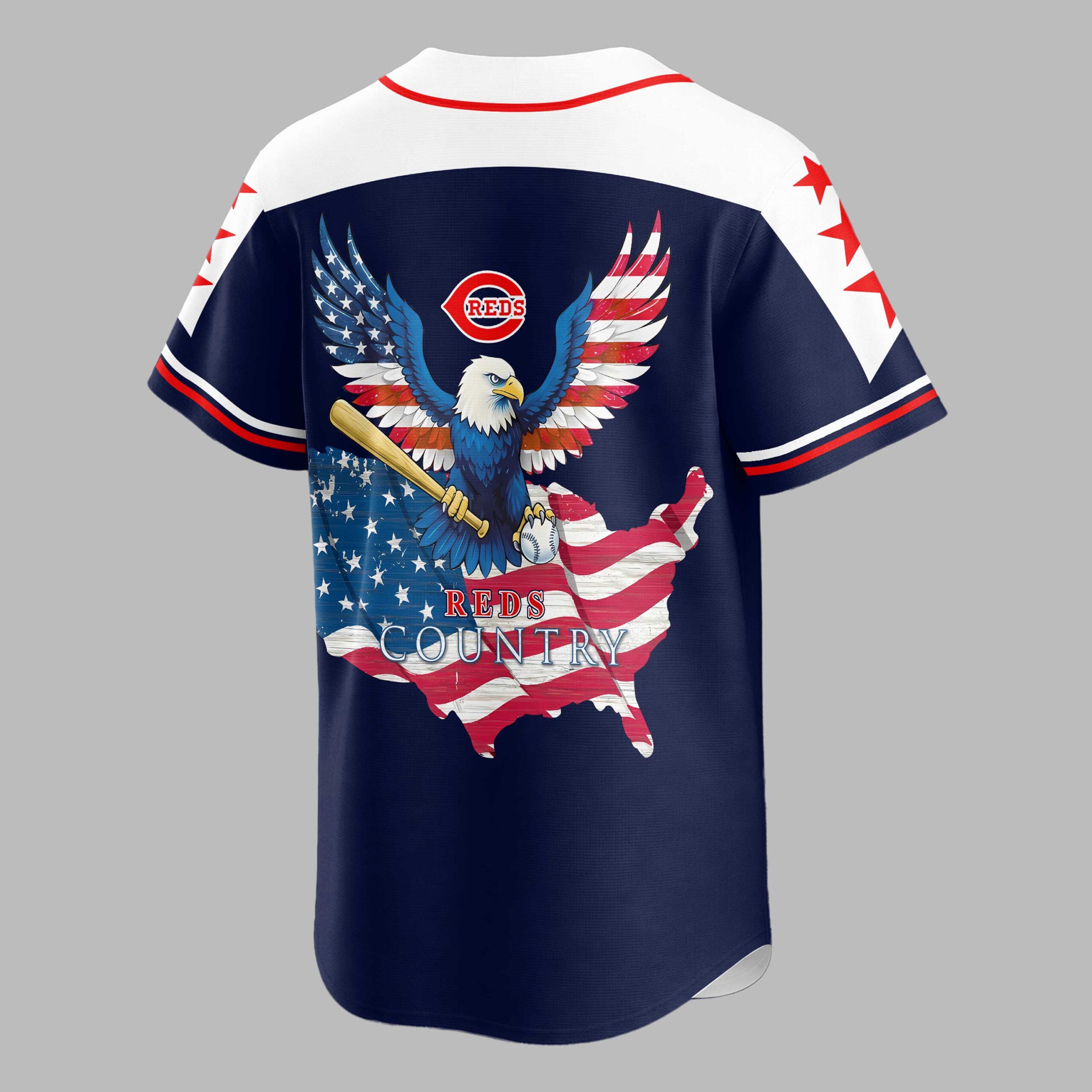 Unleash your ultimate Reds spirit with this dynamic patriotic baseball jersey! Perfect for dedicated fans, this shirt brilliantly merges your love for the Cincinnati Reds with a powerful display of American pride. It’s more than just game day attire; it’s a bold statement of loyalty and patriotism, ready to make you stand out in any crowd. The front proudly displays Reds in a classic script font, accented by vibrant red stars across the shoulders and crisp white stripes on the sleeves. Turn around, and the back reveals a majestic bald eagle with wings spread wide, crafted from the stars and stripes of the American flag. This impressive eagle soars above a map of the USA, also adorned with a distressed flag design, declaring Reds Country for all to see. This spirited jersey is an absolute must-have for cheering on the Reds at the ballpark, celebrating national holidays like the Fourth of July, or simply showing your team and country pride every day. Wear it to tailgates, family barbecues, or any event where you want to unite your passion for baseball with your American spirit!
