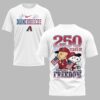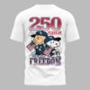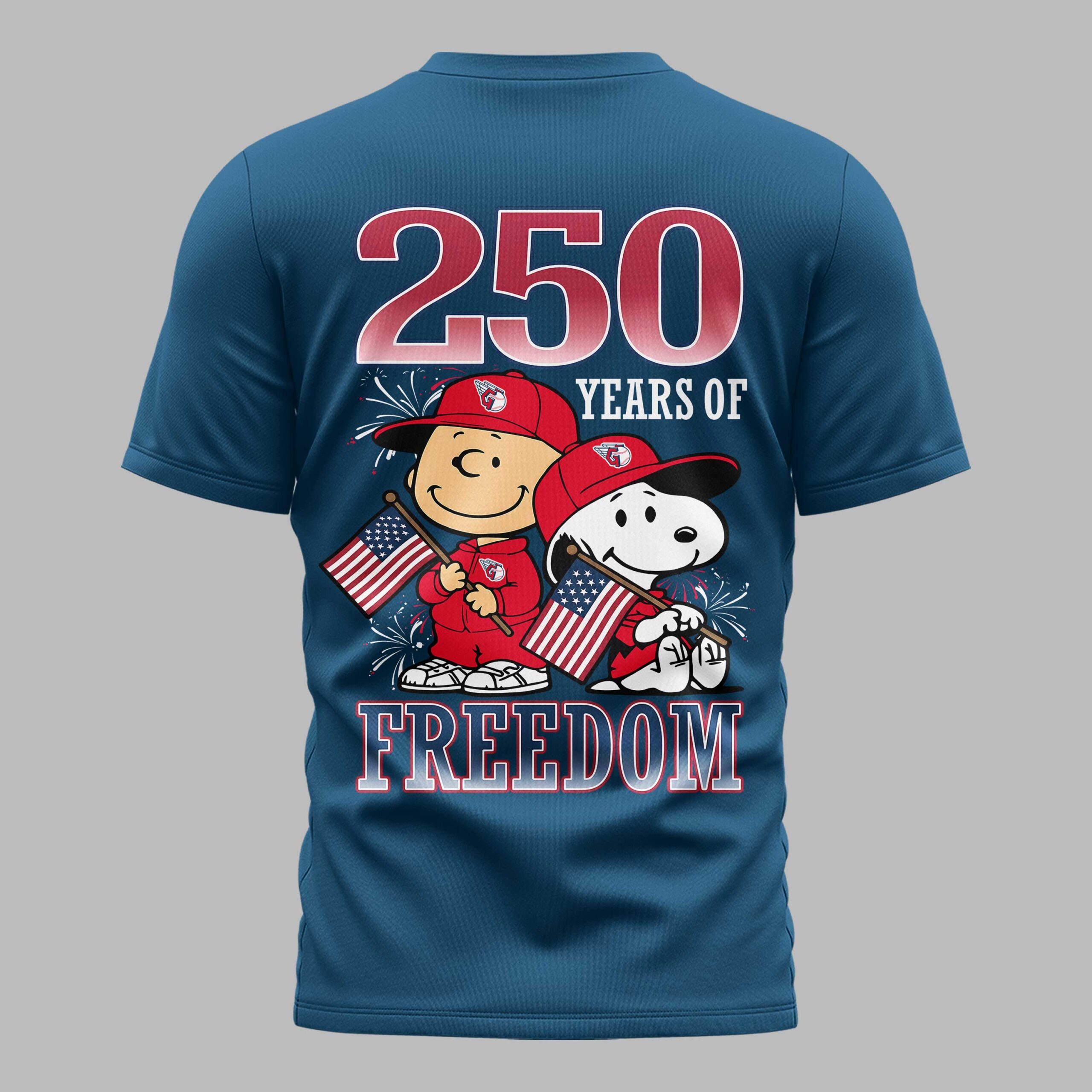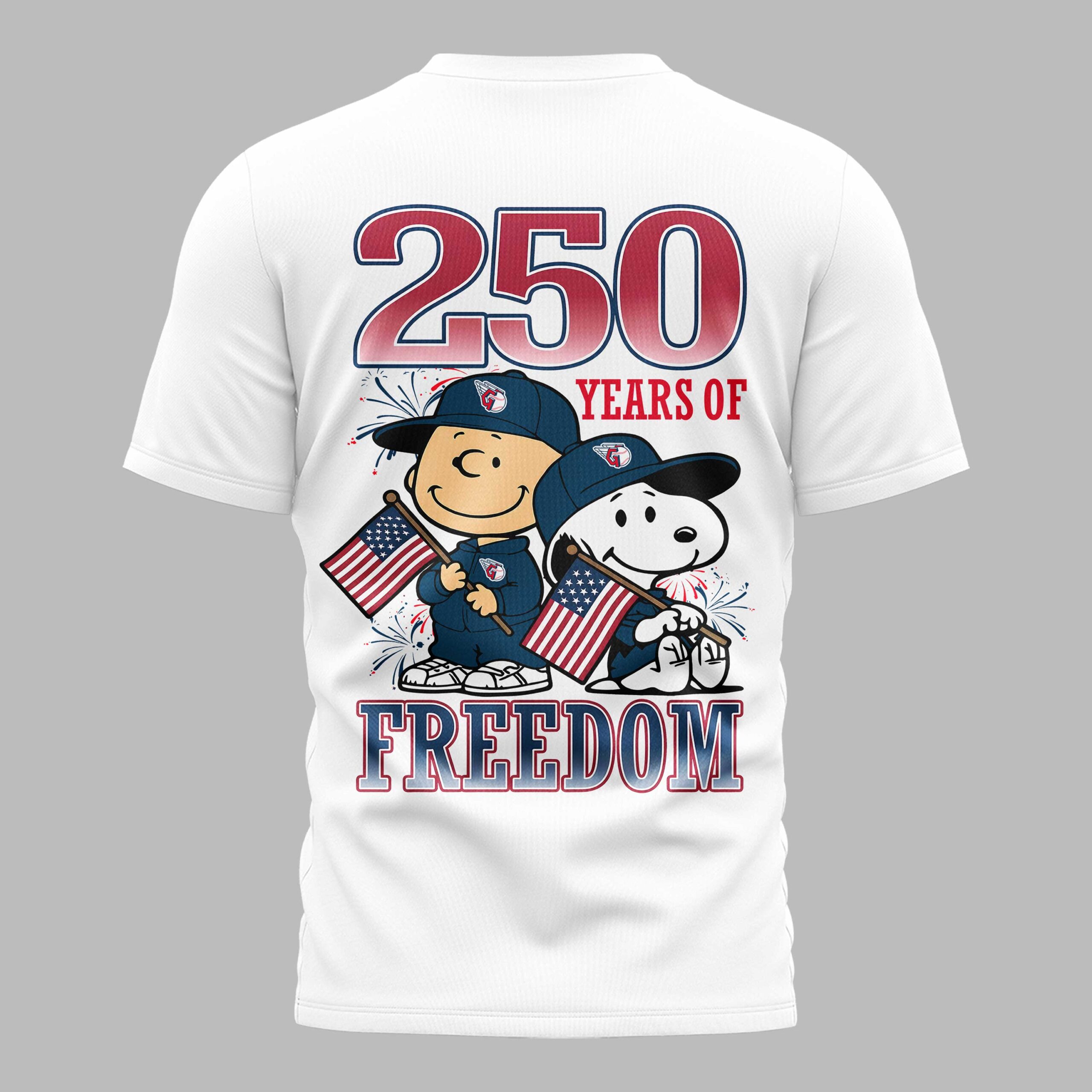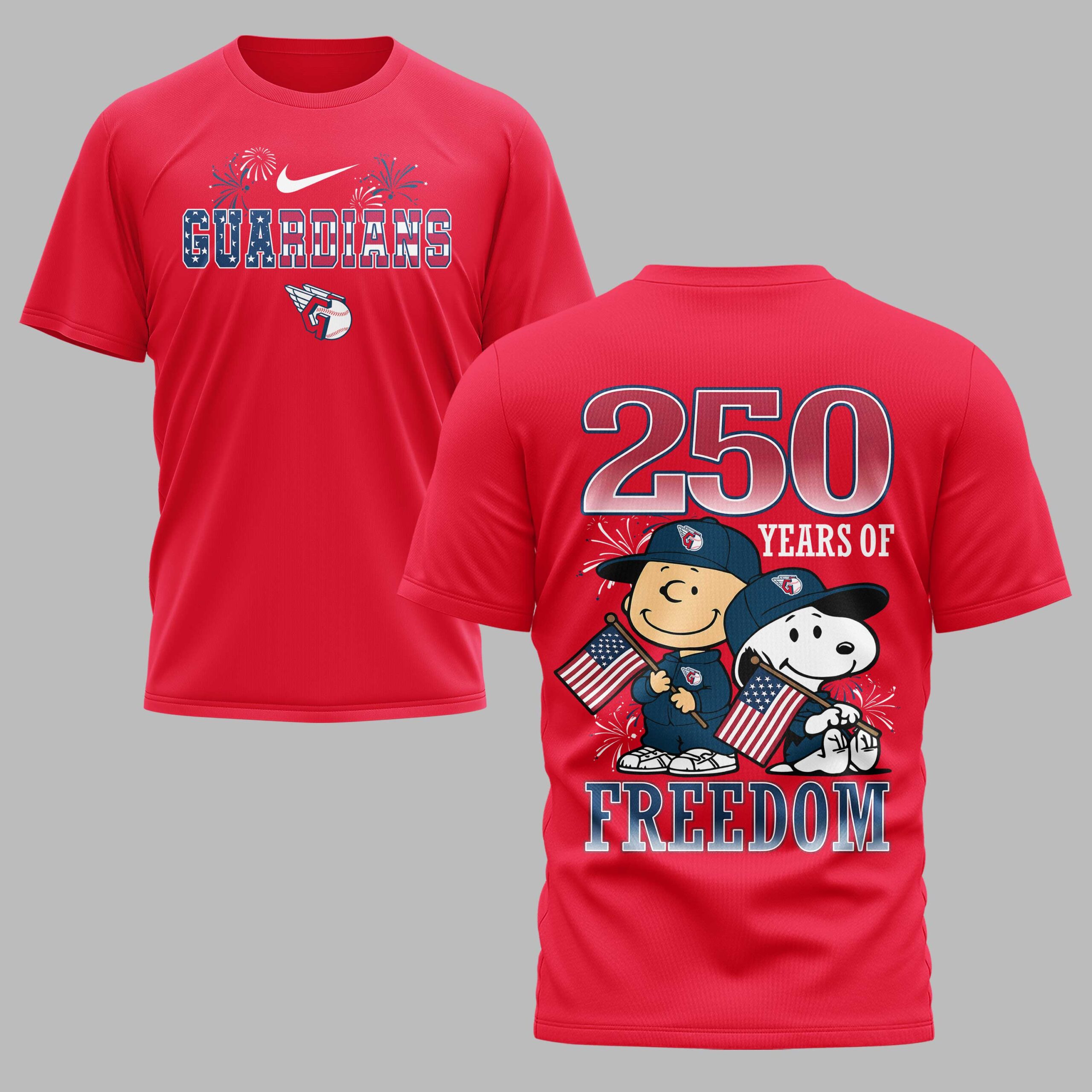 Celebrate America’s enduring spirit and your Cleveland Guardians pride with this unique patriotic tee! This vibrant shirt perfectly blends the beloved Peanuts characters with a powerful message, making it ideal for fans who cherish both baseball and national heritage. It’s a spirited way to honor 250 years of freedom while cheering on your favorite team. The front proudly displays GUARDIANS in a bold, stars-and-strips design, accented by a dynamic winged baseball G logo and celebratory fireworks. Turn around to reveal an iconic scene on the back: Charlie Brown and Snoopy, sporting Guardians caps and waving American flags, set against a backdrop of festive fireworks. Above them, a powerful 250 YEARS OF FREEDOM message is emblazoned in patriotic colors. Perfect for game day at the ballpark, Fourth of July celebrations, Memorial Day barbecues, or any occasion where you want to showcase your love for the Guardians and your country. Wear it to parades, family gatherings, or simply around town to share your dual passion for baseball and American liberty.