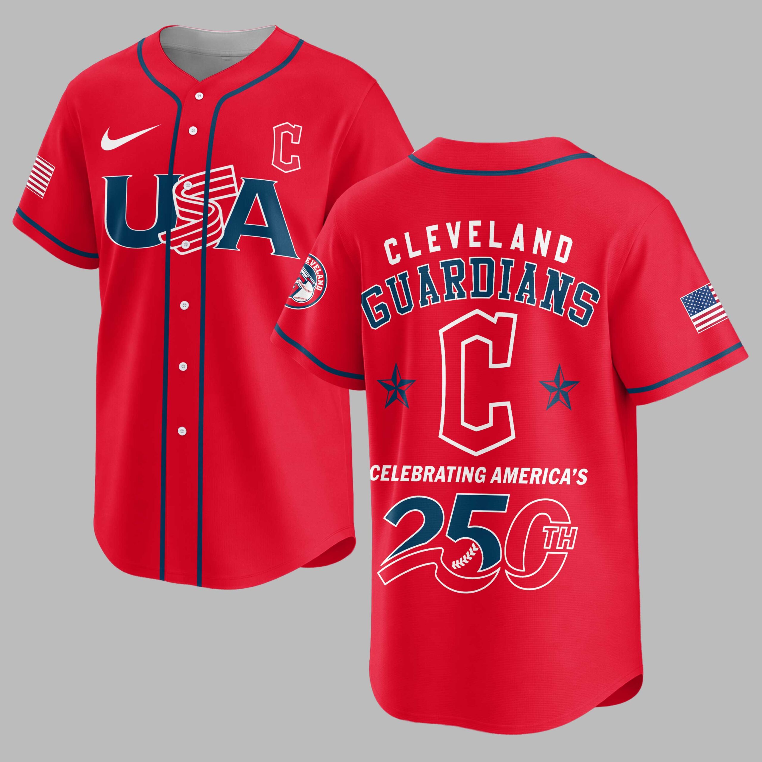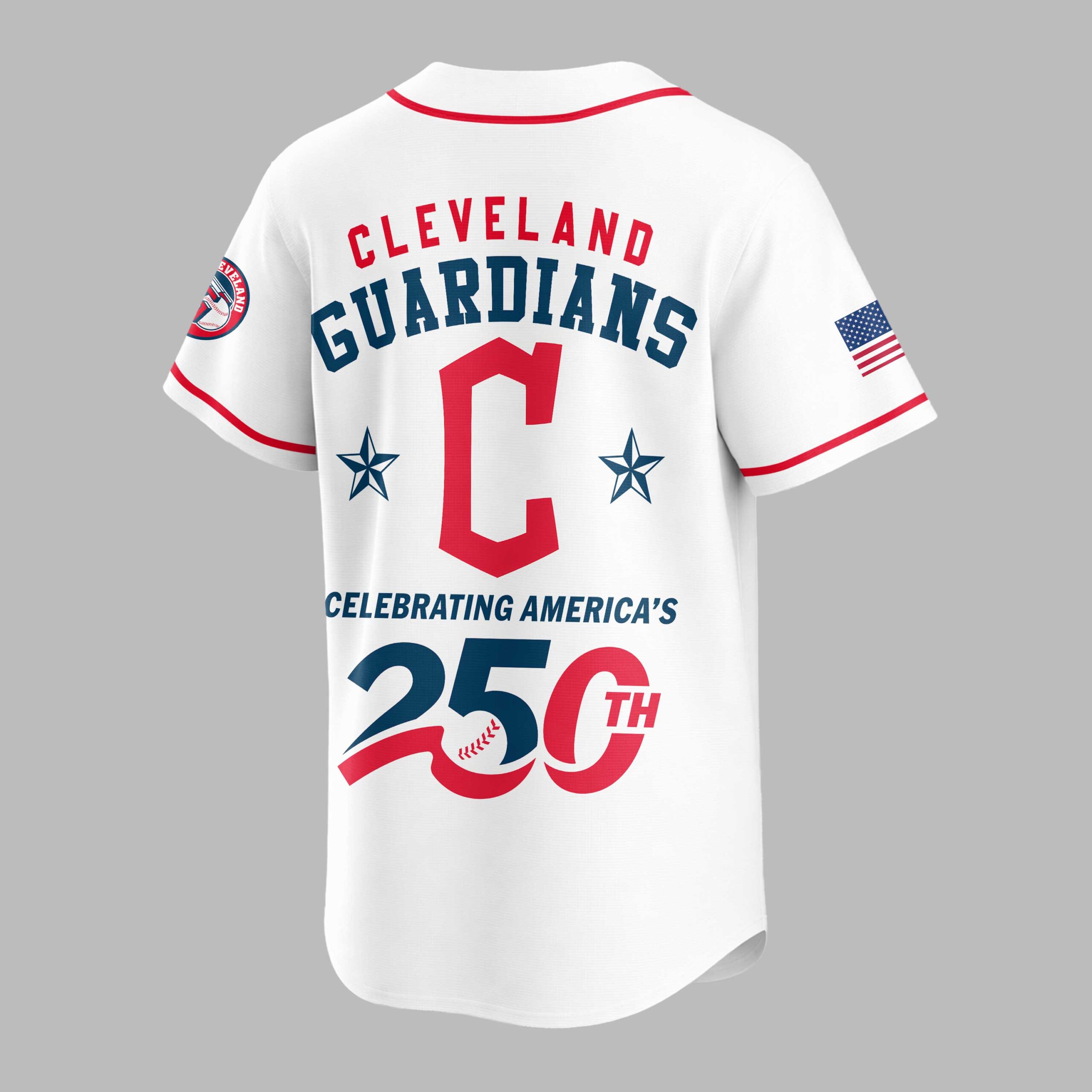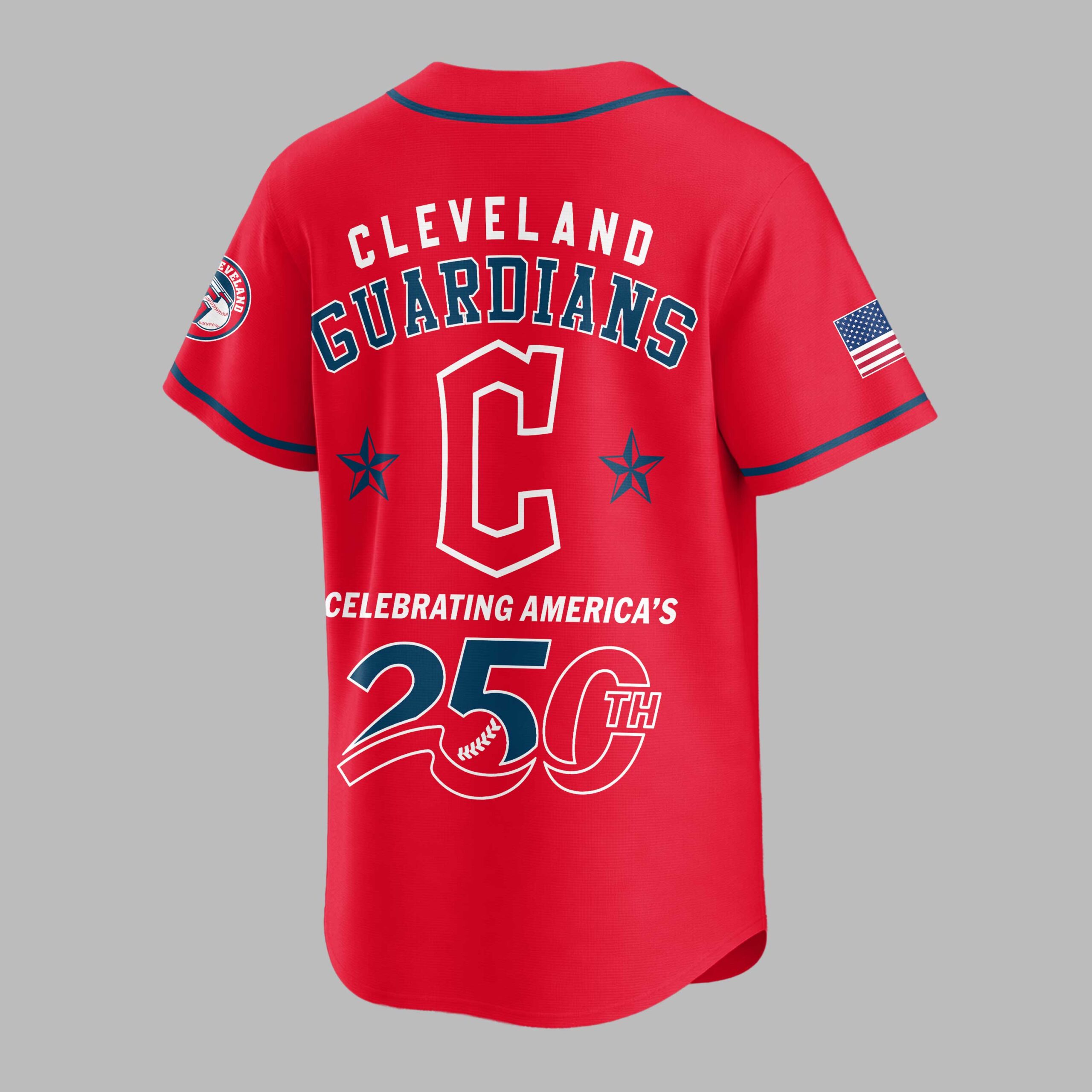 Celebrate America’s 250th anniversary and proudly display your Cleveland Guardians spirit with this special edition patriotic baseball jersey! This vibrant blue jersey perfectly blends spirited baseball fandom with heartfelt national pride. The front proudly features USA in a bold red, white, and blue design, complemented by the iconic Cleveland Guardians C logo. The back showcases CLEVELAND GUARDIANS arching over a large C flanked by stars. Below, CELEBRATING AMERICA’S 250TH is highlighted with a unique baseball graphic, with American flag patches adorning both sleeves. Ideal for game days, Fourth of July events, or any patriotic gathering. This jersey lets you cheer on the Guardians while honoring America’s rich history, making it a standout for fans and patriots to wear with pride.