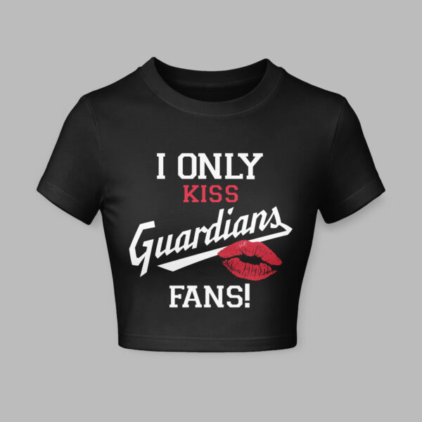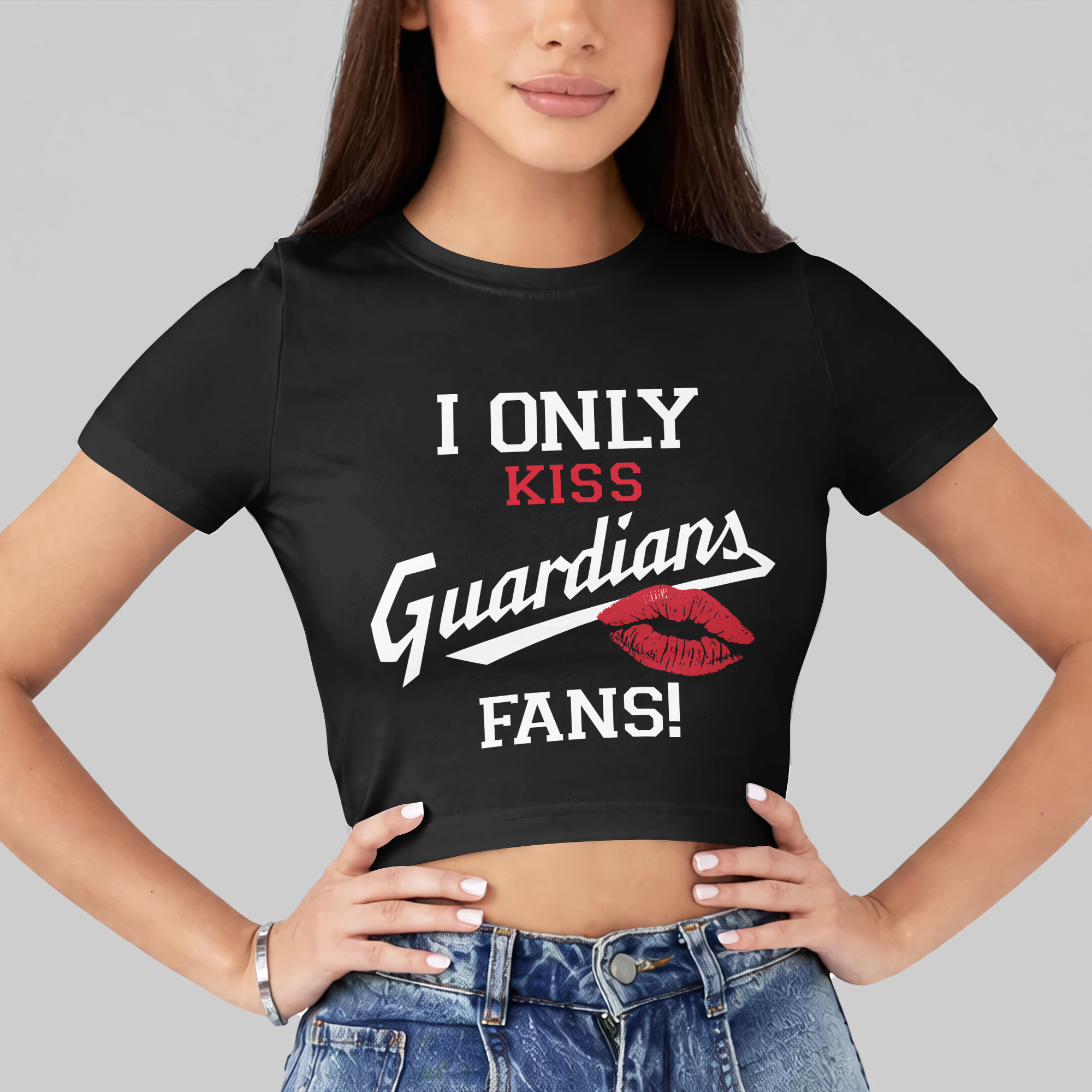 Declare your unwavering loyalty to the Cleveland Guardians with this fun and bold crop top! Perfect for game day at the ballpark, attending watch parties, or simply making a spirited statement around town. This shirt is designed to celebrate your dedication and connect with fellow enthusiasts, making a playful declaration of your devotion to the team. The front of this striking black crop top proudly features I ONLY KISS in white, with KISS highlighted in vibrant red. Below, Guardians is displayed in a stylish, italicized white font, underscored by a white line, and accompanied by a passionate red lipstick kiss mark. On the back, the iconic red, white, and blue MLB logo adds an authentic touch, signifying your love for America’s favorite pastime.