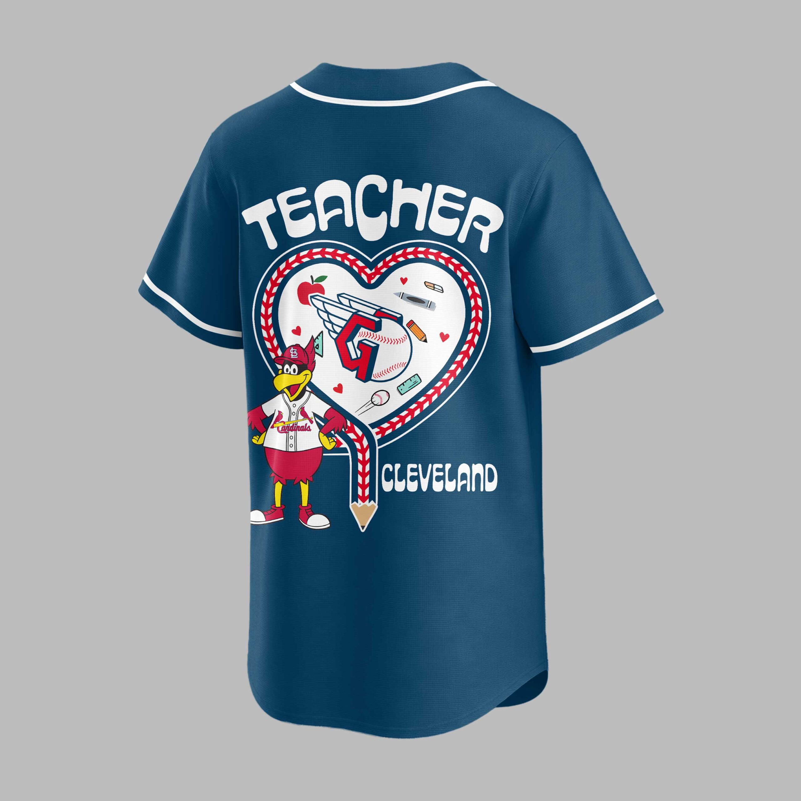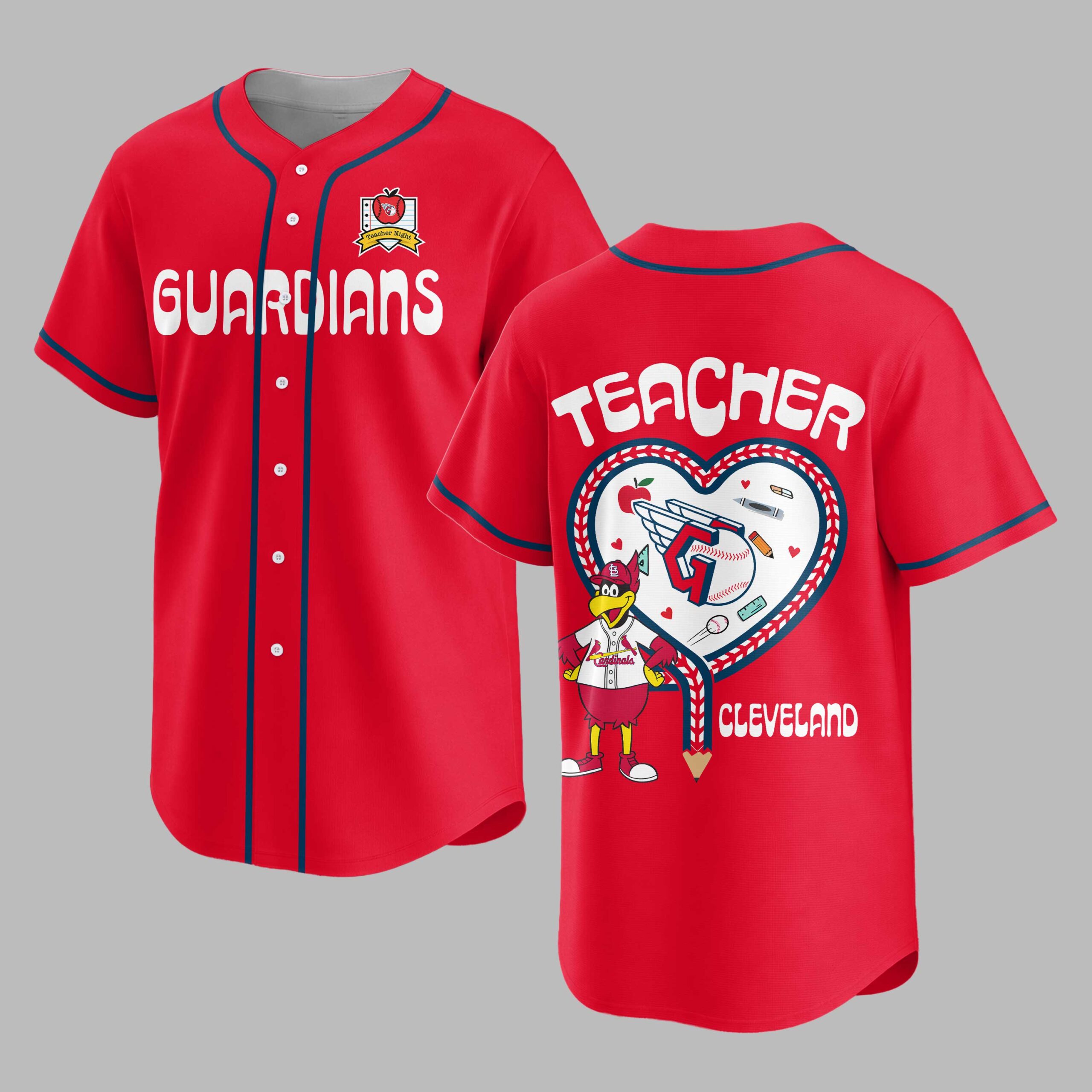 Celebrate your love for the Cleveland Guardians and the incredible work of educators with this unique baseball jersey! Perfect for any devoted fan who also champions the spirit of teaching, this shirt beautifully blends game-day excitement with heartfelt appreciation for our teachers. Show your dual pride and support for both the team and the classroom heroes who make a difference every day. The front proudly displays GUARDIANS in bold red lettering, complemented by a special Teacher Night logo featuring an apple, baseball, and notebook. Flip it around to showcase a vibrant design on the back, with TEACHER prominently featured above a heart outline made of baseball stitching. Inside, a playful array of school essentials like pencils, crayons, and a book surrounds a friendly bird mascot, all anchored by CLEVELAND at the bottom. This jersey is ideal for cheering on the Guardians at the ballpark, attending special Teacher Night events, or simply wearing to school on casual Fridays. It’s a fantastic way to honor the educators in your life or declare your own passion for both baseball and teaching, making it a standout addition to any fan’s wardrobe.
