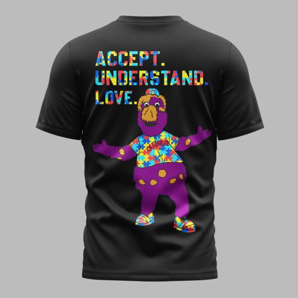 Show your unwavering support for the Cleveland Guardians and raise awareness for a vital cause with this unique tee. This shirt beautifully blends your passion for baseball with a powerful message of acceptance and understanding for Autism Awareness, making it a truly special addition to any fan’s wardrobe. The front proudly displays ‘CLEVELANDS GUARDIANS’ and the iconic ‘C’ logo, all vibrantly patterned with colorful puzzle pieces, alongside a Nike swoosh and an infinity symbol, both echoing the autism awareness theme. Turn around, and the back features the beloved Slider mascot, dressed in the same distinctive puzzle piece design, accompanied by the heartfelt declaration: ‘ACCEPT. UNDERSTAND. LOVE.’ Perfect for game days at Progressive Field, community events, or simply everyday wear, this shirt is more than just fan gear – it’s a statement. Wear it to show your team spirit and your commitment to a more inclusive world, celebrating both your favorite team and an important cause.