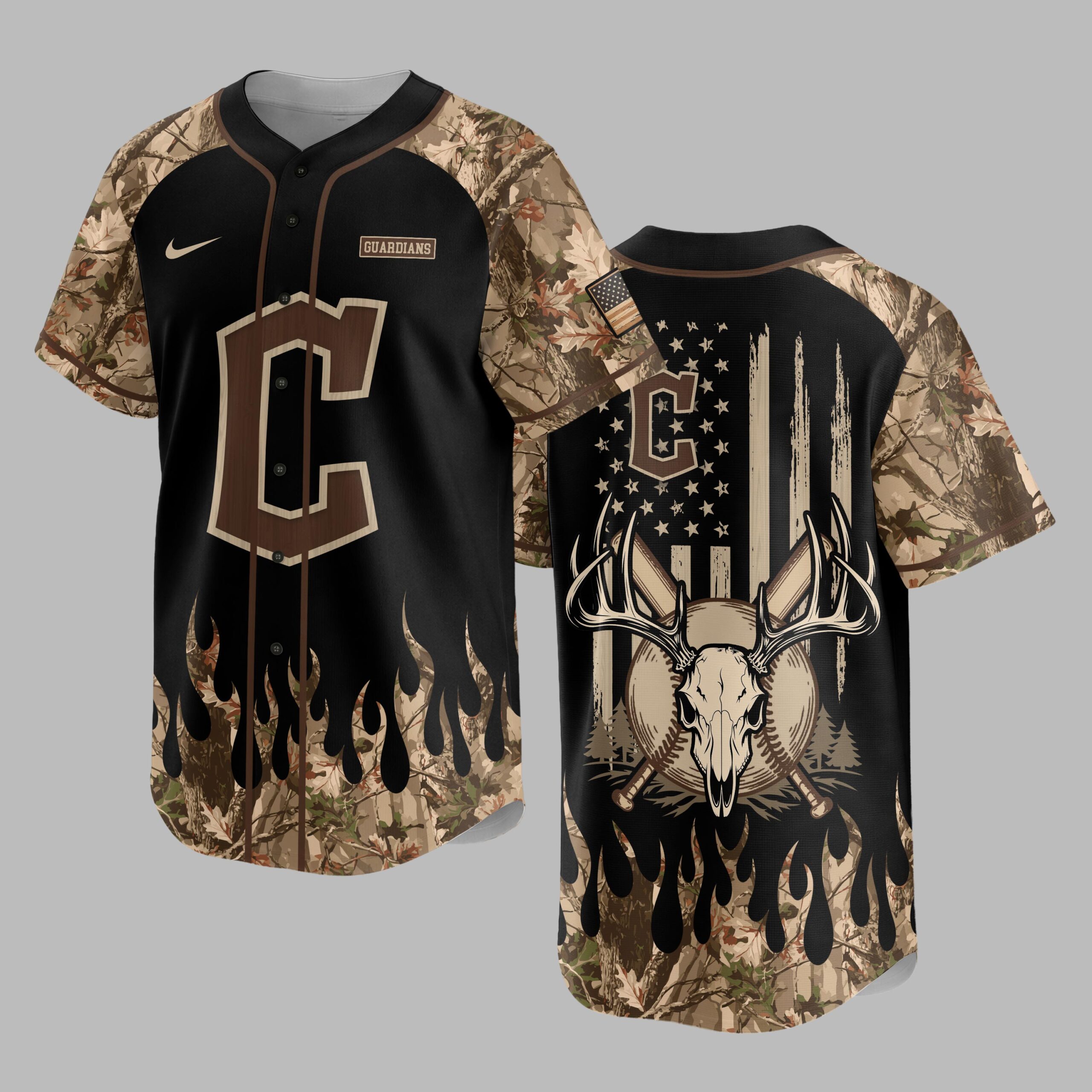 Show off your dual passion for the game and the wild with this distinctive Guardians baseball jersey. Perfect for fans who live for both the crack of the bat and the call of the outdoors, this shirt blends team spirit with an adventurous lifestyle. The front proudly displays a bold brown C with a unique wood grain texture outline, alongside GUARDIAANS text. Camouflage patterned sleeves and a striking flame-like camo design along the bottom hem add an untamed edge. The back features a powerful deer skull with majestic antlers, crossed baseball bats, and subtle pine trees, all set against a rustic American flag design. This versatile jersey is ideal for game day, hunting excursions, or simply showcasing your unique style around town. It’s the ultimate statement piece for anyone who embraces the Guardians spirit and a love for the rugged, patriotic outdoors.