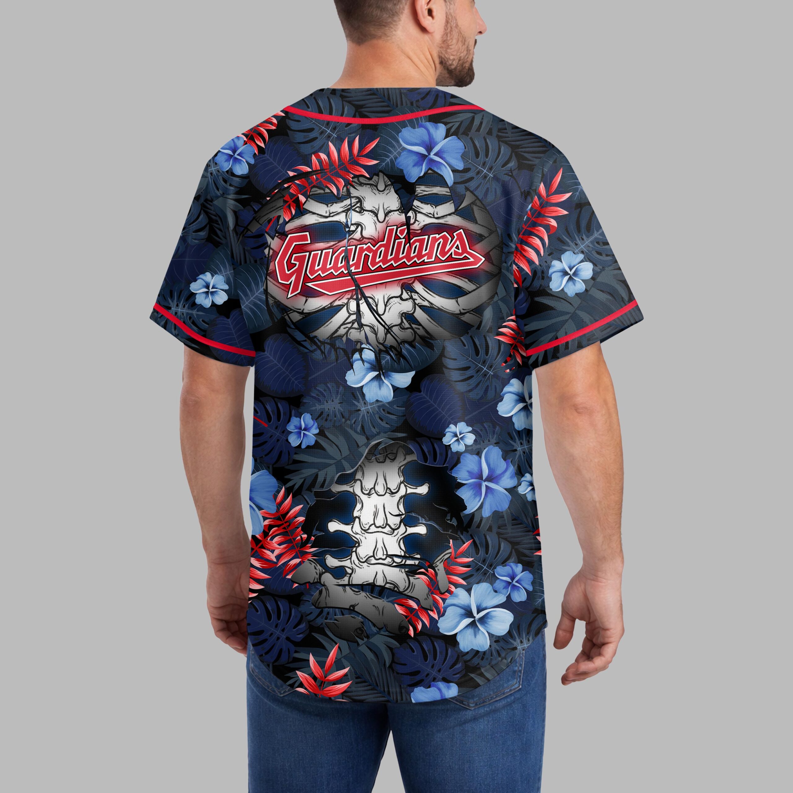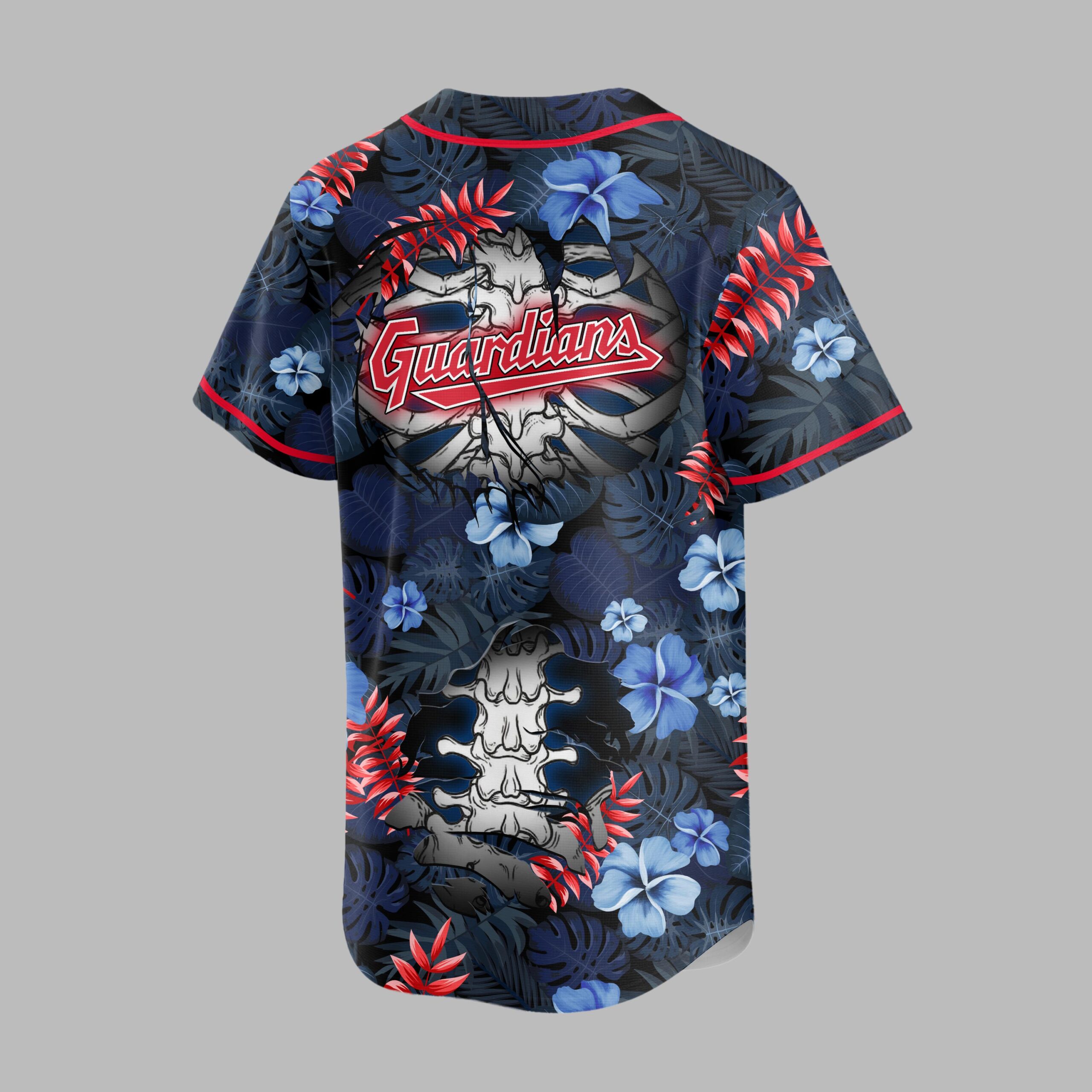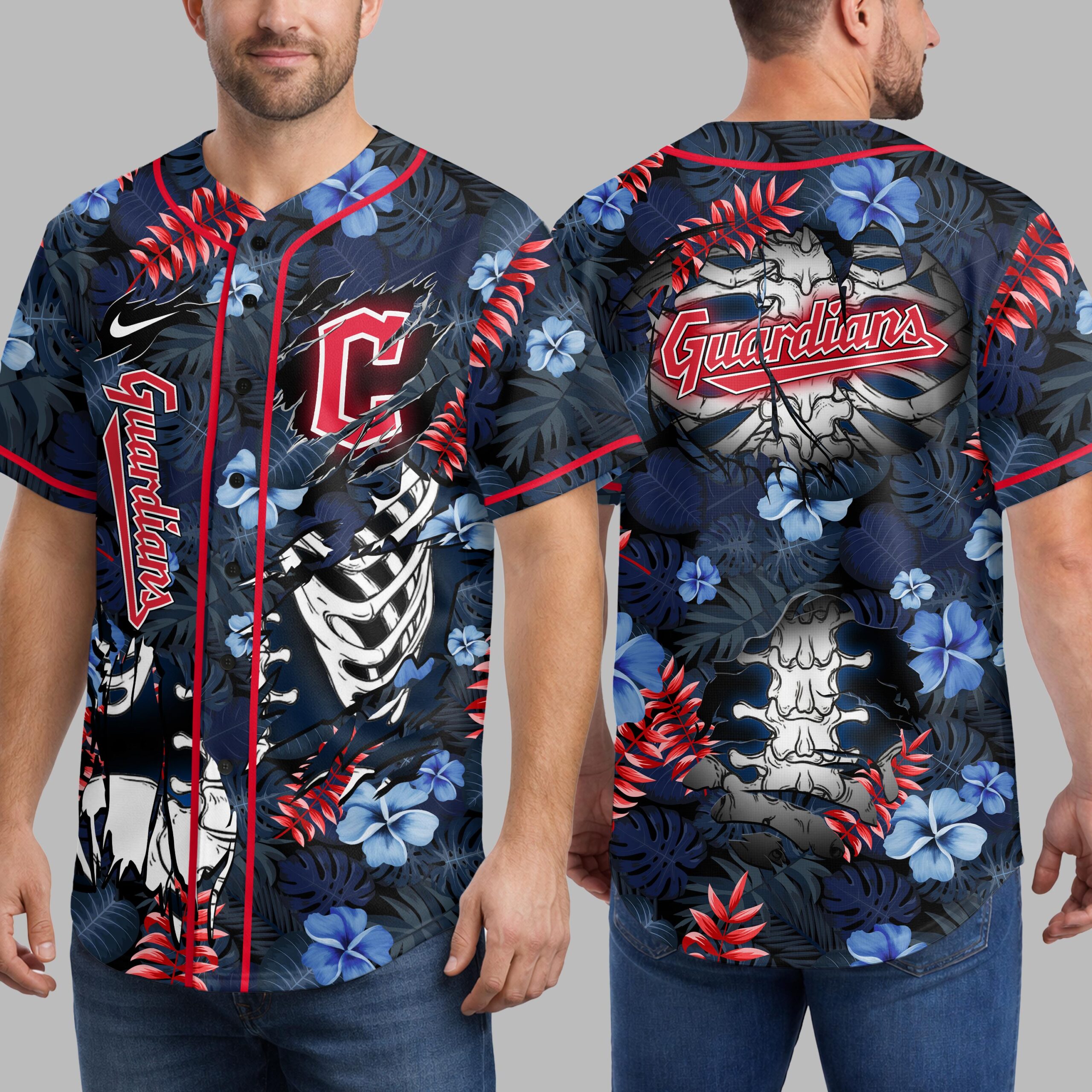 Show your unwavering support for the Guardians with a unique twist! This eye-catching baseball jersey blends classic fan apparel with an adventurous tropical and edgy design, perfect for making a bold statement and showcasing your fierce loyalty. The deep navy background features lush blue and dark green tropical leaves, accented by vibrant red and blue hibiscus flowers. The front boldly displays the ‘Guardians’ name vertically and a prominent ‘C’ logo, both strikingly integrated with a skeletal rib cage design. This daring motif continues on the back with the ‘Guardians’ name and a detailed skeletal spine, making your unique fandom visible. This spirited jersey is your go-to for gamedays, tailgates, or any casual outing where you want to stand out. Perfect for the ballpark, watch parties, or simply sunny days, it’s the ultimate way to celebrate your team with daring style.