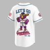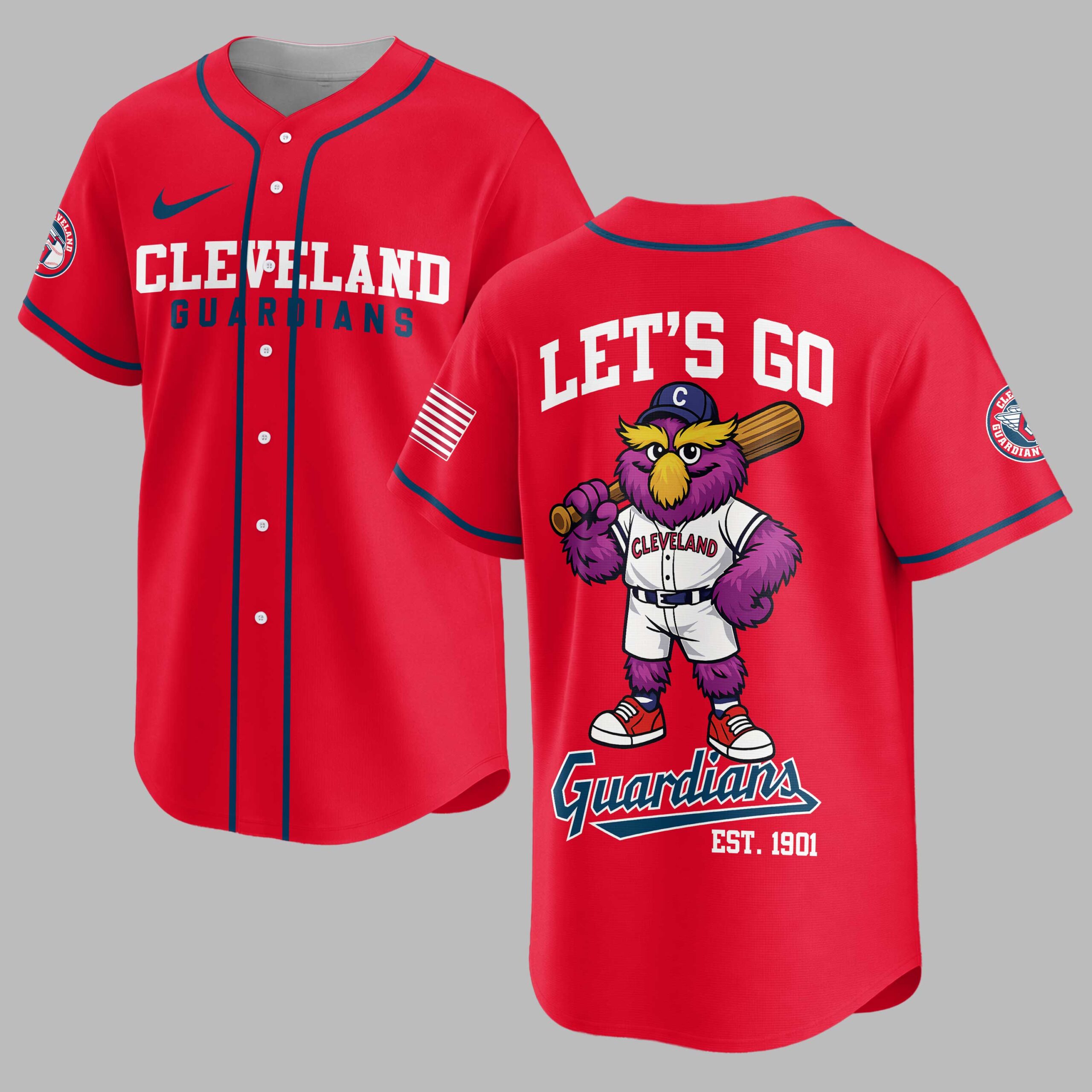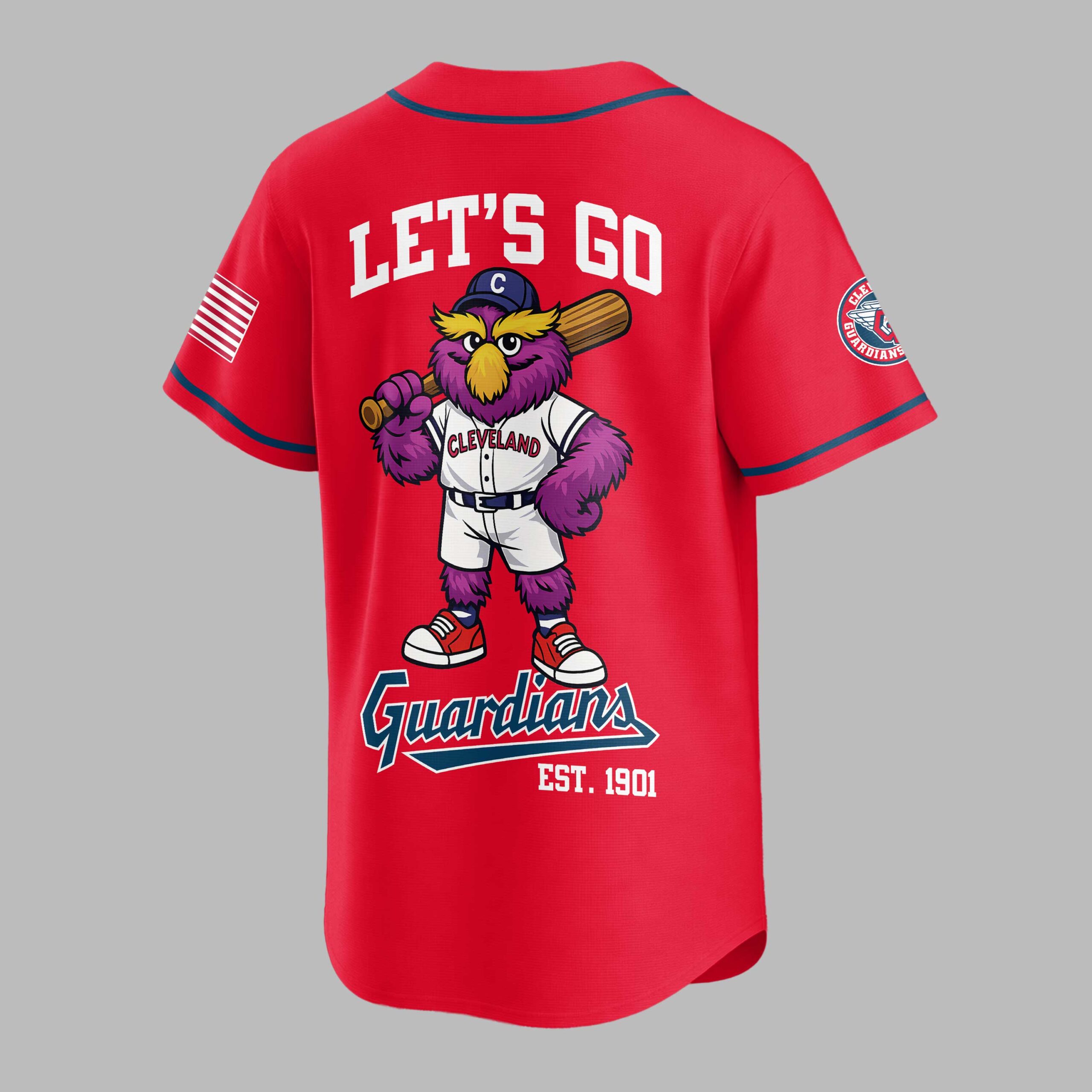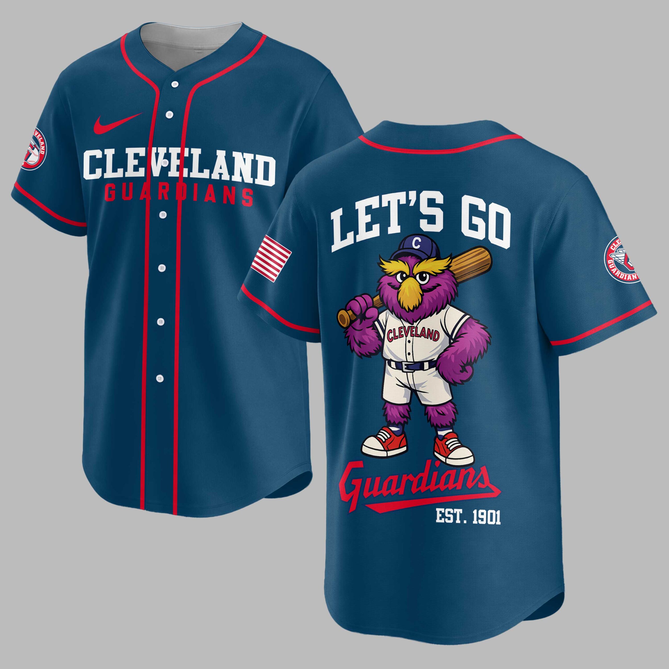 Unleash your ultimate team spirit with this dynamic Cleveland Guardians baseball jersey! Perfect for game day or any day you want to proudly display your allegiance, this shirt captures the vibrant energy and rich history of your favorite team. Let everyone know your baseball loyalty. The front proudly features CLEVELAND in bold blue and GUARDIANS in striking red across the chest, complemented by the classic team patch on the sleeve. The back gets you ready to cheer with the LET’S GO slogan in prominent blue, paired with an exciting graphic of the purple Guardians mascot, bat in hand. Guardians in dynamic red script and EST. 1901 honor the team’s legacy. Ideal for cheering from the stands, hosting a watch party, or daily wear, this jersey delivers the ultimate fan experience. Connect with fellow Guardians enthusiasts and celebrate every victory with undeniable team spirit.