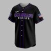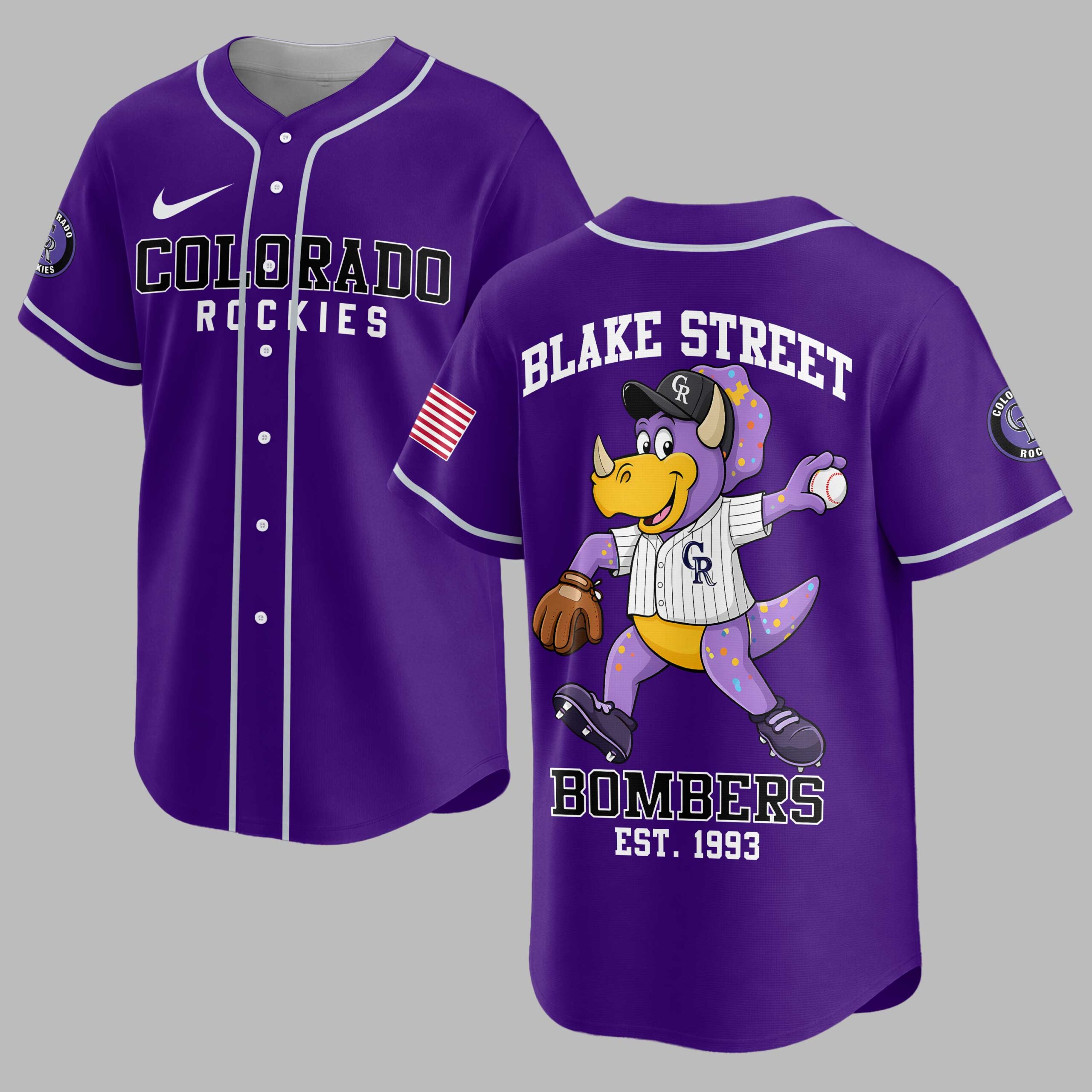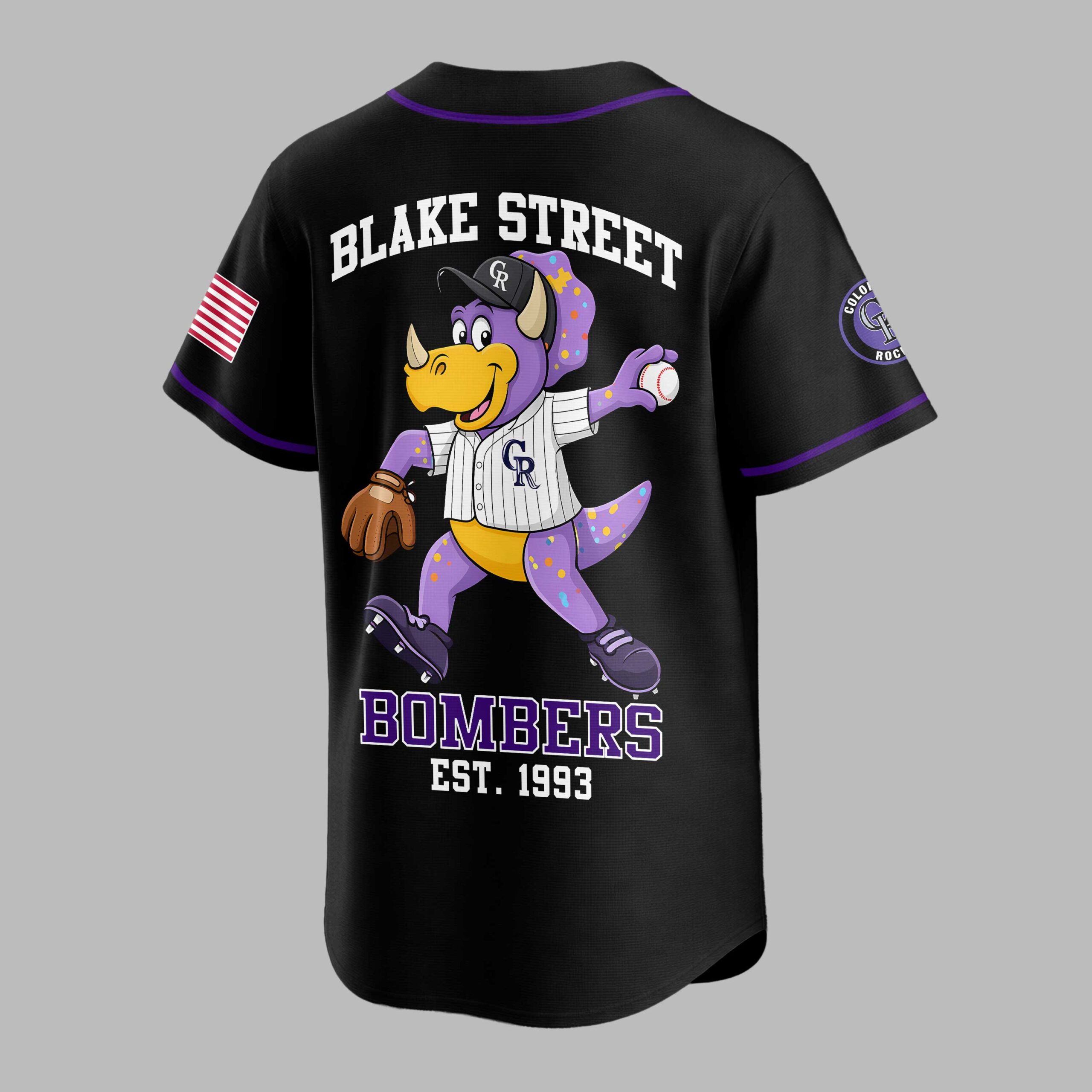 Celebrate Colorado Rockies history and show unwavering team pride with this Blake Street Bombers baseball jersey! It embodies a legendary era and the thrilling spirit of Colorado baseball, perfect for any dedicated fan. The front features COLORADO ROCKIES in bold purple, alongside the classic team logo on the left sleeve and an American flag patch. The back showcases a playful purple dinosaur mascot in a baseball uniform, mid-pitch. BLAKE STREET is above, with BOMBERS and EST. 1993 below, crafting an iconic, nostalgic design. This jersey is ideal for game day at the stadium, watch parties, or showing your pride around town. Wear it to sporting events or casual outings to represent your favorite team with historical flair.