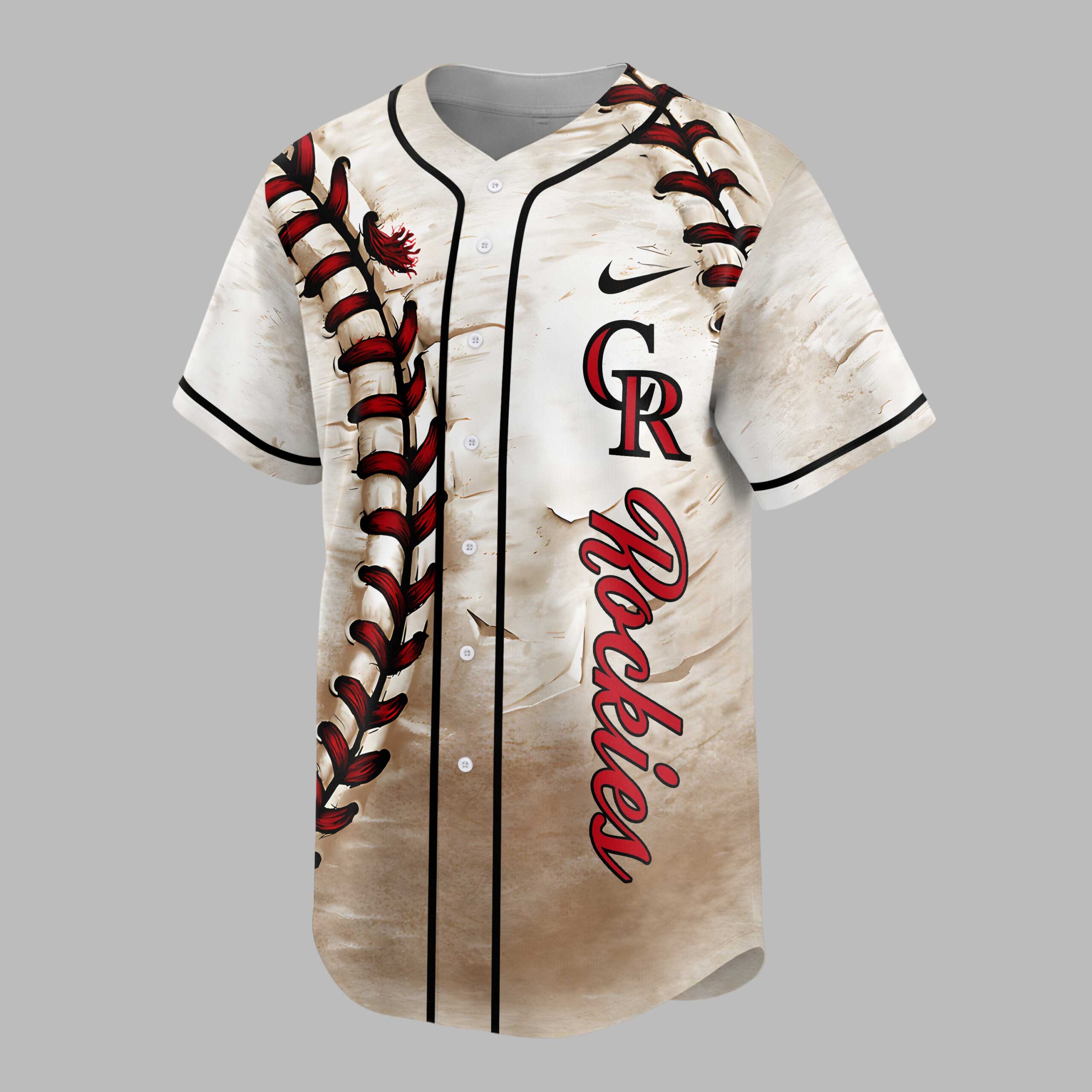 Ignite your game day spirit with this custom Colorado Rockies baseball jersey! Tailored for the ultimate fan, this unique shirt allows you to proudly display your team loyalty with a personal touch, standing out in the crowd. The front design showcases a bold CR Rockies logo paired with a striking baseball stitch graphic running down the side. The back is fully customizable with Your Name and your chosen 00, both featuring intricate baseball lace patterns. The overall distressed, vintage look gives it an authentic, worn-in feel. Perfect for cheering from the stands, hosting watch parties, or simply showing off your Rockies pride daily. This versatile jersey captures your passion for baseball and your favorite team, making every outing a celebration.
