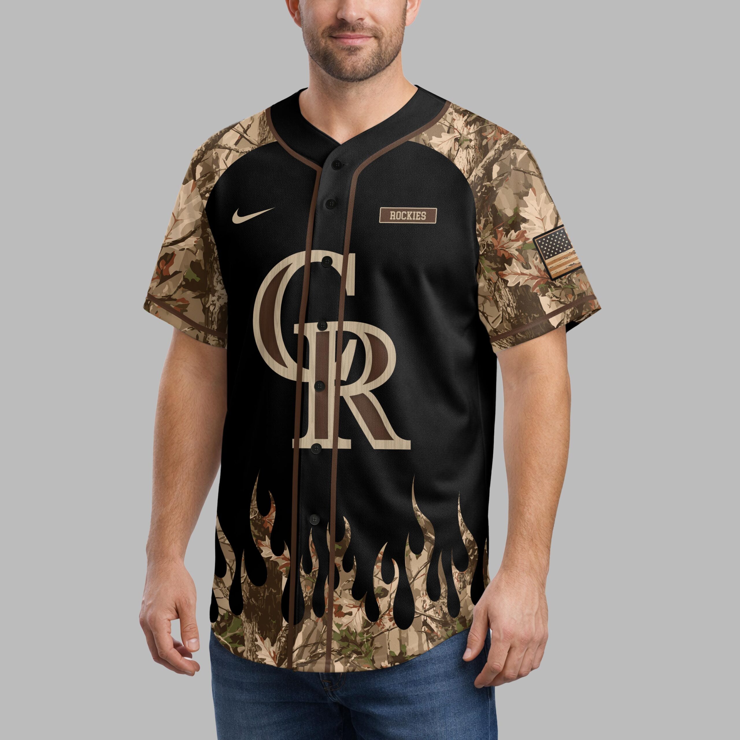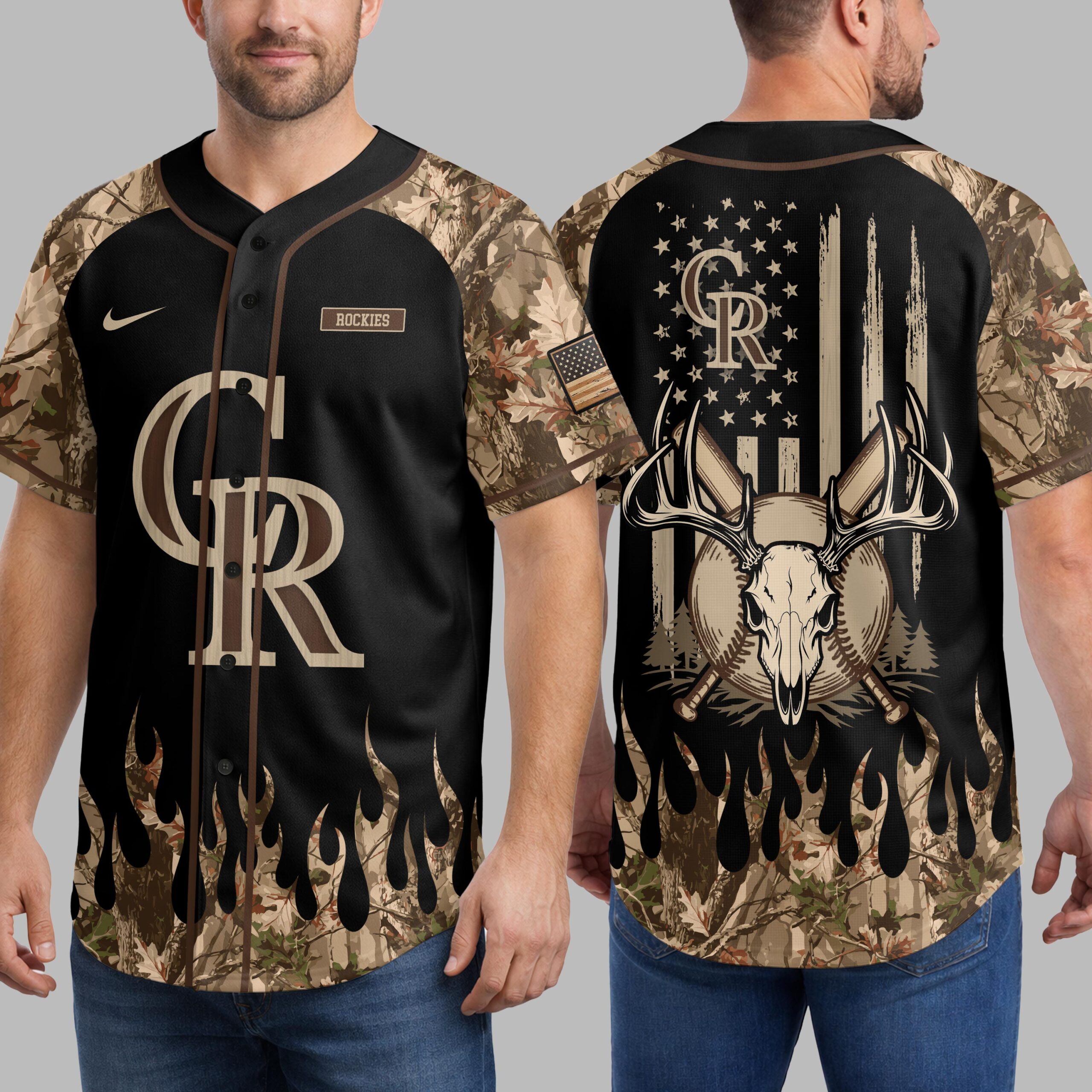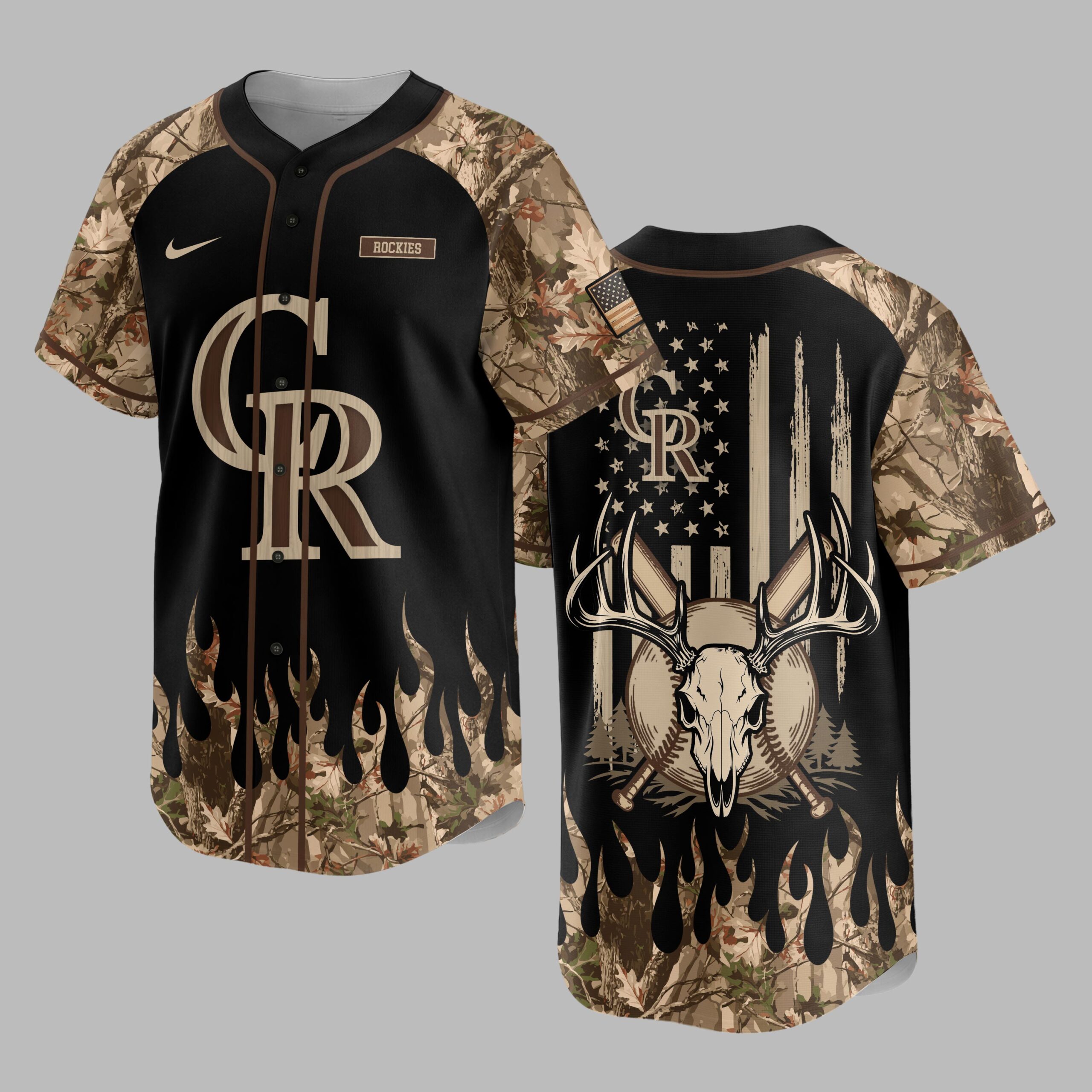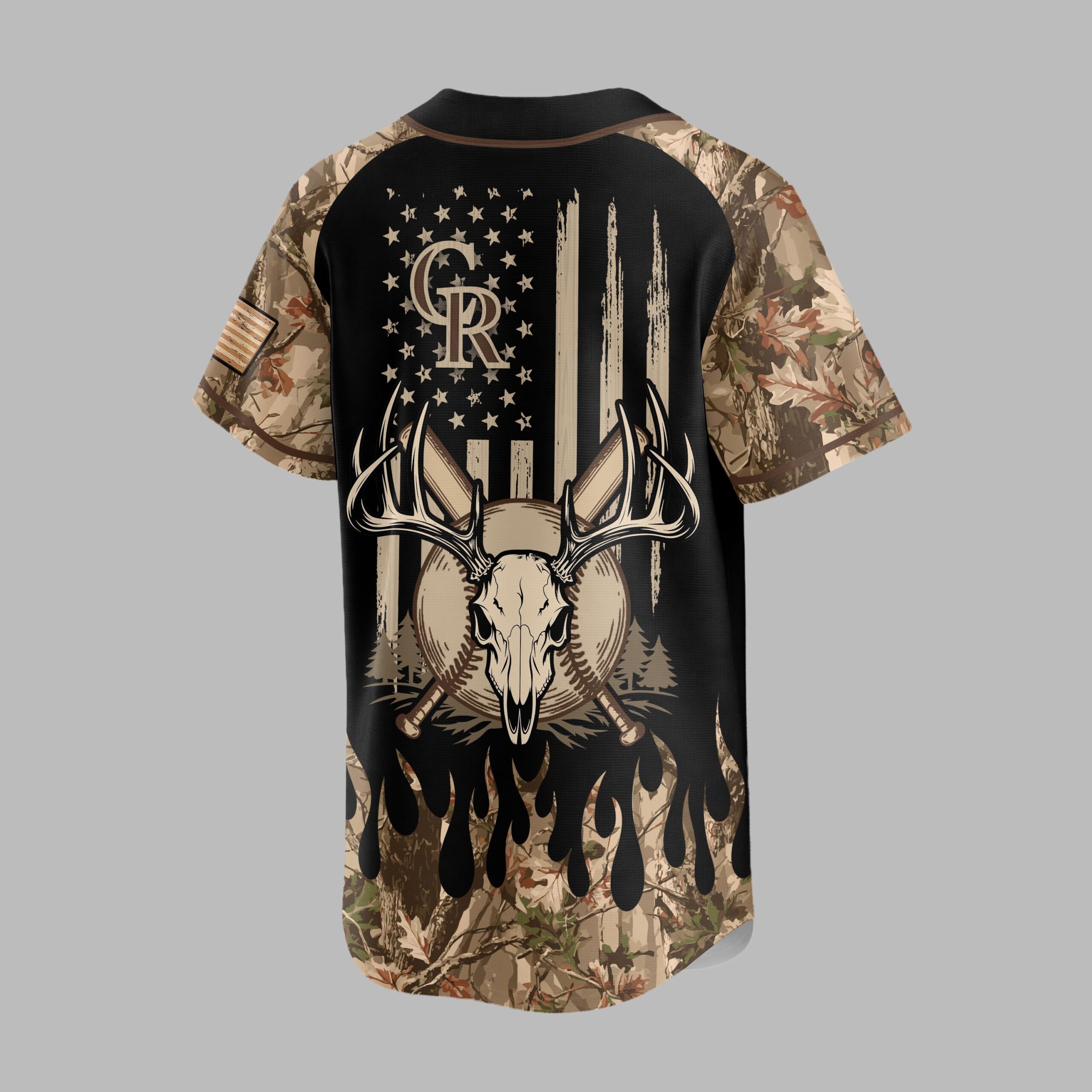 Showcase your Colorado Rockies passion with a rugged, patriotic flair! This unique baseball jersey merges team pride with an adventurous spirit, ideal for fans who love both the game and the great outdoors. The front proudly displays the CR monogram in woodgrain texture on black, framed by camouflage sleeves and a distinctive flame-like camo trim. The back features a powerful distressed American flag design, accented by the CR logo and a striking deer skull with antlers, crossed bats, and pine trees. A sleeve-patch flag adds a final touch. Perfect for the ballpark, hunting trips, or any outdoor gathering. This jersey lets you confidently express your diverse loyalties, celebrating your team, country, and adventurous lifestyle.