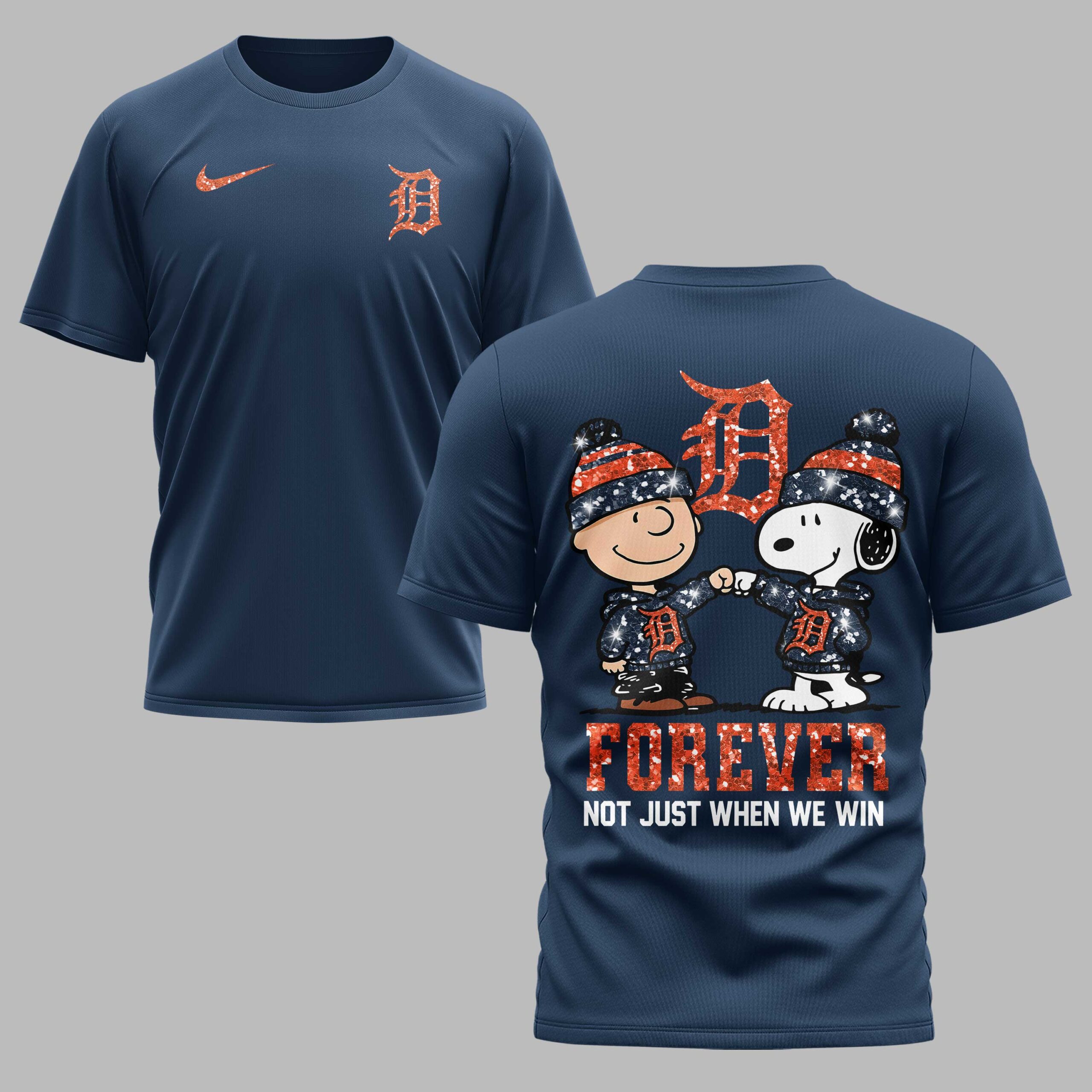 Show off your unwavering loyalty to the Motor City with this Detroit Tigers fan tee. Designed for those who bleed navy and orange, this shirt celebrates the enduring spirit of the Tigers alongside a touch of American pride. It’s the perfect way to honor the team’s legacy while looking forward to the next big celebration in the heart of Detroit. The front features the iconic Old English ‘D’ displayed prominently on the chest for a classic, clean look. Flip it around to find a heartwarming graphic of Charlie Brown and Snoopy sharing a celebratory fist bump. Both characters are decked out in Tigers gear, set against a shimmering FOREVER Not Just When We Win slogan. The sparkling textures and bold, patriotic-inspired lettering make this unique design truly pop. Whether you’re heading to Comerica Park for a summer doubleheader, hosting an Independence Day cookout, or just repping your city on the weekend, this shirt is your new go-to. It’s a must-have for any true fan who stands by the Tigers through thick and thin.