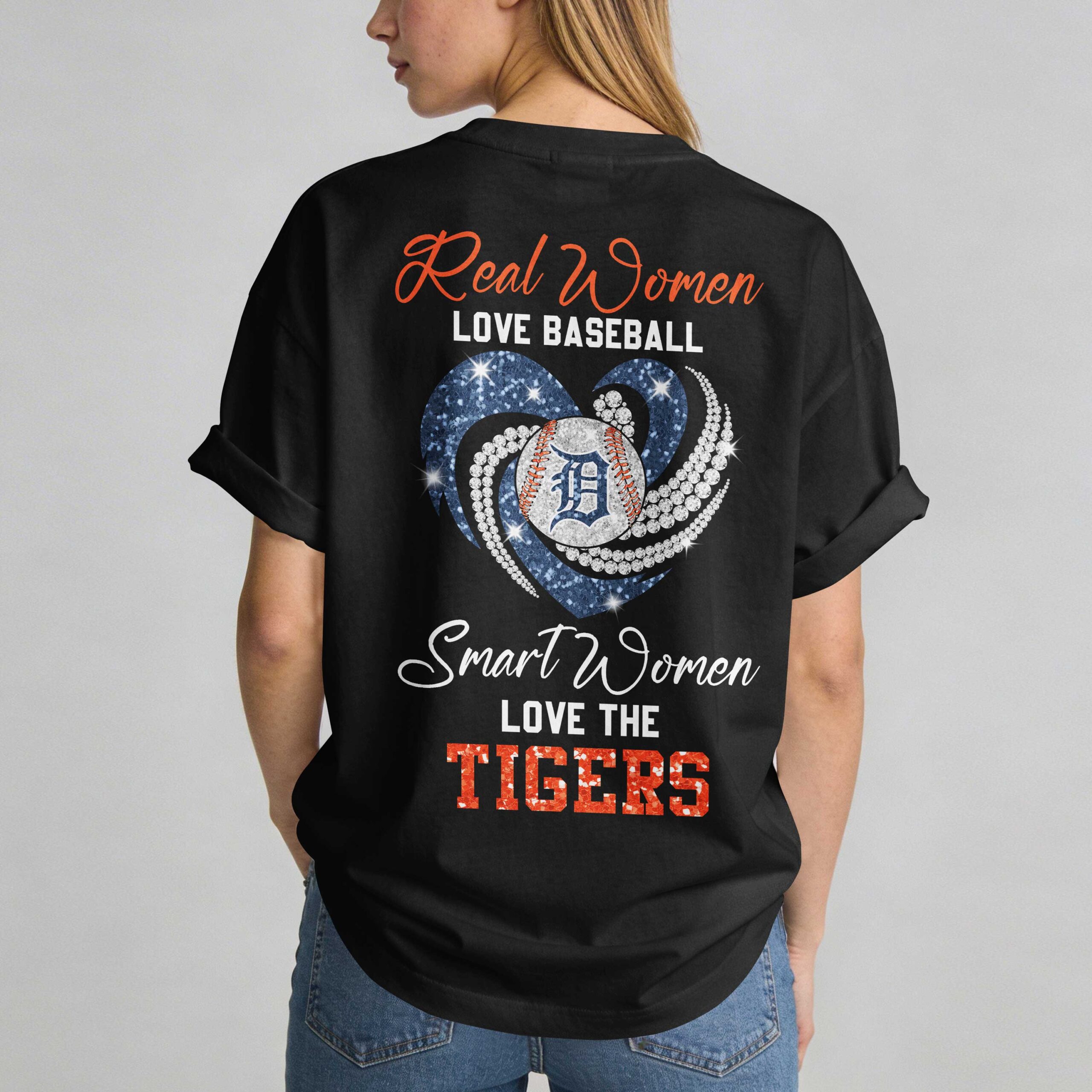 Show off your Motor City spirit and American pride with this stunning Detroit Tigers fan tee. Designed for dedicated female fans, this shirt blends iconic baseball tradition with a bold, patriotic flair. It’s a brilliant tribute to your team and the USA, making it a standout addition to any loyal supporter’s wardrobe. The front features a vibrant orange glitter Tigers script alongside the classic Old English D and a stars-and-stripes themed swoosh. The back makes a powerful statement with the phrase, Real Women Love Baseball, Smart Women Love the Tigers, highlighted by a dazzling heart graphic composed of blue and silver glitter swirls surrounding a logo-branded baseball. This eye-catching shirt is your go-to choice for game days at Comerica Park, Independence Day celebrations, or everyday wear around town. Let everyone know you’re a proud, passionate fan who stands tall with the Detroit Tigers.