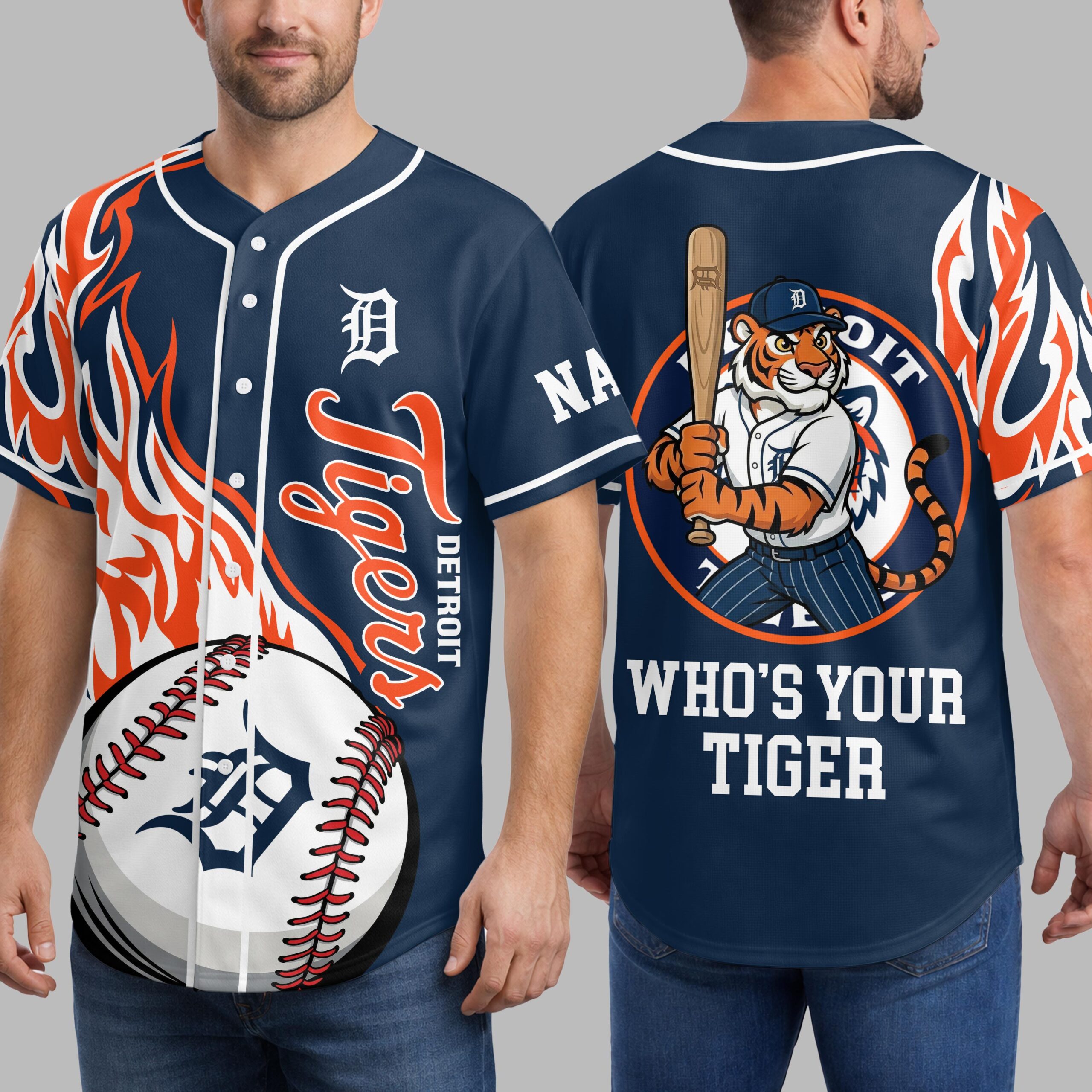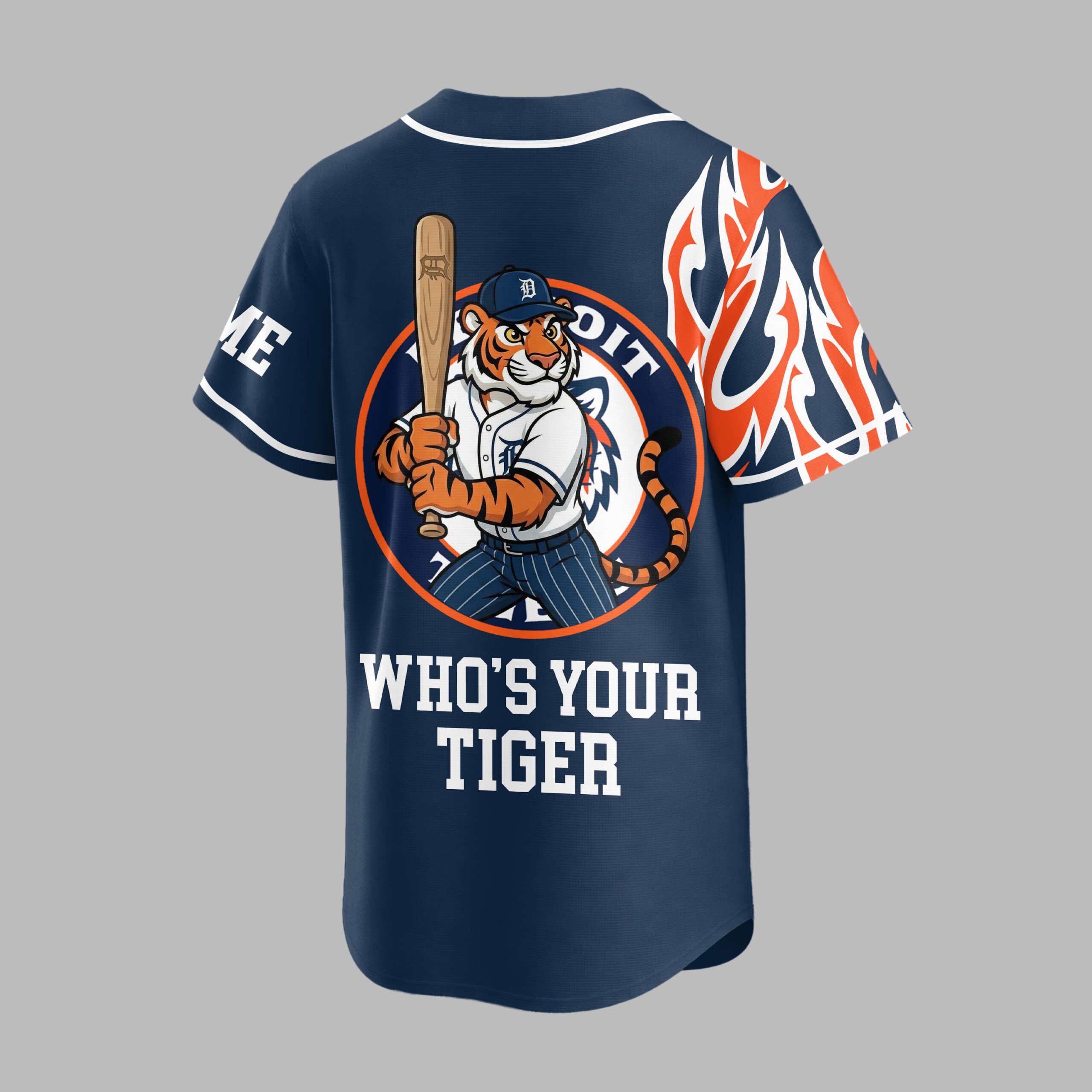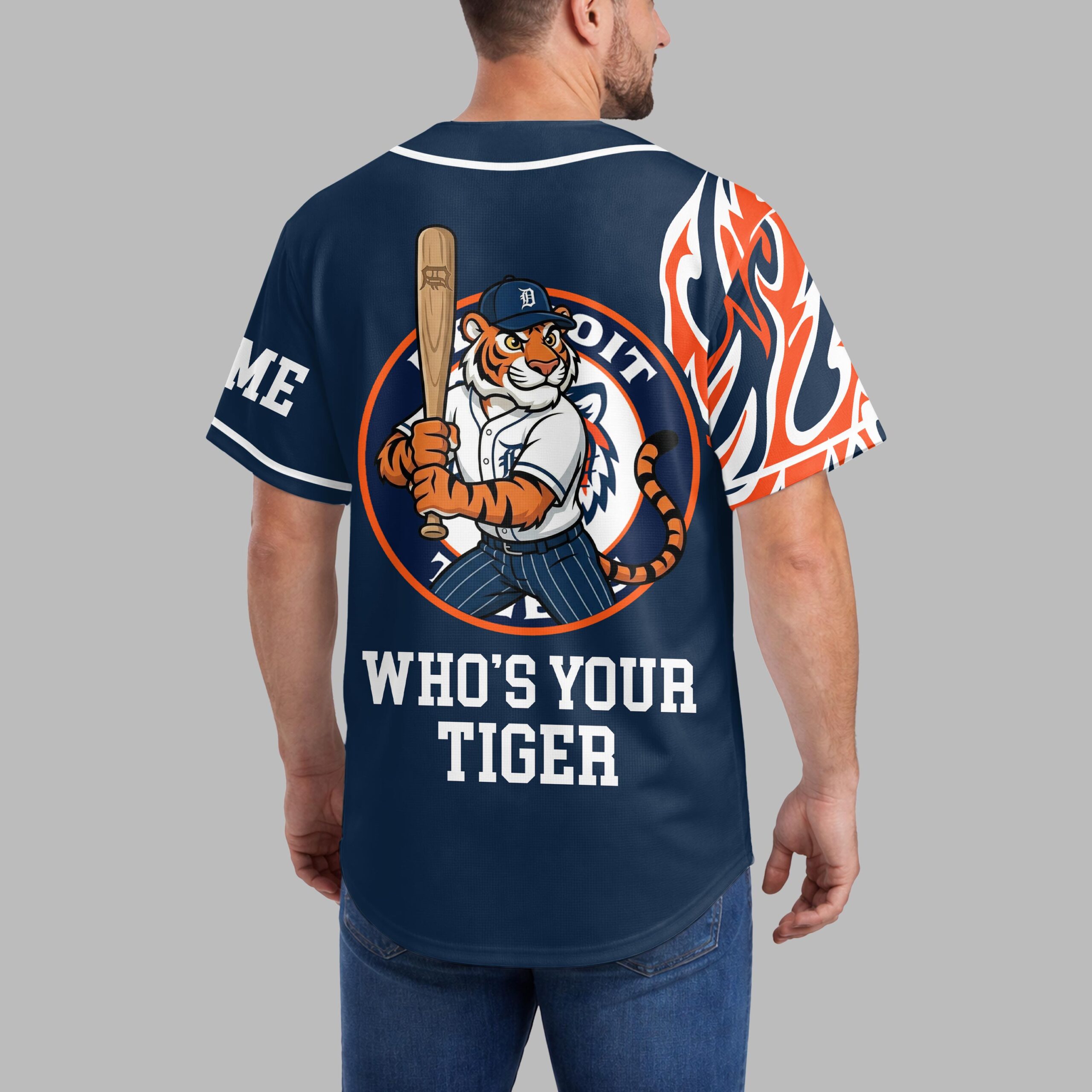 Ignite your passion for baseball and stand out in the crowd with this dynamic Detroit Tigers fan jersey! Perfect for dedicated fans, this jersey lets you wear your team pride boldly. Get ready to cheer on the Tigers with a look that’s as fiery as your spirit. The front features the iconic Detroit D logo on the chest, complemented by the Tigers DETROIT script and a vibrant baseball graphic. Flames in spirited orange and white streak across the shoulders and sides, adding an extra burst of energy. On the back, a playful cartoon tiger in a full baseball uniform swings a bat, encircled by the team city, alongside the spirited question, WHO’S YOUR TIGER?. You can even customize it with your own name above the design, making it uniquely yours. Whether you’re catching a game at the stadium, hosting a watch party, or simply showing off your team loyalty around town, this jersey is your ultimate game-day essential. It’s ideal for any occasion where you want to celebrate your favorite team and connect with fellow Tigers enthusiasts.