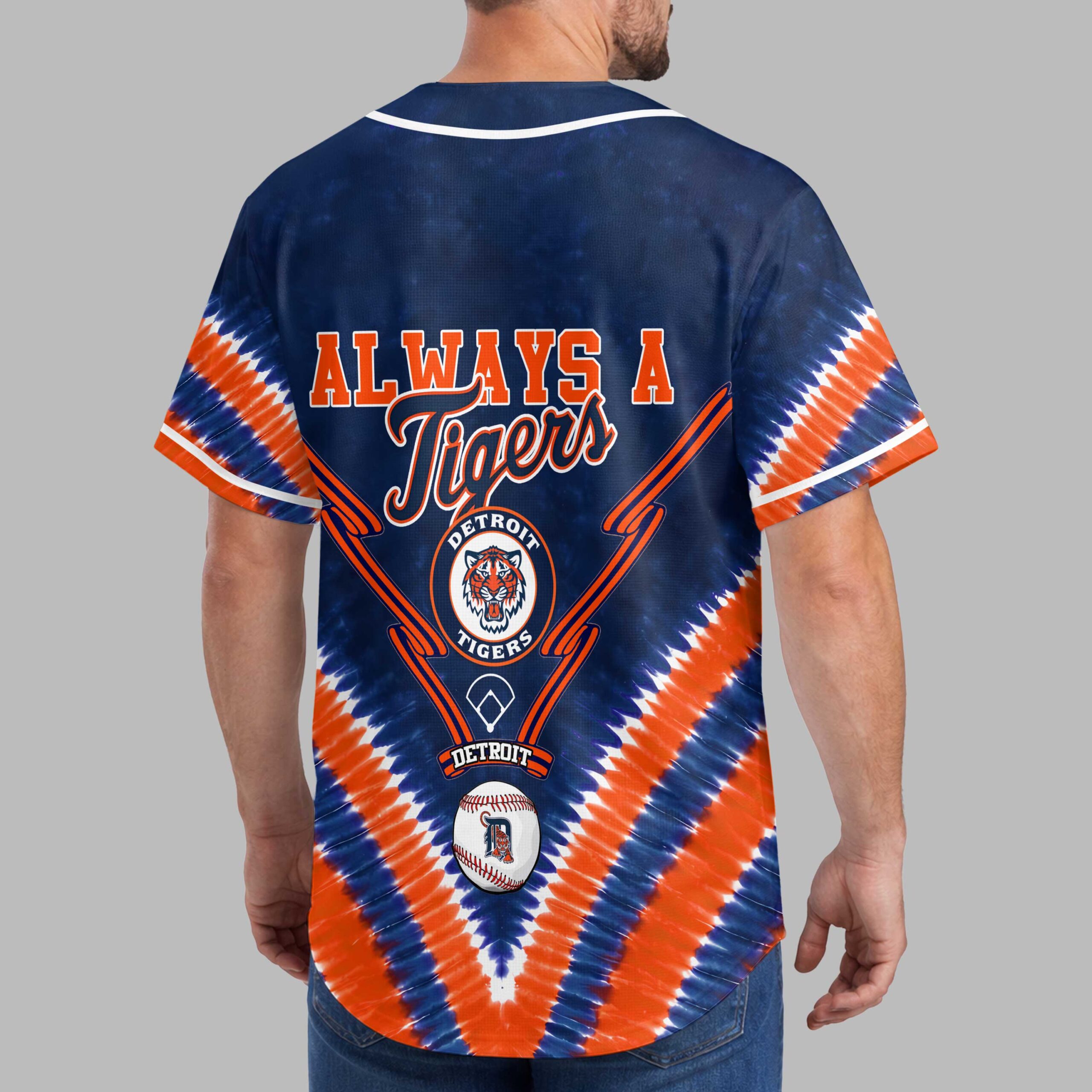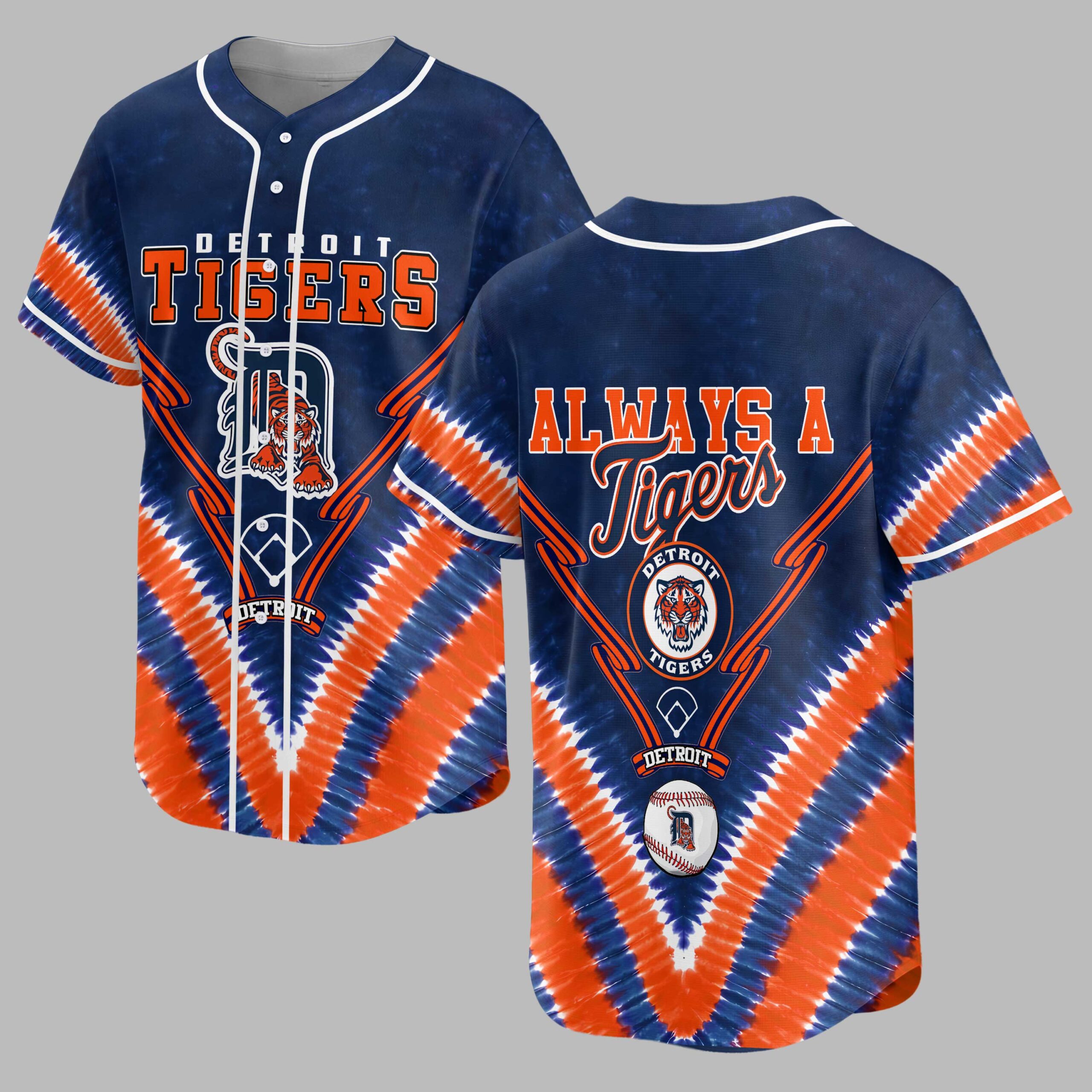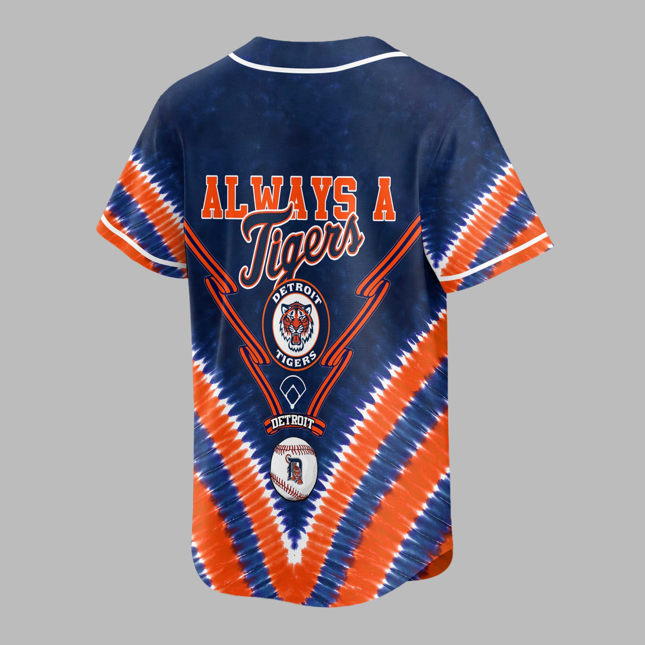 Show your Detroit Tigers pride with this vibrant tie-dye baseball jersey! Blending classic team spirit with a unique, eye-catching style, it boldly declares your allegiance. Celebrate your favorite team with a fun, spirited look. The front features ‘DETROIT TIGERS’ in bold orange and white, above the iconic ‘D’ logo with the tiger mascot. Crossed bats complement the design, all set against a dynamic blue and orange tie-dye pattern. The back proclaims ‘ALWAYS A Tigers’, accented by a circular Detroit Tigers logo and a baseball. Perfect for game days at Comerica Park, watching with friends, or daily team representation. This energetic jersey is ideal for summer outings or any occasion to support your Detroit Tigers with spirited flair.