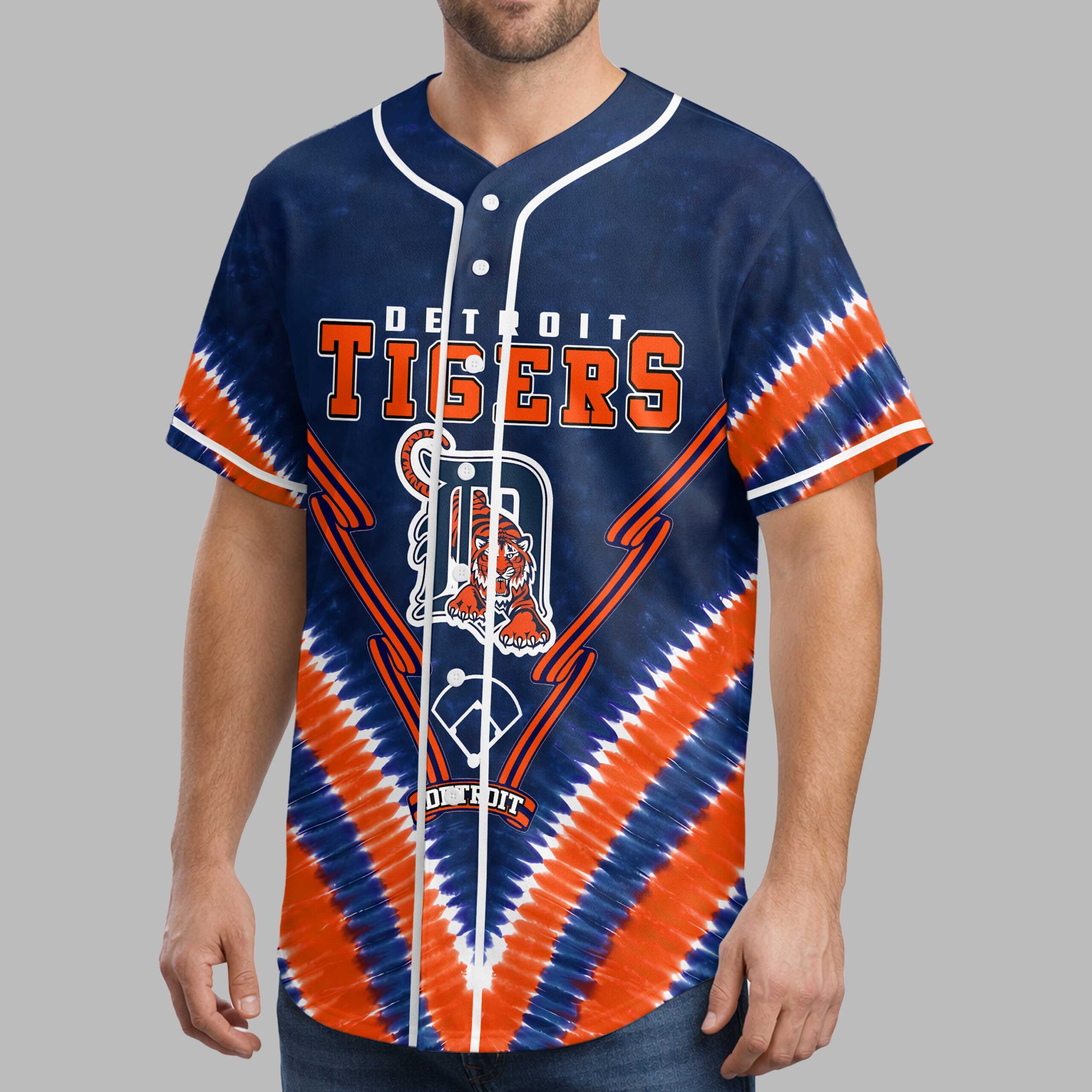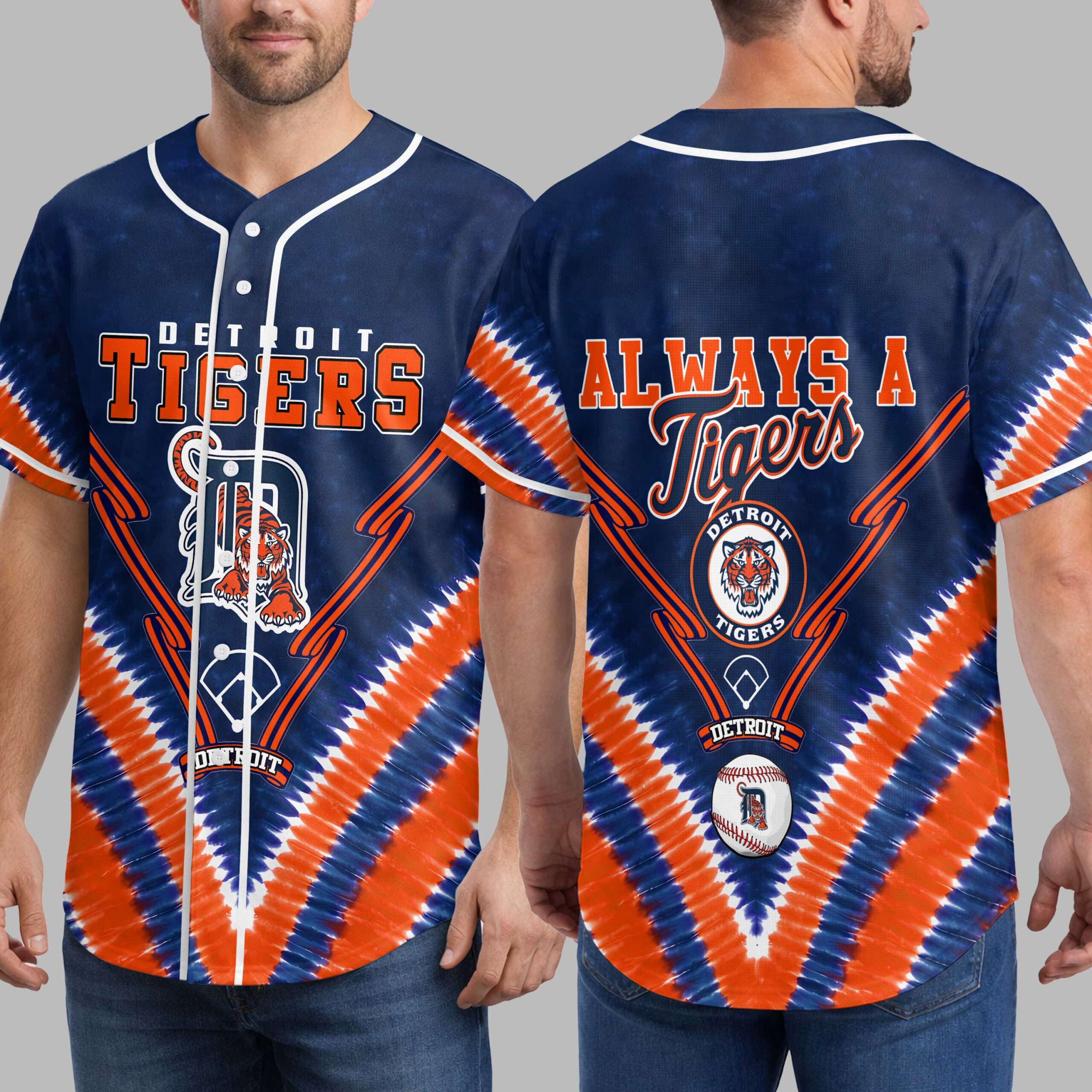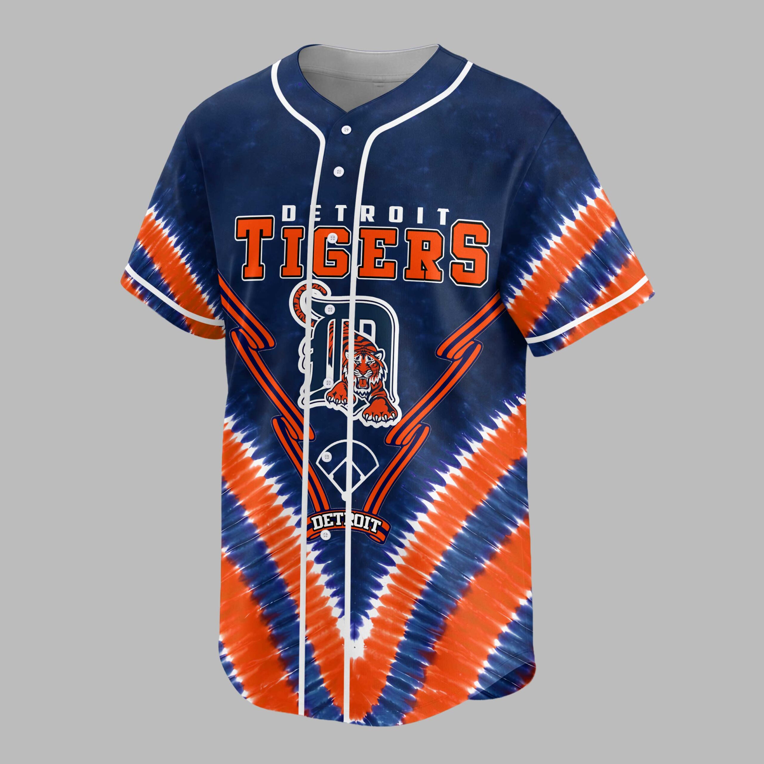 Show your Detroit Tigers pride with this vibrant tie-dye baseball jersey! Blending classic team spirit with a unique, eye-catching style, it boldly declares your allegiance. Celebrate your favorite team with a fun, spirited look. The front features ‘DETROIT TIGERS’ in bold orange and white, above the iconic ‘D’ logo with the tiger mascot. Crossed bats complement the design, all set against a dynamic blue and orange tie-dye pattern. The back proclaims ‘ALWAYS A Tigers’, accented by a circular Detroit Tigers logo and a baseball. Perfect for game days at Comerica Park, watching with friends, or daily team representation. This energetic jersey is ideal for summer outings or any occasion to support your Detroit Tigers with spirited flair.