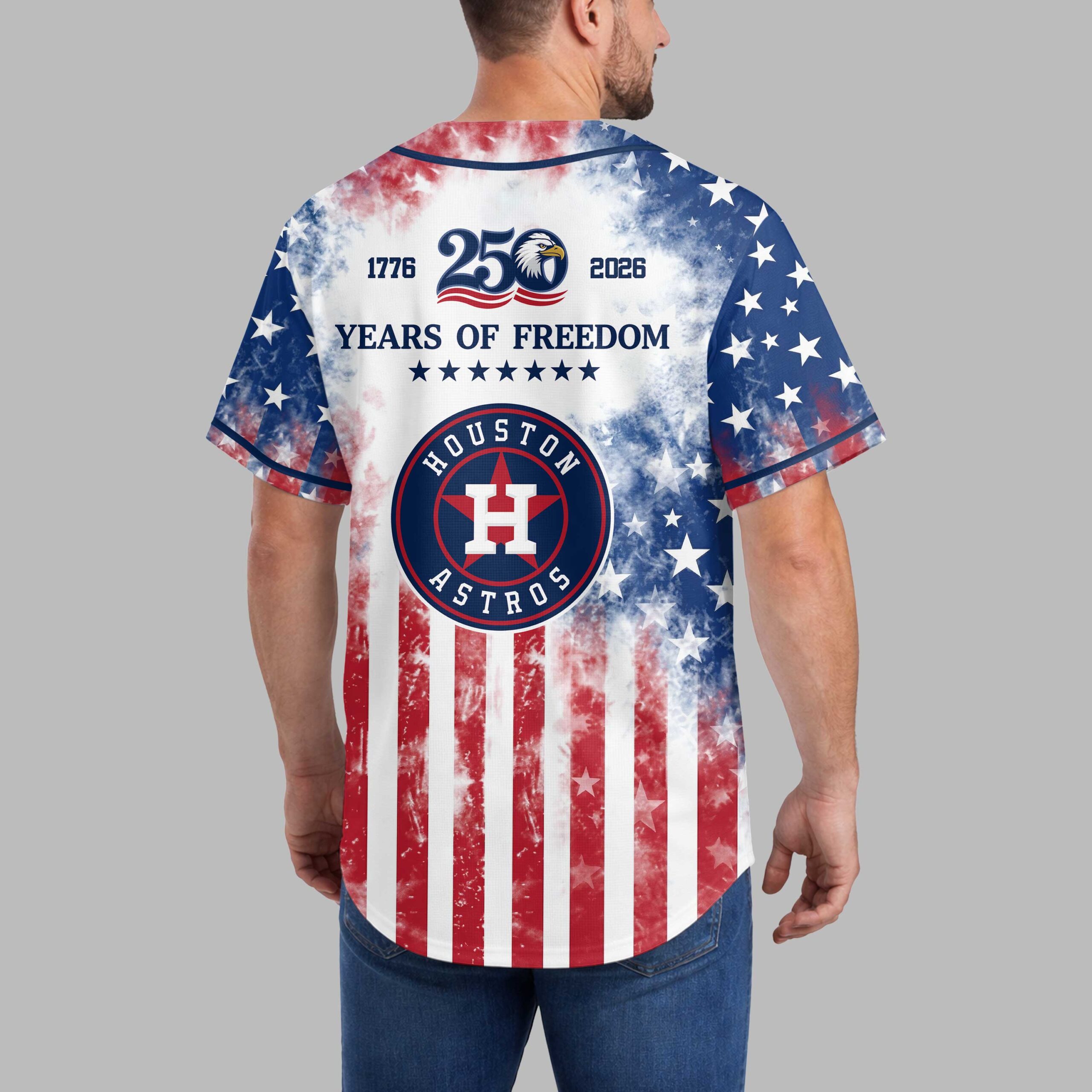 Celebrate your unwavering Houston Astros pride and American spirit with this striking patriotic baseball jersey! This unique design perfectly blends your passion for the game with a powerful tribute to 250 Years of Freedom, making it ideal for fans who love their team and their country. The front of the jersey features the iconic Astros script across a distressed American flag backdrop, complete with a proud Statue of Liberty on the side and the official team logo. The back mirrors this patriotic theme, showcasing 1776 – 2026, 250 Years of Freedom alongside a majestic eagle and the Houston Astros emblem, all set against a vibrant stars and stripes pattern. Perfect for game days at the ballpark, Fourth of July celebrations, Memorial Day, or any occasion where you want to display both your team loyalty and national pride. Stand out in the crowd and let your spirit shine with this unforgettable Houston Astros freedom jersey!