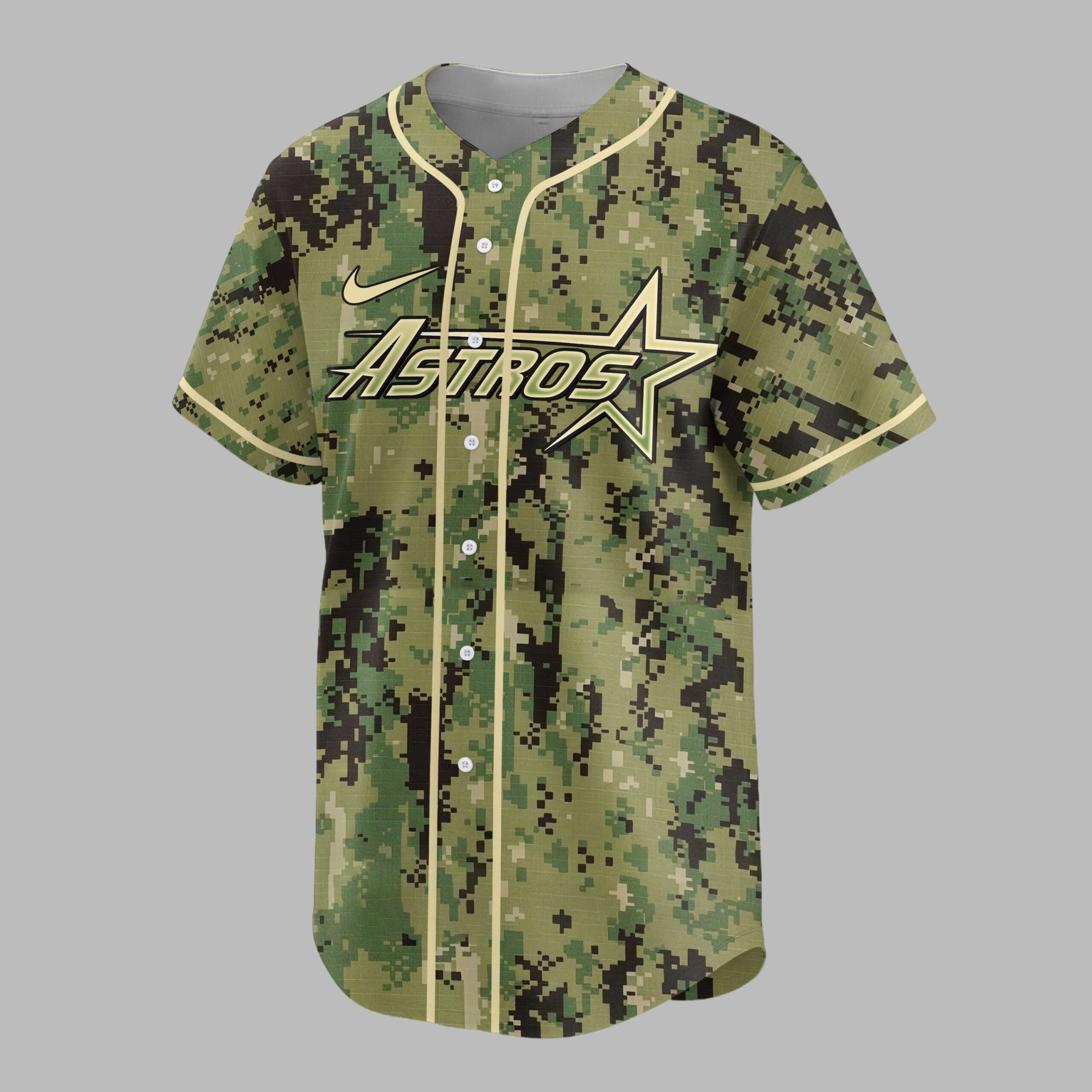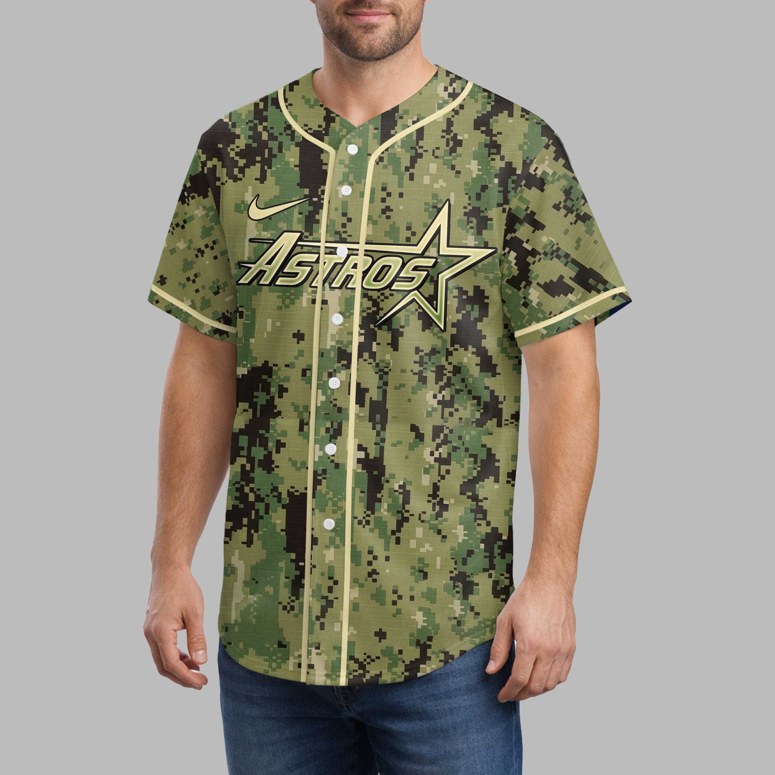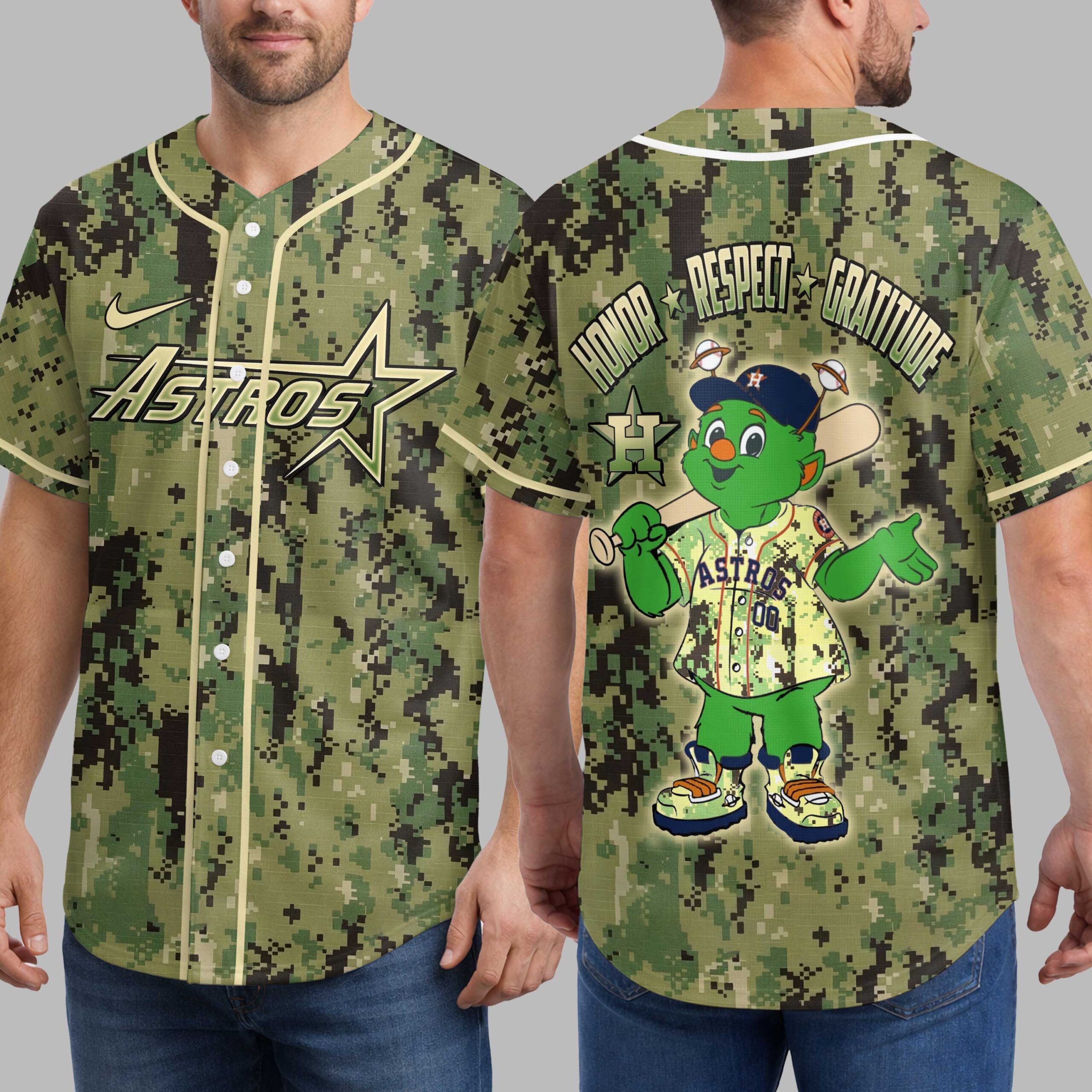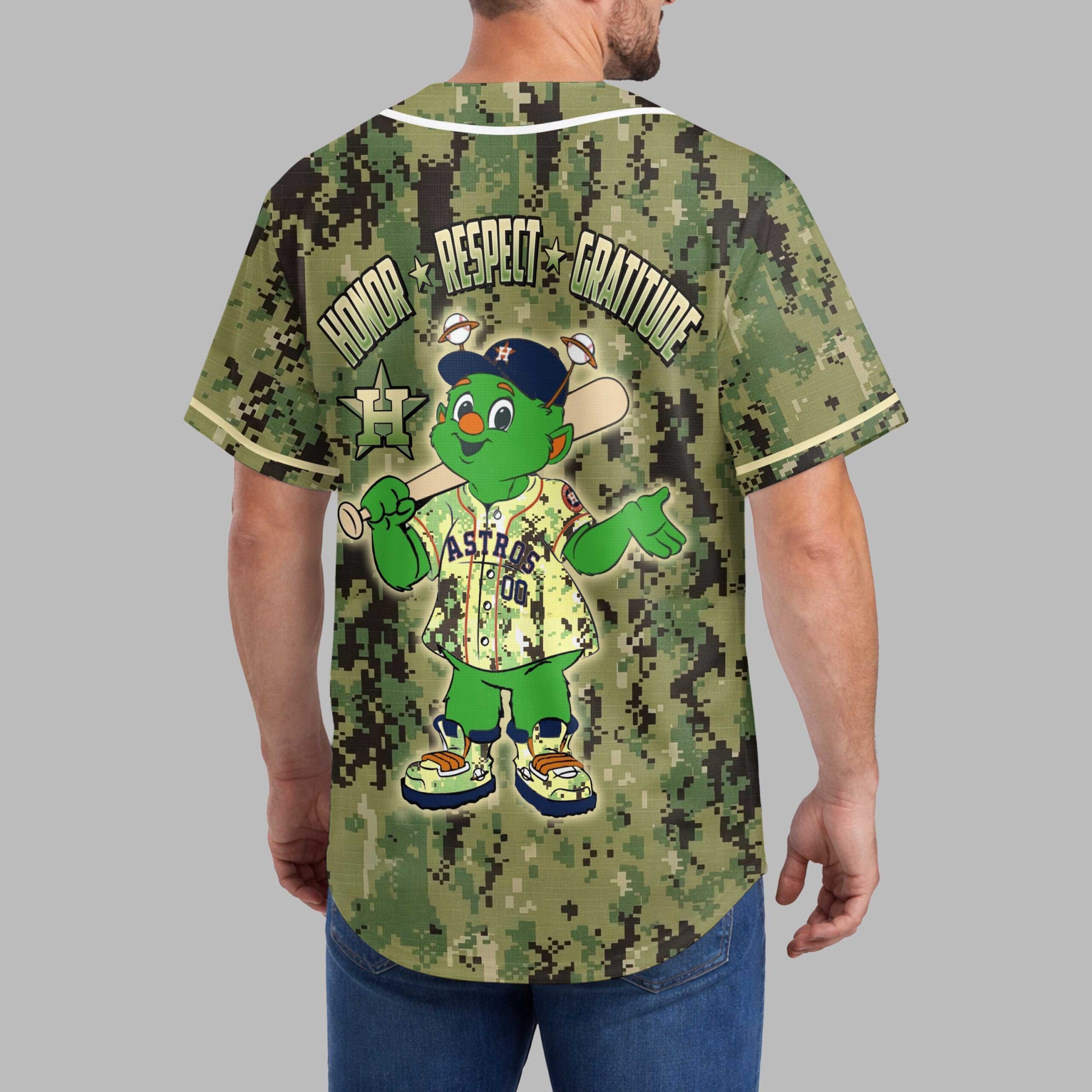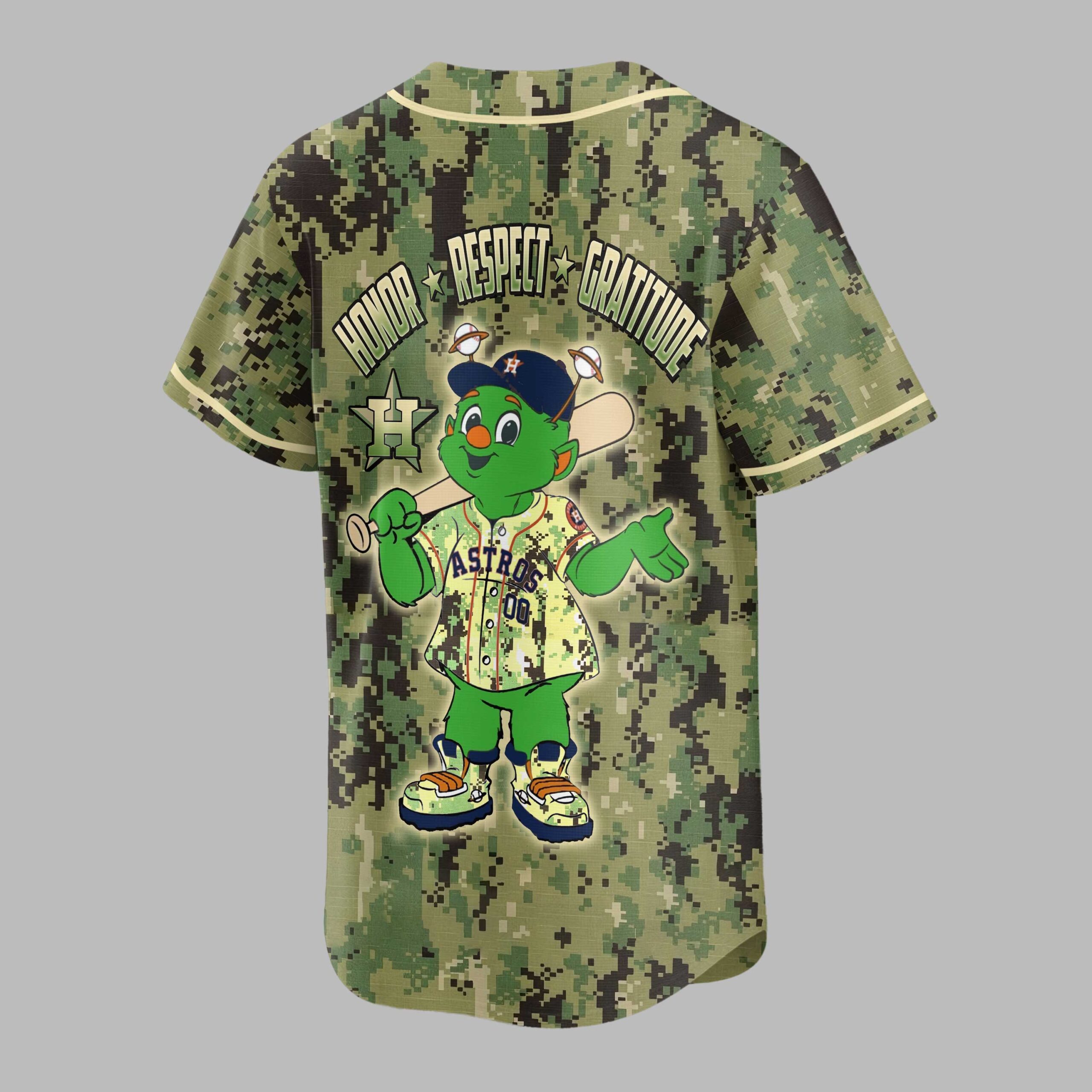 Show your unwavering support for the Houston Astros with this striking digital camouflage baseball jersey! This unique design perfectly blends your team pride with a powerful message of tribute, making it an essential addition for any dedicated fan. Stand out from the crowd and let your Astros spirit shine bright on game day and beyond. The front proudly displays the iconic ASTROS wordmark with its star emblem, set against a bold digital camo pattern that commands attention. The back features a playful, baseball-themed mascot, sporting an Astros cap and jersey, beneath the inspiring words HONOR, RESPECT, GRATITUDE. This heartfelt message, accompanied by the classic H star logo, adds a meaningful layer to your team allegiance. Perfect for cheering on the Astros at the ballpark, gatherings with fellow fans, or adding a spirited touch to your everyday wear. This jersey is ideal for anyone who wants to celebrate their team while honoring a spirit of appreciation and devotion. Wear it with pride and let your Astros loyalty be seen!