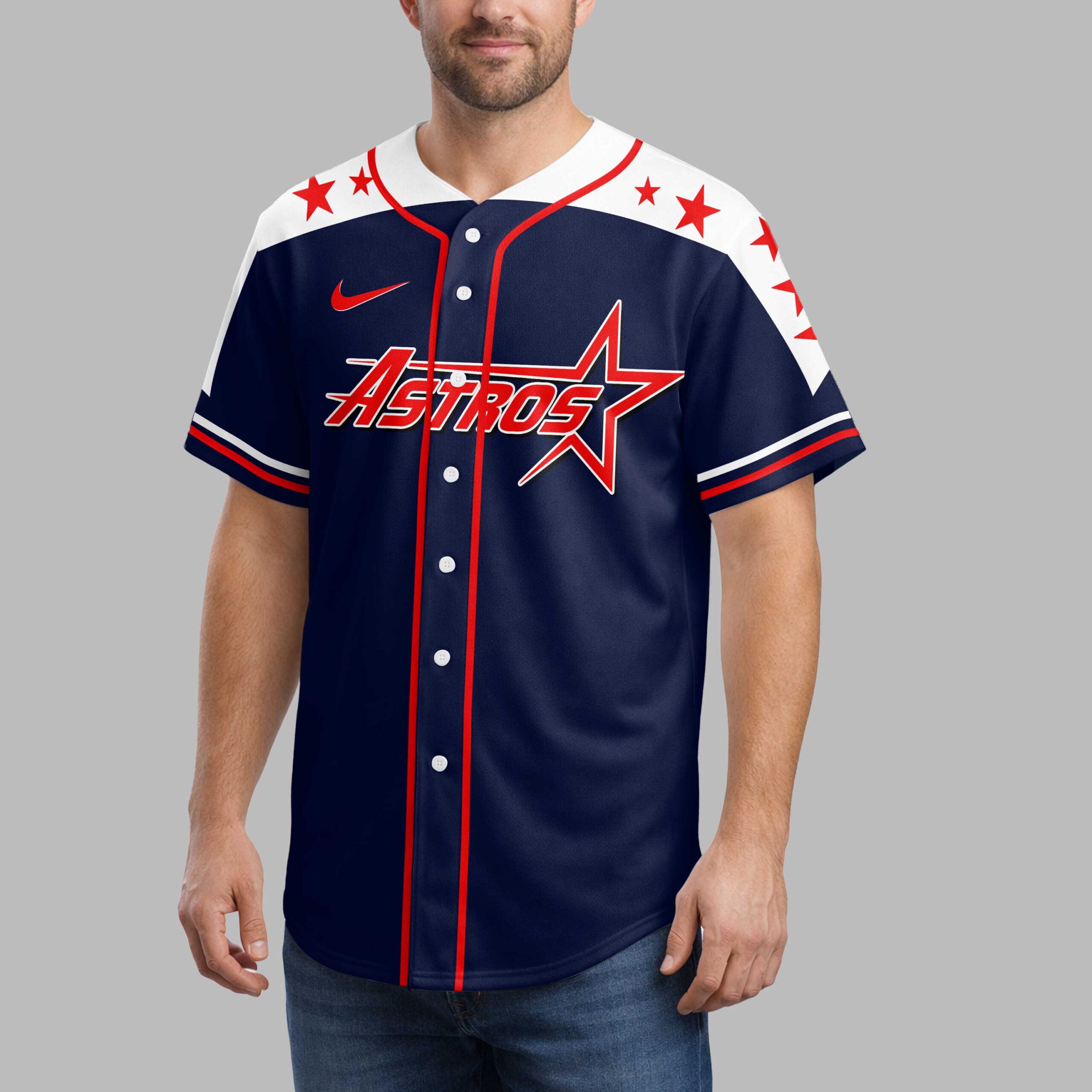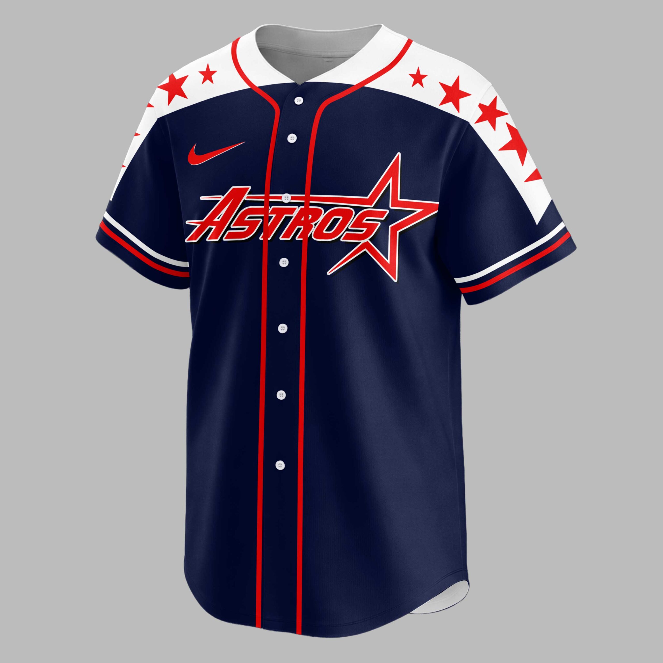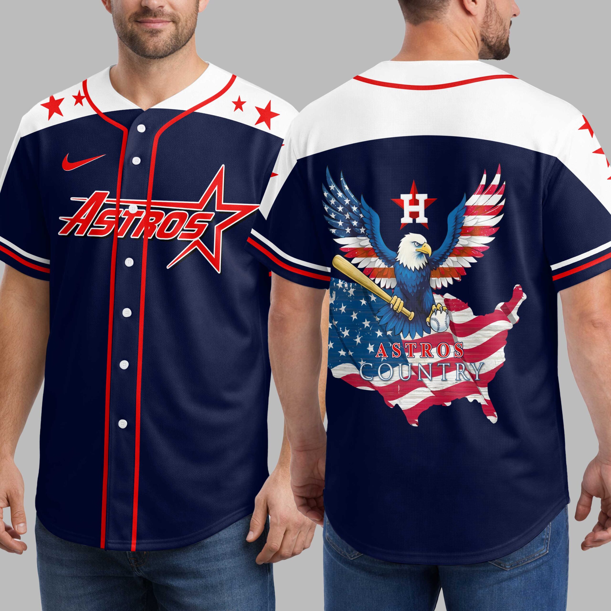 Show your unwavering support for the Houston Astros and your American pride with this dynamic patriotic baseball jersey! Perfect for dedicated fans, this shirt combines your love for the game with a powerful display of national spirit. The front proudly features the iconic ASTROS logo in bold red and white against a navy blue backdrop, complemented by red stars on the shoulders. The back is a true standout, showcasing a majestic bald eagle with flag-draped wings, clutching a bat and ball. This powerful imagery is set against a distressed flag-patterned map of the USA, with ASTROS COUNTRY boldly proclaimed below and a star-emblazoned H above. Whether you’re cheering from the stands, gathering with friends for a barbecue, or celebrating patriotic holidays, this jersey makes a statement. It’s the ultimate way to display your team loyalty and national pride, making every outing feel like a home run.