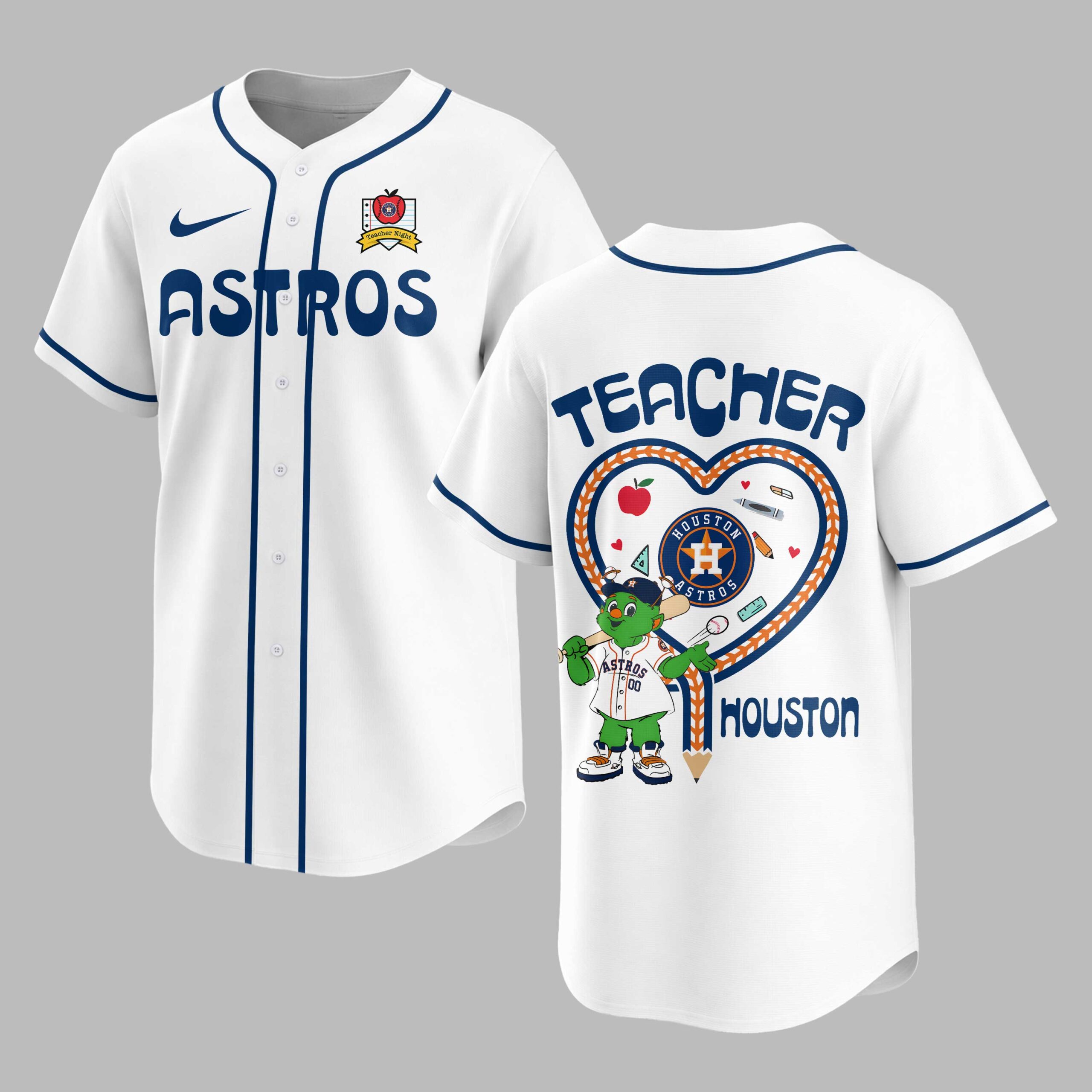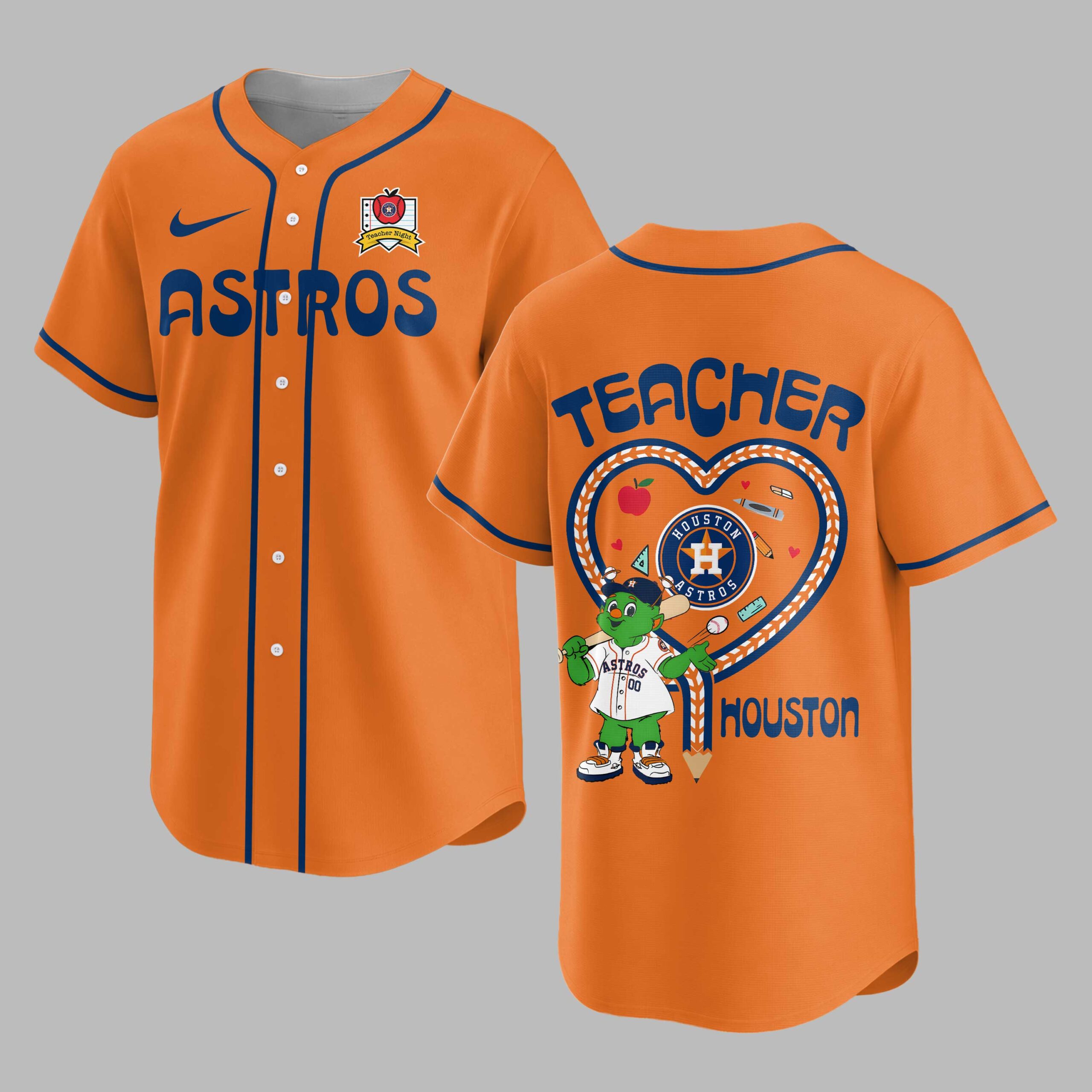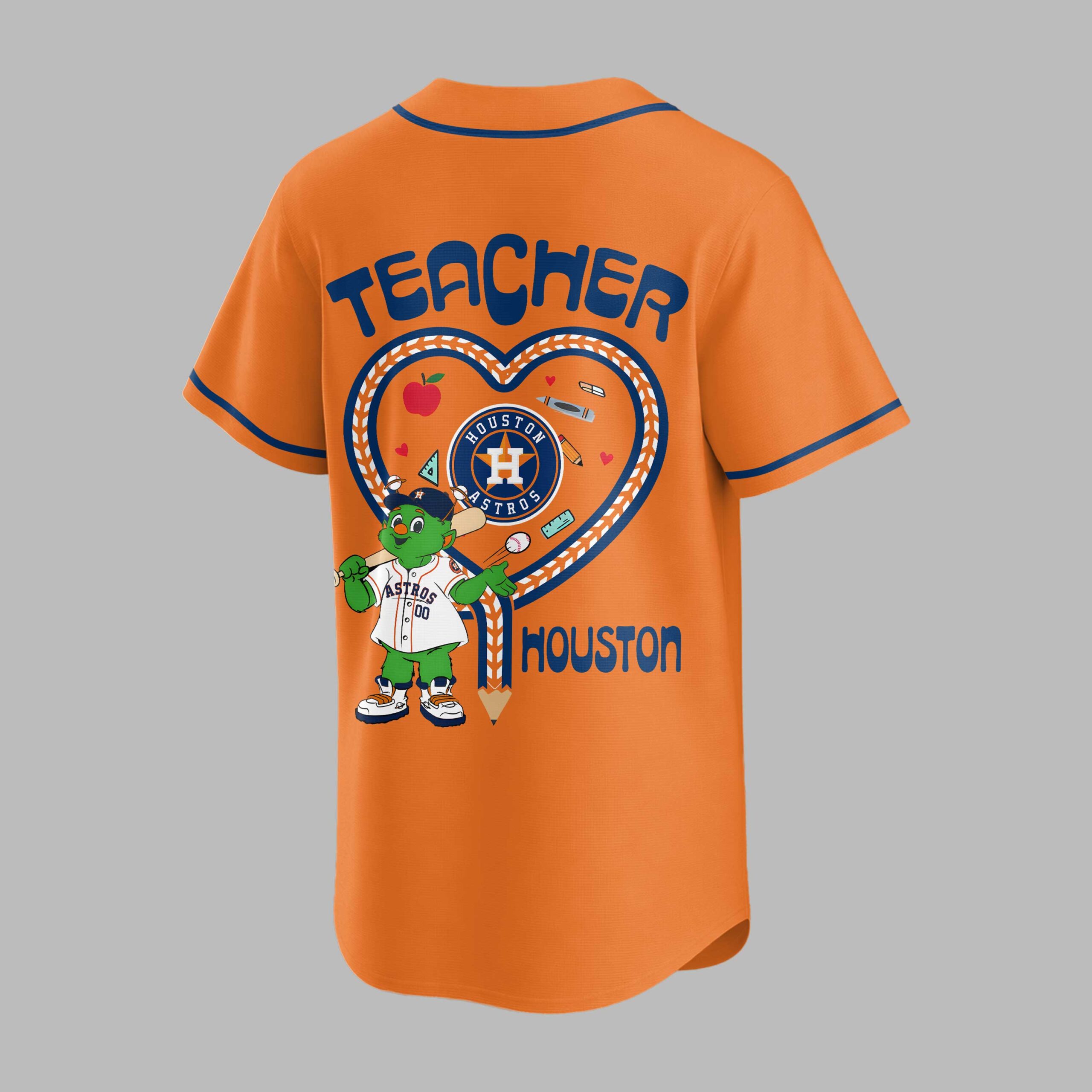 Show your unwavering Houston Astros pride and appreciation for educators with this special Teacher Night baseball jersey! Designed for devoted fans who also celebrate the incredible work of teachers, this vibrant blue top brings together your love for the game and respect for learning in one spirited design. The front proudly displays the iconic ASTROS in bold orange lettering, complemented by a unique red apple logo on the chest that subtly integrates the HOUSTON ASTROS text and a Teacher Night banner. Turn around, and the back features TEACHER in prominent orange text above a heart-shaped design crafted from baseball laces. Inside, the beloved Orbit mascot is ready to play alongside charming school supplies like pencils, crayons, and an apple, all centered around the HOUSTON ASTROS logo and HOUSTON at the base. Perfect for cheering on the Astros at the ballpark during Teacher Appreciation Night, showing off your team spirit at school events, or simply enjoying a casual day out. It’s an ideal way for teachers and fans alike to celebrate their passion for both baseball and education.