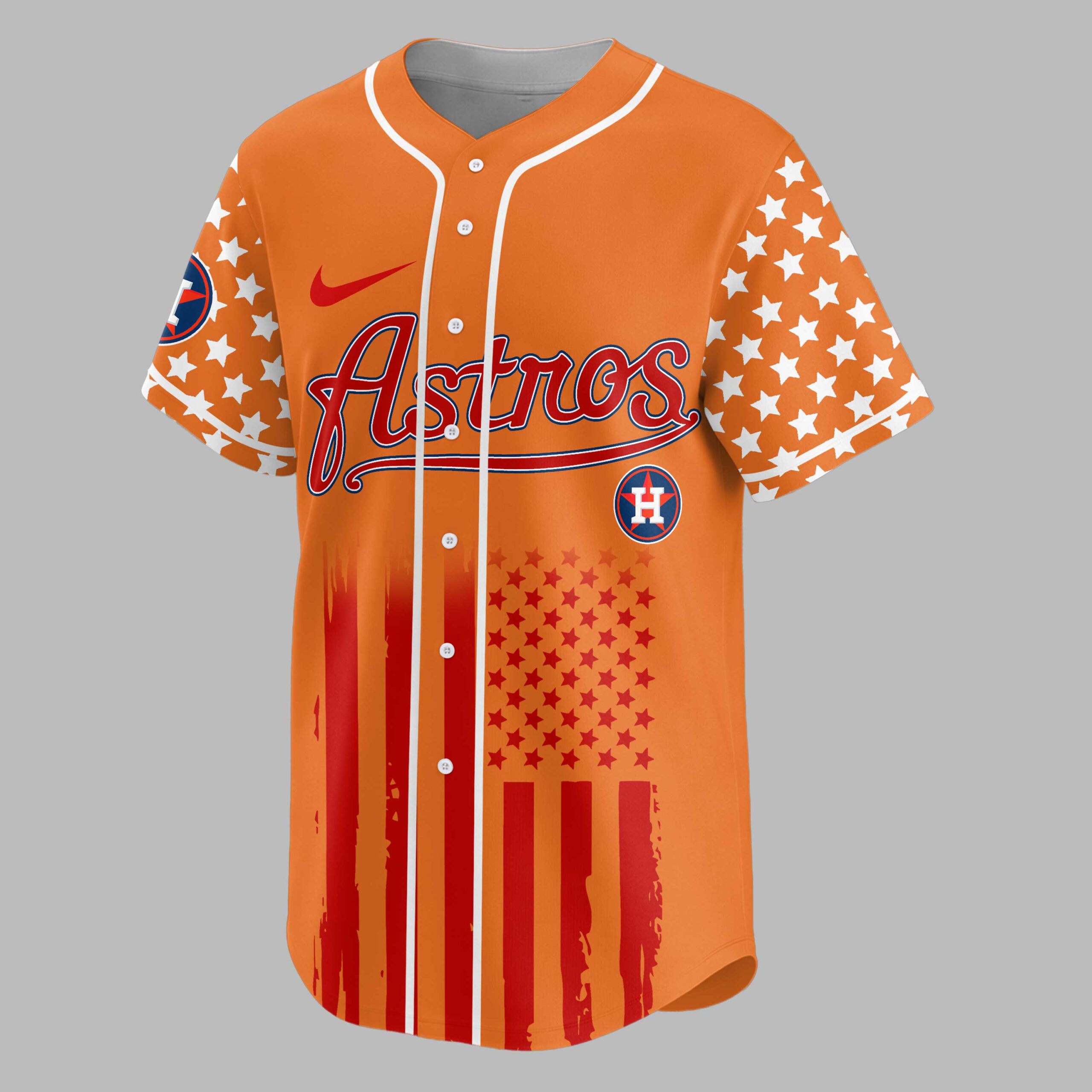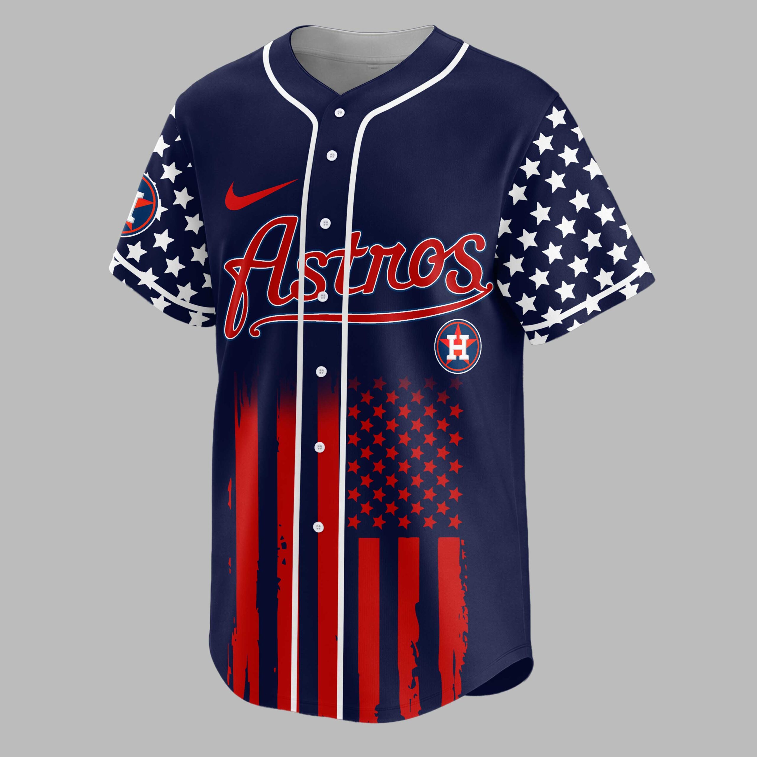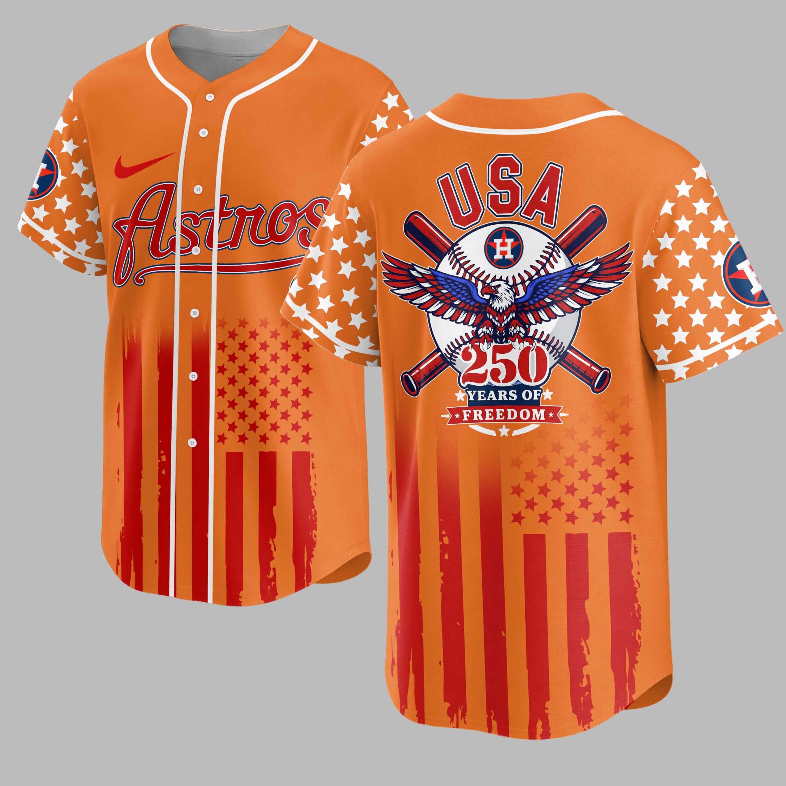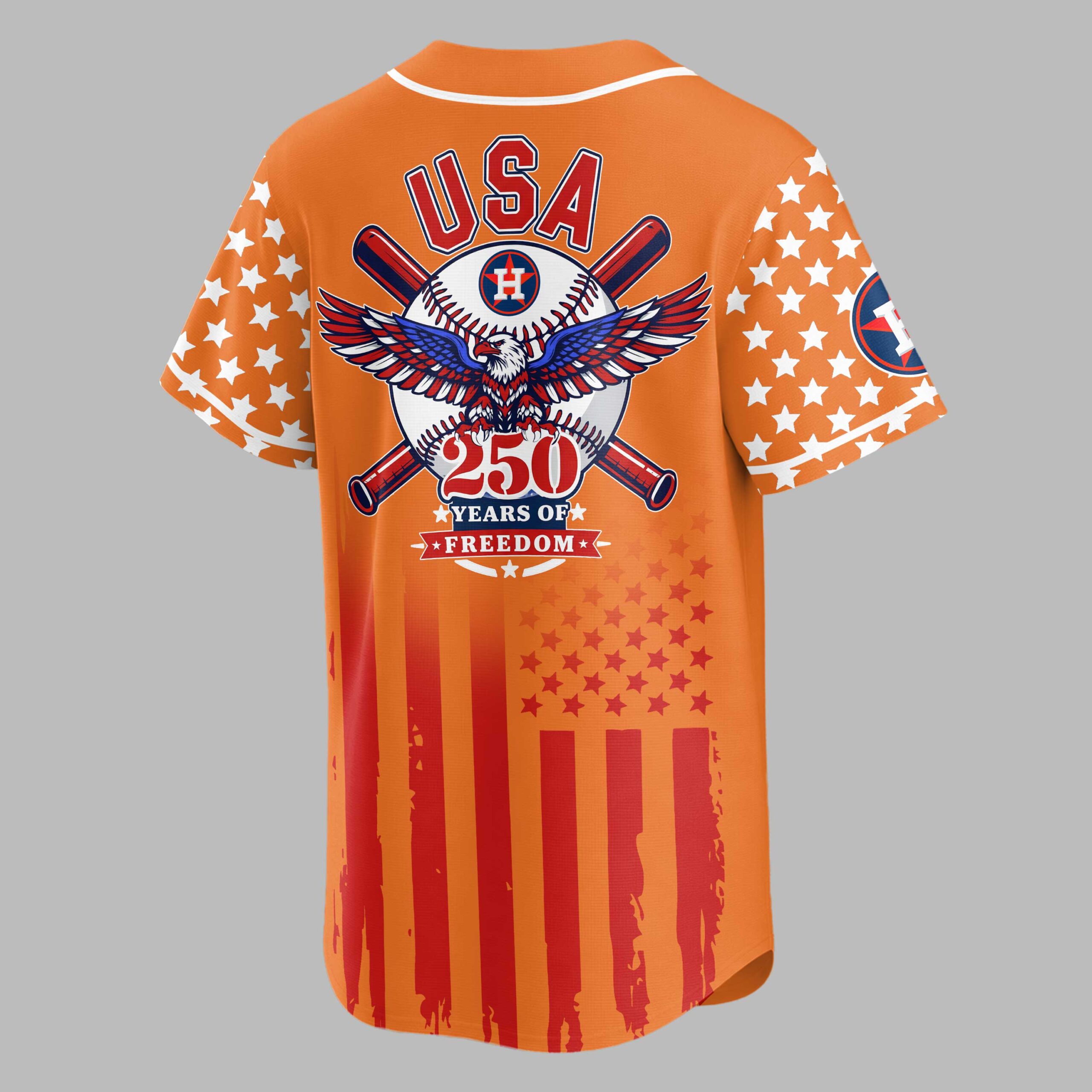 Show your unwavering pride for both the Houston Astros and the United States with this striking patriotic baseball jersey. This special edition combines the thrill of game day with a powerful tribute to 250 Years of Freedom, making it a truly unique statement piece for any fan. The front of the jersey boldly features the classic Astros script in red, set against a navy background with a distressed American flag motif flowing from the waist. The sleeves proudly display a scattering of white stars, while the back commands attention with USA emblazoned above a captivating graphic. This design includes a baseball, crossed bats, and a majestic eagle, symbolizing American spirit and baseball passion. Perfect for wearing to the ballpark, Fourth of July barbecues, Memorial Day events, or any occasion where you want to celebrate your dual love for your team and country. This jersey is designed to help you stand out in the crowd, embodying a spirit of patriotism and baseball fervor.