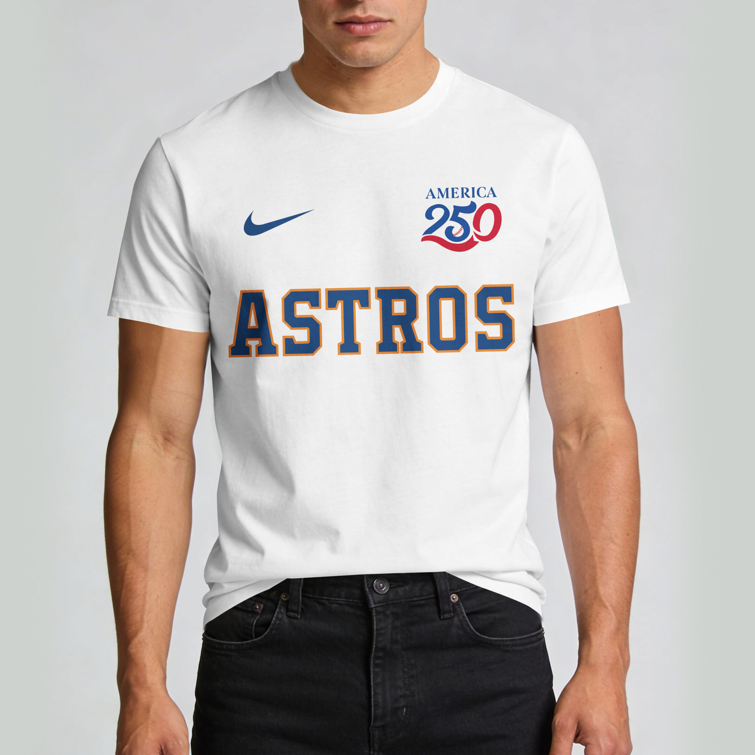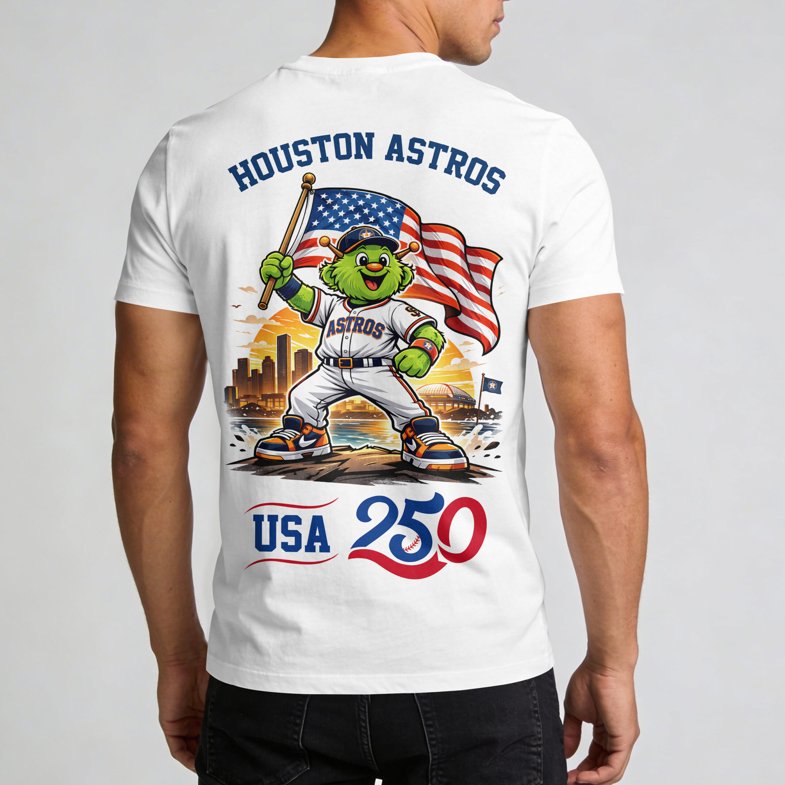 Showcase your deep-rooted passion for the Space City and the stars and stripes with this Houston Astros USA 250 Independence Baseball Fan T-Shirt. This striking white tee is the perfect way for H-Town fans to celebrate America’s 250th anniversary while staying loyal to their favorite team. It’s more than just gear; it’s a tribute to a legacy of baseball excellence and national pride. The front of the shirt features a bold, classic ASTROS wordmark across the chest, paired with an America 250 commemorative logo. Turn it around to reveal a high-energy graphic of Orbit, the beloved mascot, proudly waving the American flag against a stunning silhouette of the Houston skyline. The detailed design captures the spirit of the city and the energy of the game in vibrant navy and orange. Whether you’re cheering from the stands at Minute Maid Park, attending a Fourth of July barbecue, or just representing your city around town, this shirt is your go-to choice. It’s designed for the ultimate fan who wants to honor both their team and their country during this historic milestone celebration.