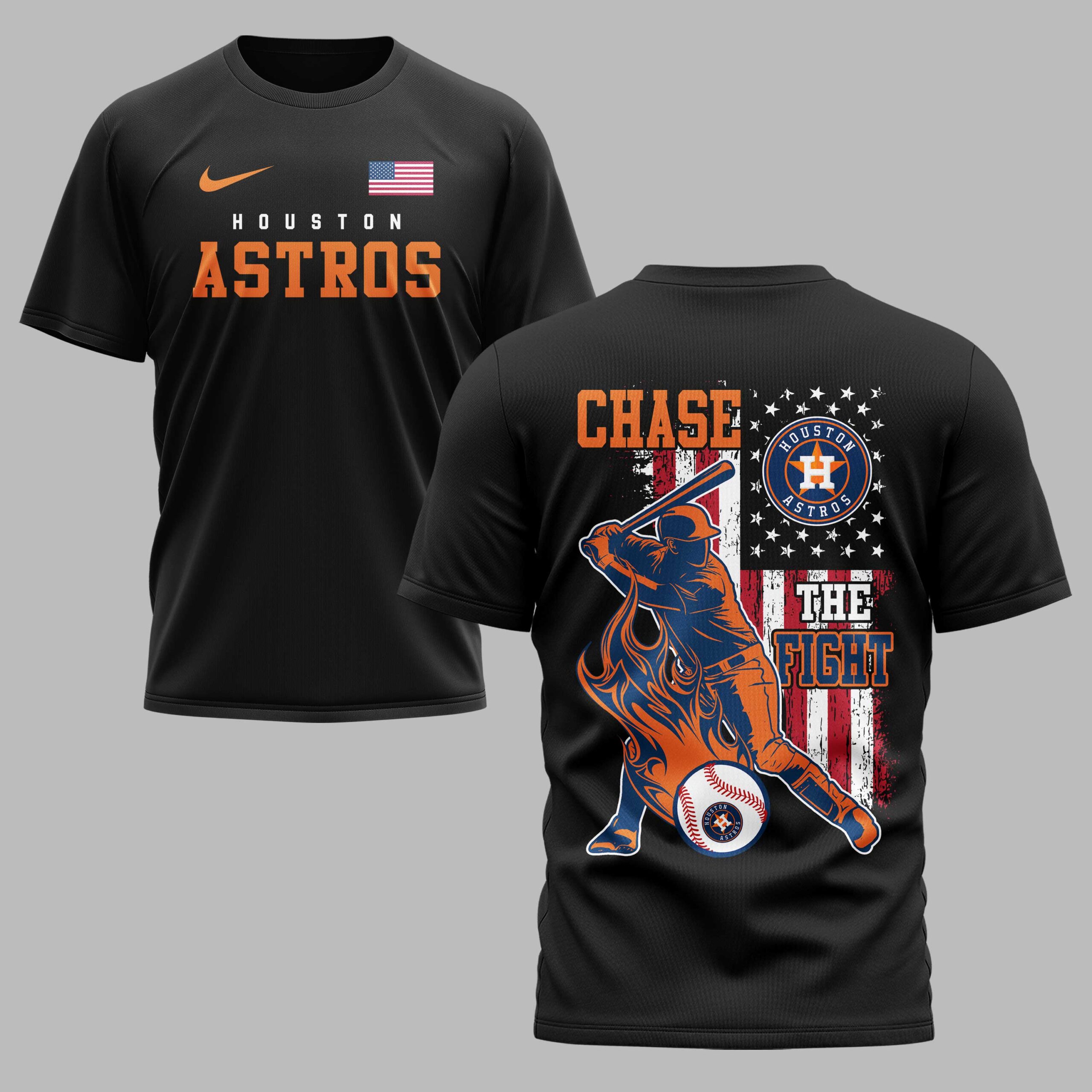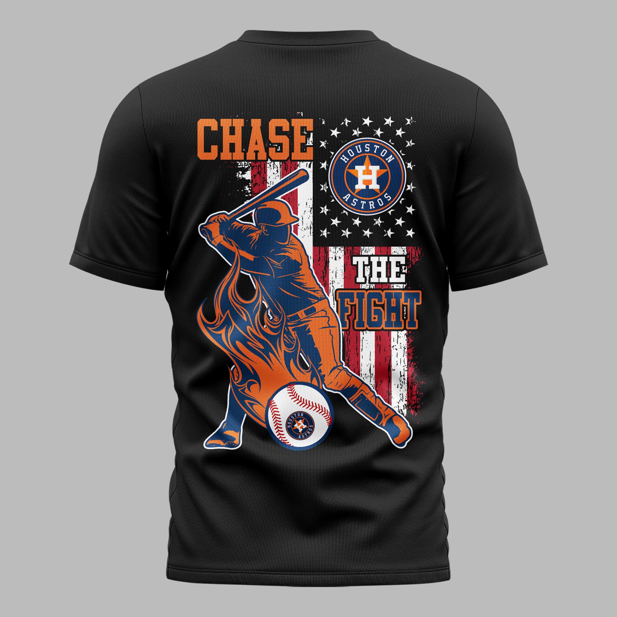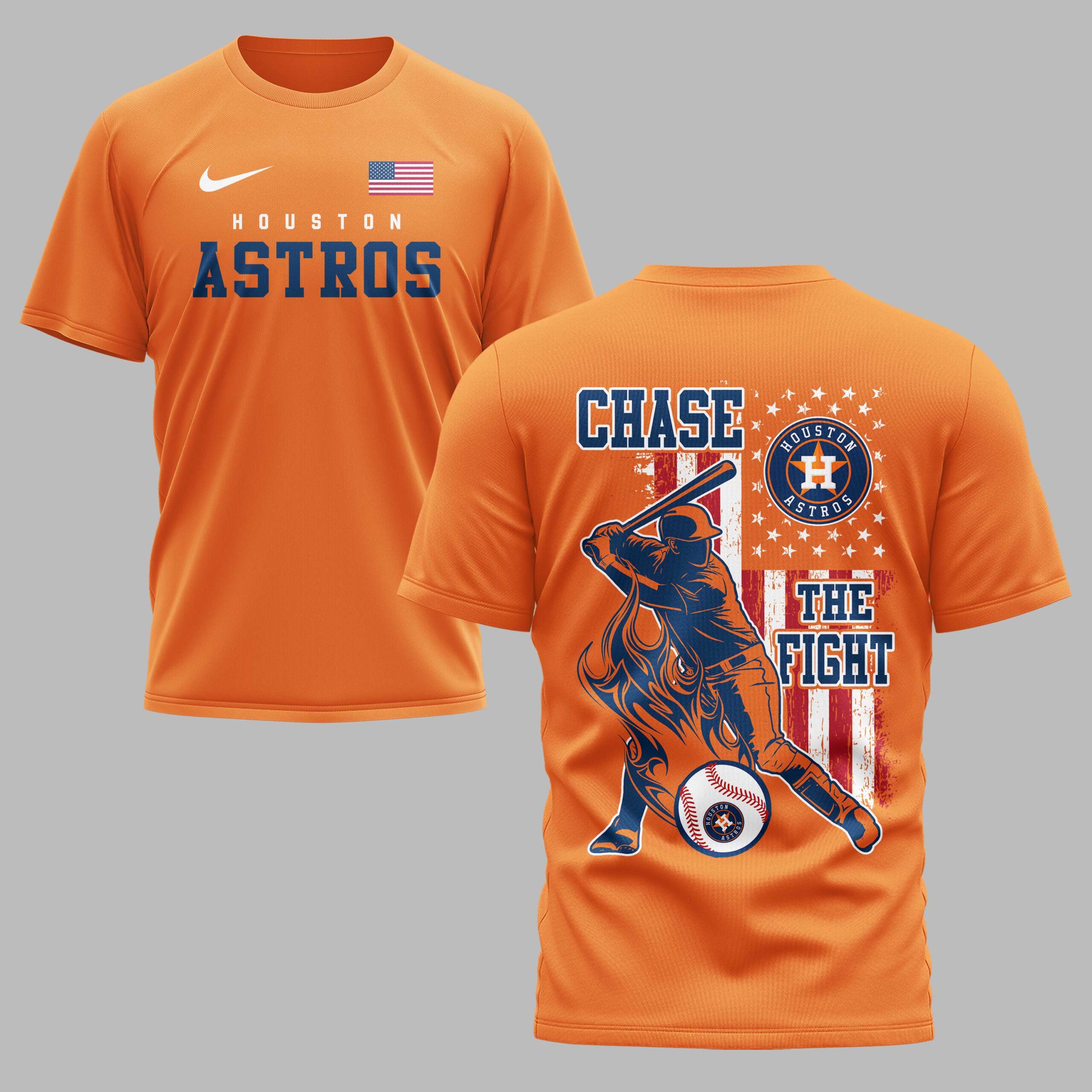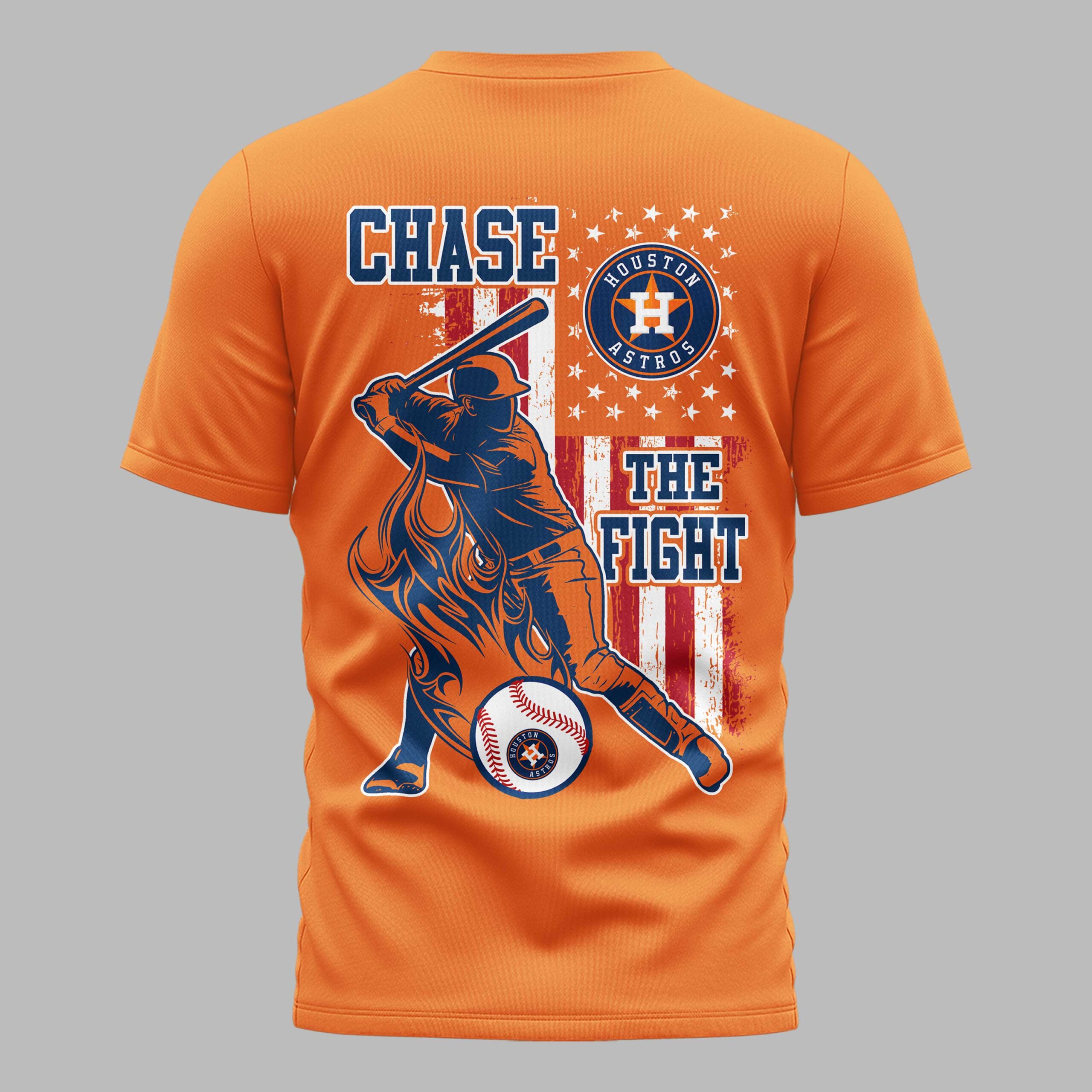 Show your Houston Astros pride with this dynamic fan tee, blending team spirit and patriotism. Designed for devoted supporters, it embodies game day excitement, helping you boldly represent your favorite team. The front features HOUSTON ASTROS in vibrant orange, paired with a classic American flag. The back showcases an action-packed graphic of a baseball player mid-swing against a distressed stars and stripes backdrop. CHASE THE FIGHT is boldly declared, reflecting their competitive drive, completed with the iconic Astros circular logo. Perfect for cheering on the Astros at the ballpark, watch parties, or any casual outing to display loyalty. This versatile tee makes a statement on national holidays, an essential addition for any true Houston Astros fan.