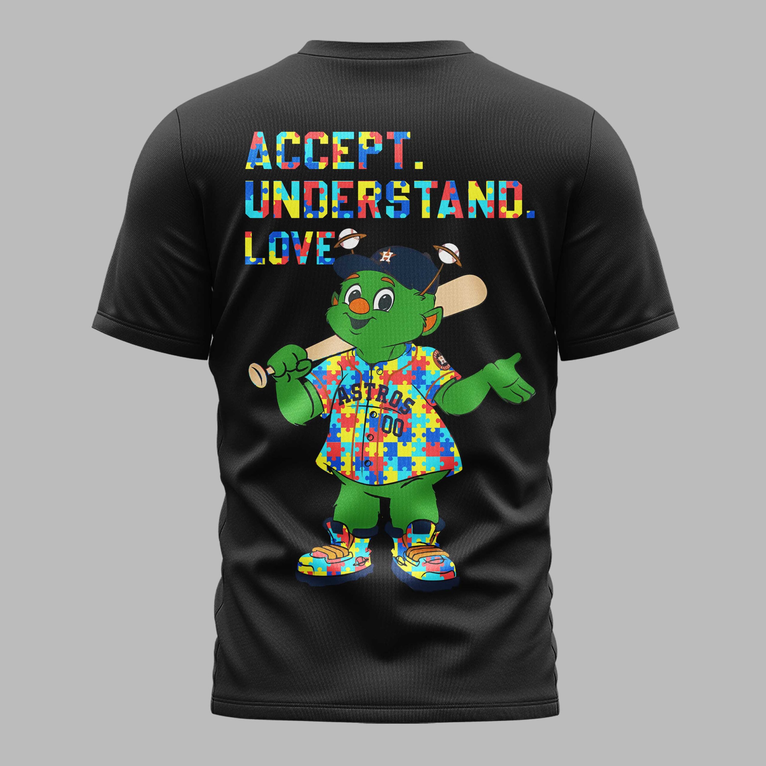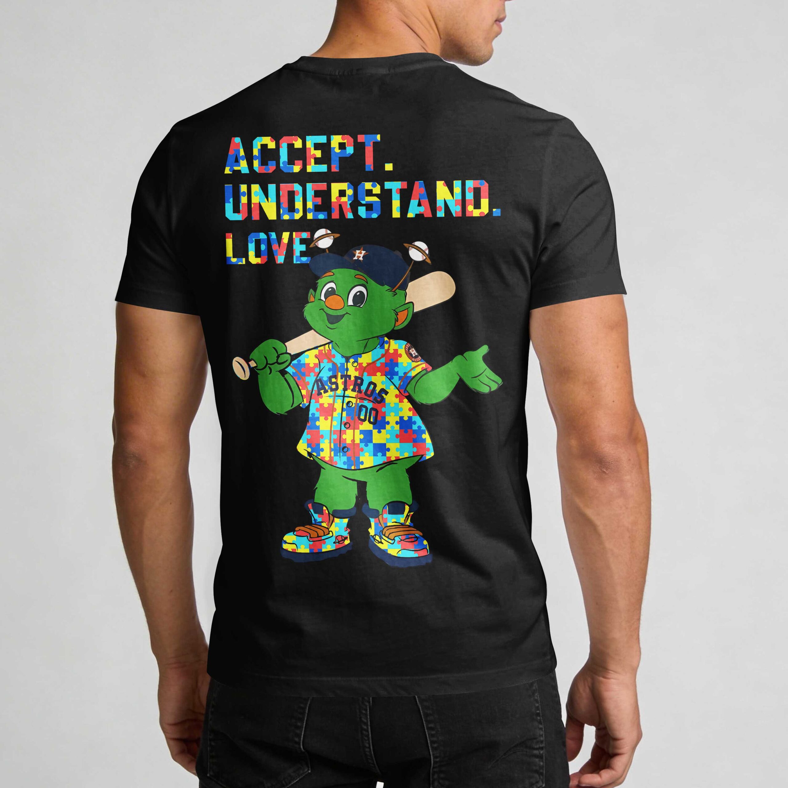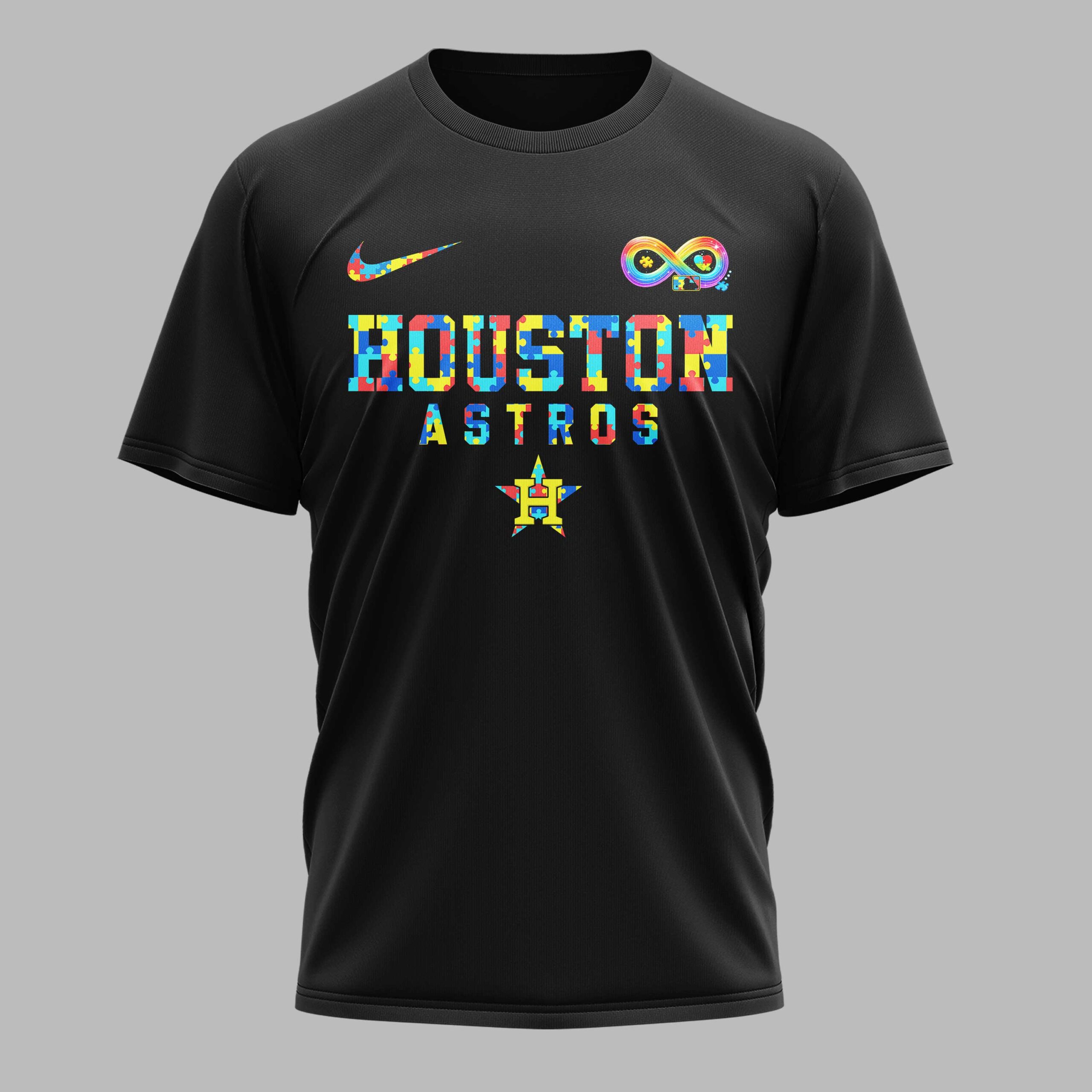 Show off your Houston Astros spirit while supporting a meaningful cause. This unique tee brings together the energy of the ballpark with a vibrant message of inclusion. Whether you’re at the stadium or out in the city, this shirt is a bold way to celebrate your team and the importance of awareness. The front features the HOUSTON ASTROS wordmark and star logo, both filled with a colorful puzzle-piece pattern. A matching infinity symbol and swoosh complete the look. On the back, the mascot Orbit stands tall in a puzzle-patterned jersey, surrounded by the powerful words ACCEPT. UNDERSTAND. LOVE. to highlight the message of support and community. Perfect for game day, awareness walks, or everyday fan wear, this shirt lets you represent Houston with pride. It’s a must-have for fans who value both their team and their community.