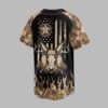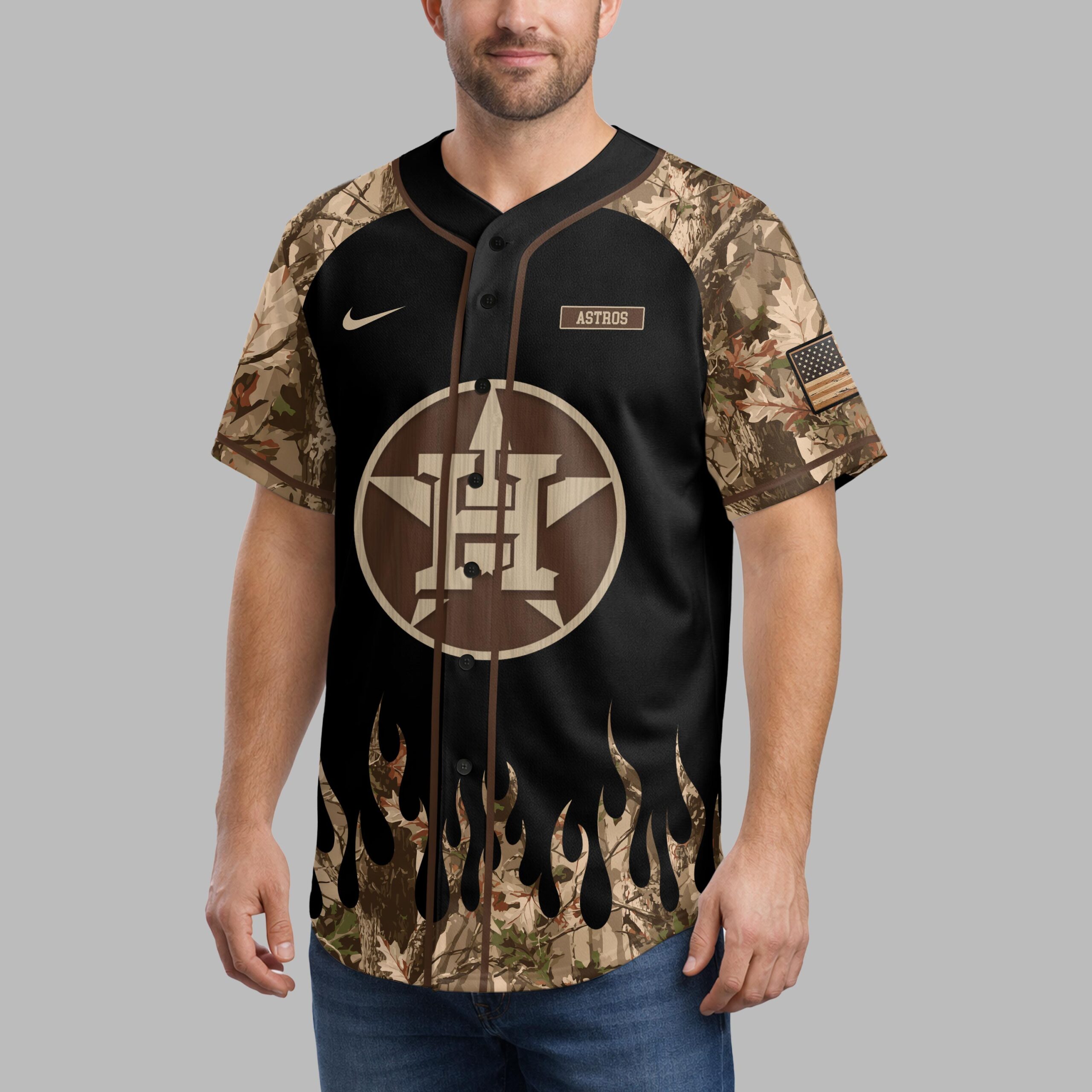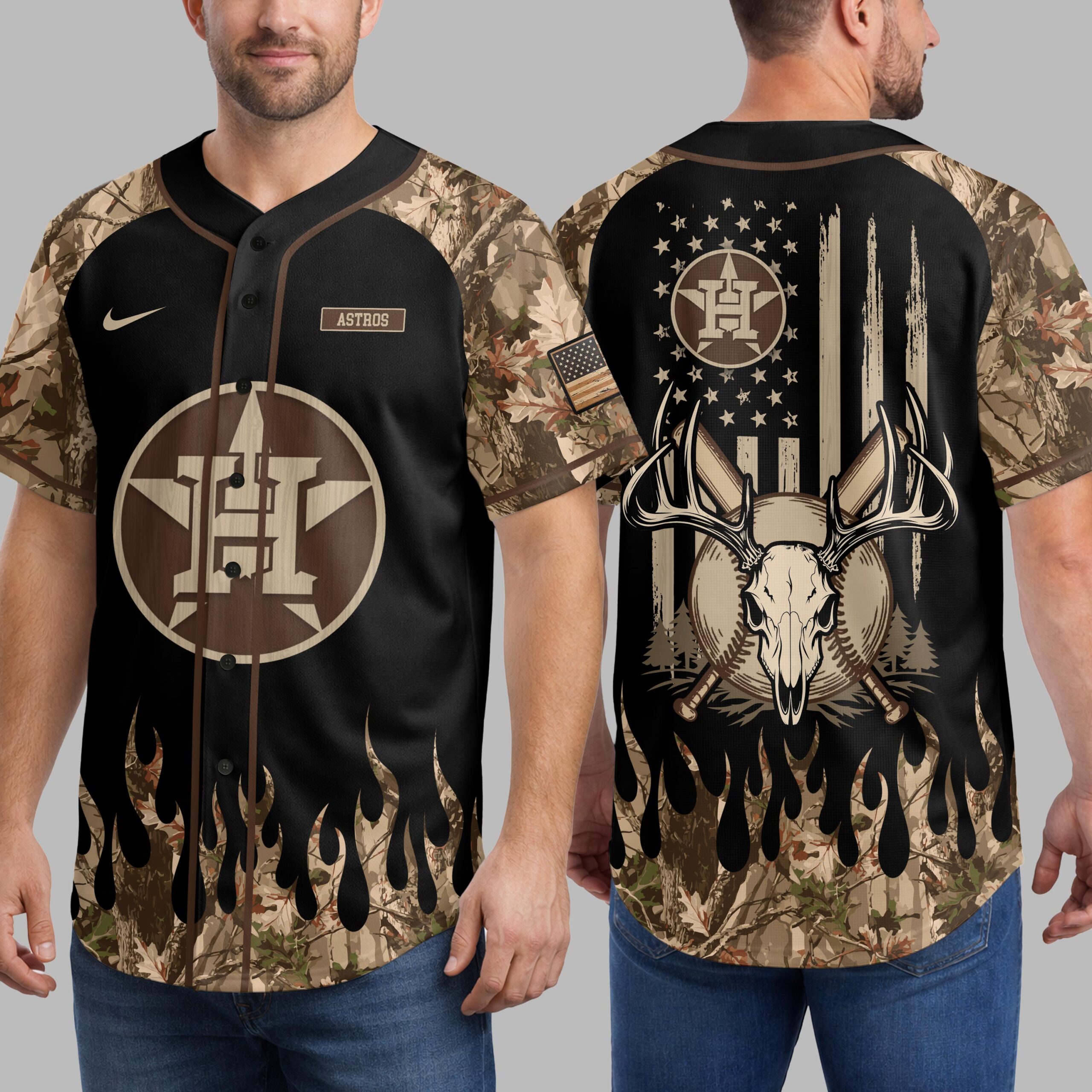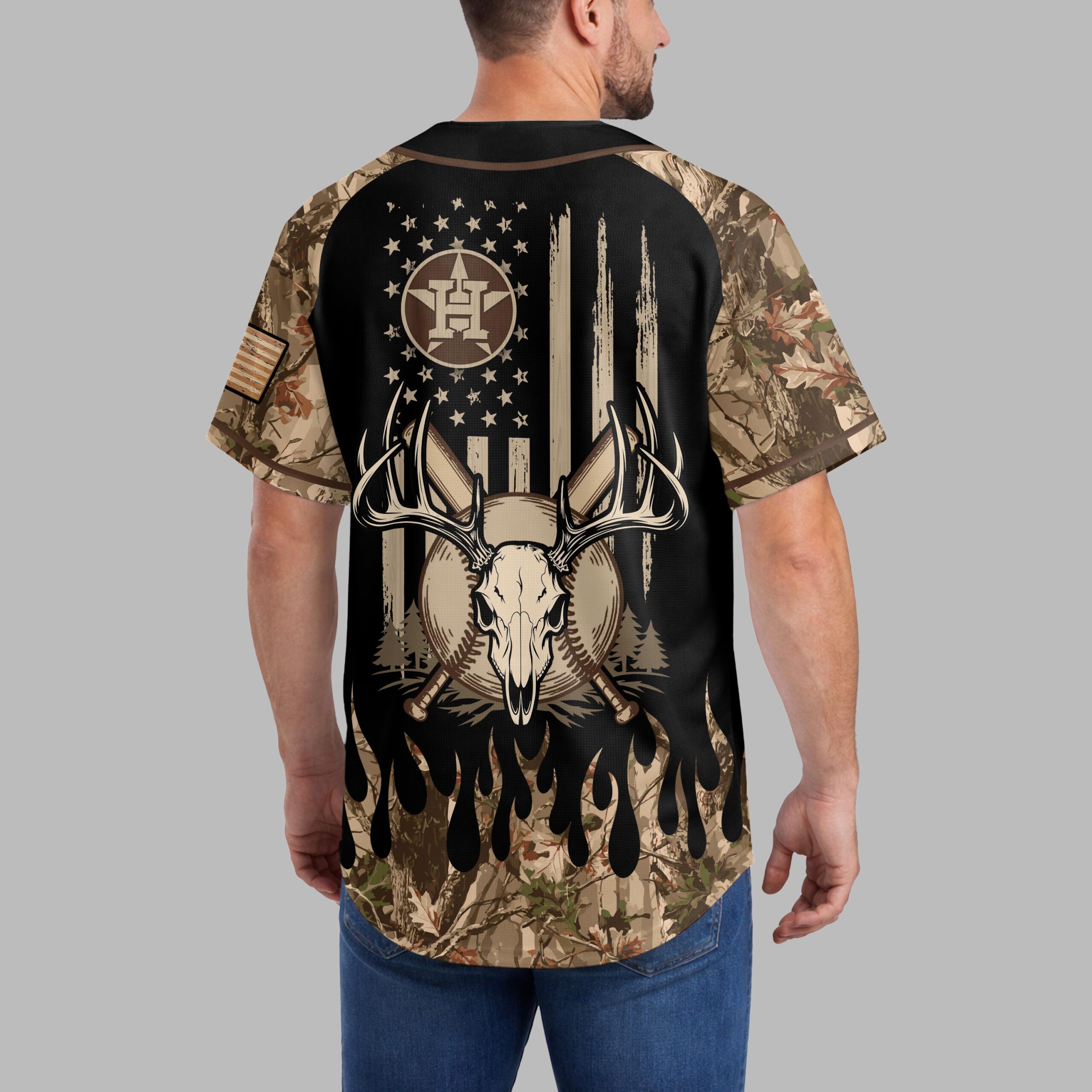 Elevate your Houston Astros fandom with a rugged spirit! This unique jersey masterfully blends team loyalty with the great outdoors and American pride, perfect for devoted fans who love both the game and adventure. The front proudly displays the iconic Astros star-H logo in a wood-grain texture, alongside the ASTROS wordmark. Camouflage flames rise from the hem, extending to the sleeves. The back showcases a distressed American flag design, anchoring the Astros logo, a powerful deer skull with antlers, and crossed bats, embodying a wild spirit. A small flag patch completes the look. Perfect for game days, tailgates, hunting trips, or everyday wear. Show your unique style and team loyalty as an Astros fan who loves thrilling games and embraces the wild outdoors.