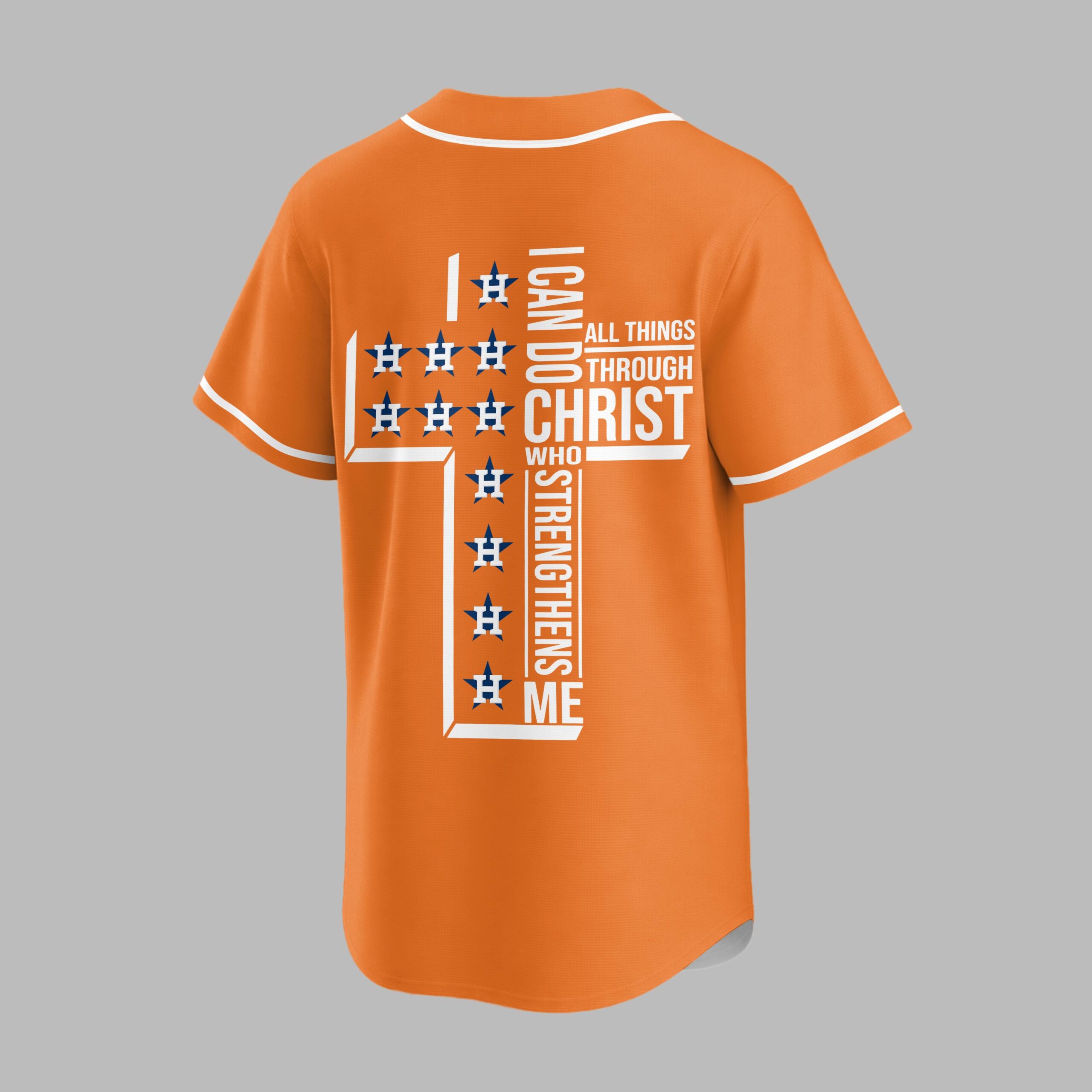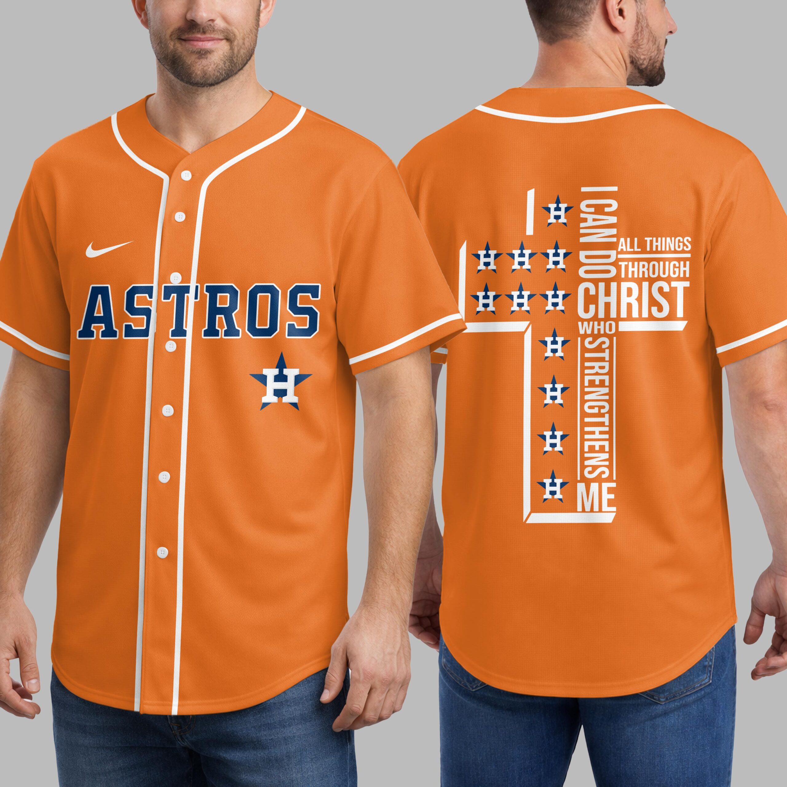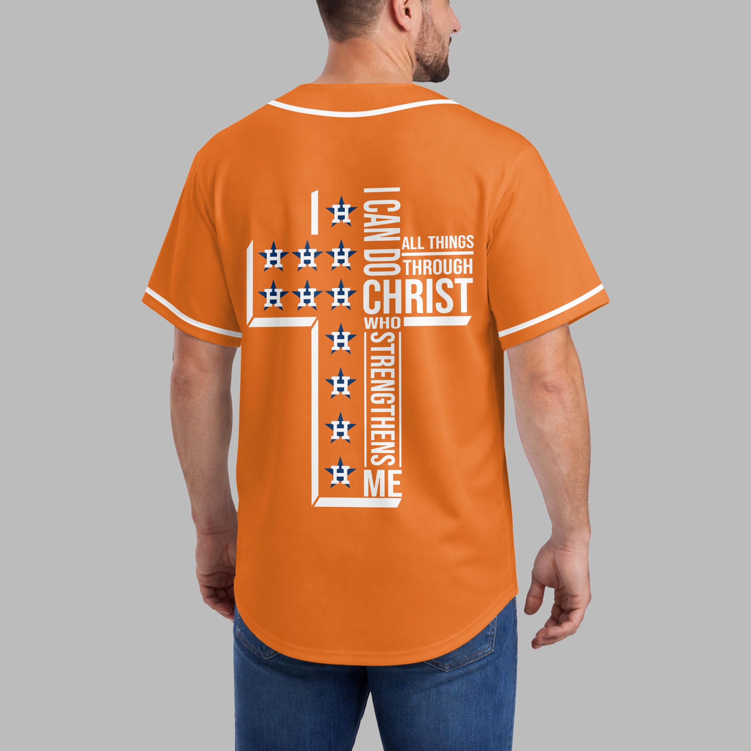 Unleash your double dose of devotion with this inspiring Astros baseball jersey! Perfect for fans who proudly stand with their team and their faith, this shirt powerfully blends spirited game-day energy with a profound message of strength and perseverance. Show the world what truly drives you, both on and off the field, with a design that speaks volumes about your allegiances and beliefs. The front of this striking navy blue jersey boldly features ASTROS in vibrant orange, complemented by the iconic orange H star logo. Turn heads as you walk away, revealing an empowering statement on the back: I CAN DO ALL THINGS THROUGH CHRIST WHO STRENGTHENS ME, artfully shaped into a cross. This powerful scripture is accentuated with multiple orange H star logos, creating a design that’s both meaningful and visually dynamic. Whether you’re cheering loud from the stands, gathering with your faith community, or simply going about your day, this jersey is a perfect expression of your convictions. Wear it to Sunday services, casual outings, or during intense game nights to embody both your team spirit and your spiritual strength.