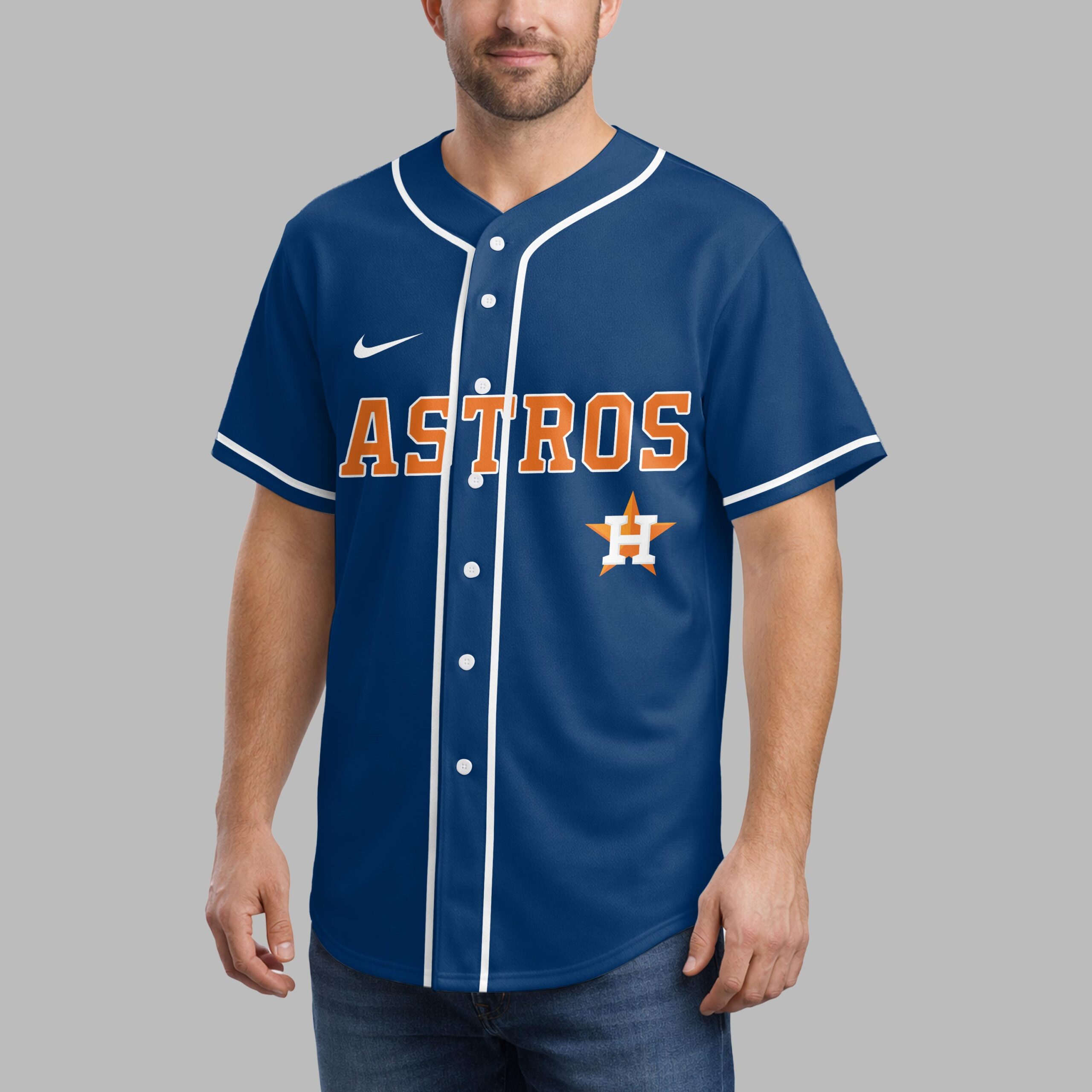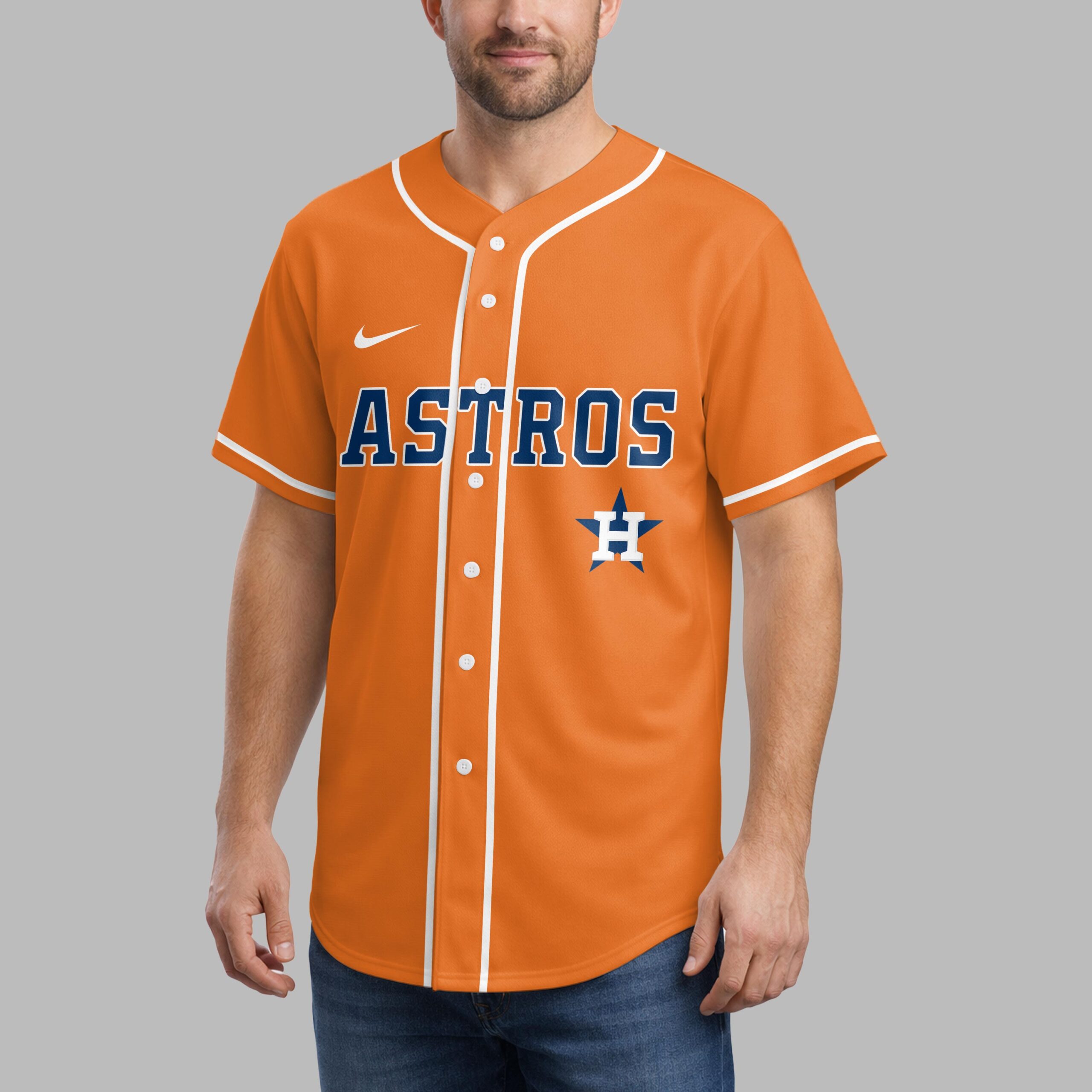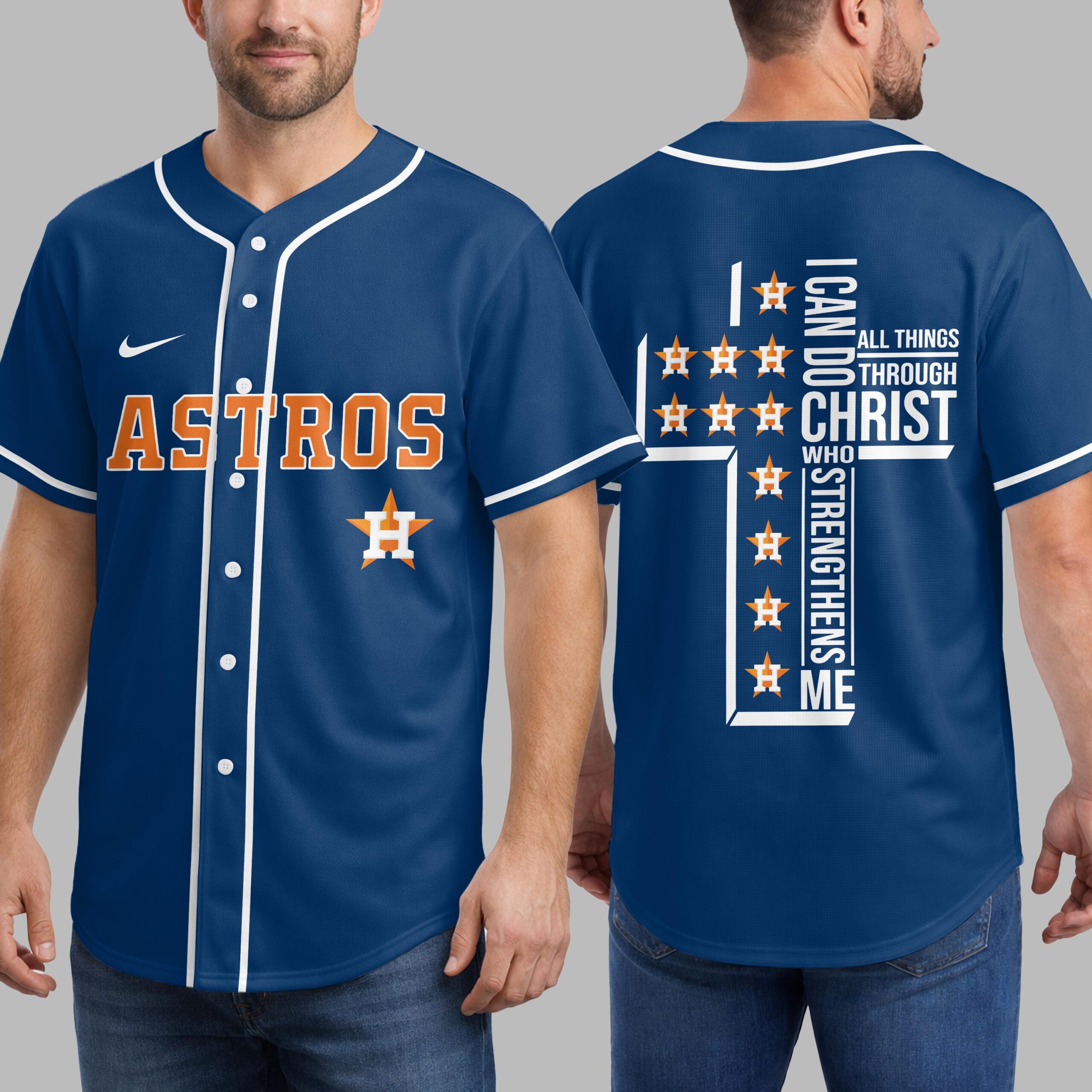 Unleash your double dose of devotion with this inspiring Astros baseball jersey! Perfect for fans who proudly stand with their team and their faith, this shirt powerfully blends spirited game-day energy with a profound message of strength and perseverance. Show the world what truly drives you, both on and off the field, with a design that speaks volumes about your allegiances and beliefs. The front of this striking navy blue jersey boldly features ASTROS in vibrant orange, complemented by the iconic orange H star logo. Turn heads as you walk away, revealing an empowering statement on the back: I CAN DO ALL THINGS THROUGH CHRIST WHO STRENGTHENS ME, artfully shaped into a cross. This powerful scripture is accentuated with multiple orange H star logos, creating a design that’s both meaningful and visually dynamic. Whether you’re cheering loud from the stands, gathering with your faith community, or simply going about your day, this jersey is a perfect expression of your convictions. Wear it to Sunday services, casual outings, or during intense game nights to embody both your team spirit and your spiritual strength.
