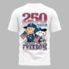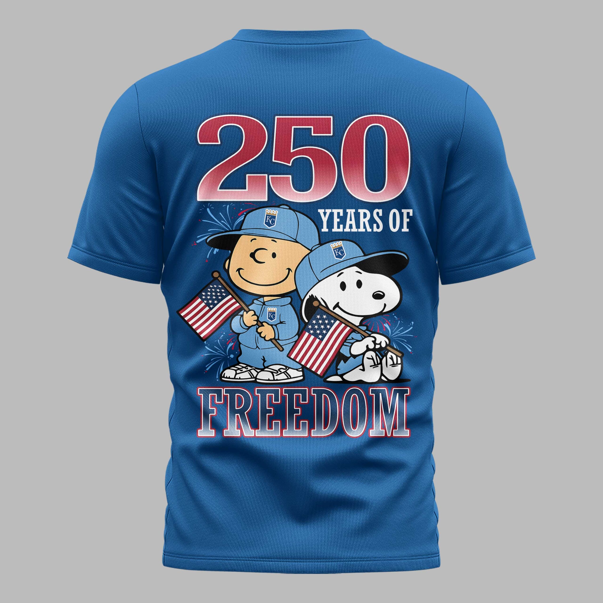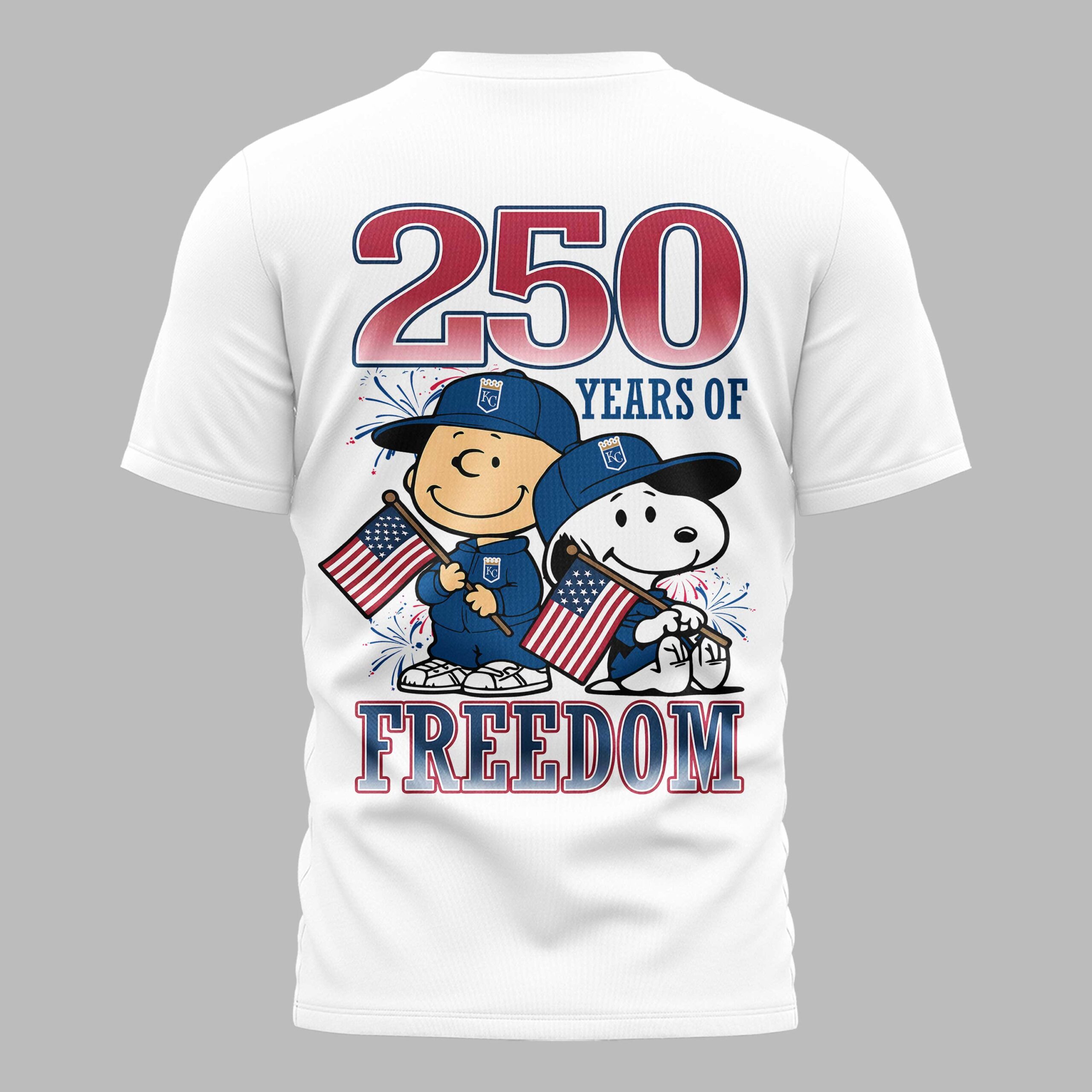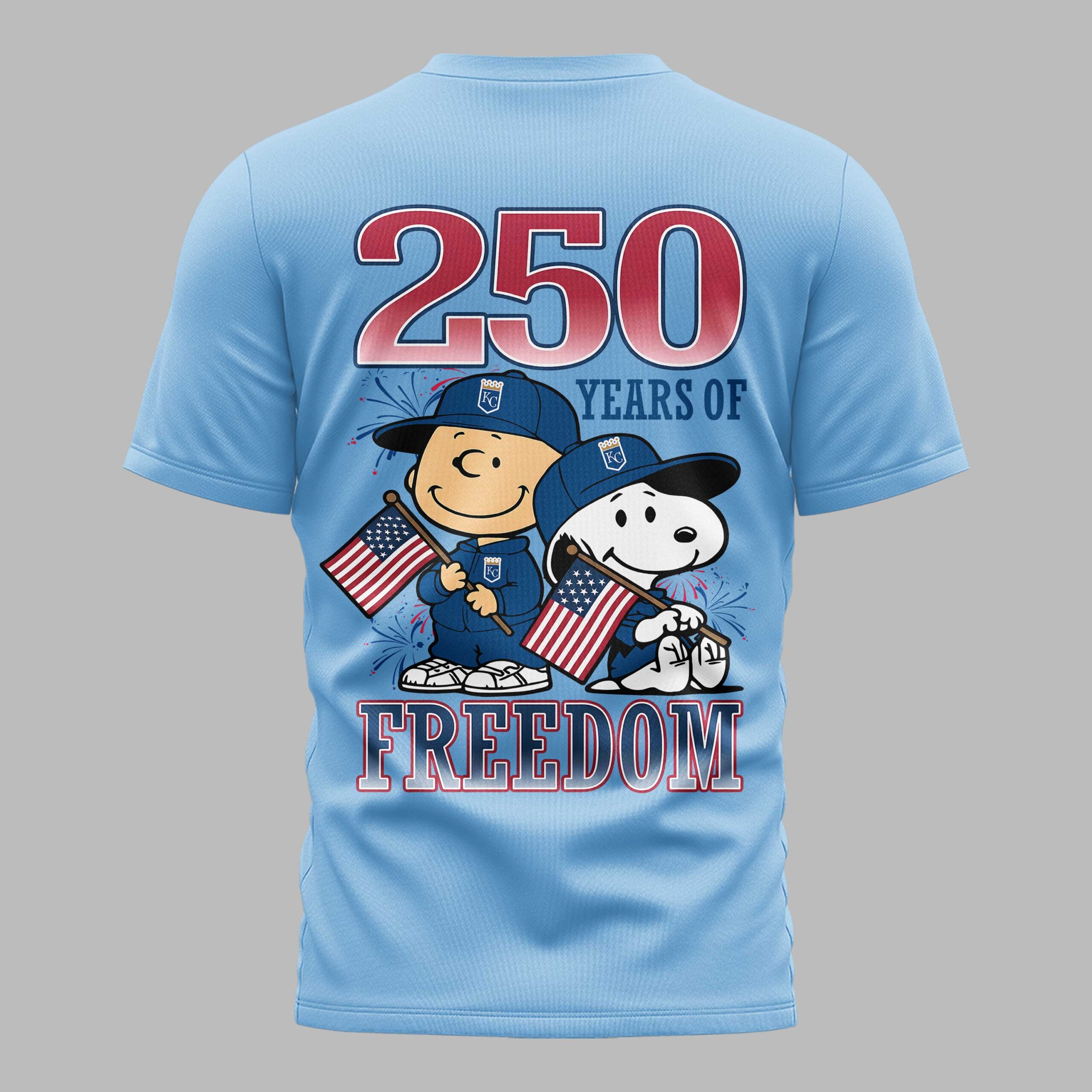 Celebrate your Kansas City Royals pride and America’s spirit with this patriotic tee! This vibrant design blends team loyalty with a powerful tribute to 250 Years of Freedom, perfect for fans cherishing baseball and national heritage. The front displays ROYALS in a stars-and-stripes pattern, with the KC crown logo and festive fireworks. The back features Charlie Brown and Snoopy, wearing KC caps and waving American flags. 250 YEARS OF FREEDOM is boldly presented below, surrounded by fireworks. Ideal for game days, Fourth of July, Memorial Day, or any event showcasing your Royals loyalty and American patriotism. Wear this shirt to parades, gatherings, or daily to honor your team and nation with spirited style.