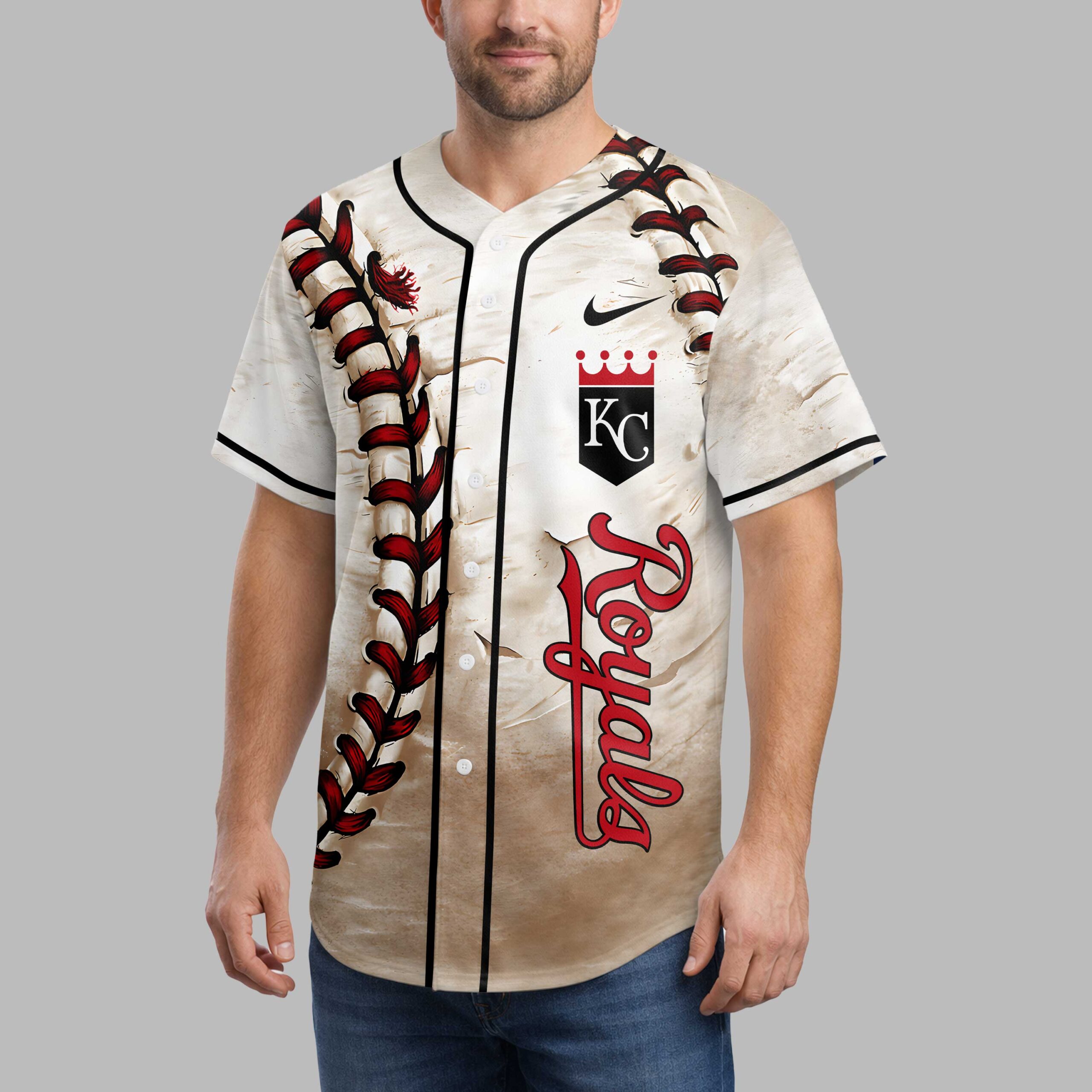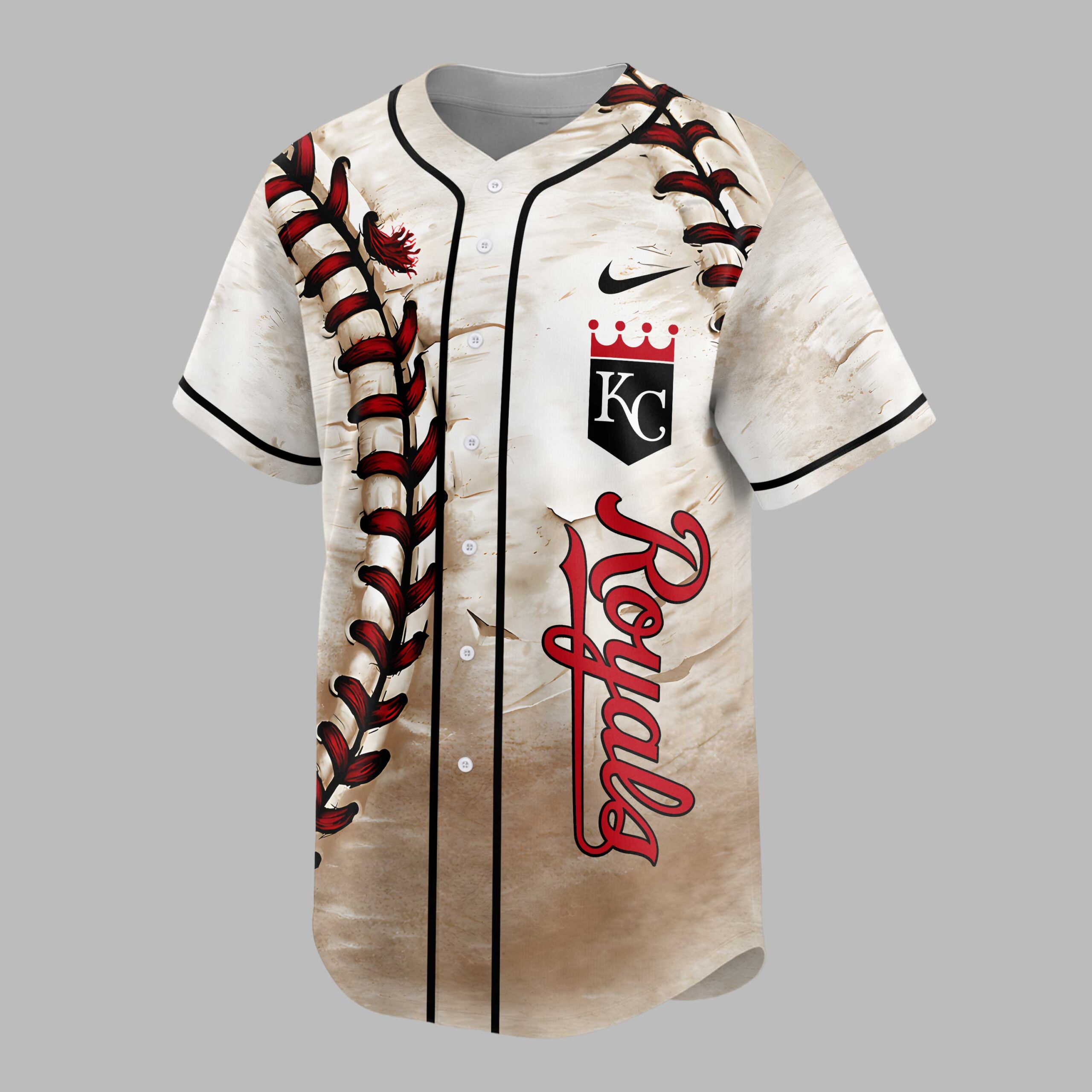 Step up to the plate in style with this Kansas City Royals-inspired baseball jersey, designed for the true fan who appreciates a classic look. Show off your unwavering team pride with a shirt that captures the spirit of the game and a timeless aesthetic. This unique jersey is perfect for expressing your loyalty to the Royals with a personalized touch. The front features a captivating distressed, worn-in effect across the fabric, enhanced by bold red baseball stitching that runs dramatically down the side. The iconic KC logo with its crown sits proudly on the chest, complemented by the elegant Royals script in vibrant red. The back continues the vintage vibe and offers a special opportunity to add your own name above a large, baseball-stitched number, creating a truly unique piece of fan gear. Whether you’re cheering from the stands at Kauffman Stadium, hosting a game day BBQ, or simply showcasing your team spirit around town, this jersey is a grand slam. It’s the ideal choice for any dedicated Kansas City Royals supporter looking for a comfortable and stylish way to celebrate their favorite team all season long.
