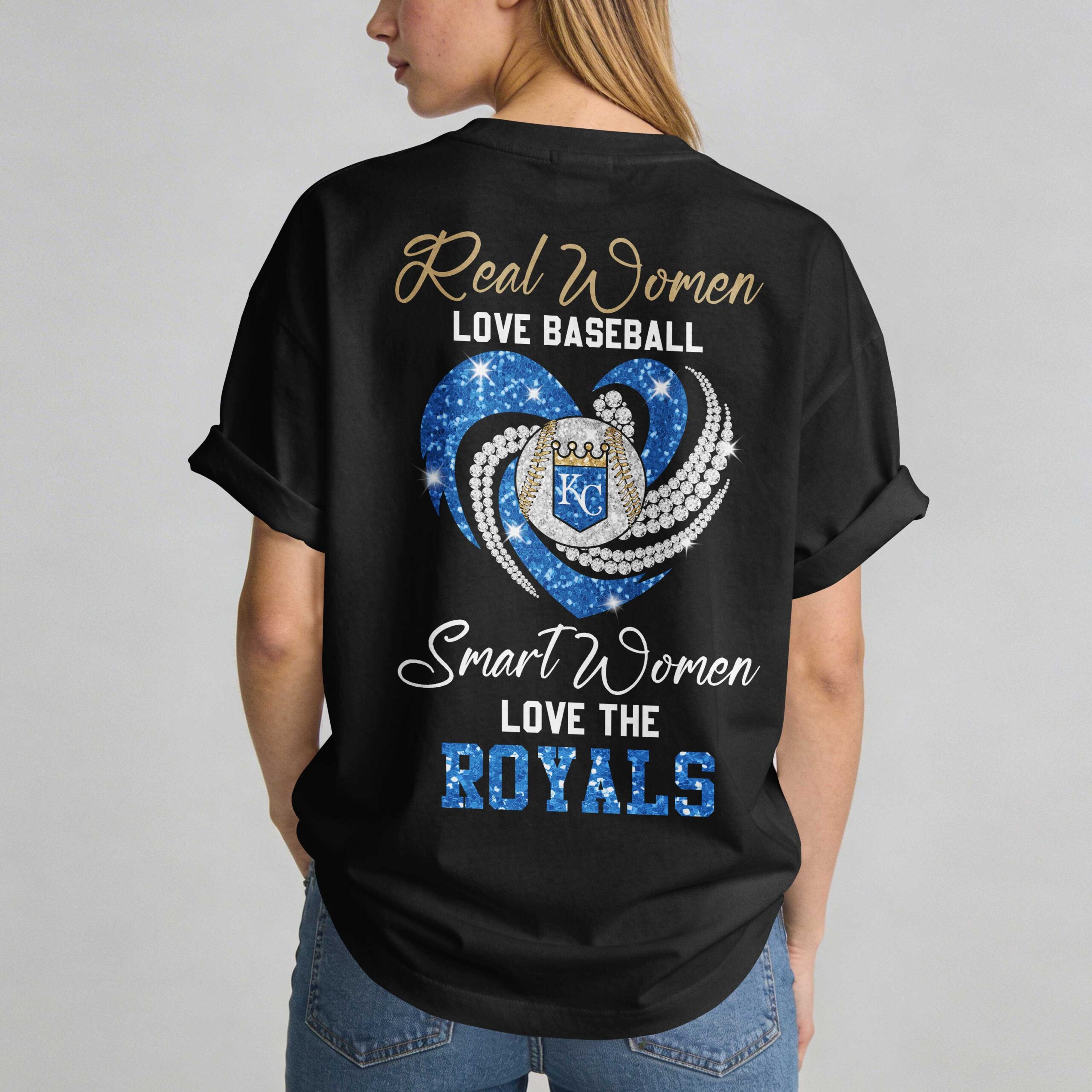 Showcase your unwavering loyalty to Kansas City with this striking Royals fan T-shirt. Designed for dedicated supporters, this shirt blends team spirit with a bold, energetic aesthetic. It’s the perfect way to display your Kansas City pride while standing out in the crowd at the stadium or around town. The front features the iconic Royals script in a shimmering blue glitter finish, paired with a gold swoosh and the classic KC crown logo. The back showcases a powerful statement: Real Women Love Baseball, Smart Women Love the Royals. This graphic centers on a stunning heart-shaped arrangement of blue glitter and pearls surrounding a crown-topped baseball, creating a uniquely eye-catching design. Whether you’re heading to the ballpark for game day or enjoying Independence Day celebrations, this tee is your go-to gear. It’s a must-have for any fan representing their team with style and passion every day.
