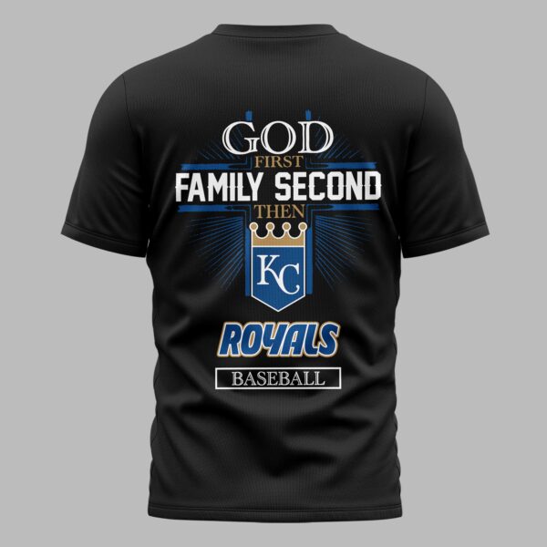 Unite your love for the Kansas City Royals with your core values in this compelling fan shirt. Designed for the devoted supporter, it proudly declares your team loyalty while affirming faith and family come first. A powerful statement for any occasion. The front features KANSAS CITY ROYALS arching over the iconic KC crown logo, framed by a classic baseball graphic. The back boldly declares GOD FIRST FAMILY SECOND THEN, above a vibrant KC ROYALS BASEBALL emblem with its regal crown and radiating blue accents. Perfect for game days, family gatherings, or casual wear, this shirt expresses your passions. Wear it to the stadium, a watch party, or around town, showcasing dedication to your team and life’s true priorities.