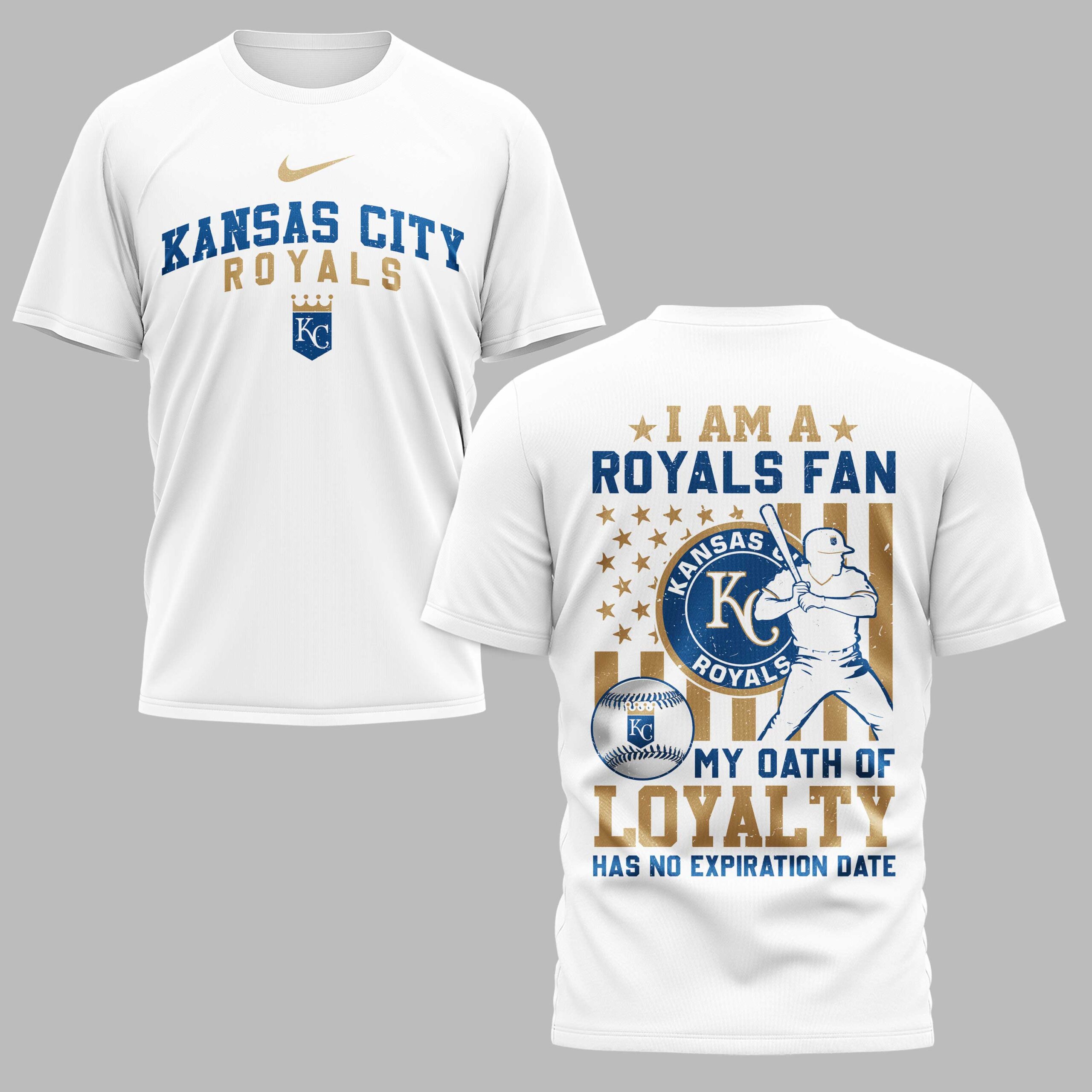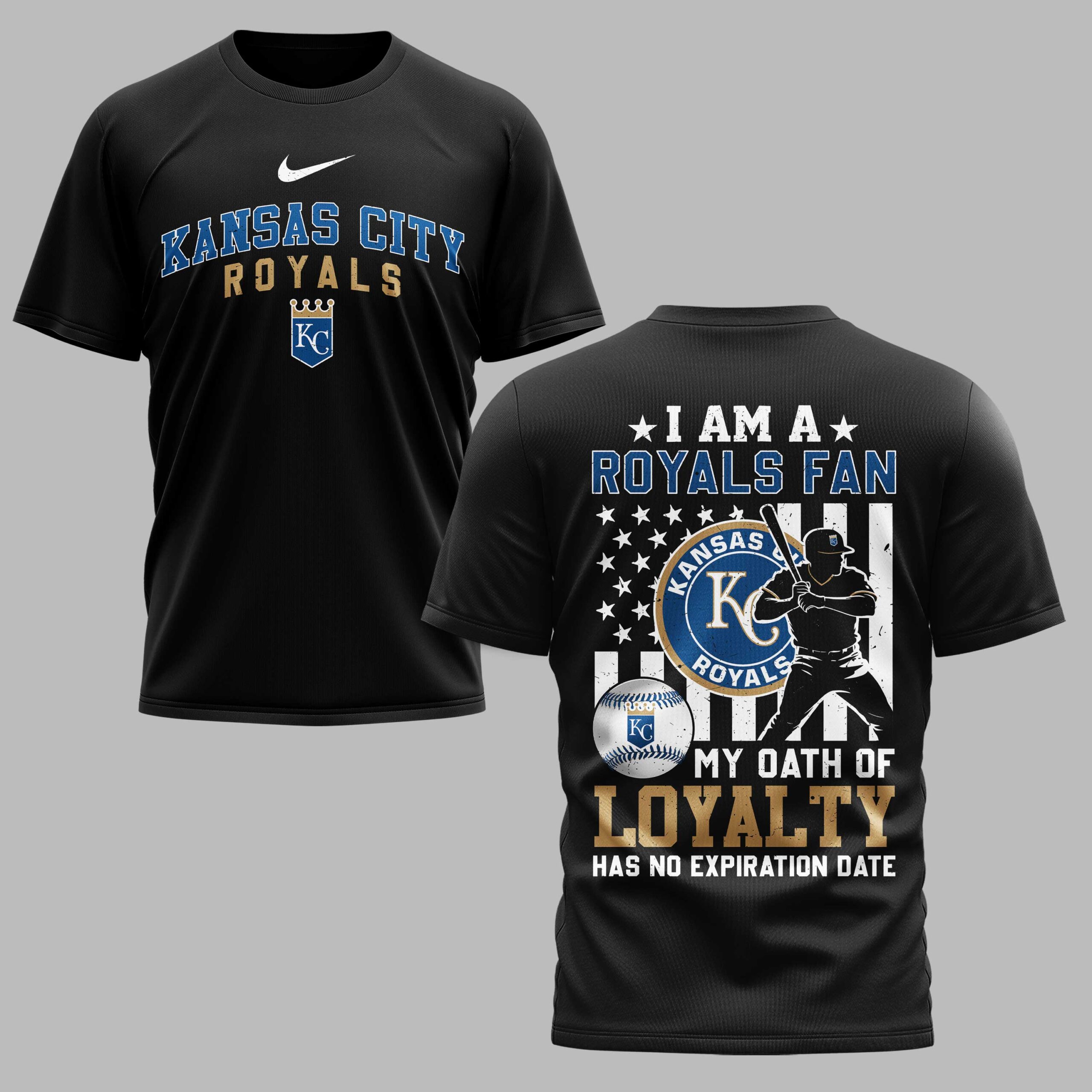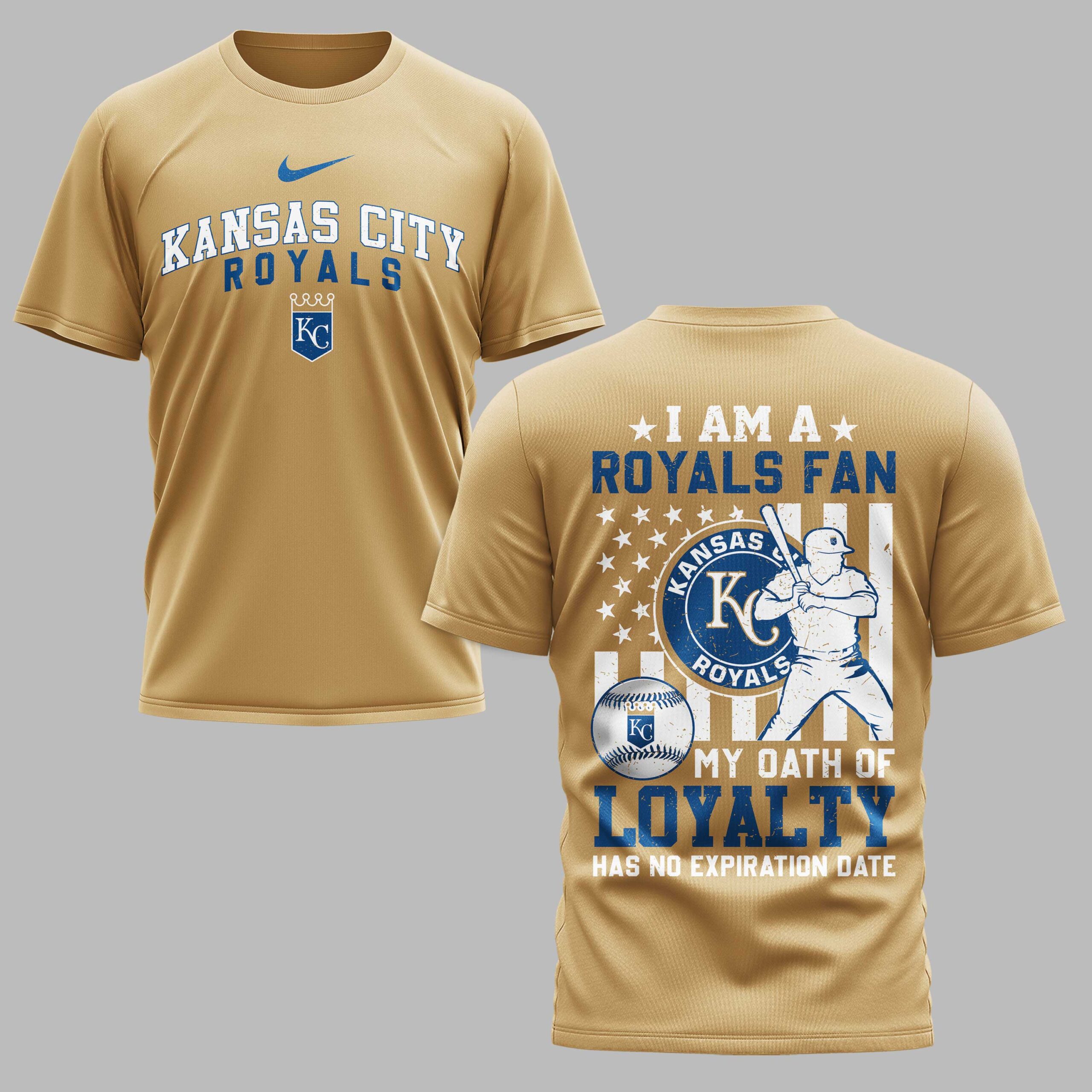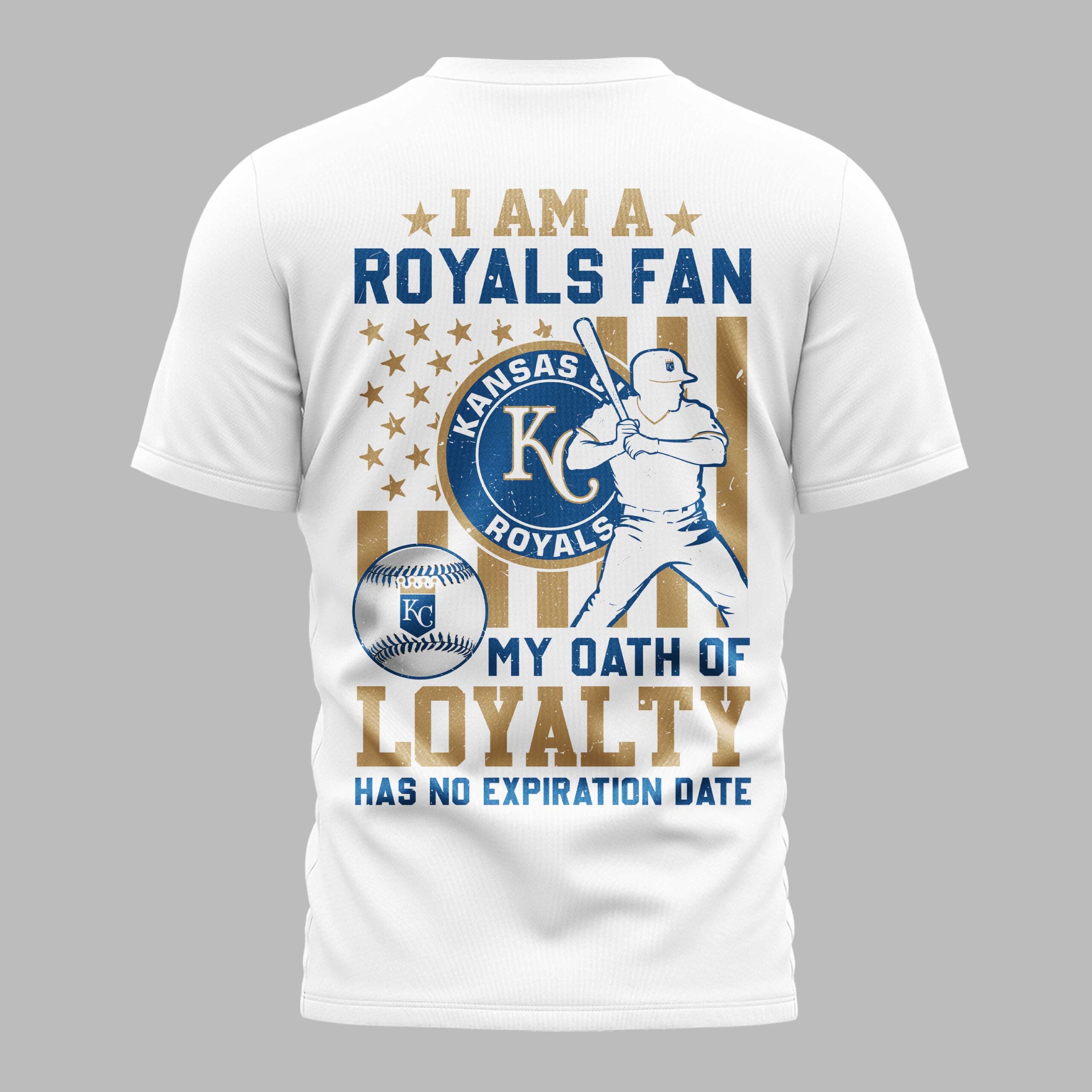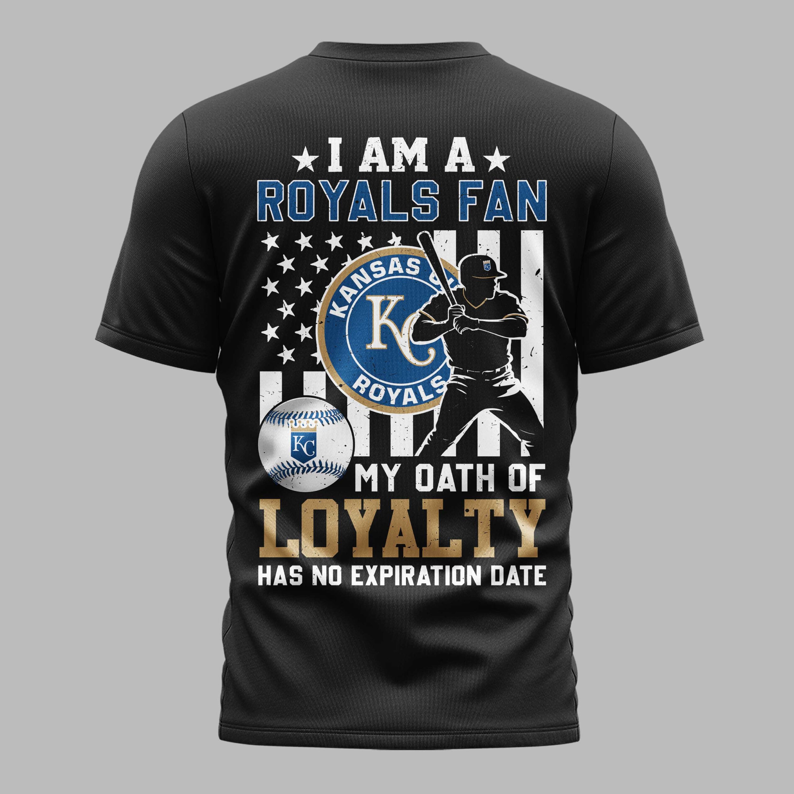 Showcase your unyielding devotion to the Kansas City Royals with this spirited baseball tee. Designed for the truest fans, this shirt is a powerful declaration of your allegiance, perfect for anyone who bleeds blue and gold. The front proudly displays KANSAS CITY ROYALS in bold, striking lettering, accompanied by the iconic KC crown logo, ensuring your team pride is front and center. The back makes an even stronger statement, featuring a distressed American flag backdrop with stars and stripes, overlaid with a dynamic silhouette of a baseball player ready to hit. Emblazoned with I AM A ROYALS FAN and the powerful declaration MY OATH OF LOYALTY HAS NO EXPIRATION DATE, alongside the team’s main logo and a detailed baseball, this design captures the essence of true fandom. Whether you’re cheering from the stands at Kauffman Stadium, hosting a game-day watch party, or simply going about your day, this tee is an ideal way to celebrate your favorite team. It’s more than just apparel; it’s a testament to your endless loyalty, making it a must-have for any dedicated Kansas City Royals supporter.