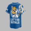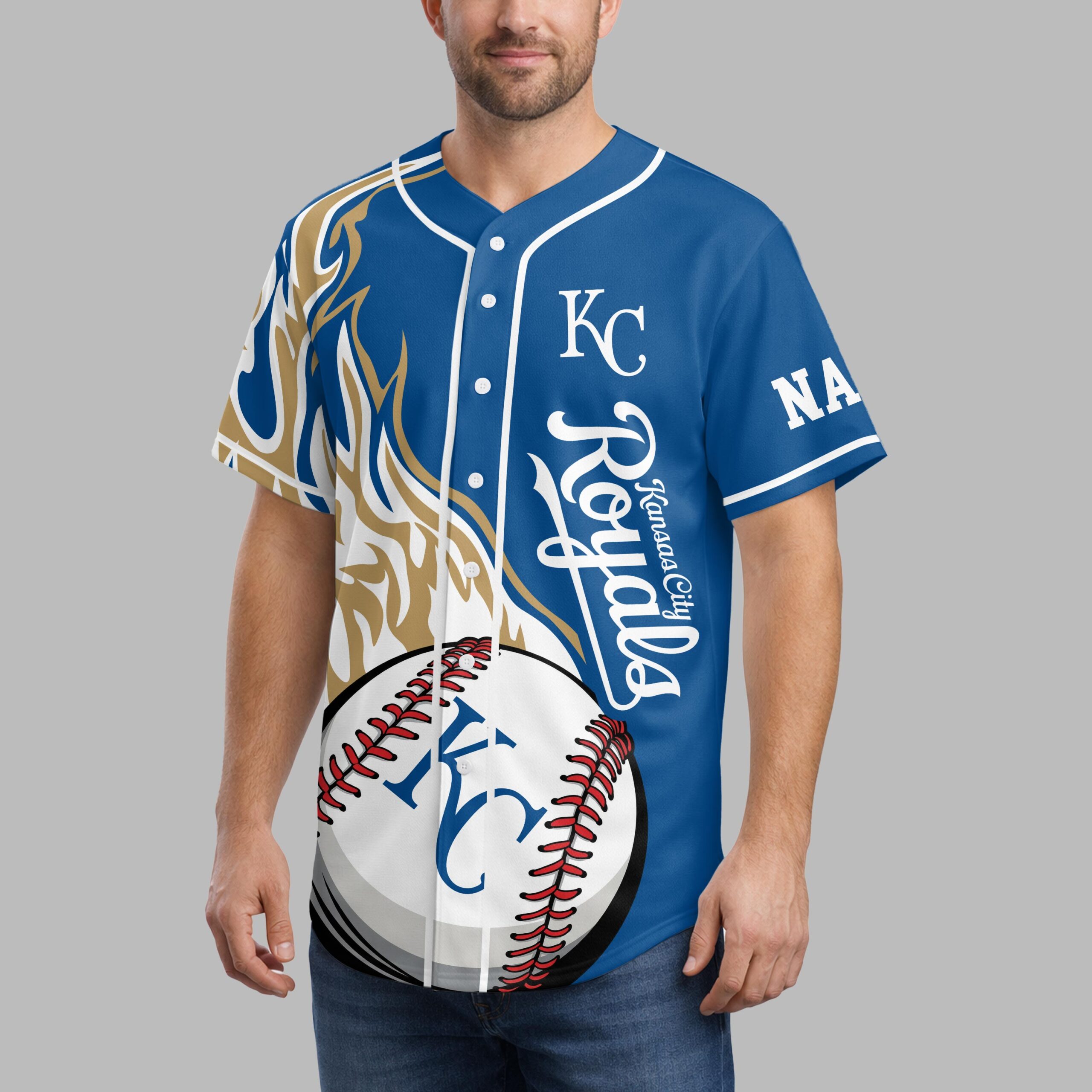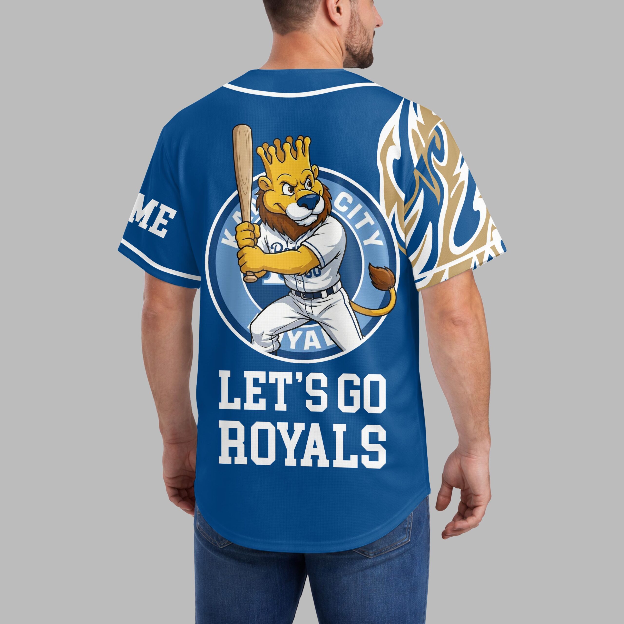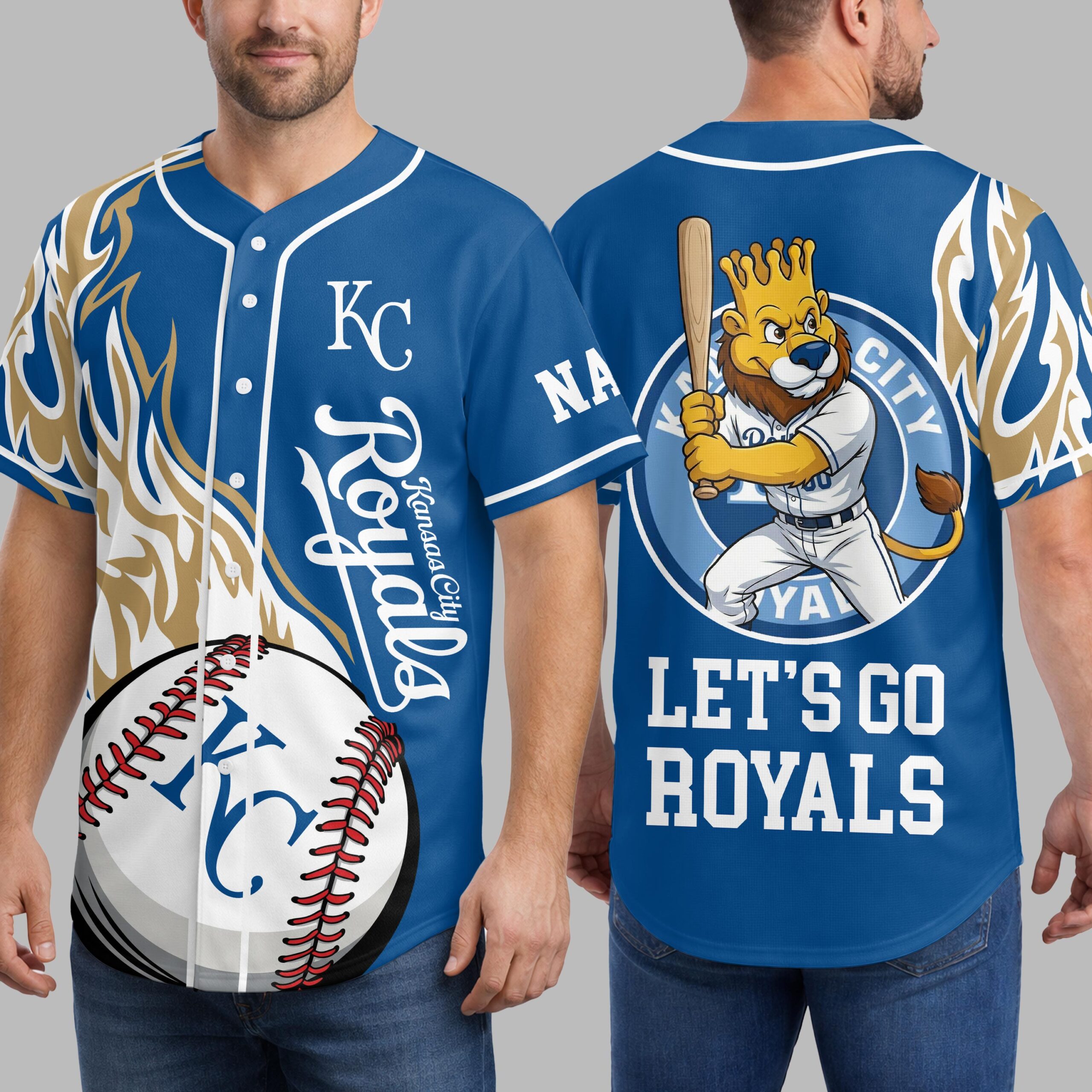 Showcase your unwavering team spirit with this dynamic Kansas City Royals baseball jersey! Crafted for the ultimate fan, this jersey radiates passion and pride, making it clear who you root for on game day and every day. The front features the iconic KC and Royals script, accentuated by a bold baseball graphic with the KC emblem and vibrant red stitching. Gold and white flame-like designs sweep across the shoulders and sides, adding an energetic flair. Turn heads with the back design, starring a spirited lion mascot in a baseball uniform, ready to play, all framed within a Kansas City circular logo. Below, the rallying cry LET’S GO ROYALS boldly declares your allegiance. Perfect for cheering from the stands, gathering with friends for a watch party, or simply showing off your Kansas City Royals pride around town. This jersey is your go-to for embodying the energy and excitement of baseball season.