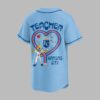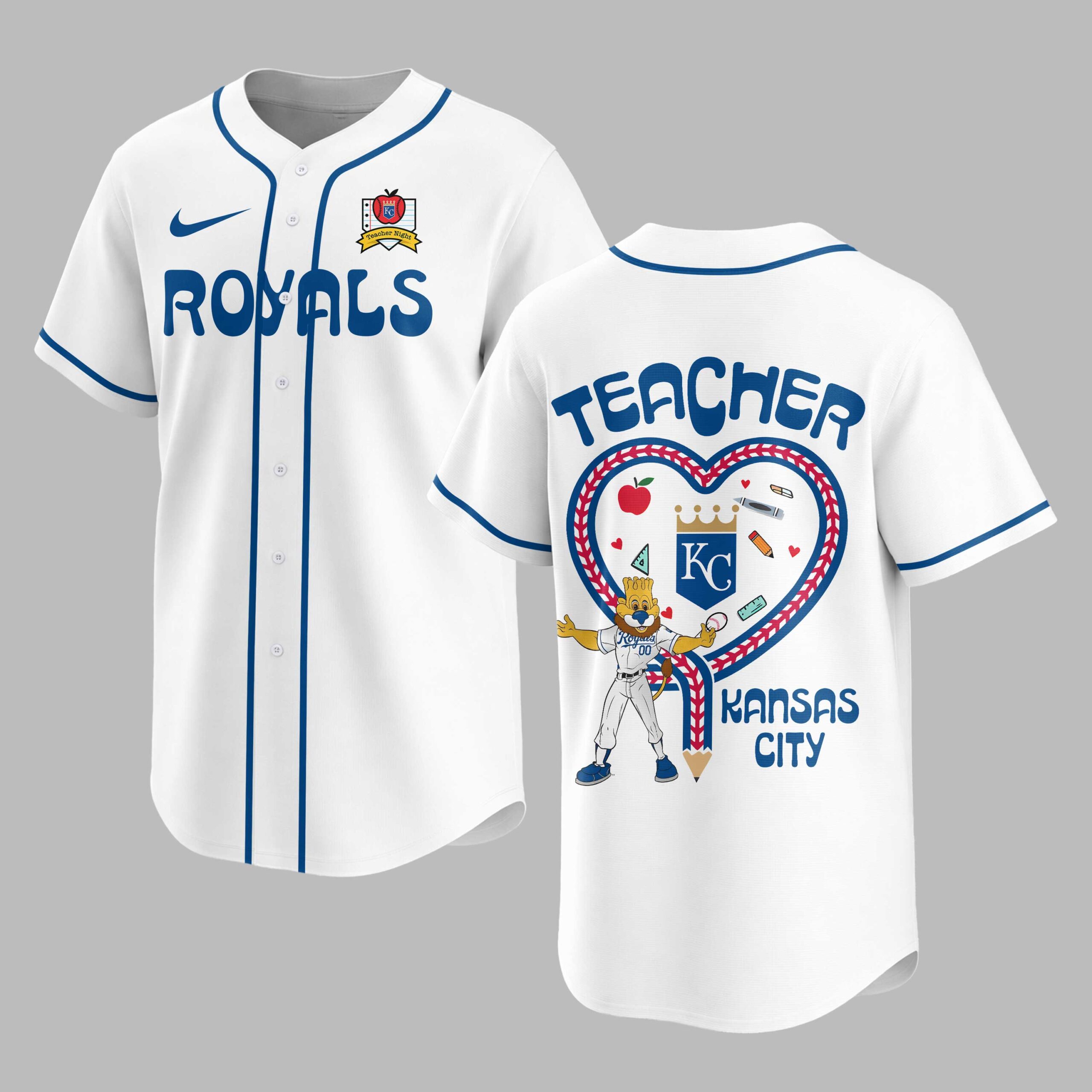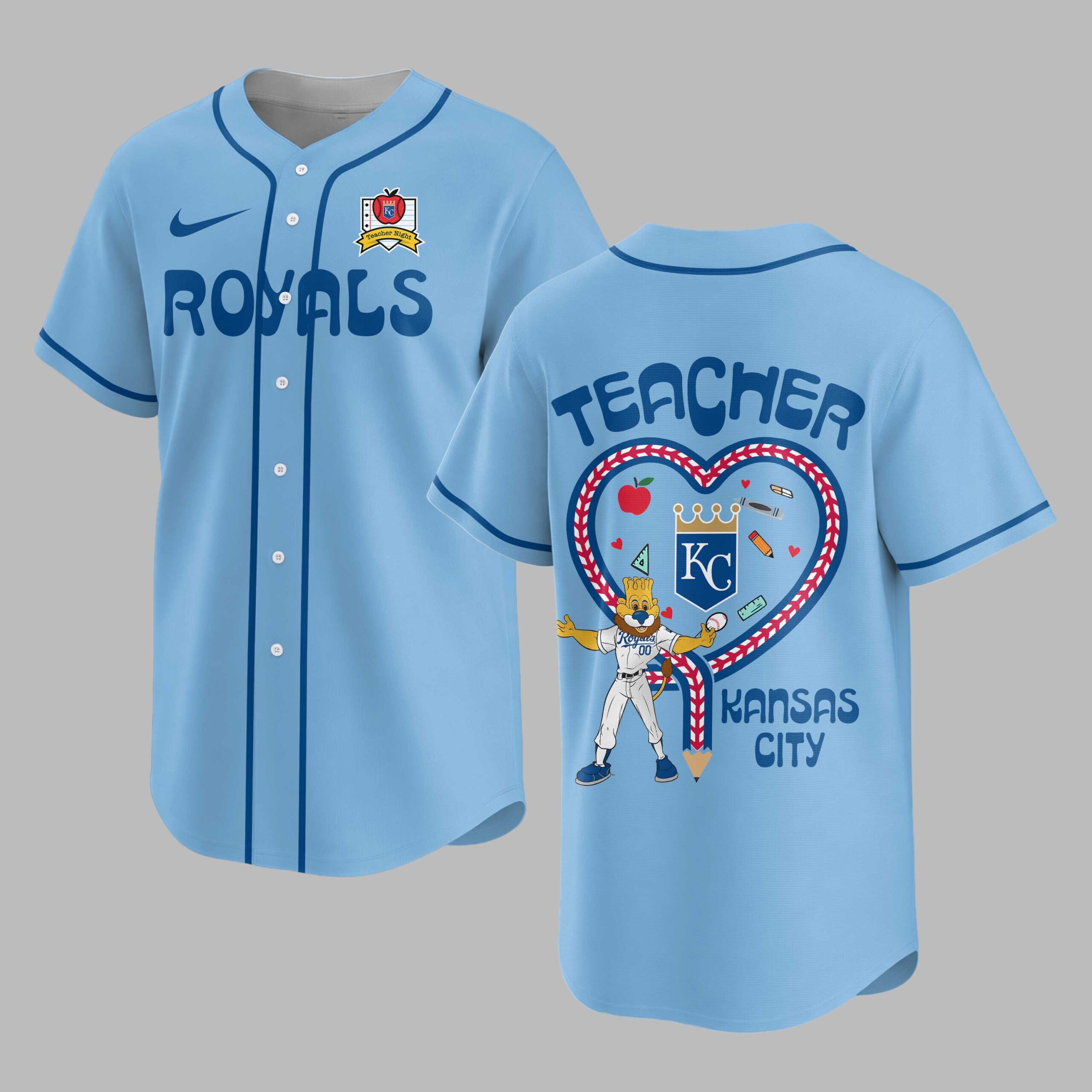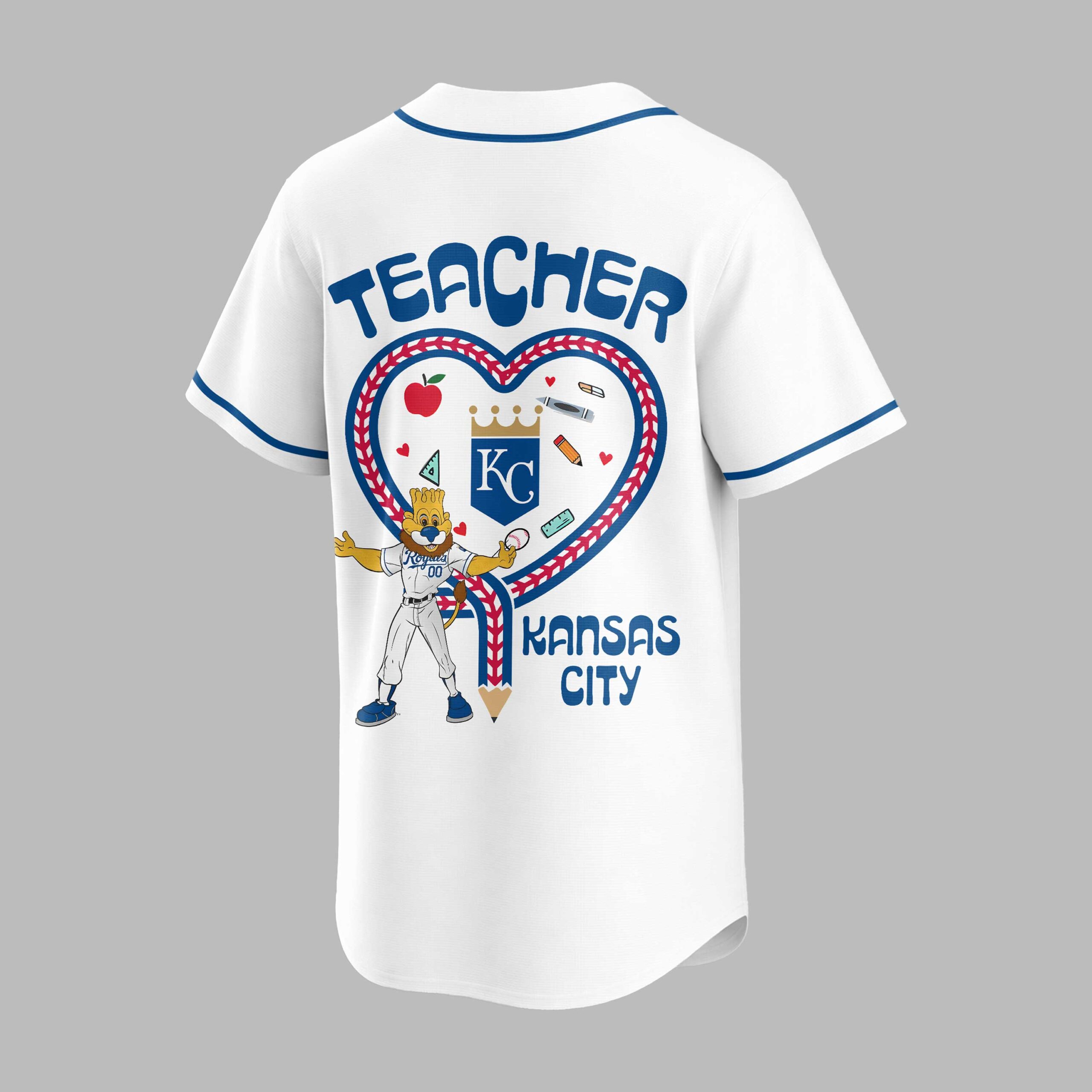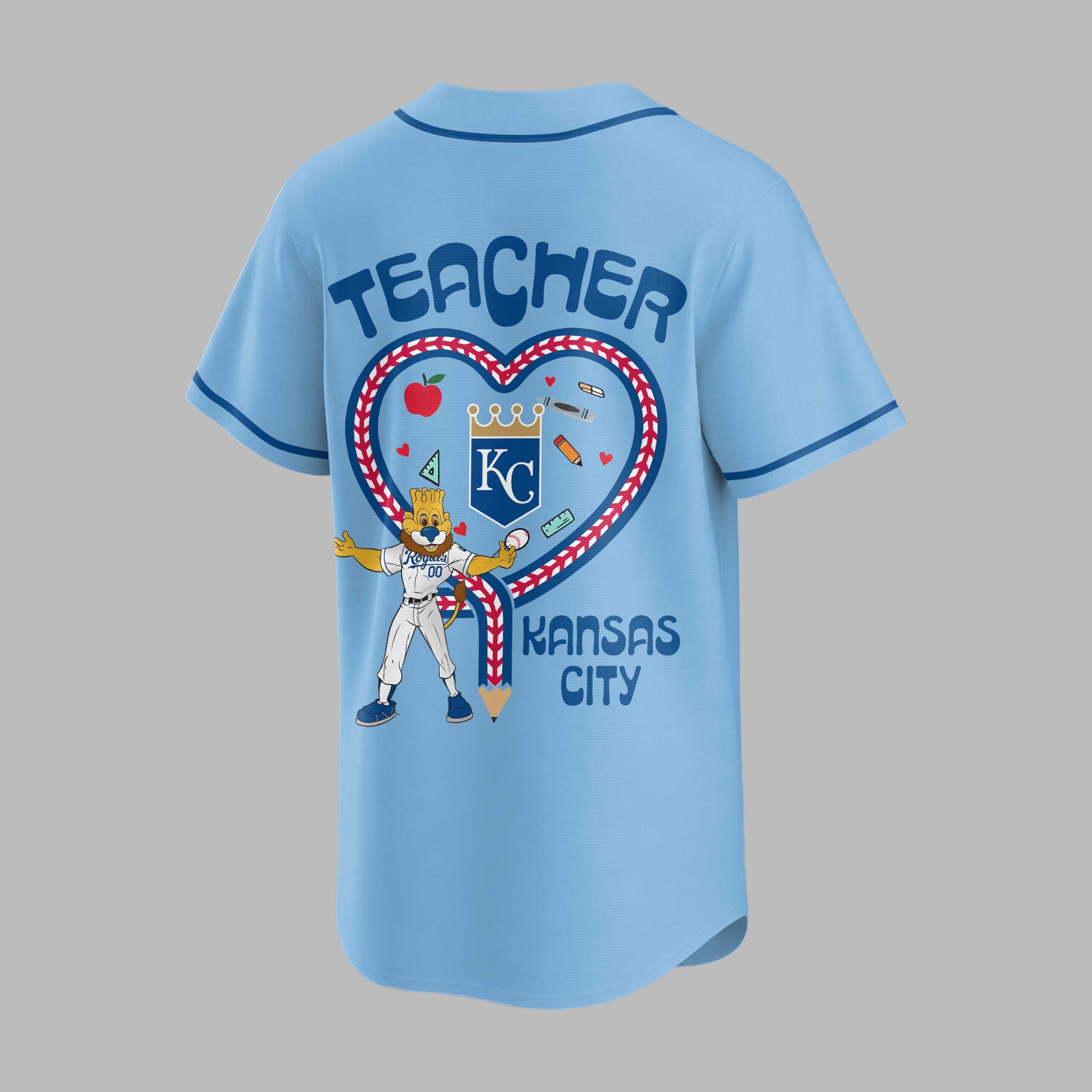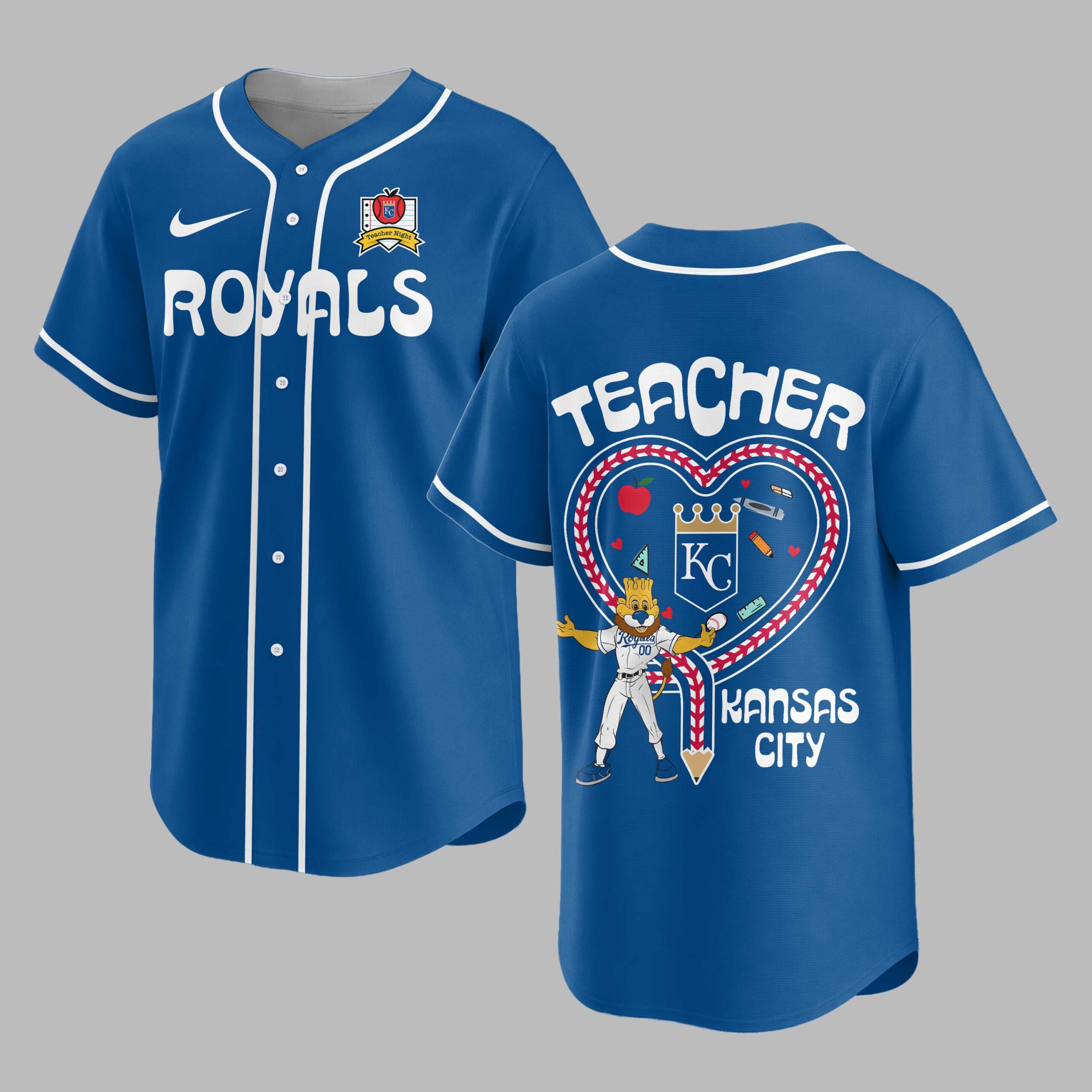 Celebrate your passion for both the Kansas City Royals and the invaluable work of educators with this unique baseball jersey! Perfect for showing your dual pride, this shirt is a home run for any teacher who loves their local team. It’s a heartfelt tribute to those who shape the future, all while cheering on the boys in blue. This vibrant blue jersey proudly displays ROYALS across the chest, complemented by a special Teacher Night logo featuring an apple, crown, and KC. The back design is a true standout, showcasing TEACHER at the top and a heart woven from baseball stitches, filled with school essentials and a KC crown. Below, the beloved Royals mascot, Sluggerrr, is featured holding a baseball, with KANSAS CITY boldly underneath. Whether you’re heading to Kauffman Stadium for Teacher Night, grading papers in style, or simply enjoying a casual day out, this jersey is designed to highlight your dedication. It’s an ideal way to represent your team and your profession, making it a thoughtful gift for any Kansas City teacher or a proud addition to your own game day wardrobe.