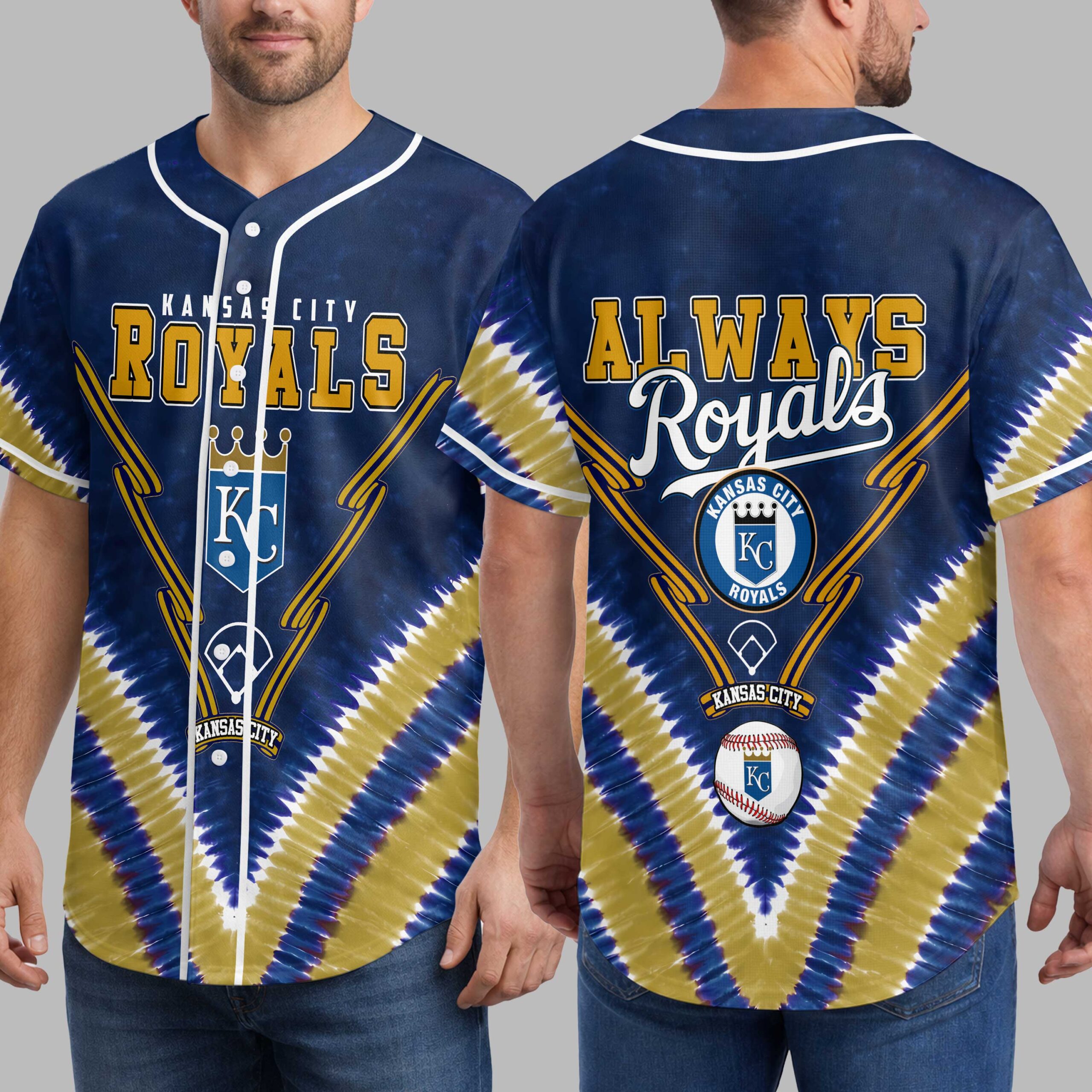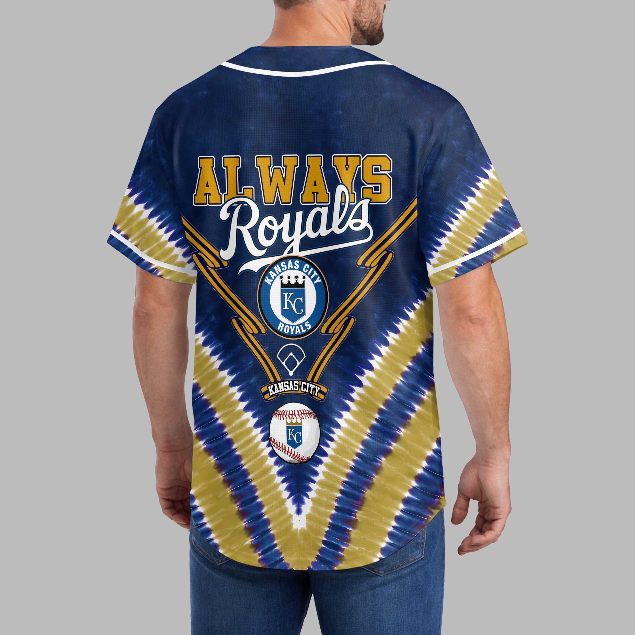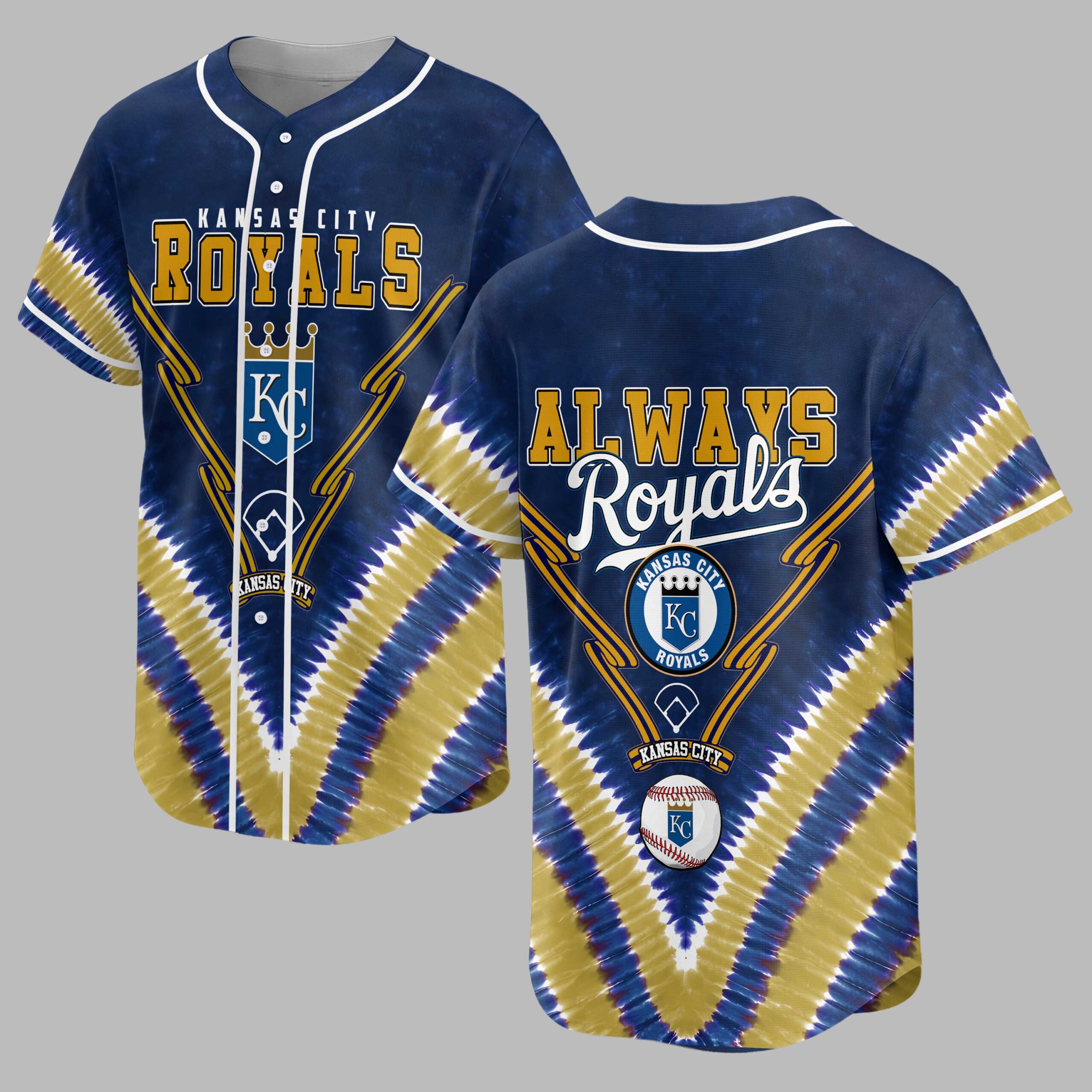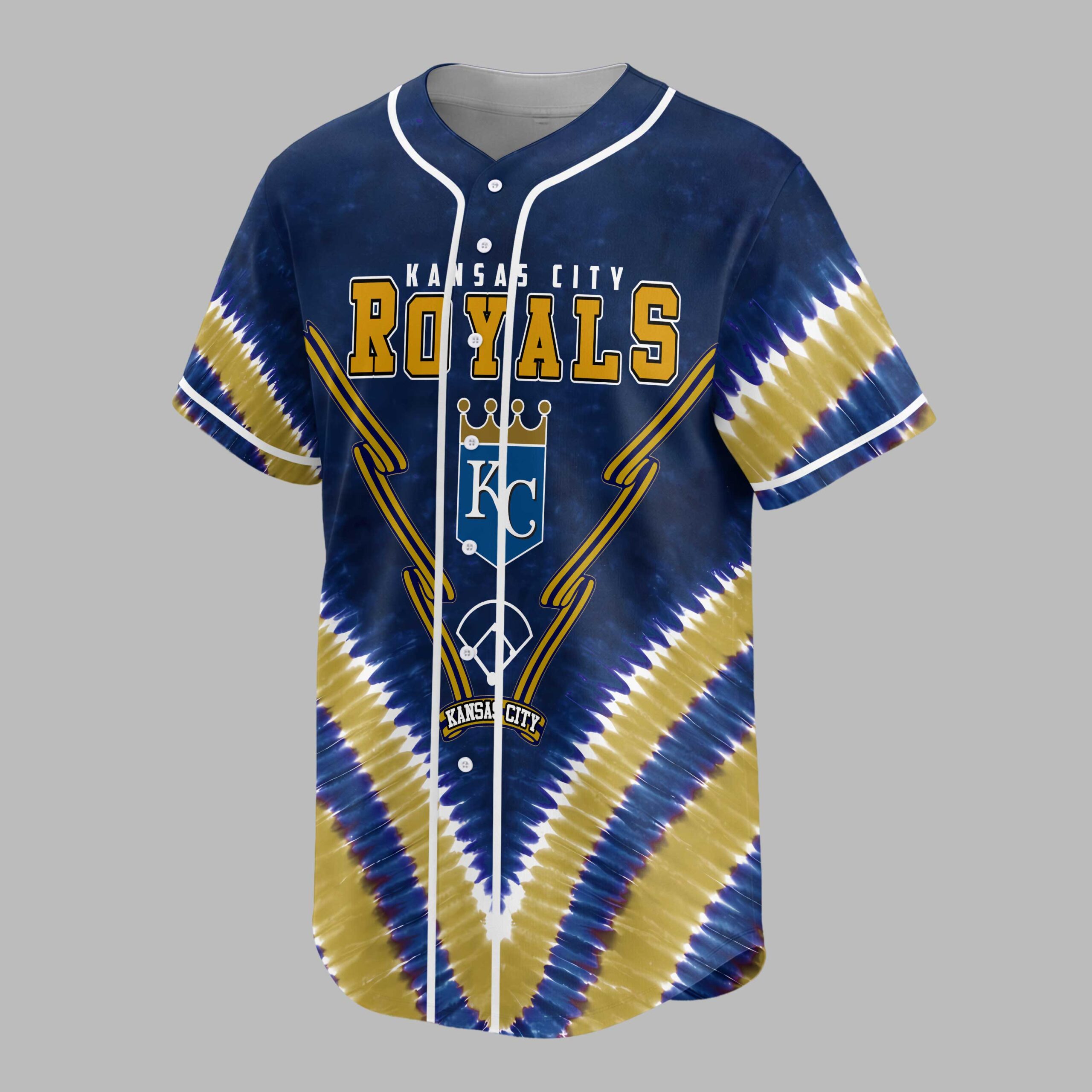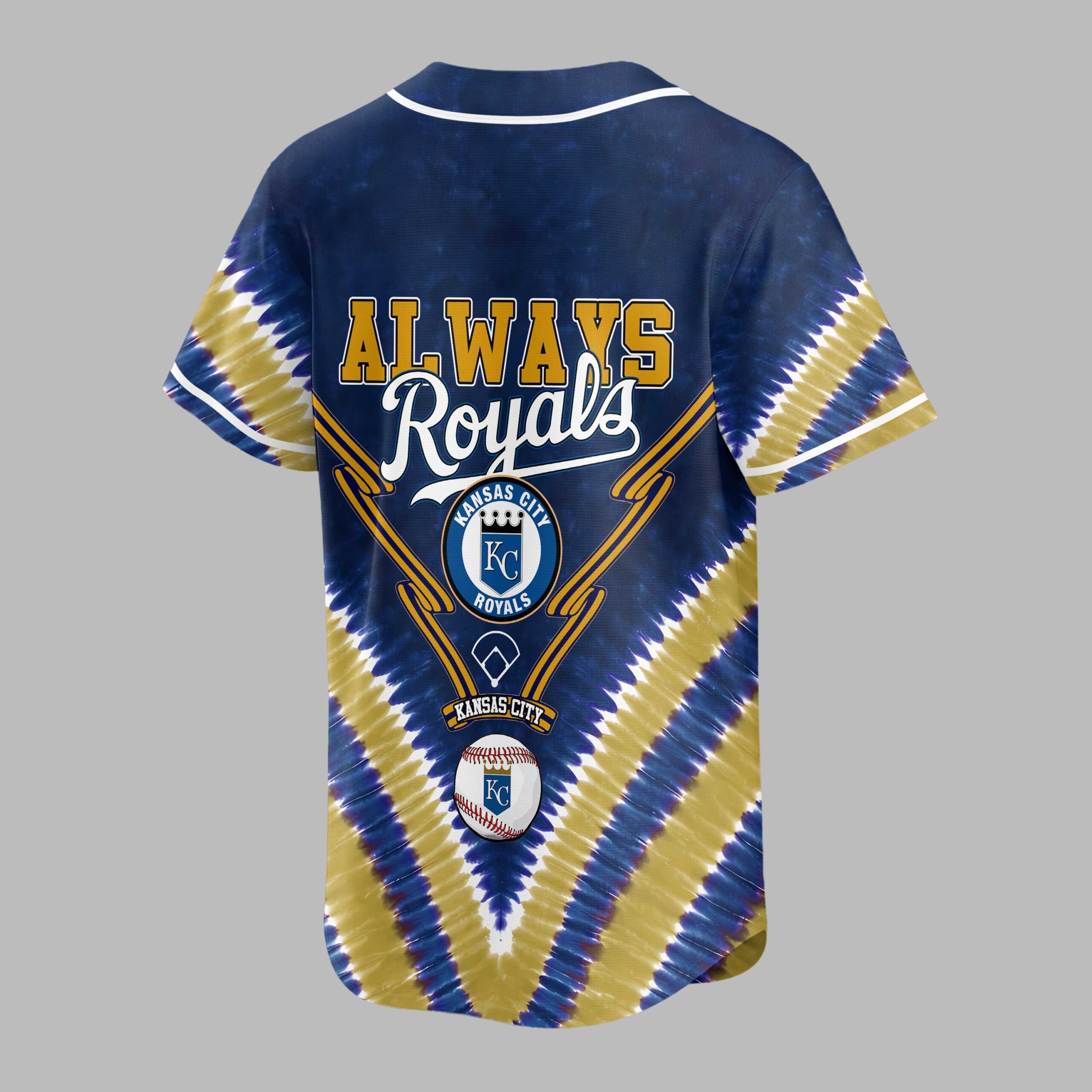 Show off your unwavering Kansas City Royals pride with this unique tie-dye baseball jersey! Perfect for dedicated fans, this vibrant shirt lets you celebrate your favorite team in style, blending classic team spirit with a trendy, eye-catching design. The front proudly displays KANSAS CITY ROYALS in bold gold lettering, accented by the iconic KC crown logo and crossed bats. The back features a passionate ALWAYS Royals slogan, alongside another prominent KC logo, all set against a dynamic blue and gold tie-dye pattern. Details like the baseball diamond outlines and a classic baseball graphic complete this spirited look. Whether you’re cheering from the stands at Kauffman Stadium, gathering with friends for a watch party, or simply out and about, this jersey is your go-to for game day and beyond. It’s an exciting way to express your loyalty and stand out from the crowd, making every day feel like a home run.