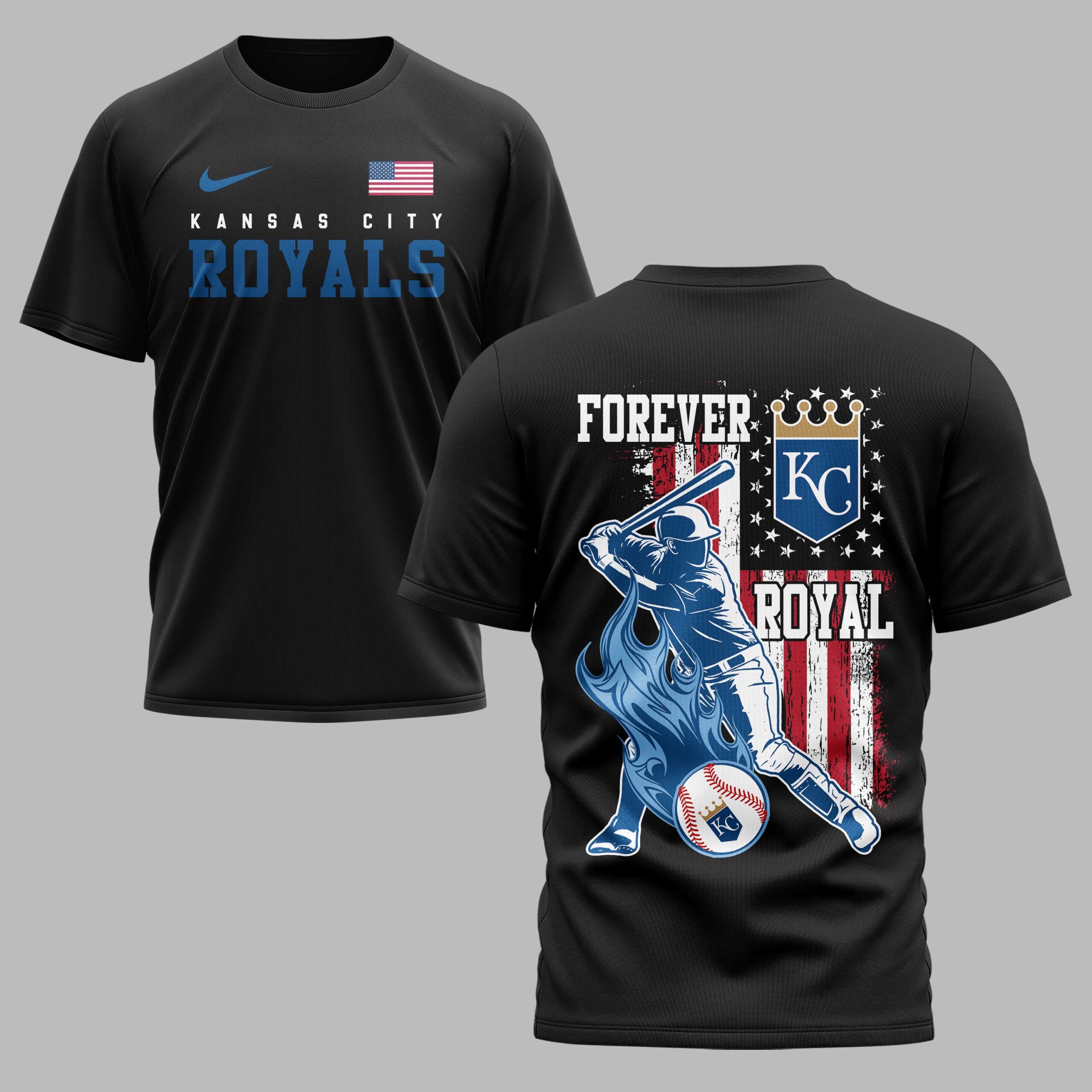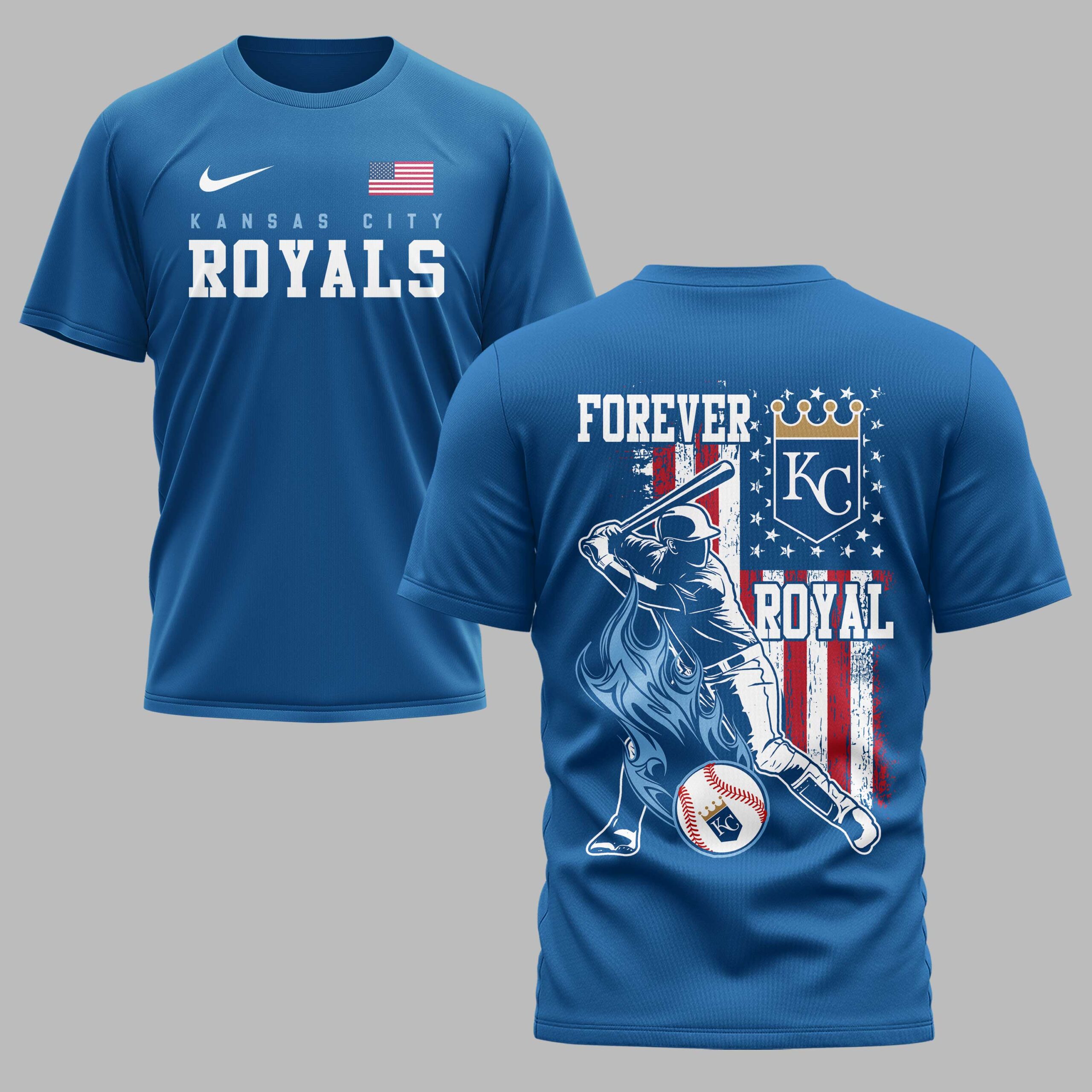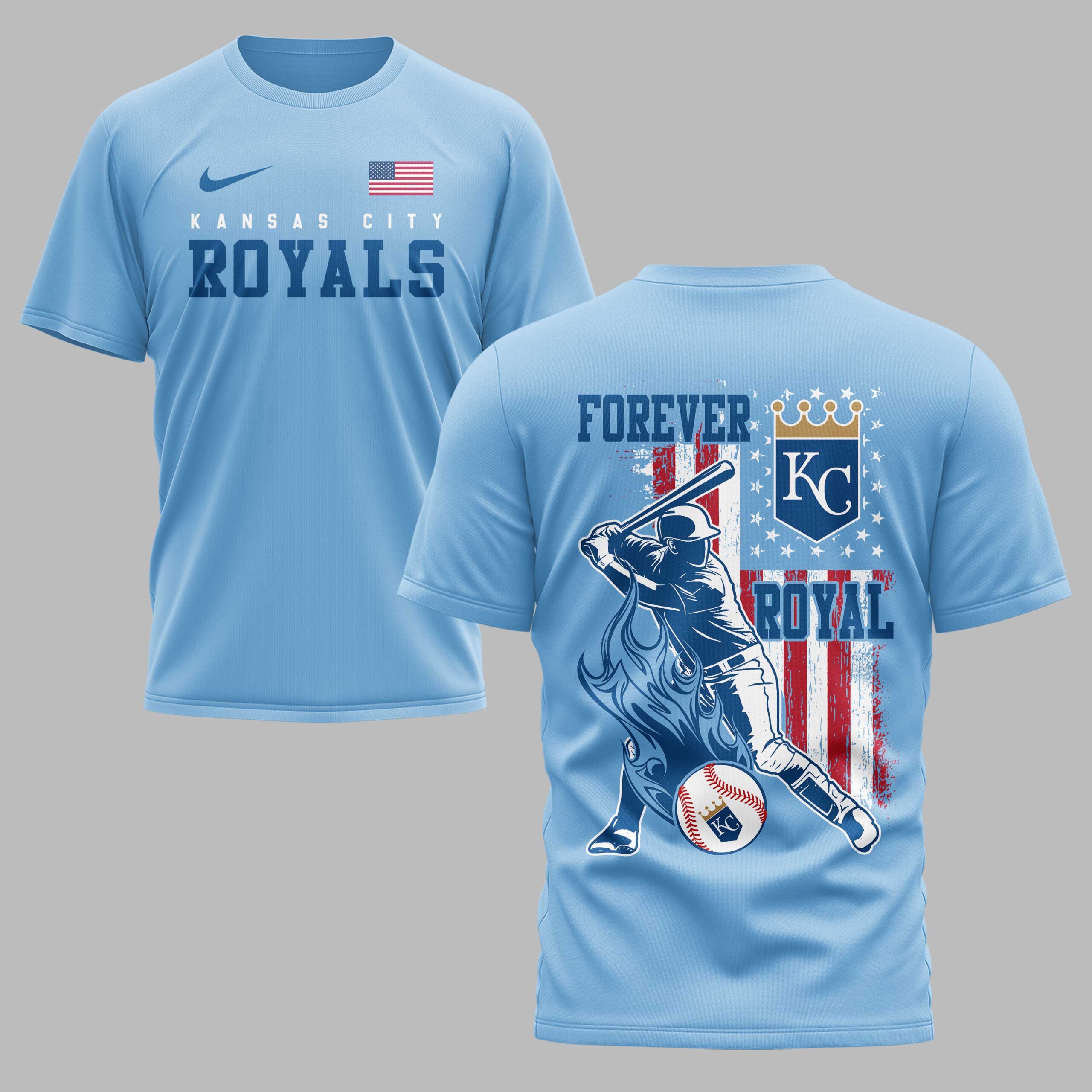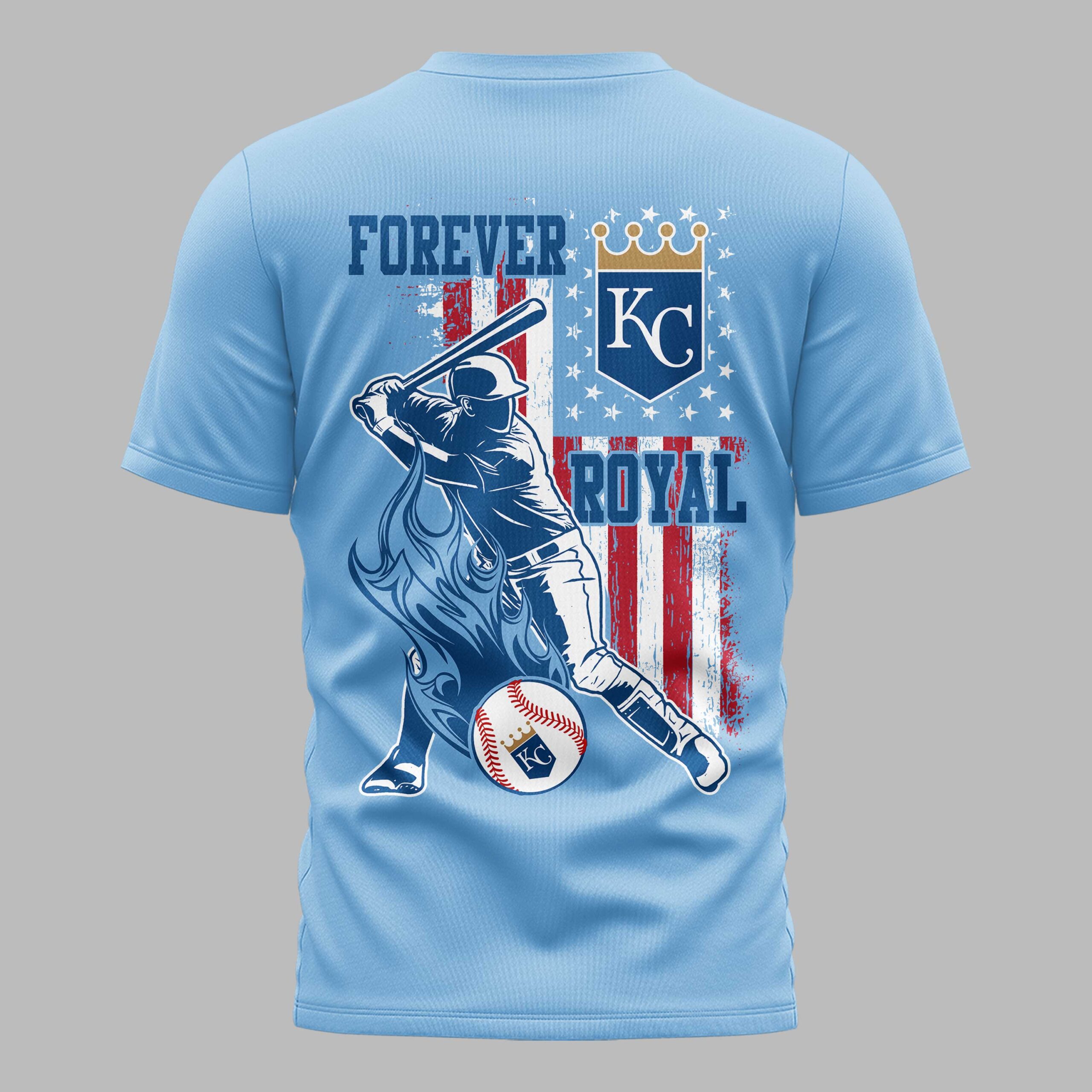 Ignite your passion for the Kansas City Royals with this dynamic patriotic tee! Show off your unwavering team spirit and American pride in one powerful statement. This shirt is a must-have for any dedicated fan ready to celebrate their favorite team with a touch of national honor. The front proudly displays KANSAS CITY ROYALS beneath a vibrant American flag, setting the tone for ultimate fan dedication. The back explodes with a powerful graphic featuring a baseball player mid-swing, set against a distressed red, white, and blue flag backdrop. Crowned by FOREVER KC ROYAL and a regal gold crown, alongside a symbolic KC logo and a flaming design, every detail screams loyalty and love for the game. Perfect for cheering from the stands on game day, tailgating with fellow fans, or celebrating holidays like the Fourth of July, this tee lets you wear your heart on your sleeve. It’s ideal for any casual outing where you want to boldly represent your Kansas City Royals and your country.
