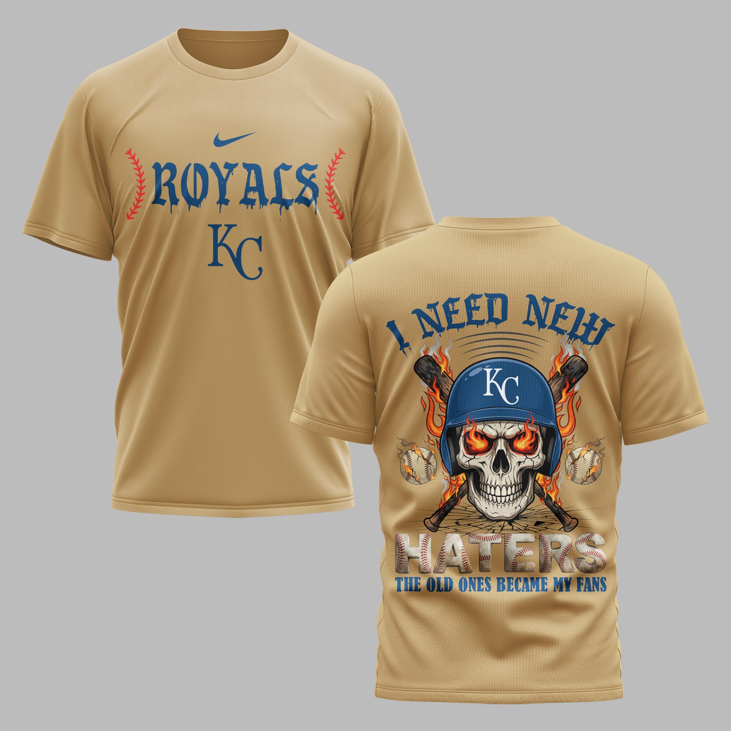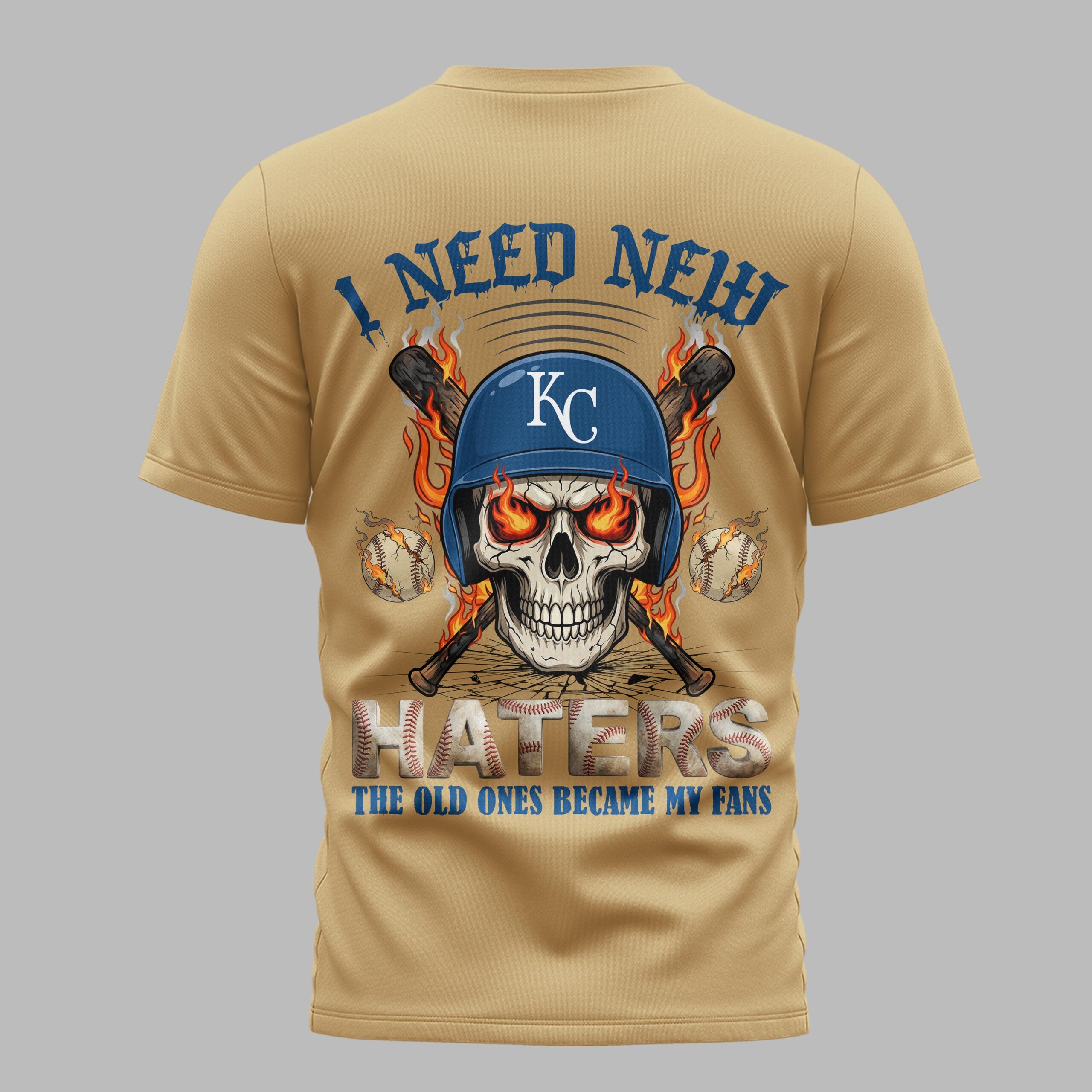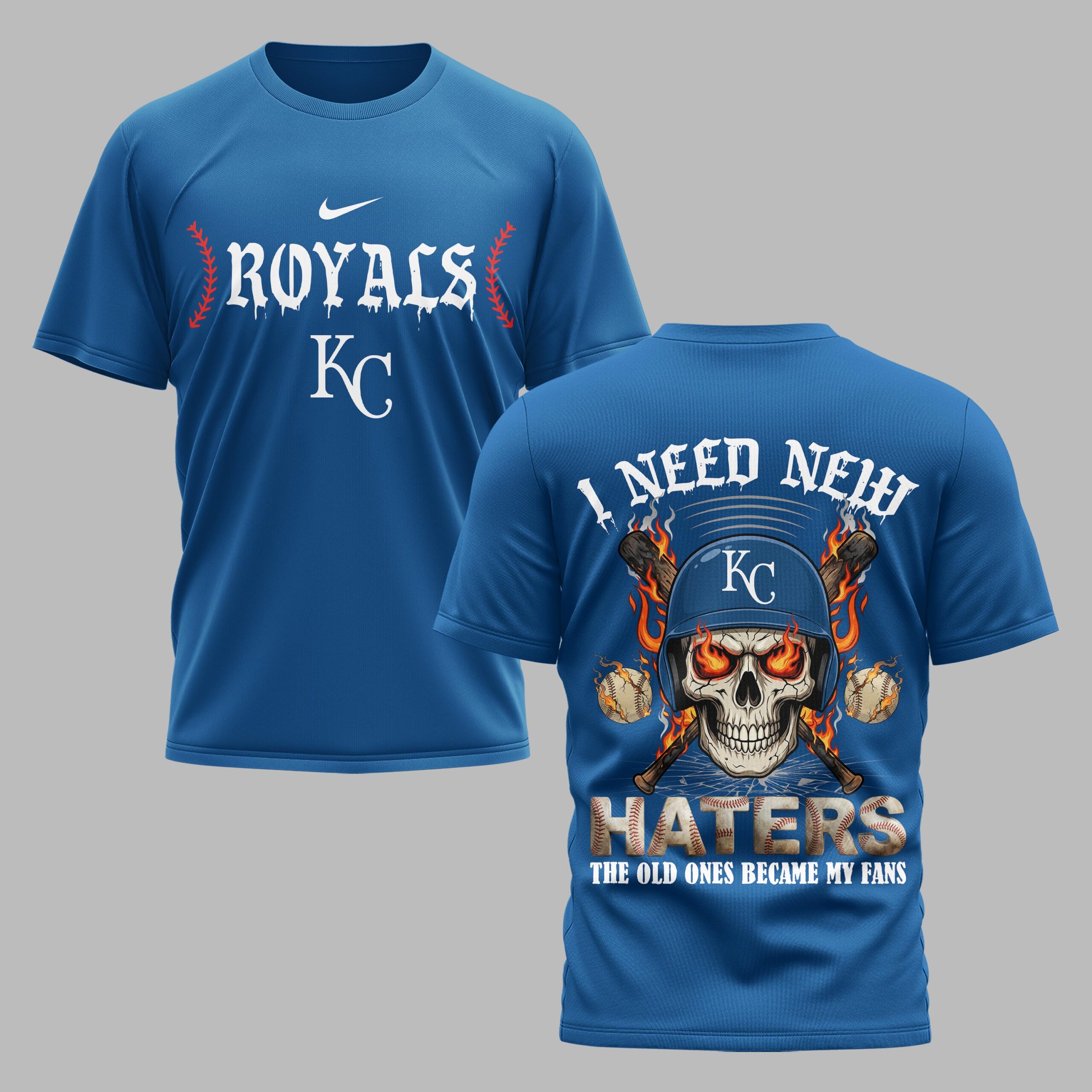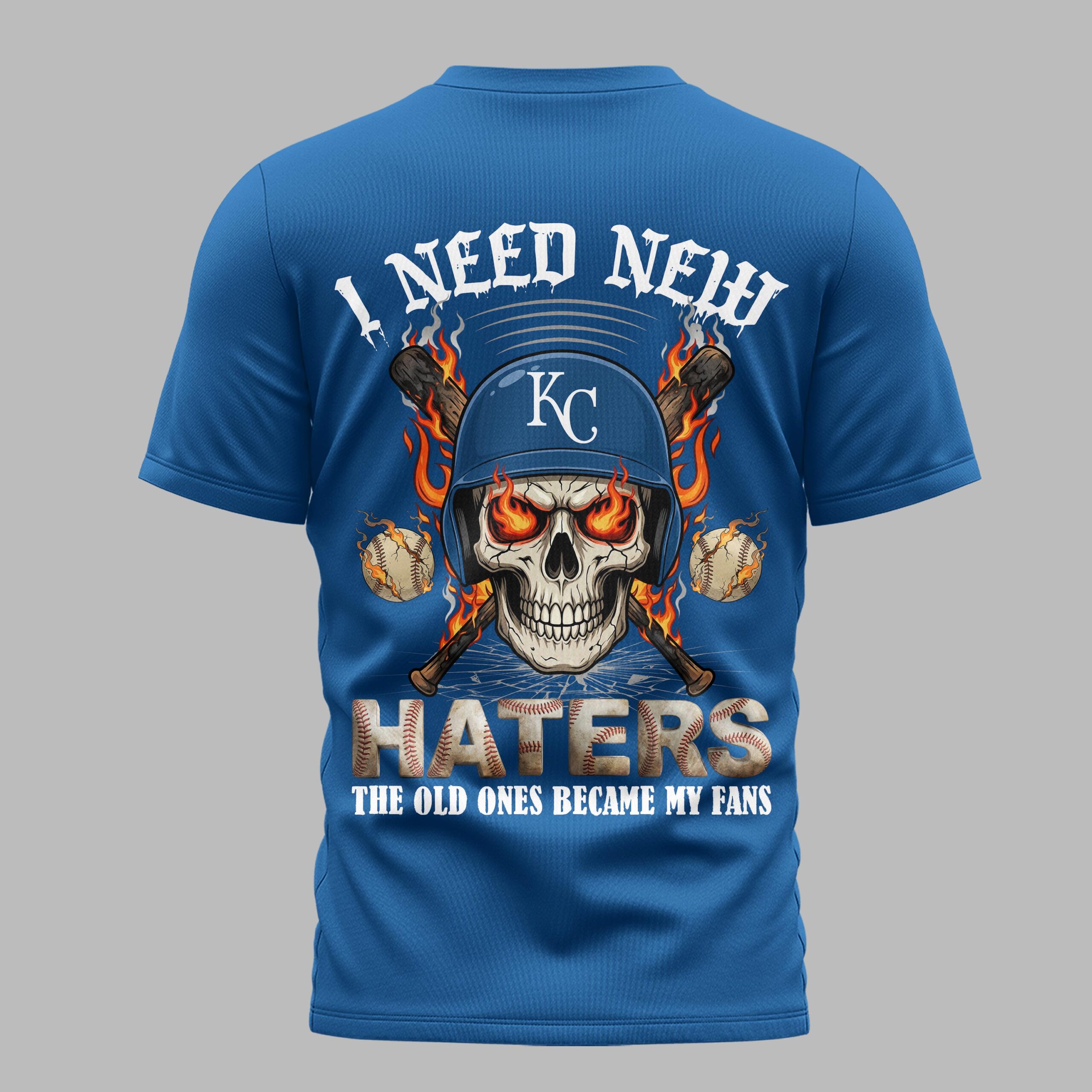 Show your unwavering loyalty to Kansas City with this bold fan gear. Combining a fierce attitude with undeniable team spirit, this shirt is designed for those who live and breathe baseball. It’s a perfect tribute to the team’s legacy as we celebrate our nation’s heritage and the great American pastime. The front features the iconic Royals name in a gritty, dripping font paired with the classic KC logo and red baseball stitching. On the back, a striking skull graphic takes center stage, wearing a team helmet with flaming eyes and crossed bats. The defiant I Need New Haters message ensures everyone knows your deep-rooted dedication to the boys in blue. This shirt is built for game day intensity, whether you’re cheering from the stands at the stadium or hosting an Independence Day backyard BBQ. It’s a versatile piece for everyday wear that makes a powerful statement of fan pride all season long.