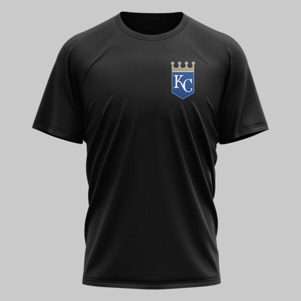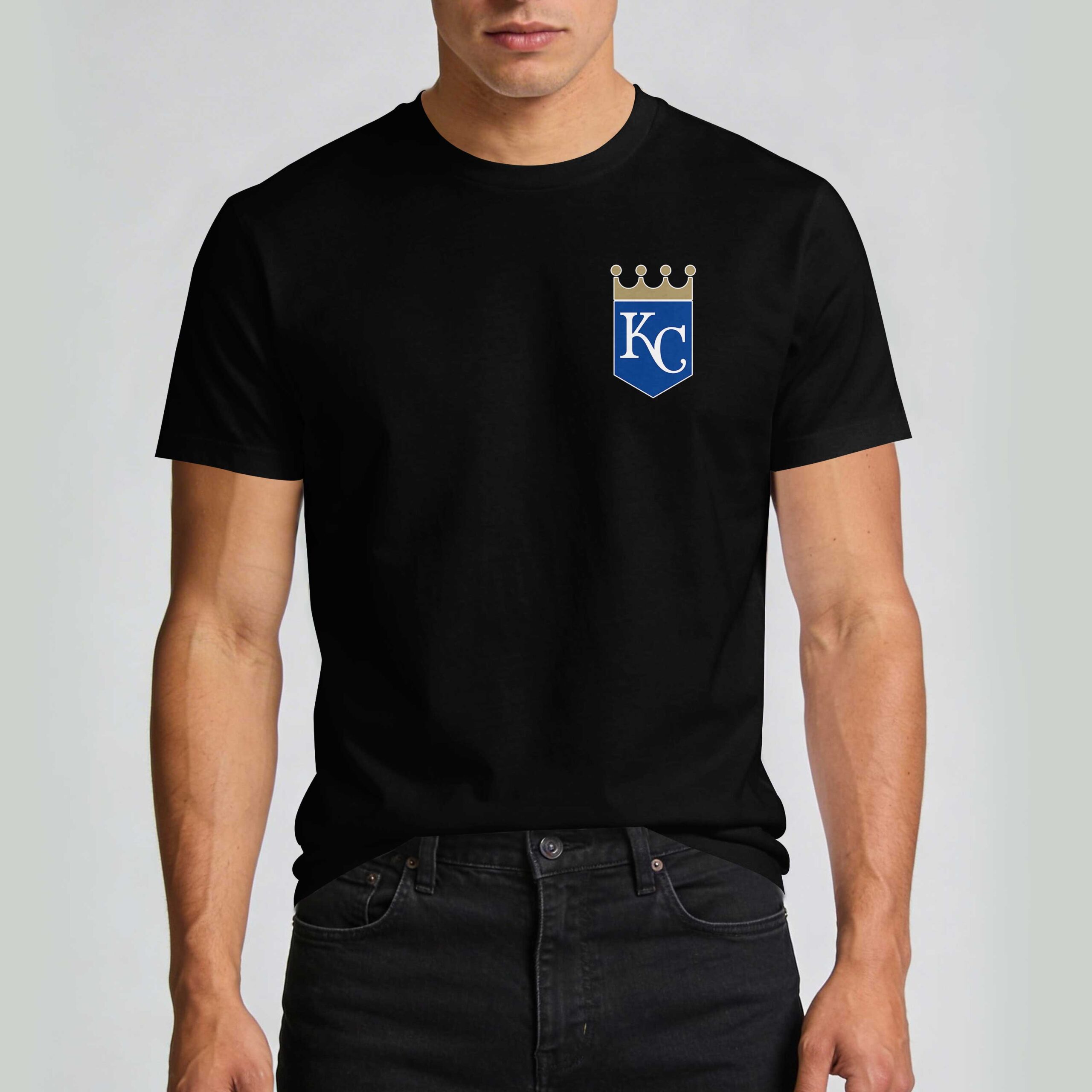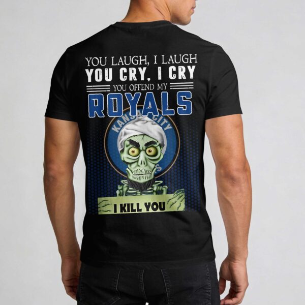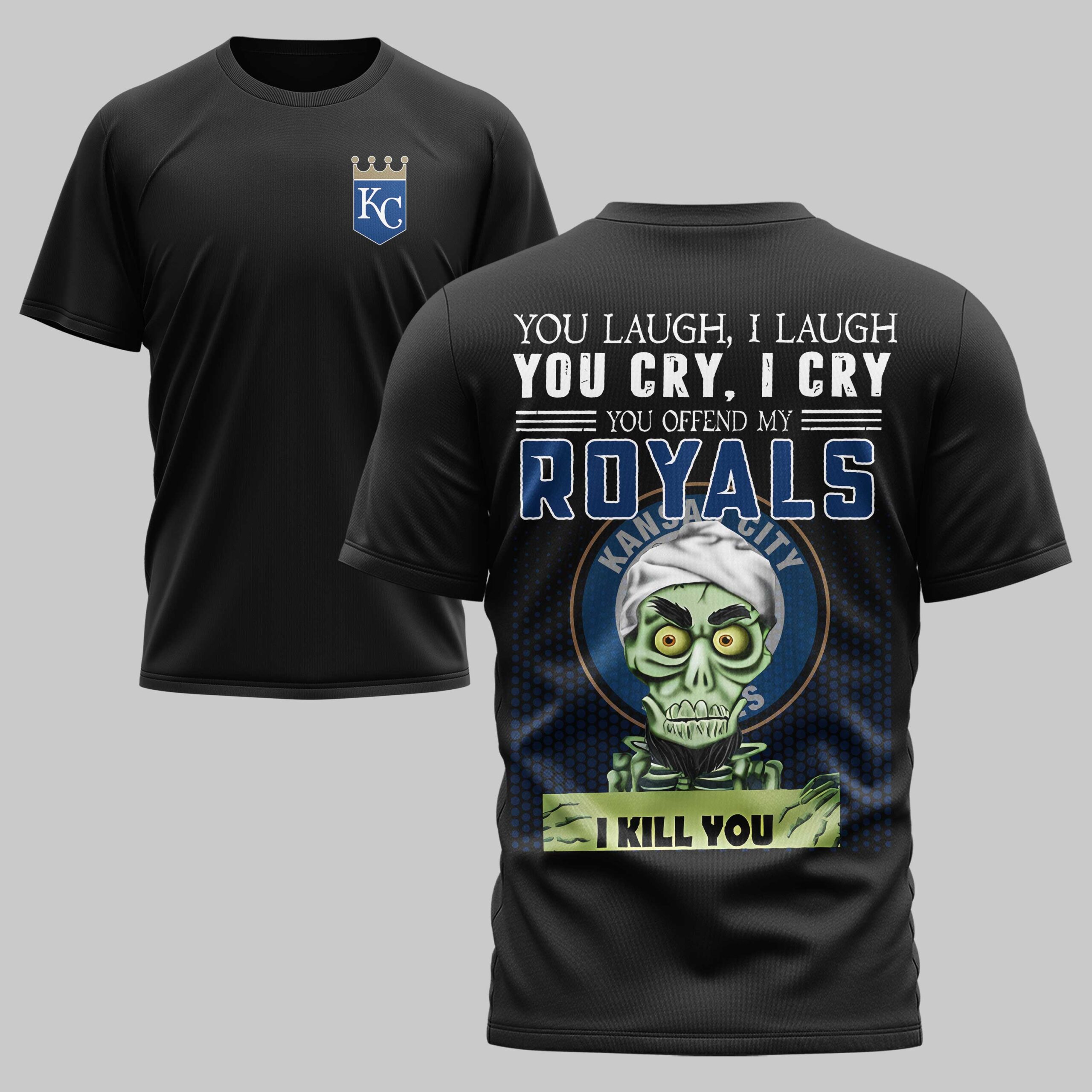 Show your fierce Kansas City Royals spirit with this bold and loyal T-shirt! This design blends team pride with an edgy, humorous declaration, showcasing your unwavering dedication to Kansas City baseball. It’s a statement piece for every passionate Royals supporter. The front proudly displays the iconic KC crown logo in blue and gold. The back features a vivid graphic: a green, zombie-like character in a white headwrap, set within a KANSAS CITY circular design. Above, the text boldly states, YOU LAUGH, I LAUGH YOU CRY, I CRY = YOU OFFEND MY ROYALS = I KILL YOU. Perfect for cheering from the stands, watch parties, or representing your team with undeniable flair. This shirt is for fans who express their passion boldly and add a unique edge to their game day style.