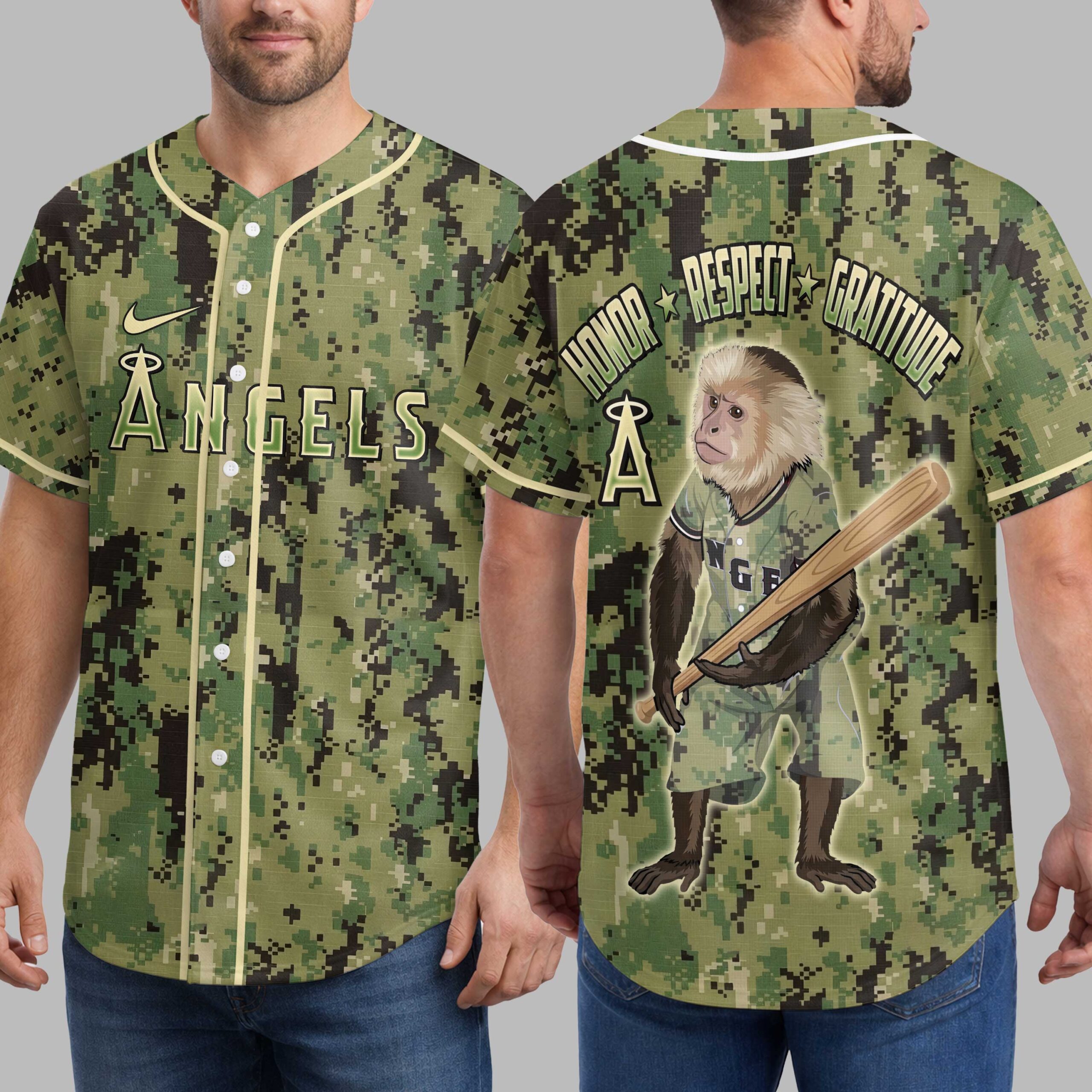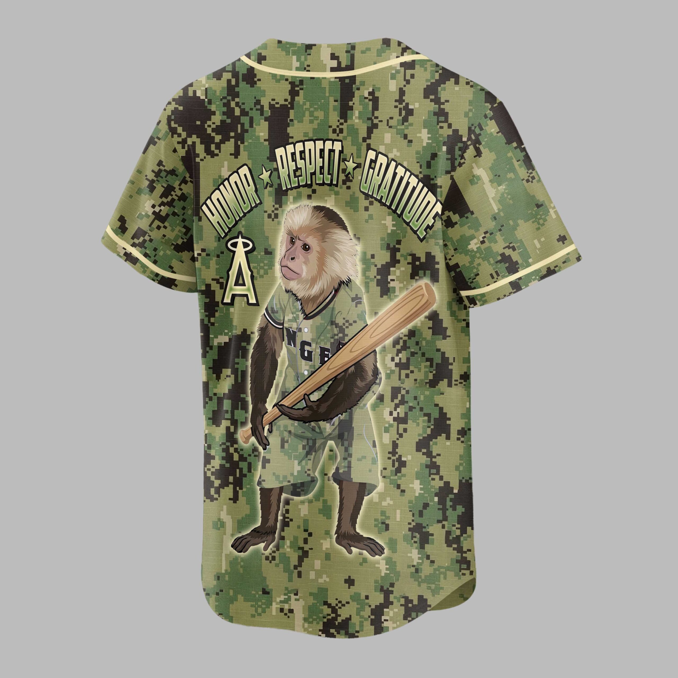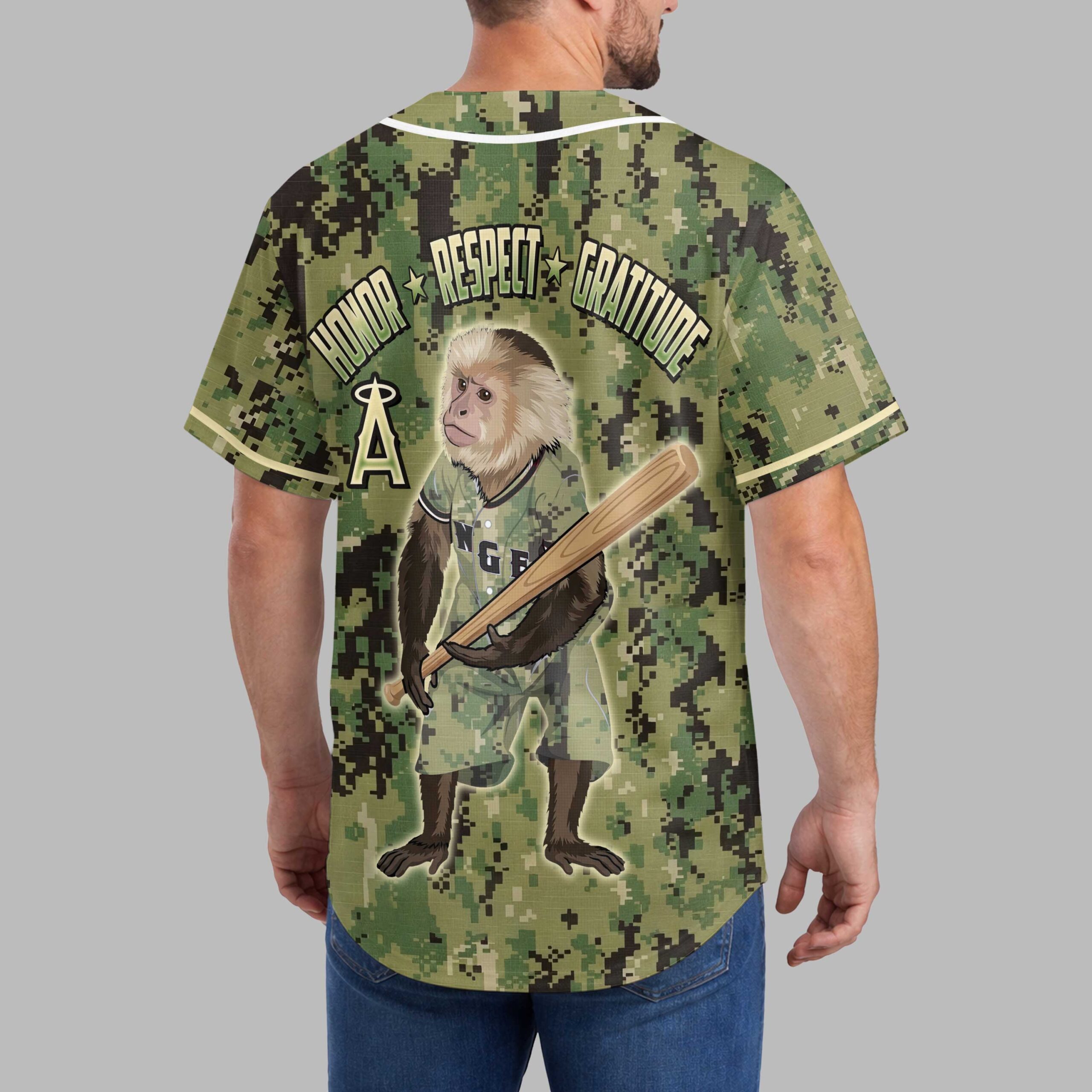 Step up to the plate in unique style with this Angels military camo baseball jersey, a powerful blend of sports enthusiasm and patriotic spirit. Perfect for fans who live by core values, this shirt pays tribute to honor, respect, and gratitude with an undeniably cool twist. Show off your allegiance with a design that truly stands out from the crowd, celebrating both your favorite team and important virtues. The front of this striking jersey features a digital camouflage pattern, reminiscent of military fatigues, setting a bold backdrop for the ANGELS team name and iconic A logo with a halo. The back takes center stage with a powerful image of a monkey in a matching camouflage baseball uniform, bat in hand, ready for action. Arched above the primate hero are the inspiring words HONOR, RESPECT, and GRATITUDE, further emphasizing the shirt’s deep meaning. Whether you’re cheering from the stands, heading to a casual gathering, or simply want to wear a piece that reflects your appreciation for service and sport, this jersey is your go-to. It’s an ideal choice for game days, veteran events, or any occasion where you want to express your unique blend of team pride and heartfelt values.