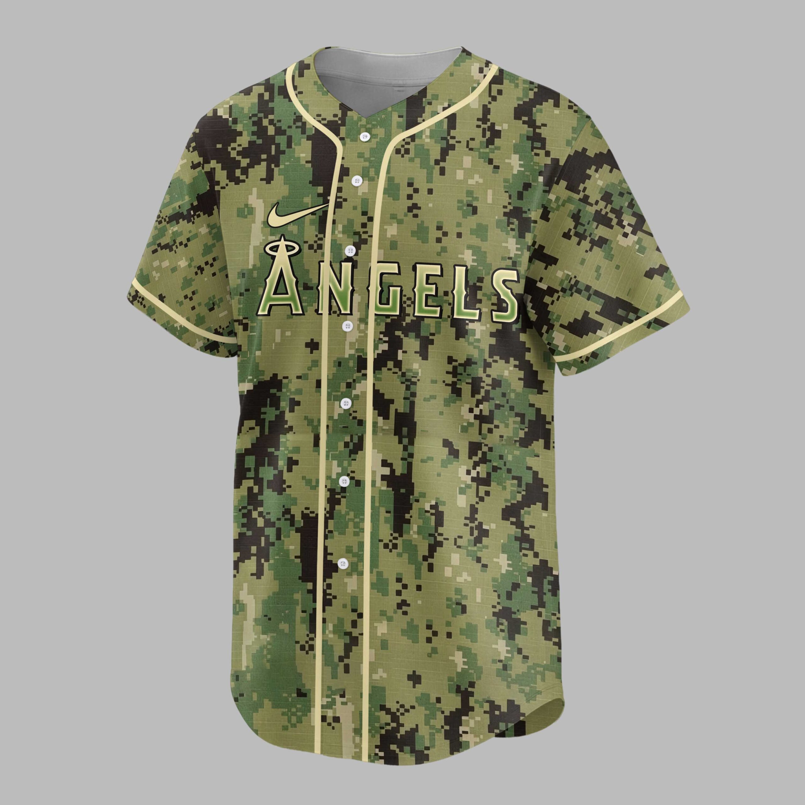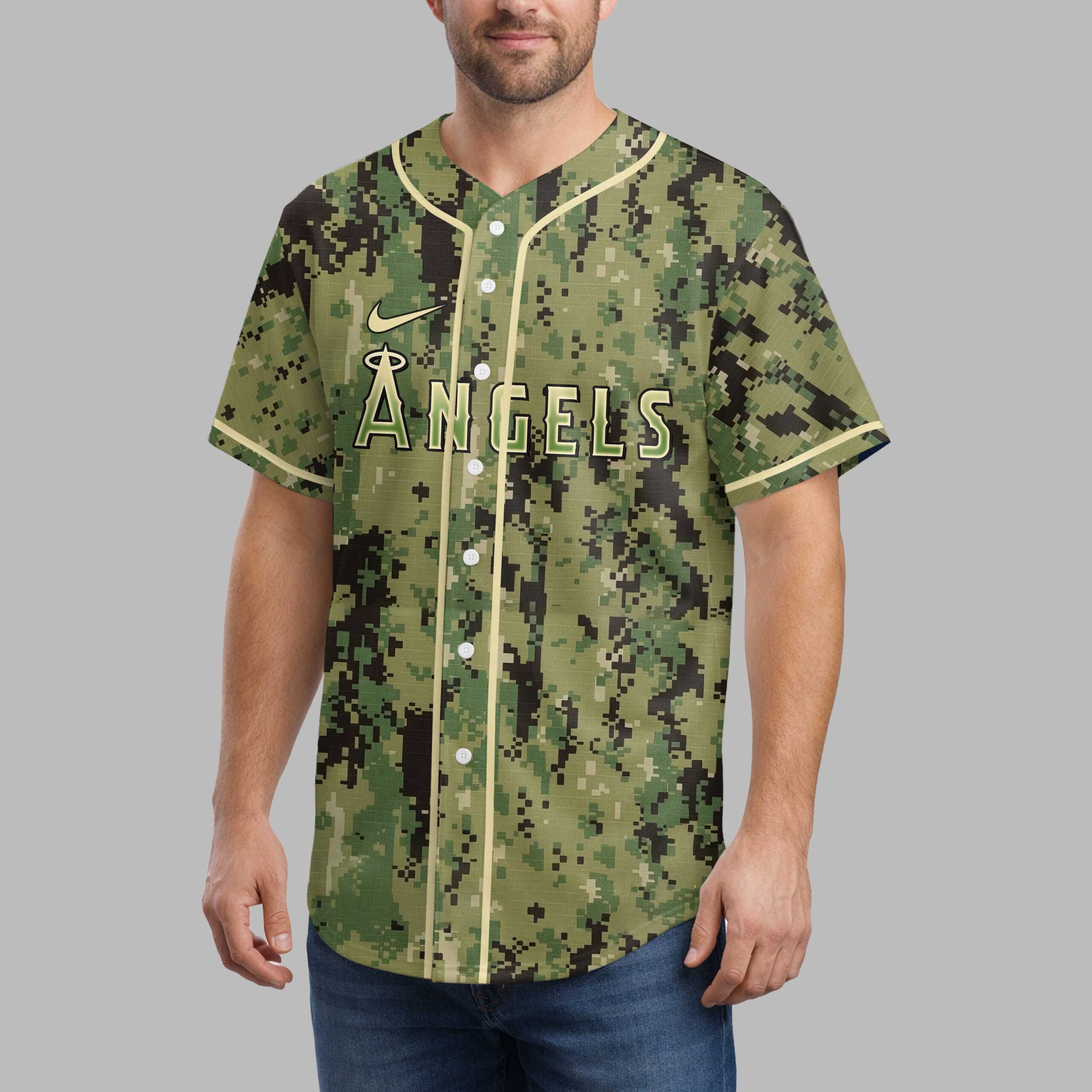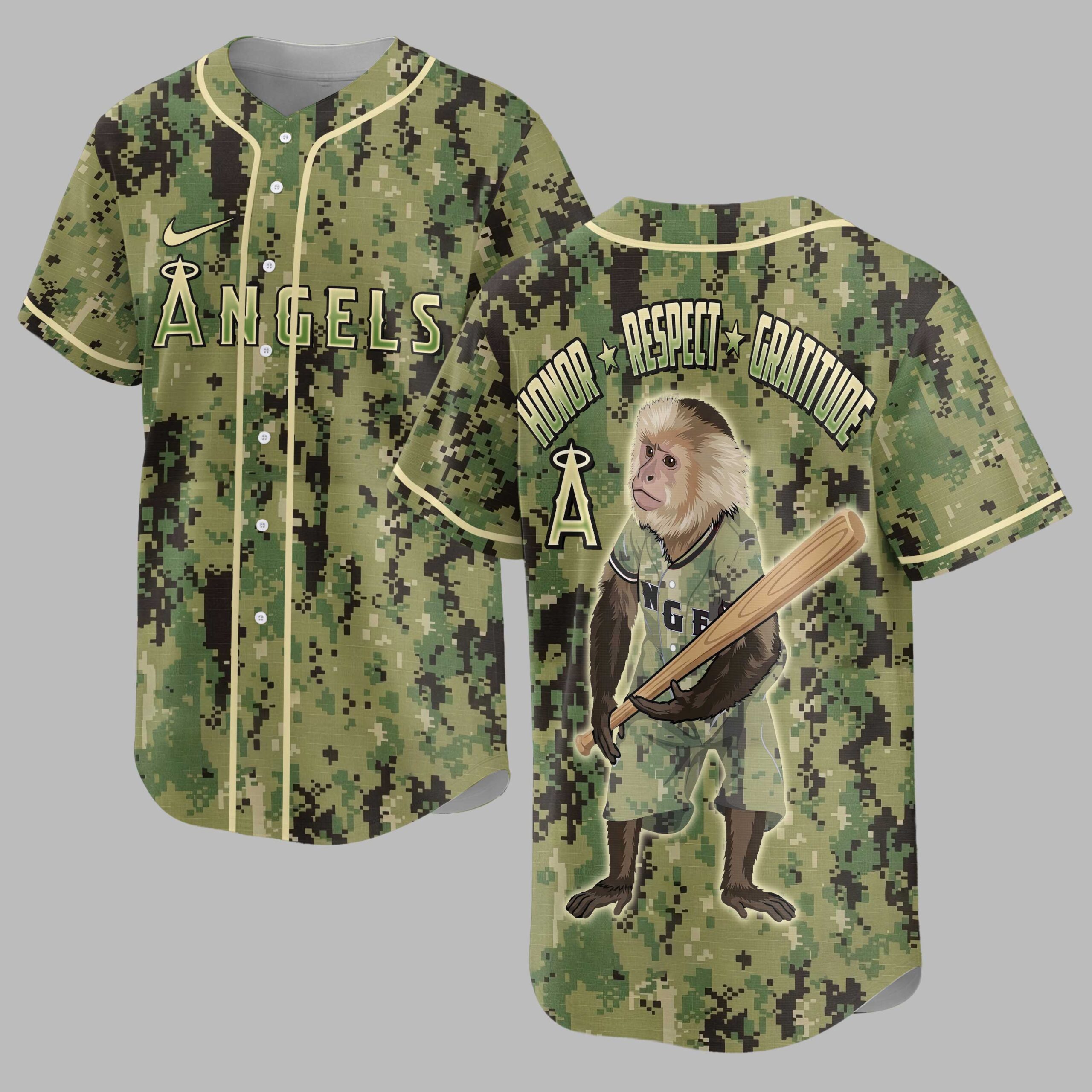 Step up to the plate in unique style with this Angels military camo baseball jersey, a powerful blend of sports enthusiasm and patriotic spirit. Perfect for fans who live by core values, this shirt pays tribute to honor, respect, and gratitude with an undeniably cool twist. Show off your allegiance with a design that truly stands out from the crowd, celebrating both your favorite team and important virtues. The front of this striking jersey features a digital camouflage pattern, reminiscent of military fatigues, setting a bold backdrop for the ANGELS team name and iconic A logo with a halo. The back takes center stage with a powerful image of a monkey in a matching camouflage baseball uniform, bat in hand, ready for action. Arched above the primate hero are the inspiring words HONOR, RESPECT, and GRATITUDE, further emphasizing the shirt’s deep meaning. Whether you’re cheering from the stands, heading to a casual gathering, or simply want to wear a piece that reflects your appreciation for service and sport, this jersey is your go-to. It’s an ideal choice for game days, veteran events, or any occasion where you want to express your unique blend of team pride and heartfelt values.