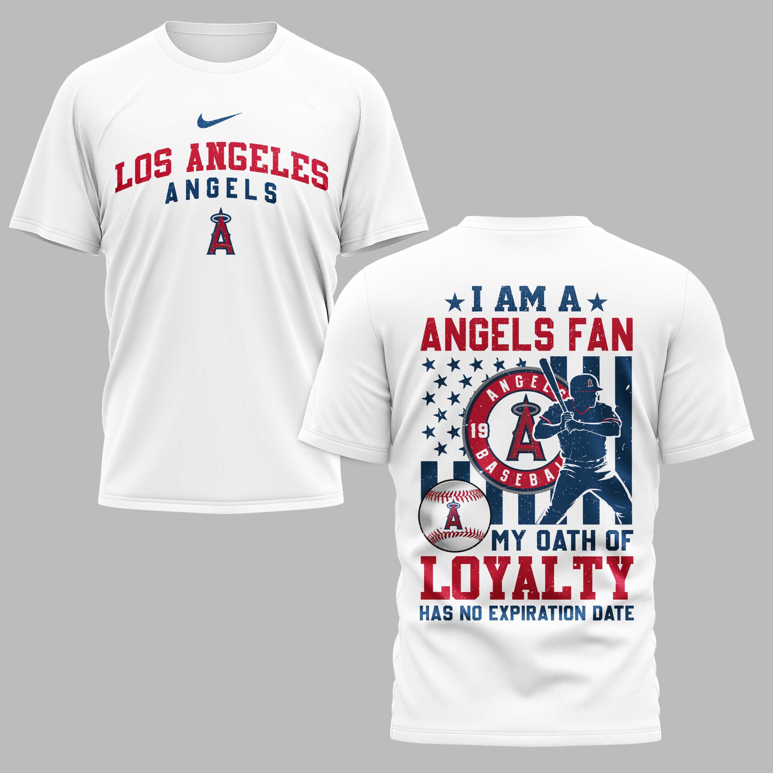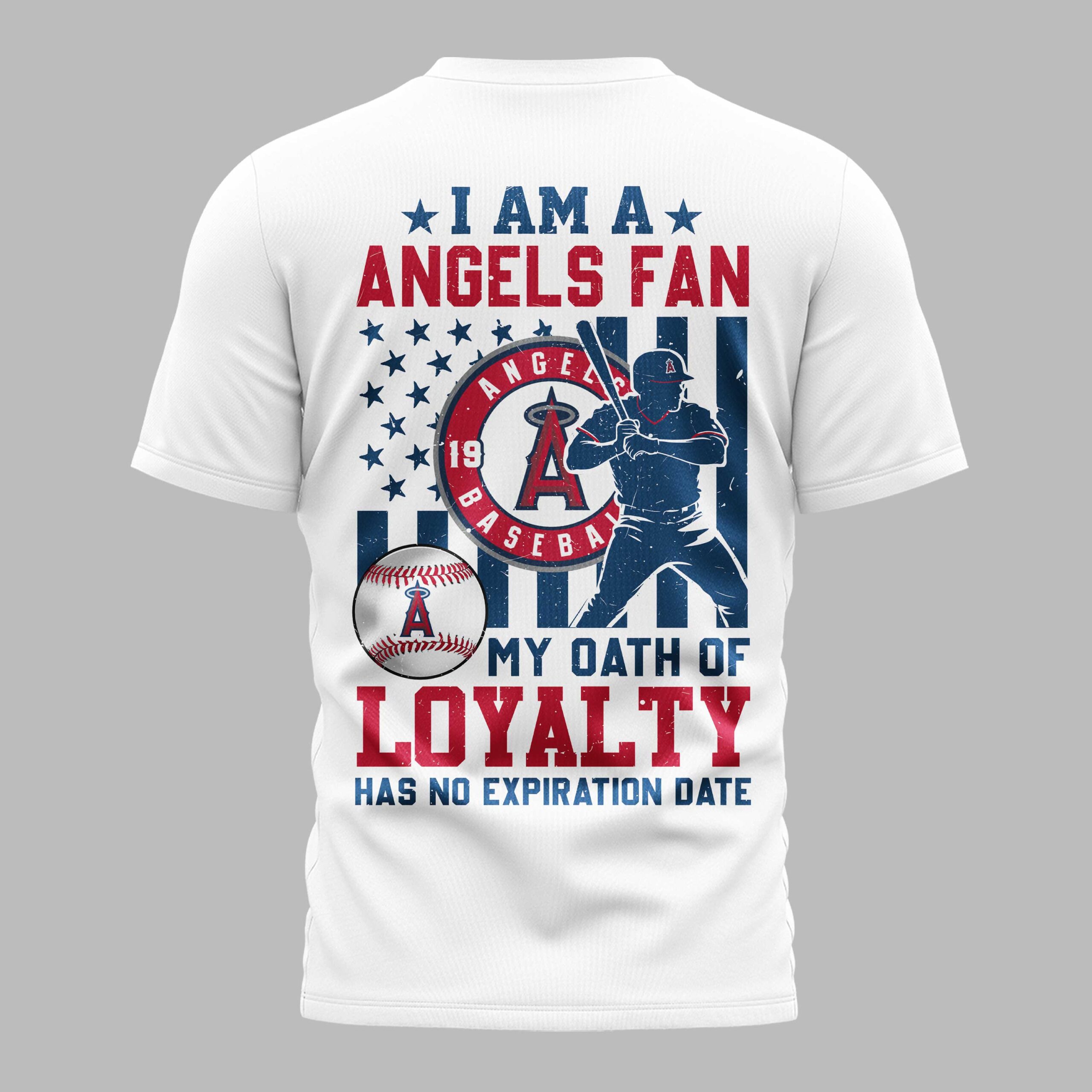 Show your unwavering loyalty to the Los Angeles Angels with this spirited fan t-shirt! Perfect for dedicated supporters, this tee captures the passion of the game and proudly showcases a team pride that stands the test of time. The front boldly features LOS ANGELES ANGELS in collegiate font, alongside the iconic A logo with its halo. The back makes a powerful statement: an American flag motif with a baseball player mid-swing, complemented by the ANGELS BASEBALL emblem, A logo, and the declaration I AM A ANGELS FAN. MY OATH OF LOYALTY HAS NO EXPIRATION DATE. Wear this tee to the ballpark, watch parties, or any casual occasion to represent your team. It’s the ultimate way to celebrate every play and show your enduring support for the Angels.