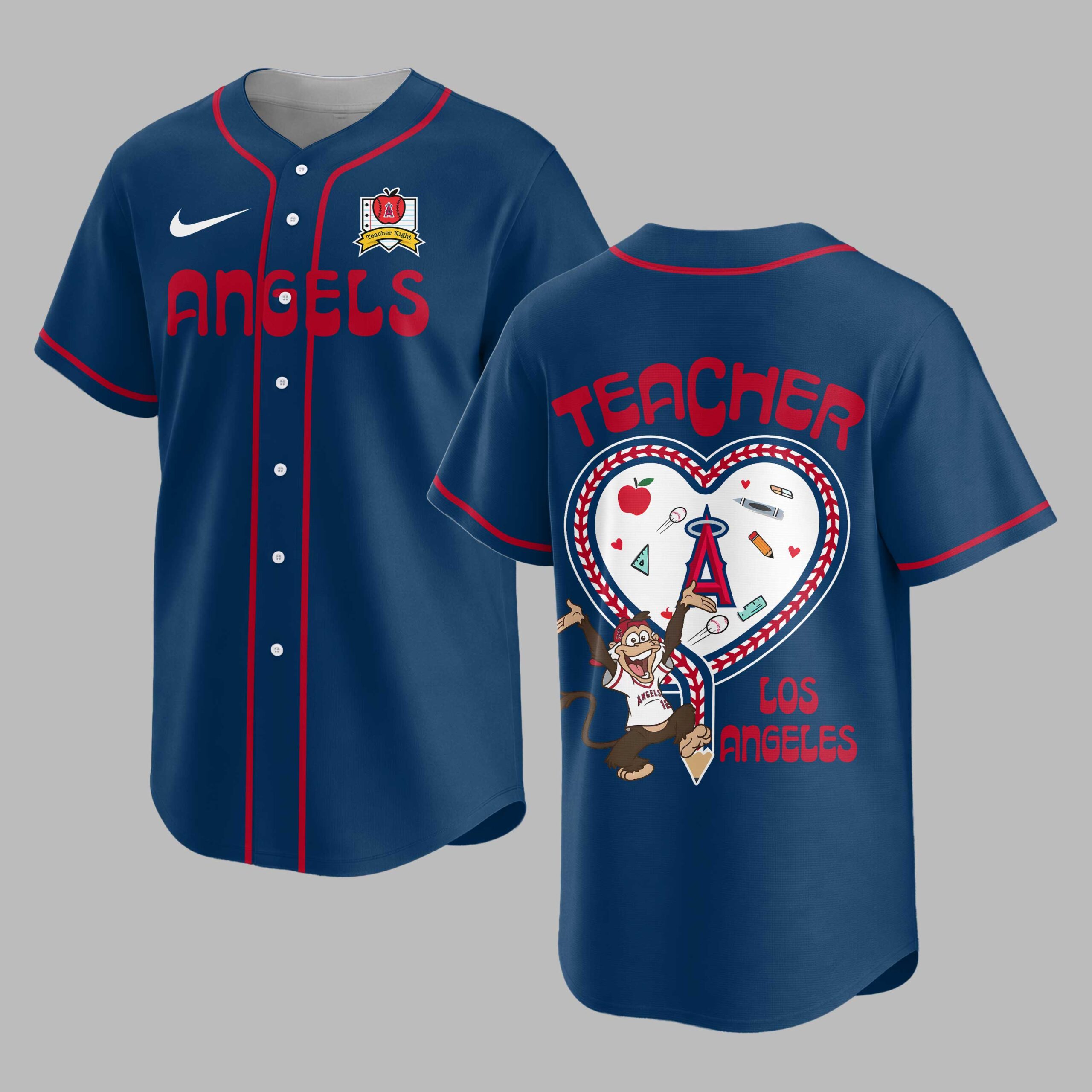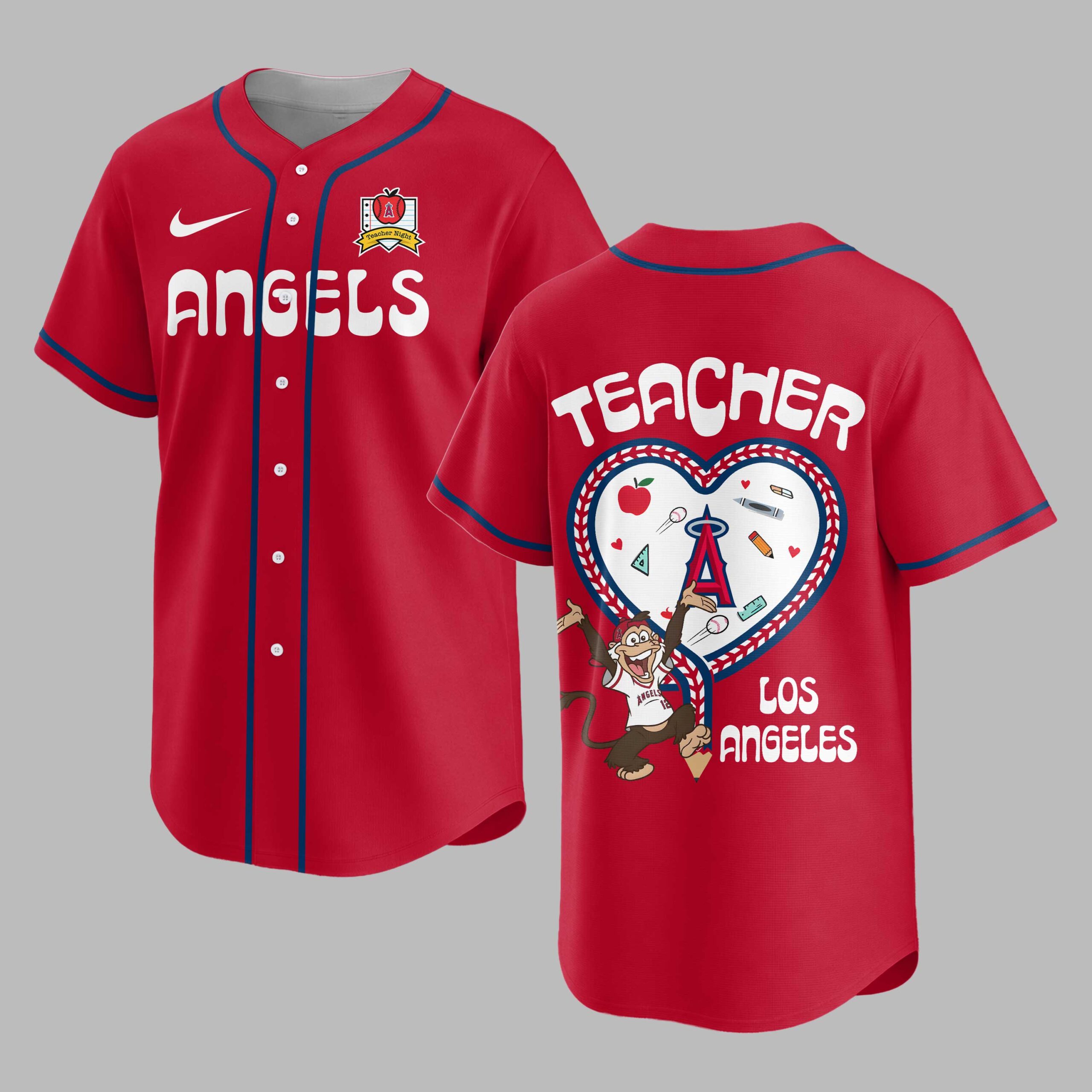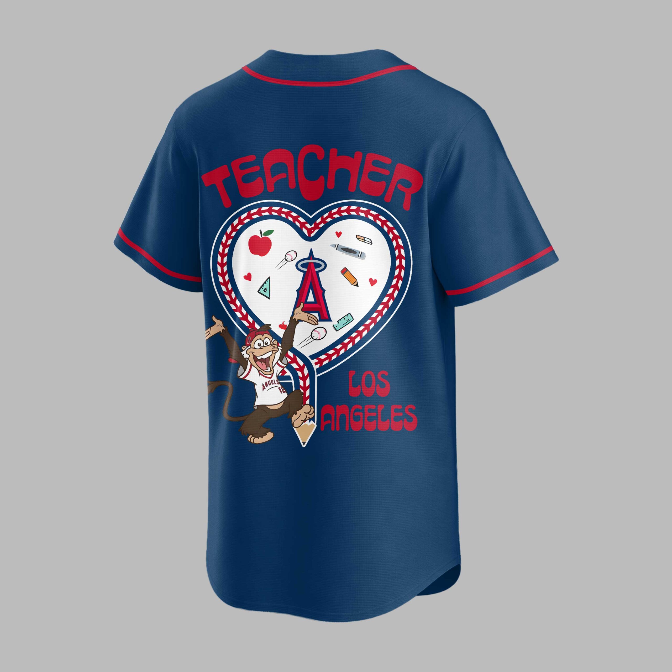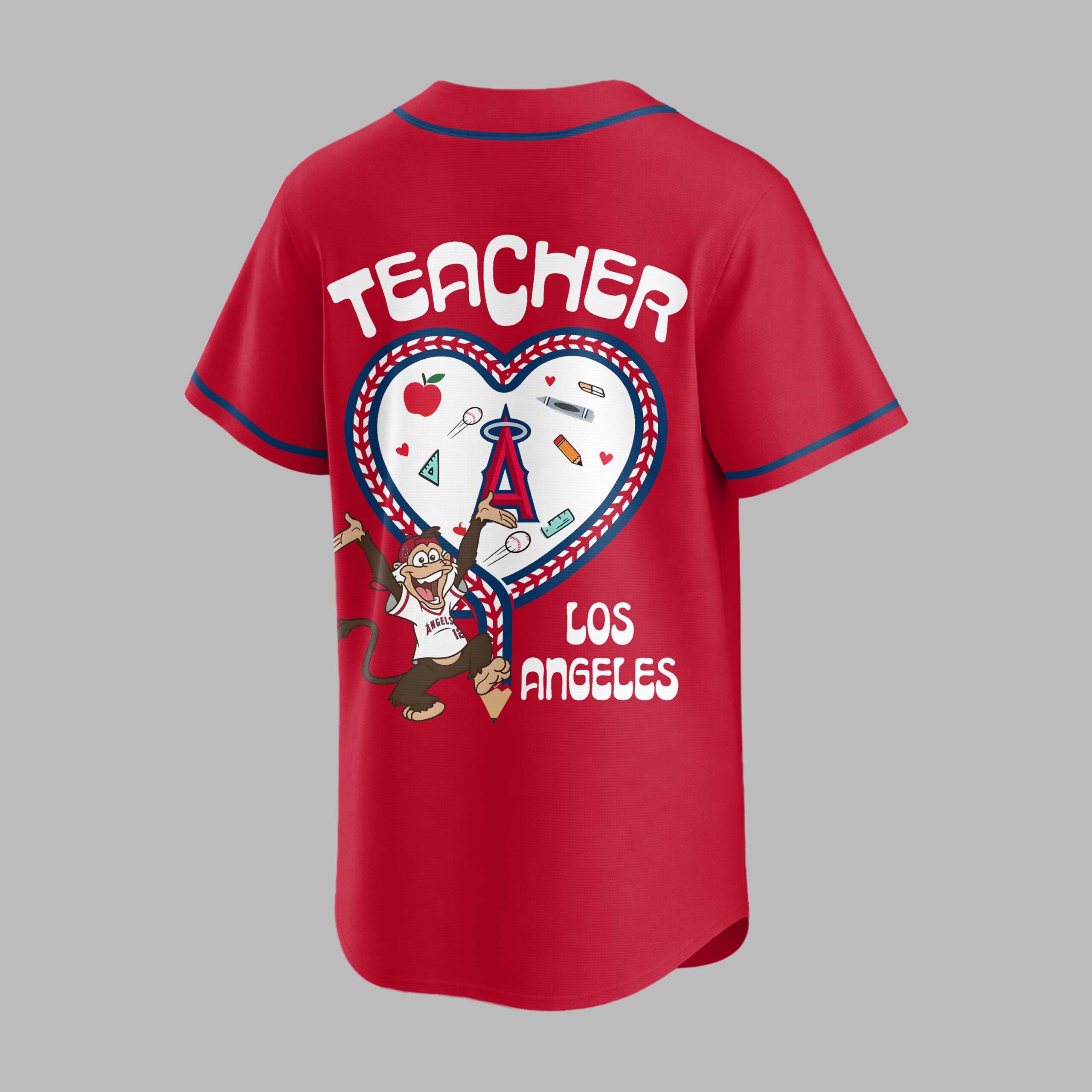 Show your unwavering support for the Los Angeles Angels and your dedication to education with this unique Teacher Night baseball jersey! Designed for the ultimate fan who inspires young minds, this shirt beautifully blends your passion for the team with your pride in teaching. It’s the perfect way to represent both your favorite MLB team and your incredible profession. The front proudly displays Angels in bold red script across the chest, complemented by the classic red and white piping. A special Teacher Night emblem on the left chest features a notebook paper backdrop with an apple and the Angels’ A logo, underscoring your dual commitment. The back is a true standout, featuring TEACHER prominently above a heart-shaped design that beautifully mimics baseball stitching. Inside, a playful collection of school supplies alongside a baseball, all overlooked by a cheering Angels monkey mascot, celebrates the spirit of learning and the thrill of the game. LOS ANGELES completes this heartfelt design. Whether you’re catching a game at the ballpark, attending school events, or simply showcasing your educator pride around Los Angeles, this jersey is a grand slam for any teacher and Angels fan. It’s more than just apparel; it’s a statement of passion, perfect for celebrating both on and off the field.