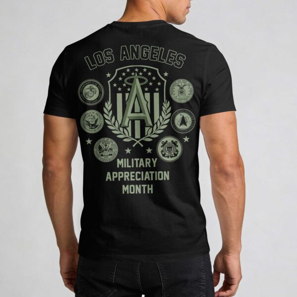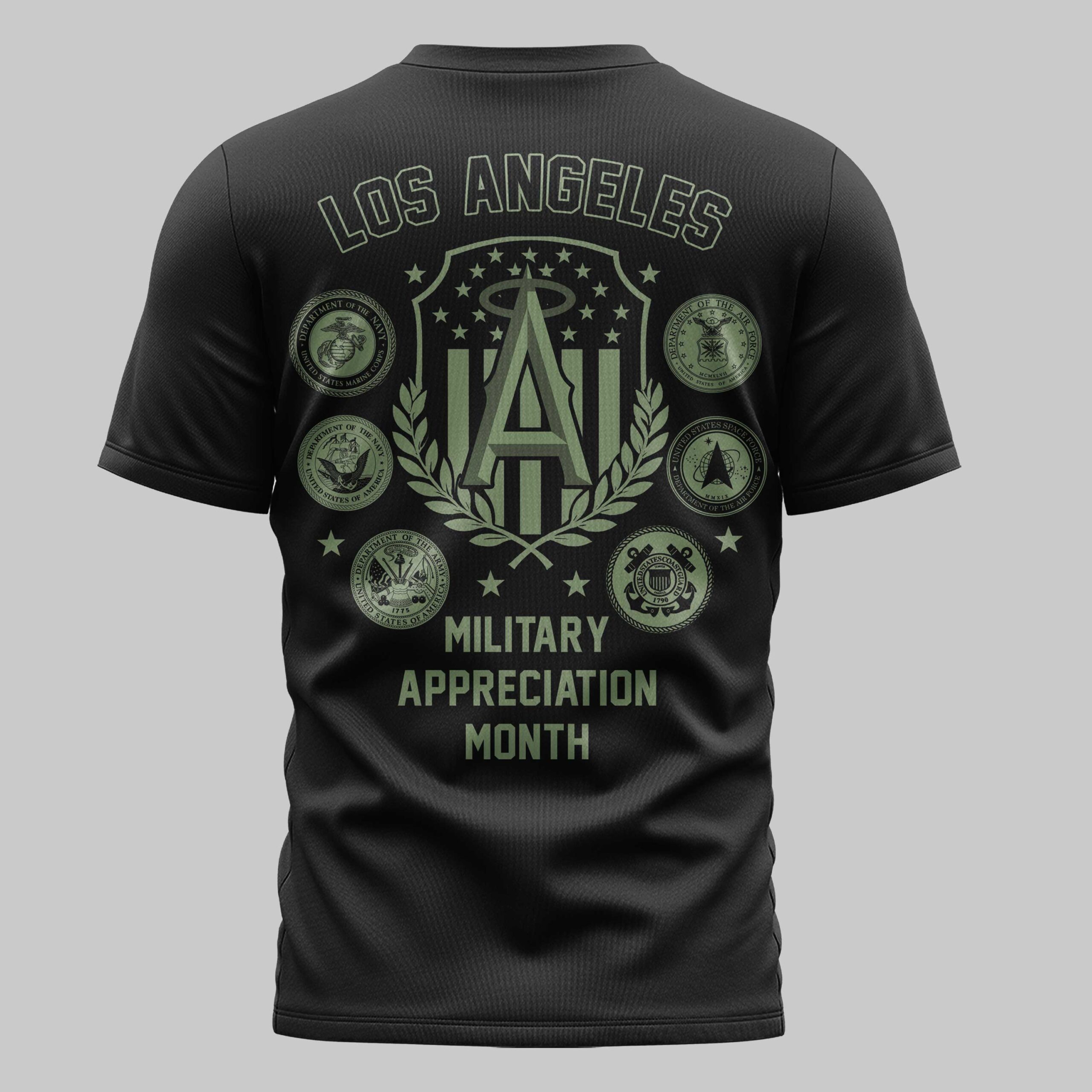 Show your devotion to the Los Angeles Angels and our nation’s heroes with this bold, military-inspired fan t-shirt. This design blends your passion for the ballpark with a deep respect for those who serve, making it a standout addition to any Halos fan’s collection. The front displays a striking ANGELS wordmark in tactical olive green, anchored by the iconic haloed A logo. The back features a grand tribute, showcasing a central crest surrounded by the official seals of all U.S. military branches. With MILITARY APPRECIATION MONTH displayed prominently, this graphic honors the Army, Navy, Air Force, Marines, Coast Guard, and Space Force. This shirt is perfect for game days at the Big A, holiday celebrations, or any event honoring our service members. It’s an ideal way to represent your team pride and patriotic spirit all year round.