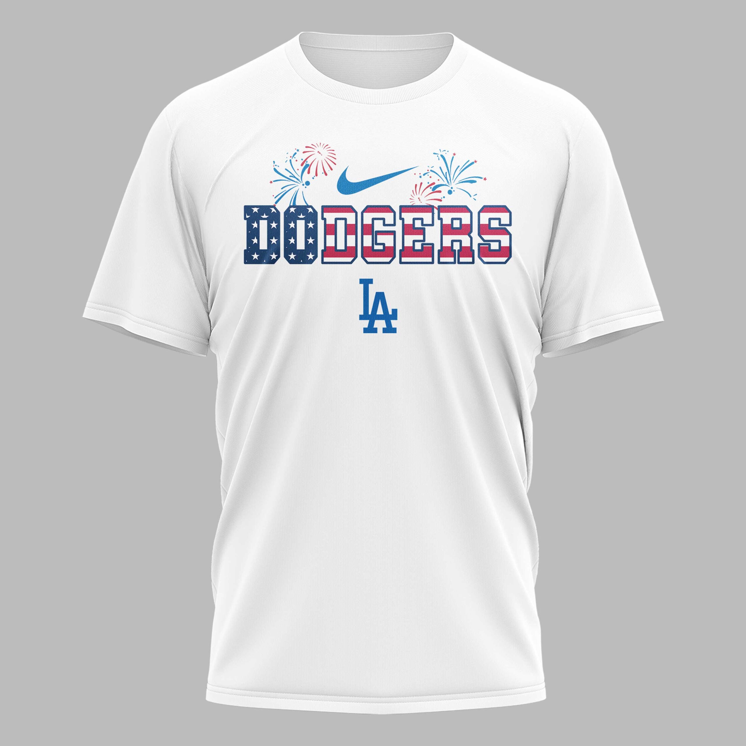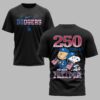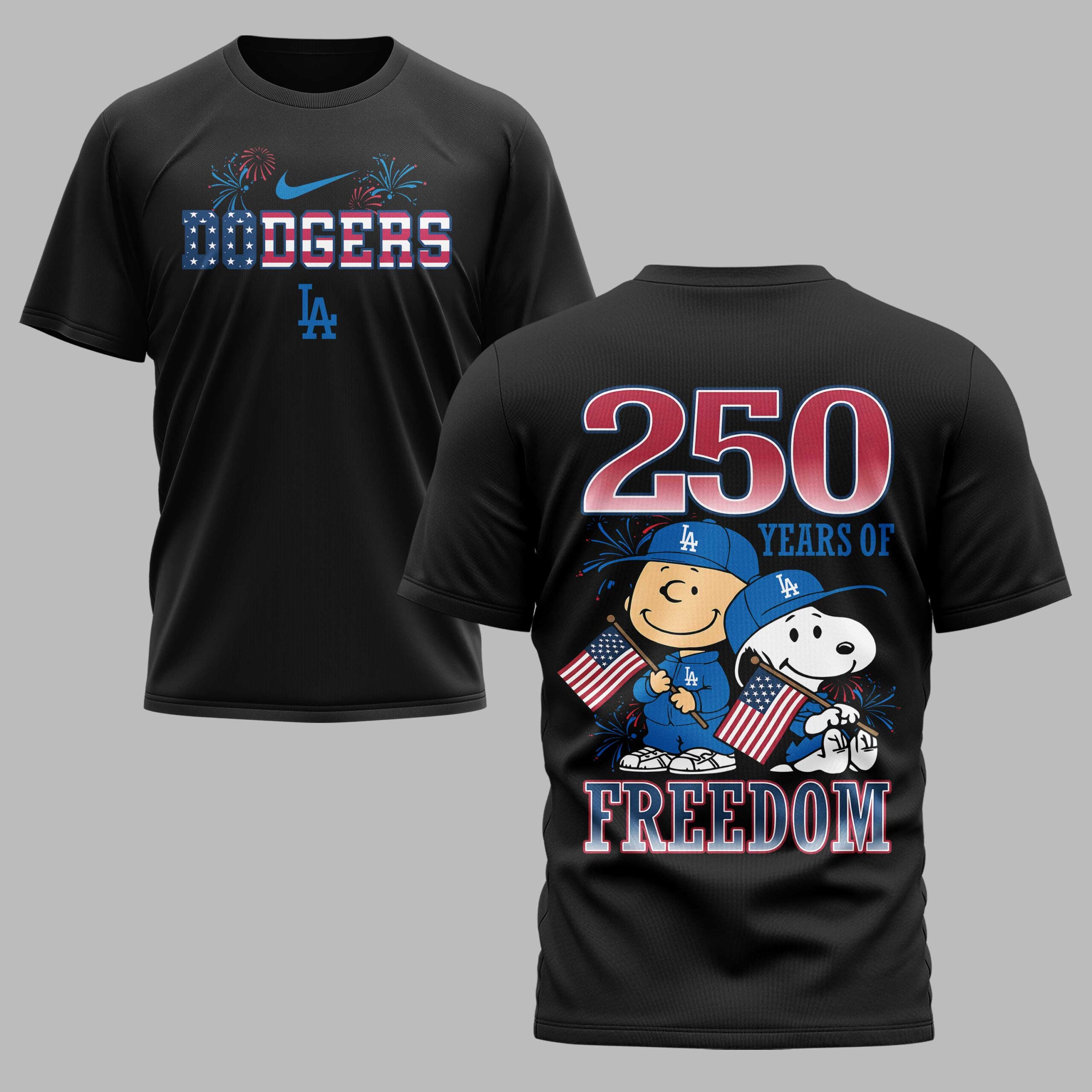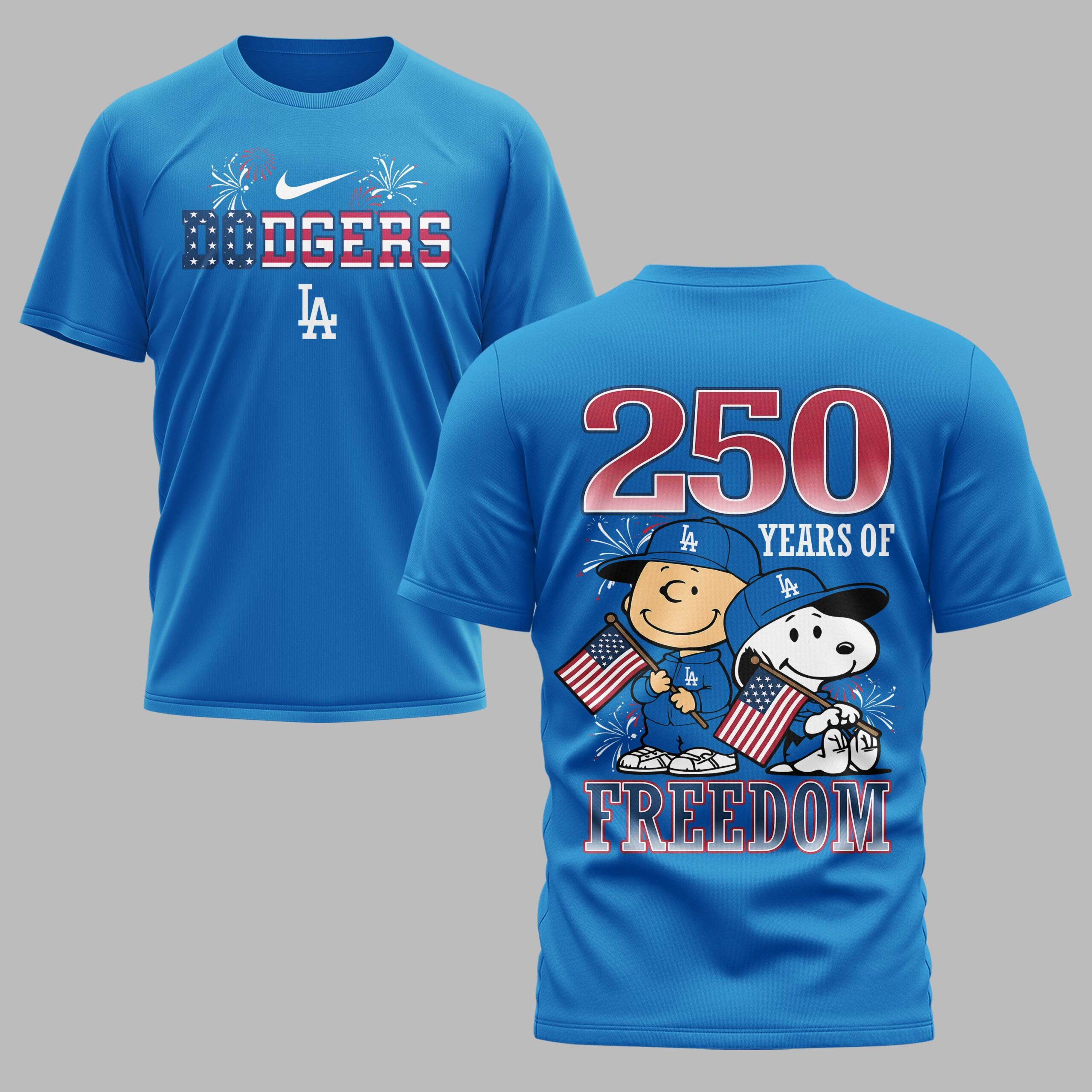 Show your Los Angeles Dodgers pride and American spirit with this vibrant patriotic tee! Combining your favorite team with beloved Peanuts characters, this shirt blends Dodger loyalty and freedom’s spirit, making it ideal for national holidays or game days. The front features DODGERS in a stars-and-stripes pattern, with the blue LA logo and playful fireworks. The back highlights 250 YEARS OF FREEDOM in striking red and blue. Charlie Brown and Snoopy, in Dodgers caps, wave American flags amidst dazzling fireworks, embodying national pride and team enthusiasm. Perfect for gameday, Fourth of July, or Memorial Day events, this tee displays your passion with classic cartoon charm. Wear it to parades, summer gatherings, or simply represent your team and country with patriotic flair.